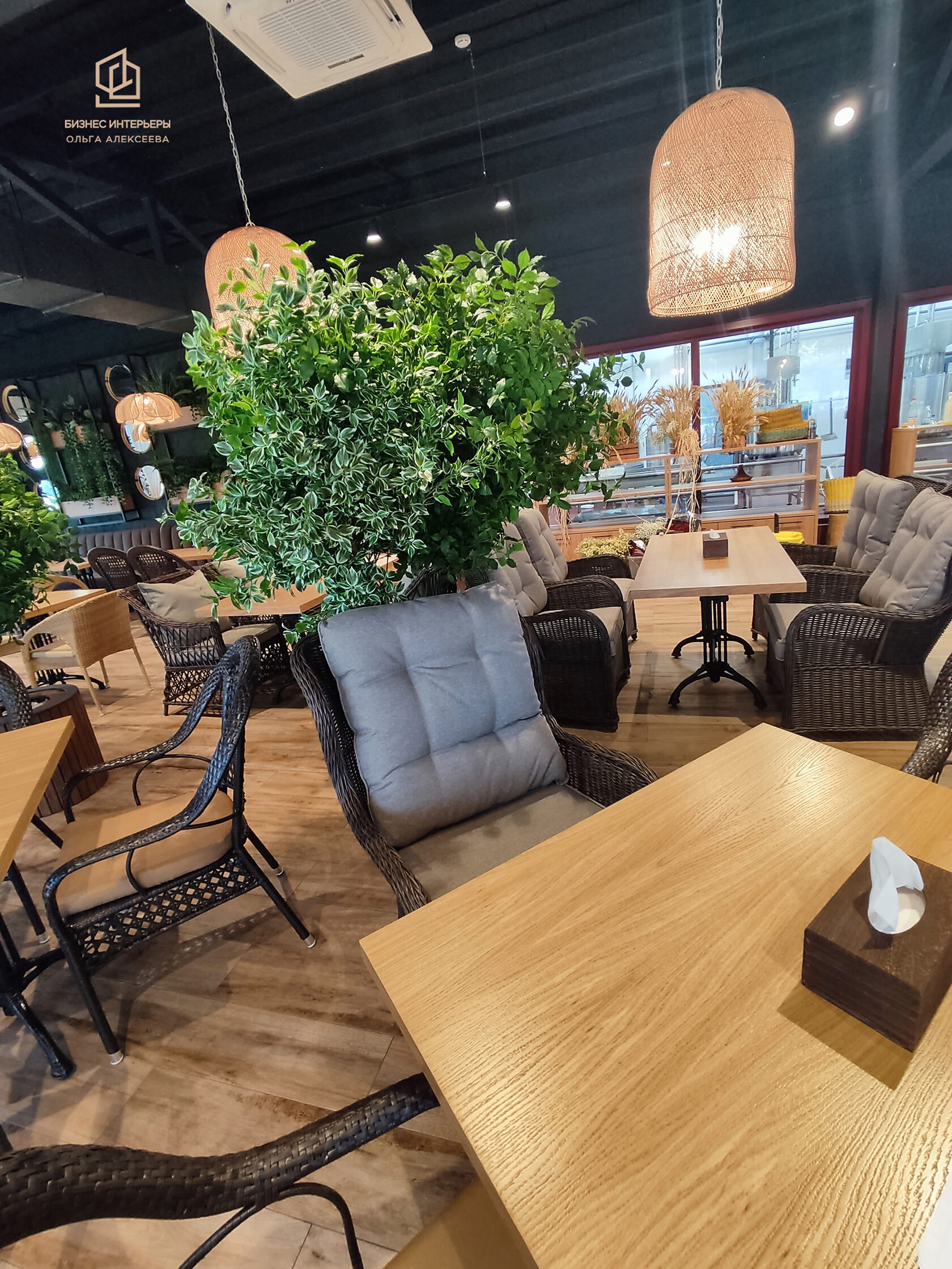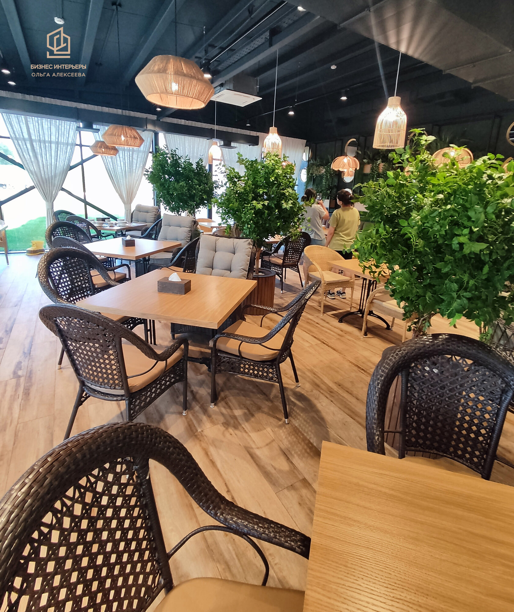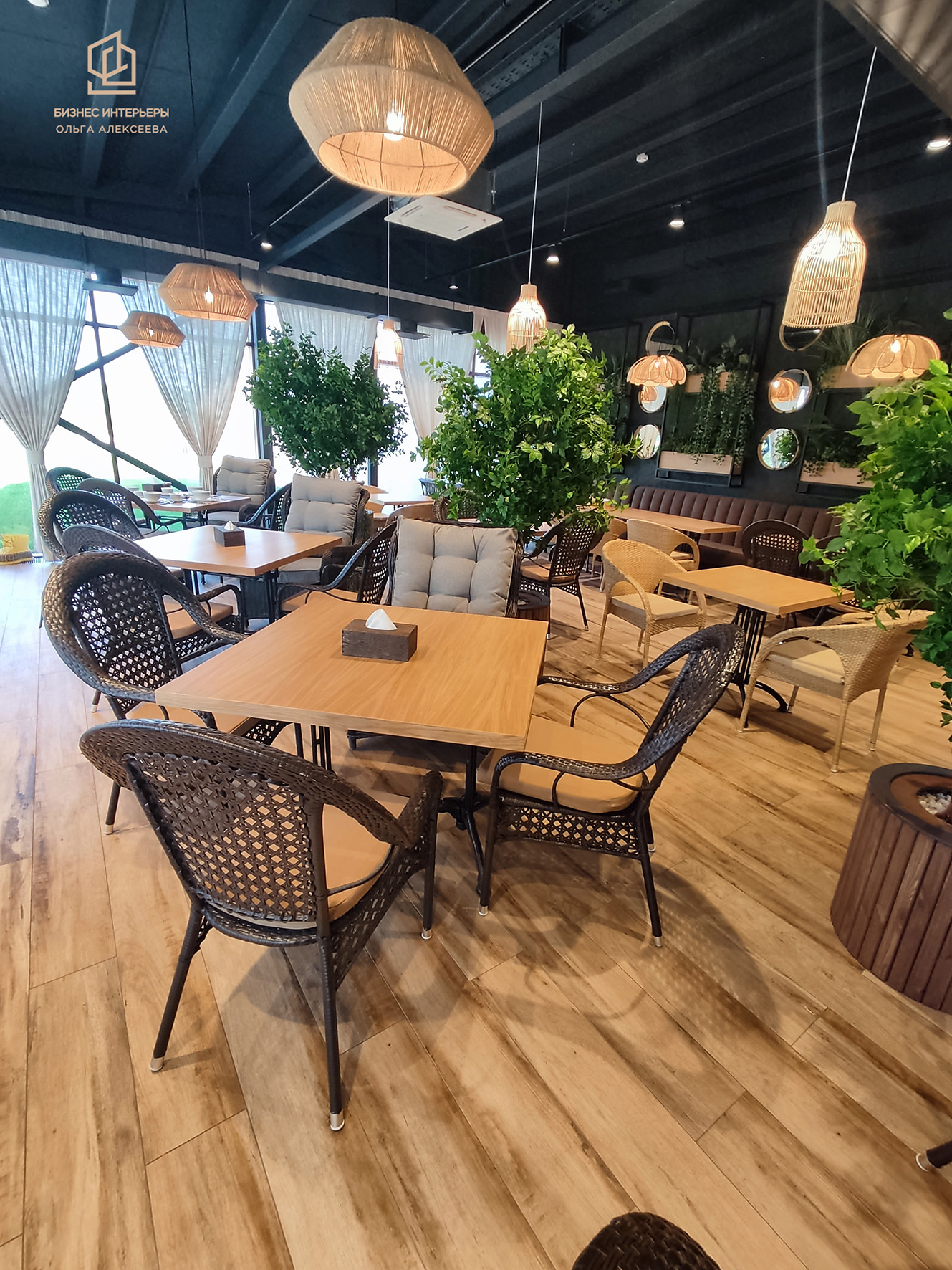 Концепция: В основе концепции лежит идея создания уникального городского оазиса, который вибрирует энергией и приглашает к диалогу. Центральным арт-объектом стала эксклюзивная металлическая конструкция, выполненная по индивидуальному эскизу: сварной каркас, обрамленный живыми растениями и гирляндами-фонариками, задает динамичный тон всему пространству, становясь его смысловым и визуальным центром. Это решение позволило интегрировать природные мотивы в современную урбанистическую среду.