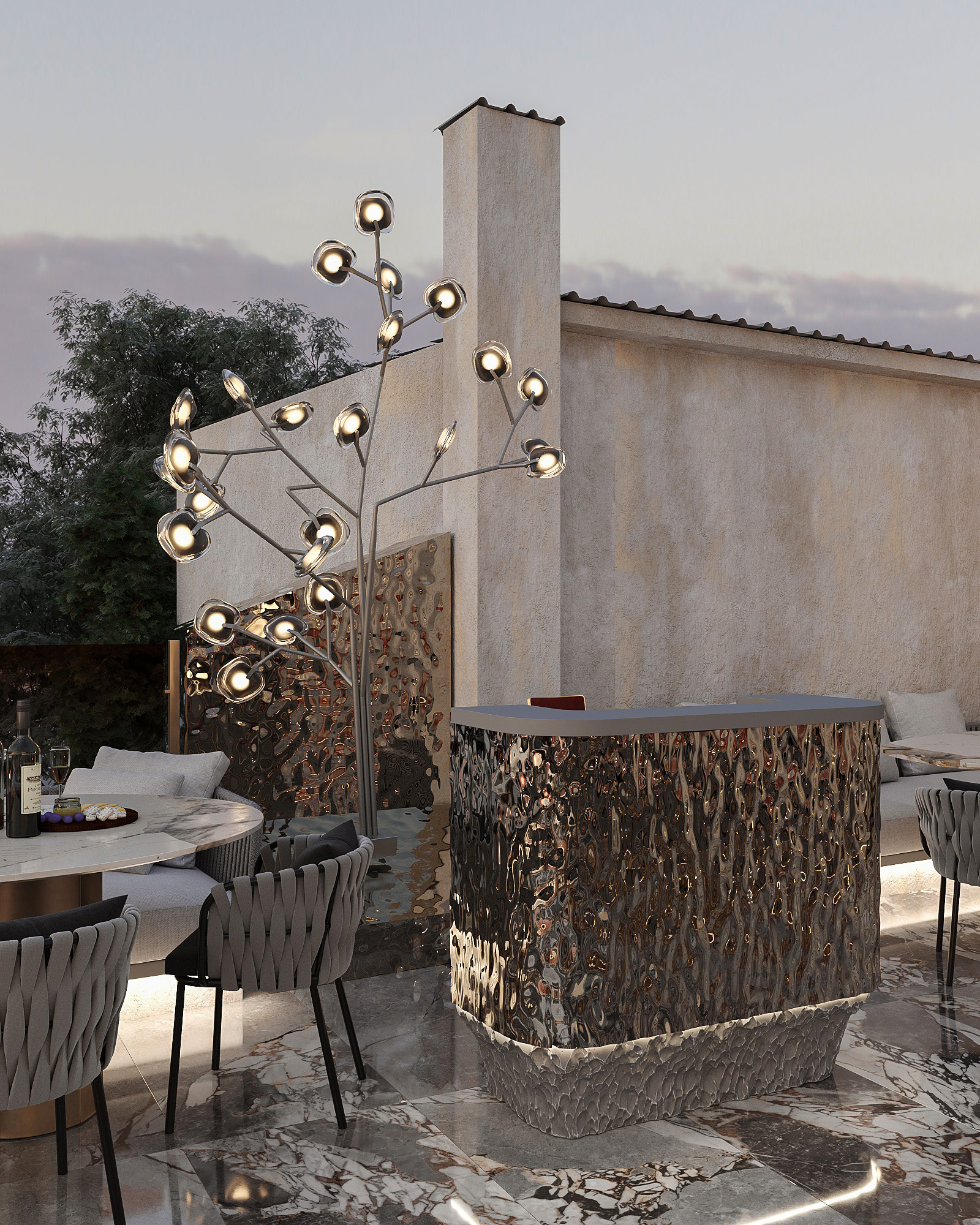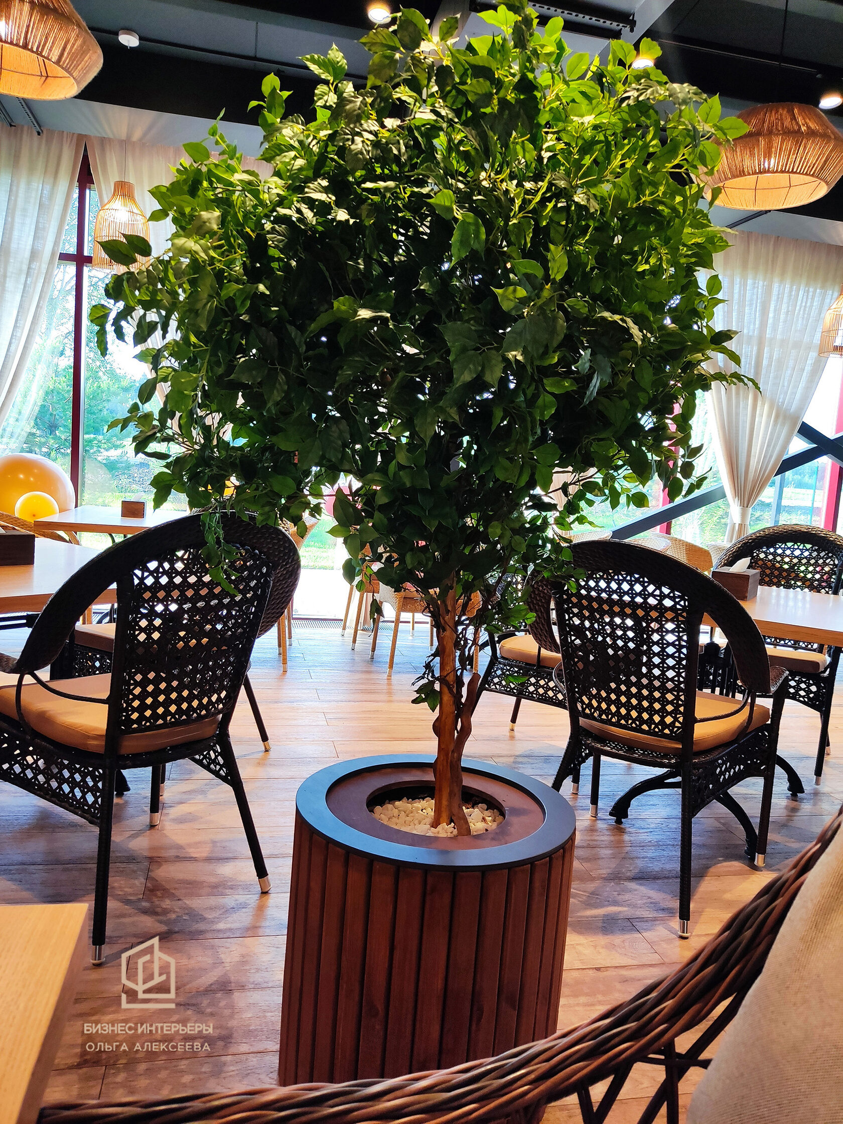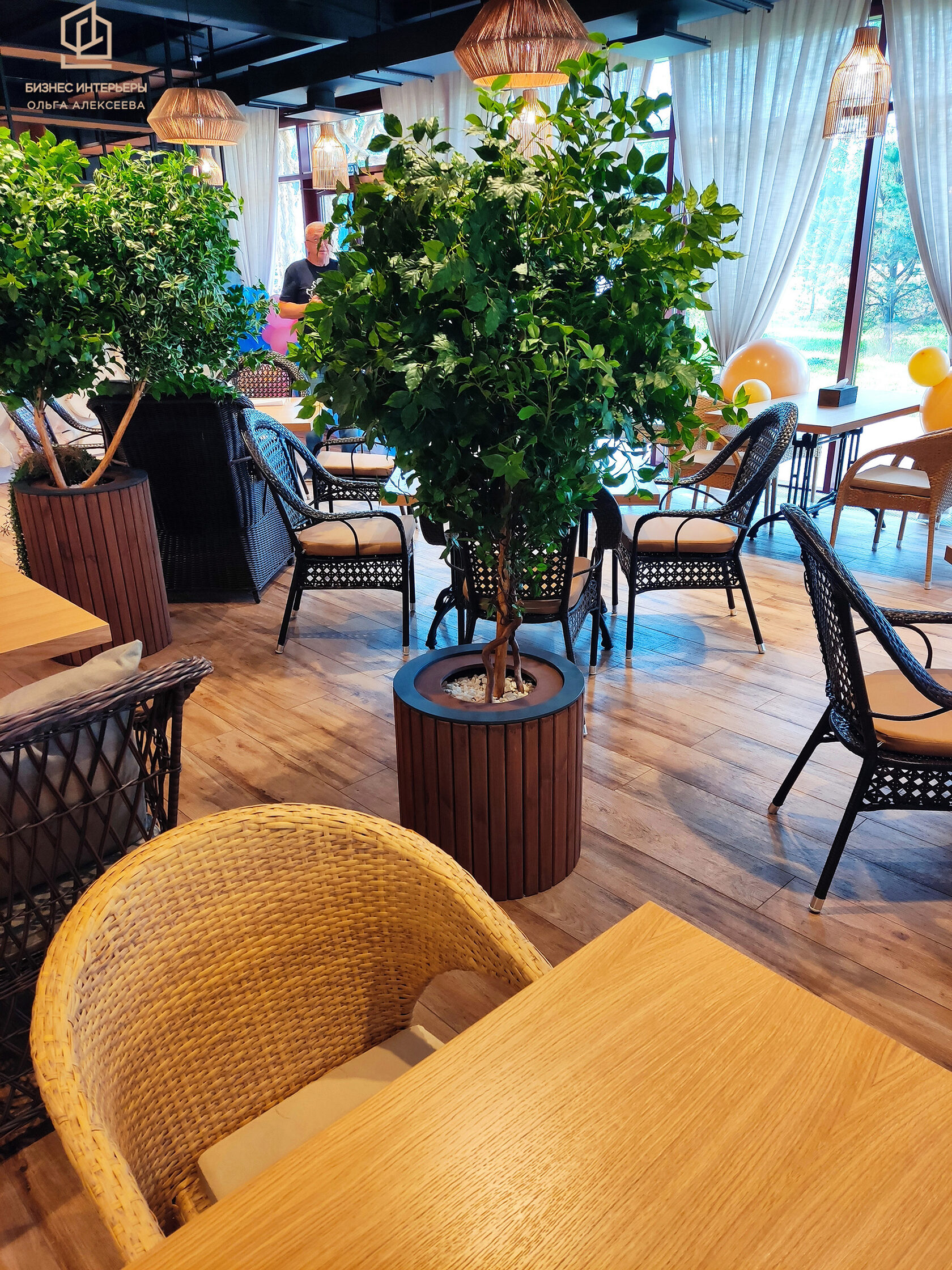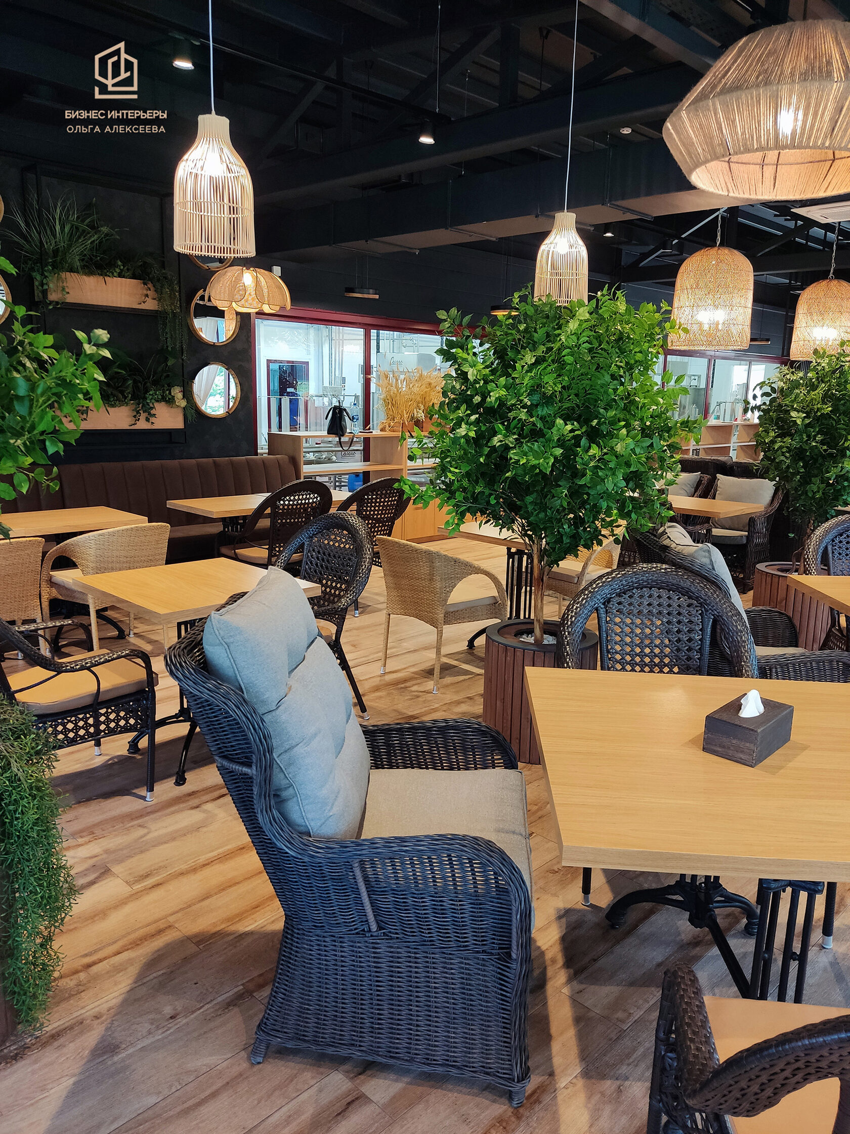Концепция: В основе концепции лежит идея создания уникального городского оазиса, который вибрирует энергией и приглашает к диалогу. Центральным арт-объектом стала эксклюзивная металлическая конструкция, выполненная по индивидуальному эскизу: сварной каркас, обрамленный живыми растениями и гирляндами-фонариками, задает динамичный тон всему пространству, становясь его смысловым и визуальным центром. Это решение позволило интегрировать природные мотивы в современную урбанистическую среду.