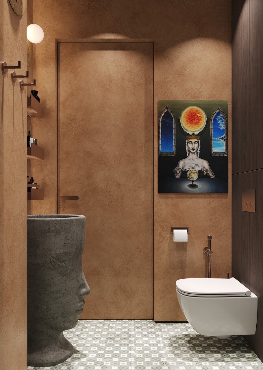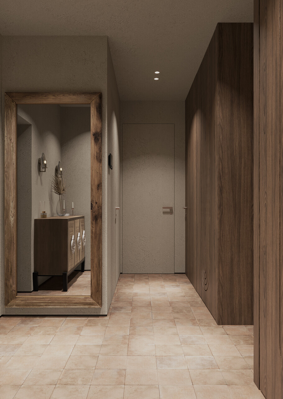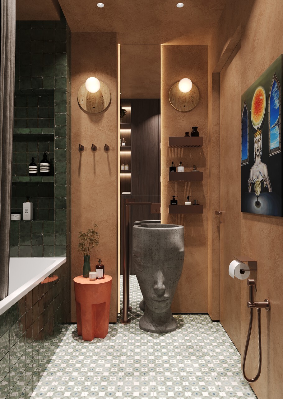 Концепция Идея интерьера родилась после вдохновляющего путешествия в Испанию. Архетипические образы южной архитектуры отразились в использовании терракотовых оттенков, аутентичной мелкой плитки, живой зелени и выразительных фактур. Стены и элементы отделки неидеальны — с трещинками, сколами, отпечатками времени. Это пространство, где ценят настоящую жизнь со всеми её несовершенствами.