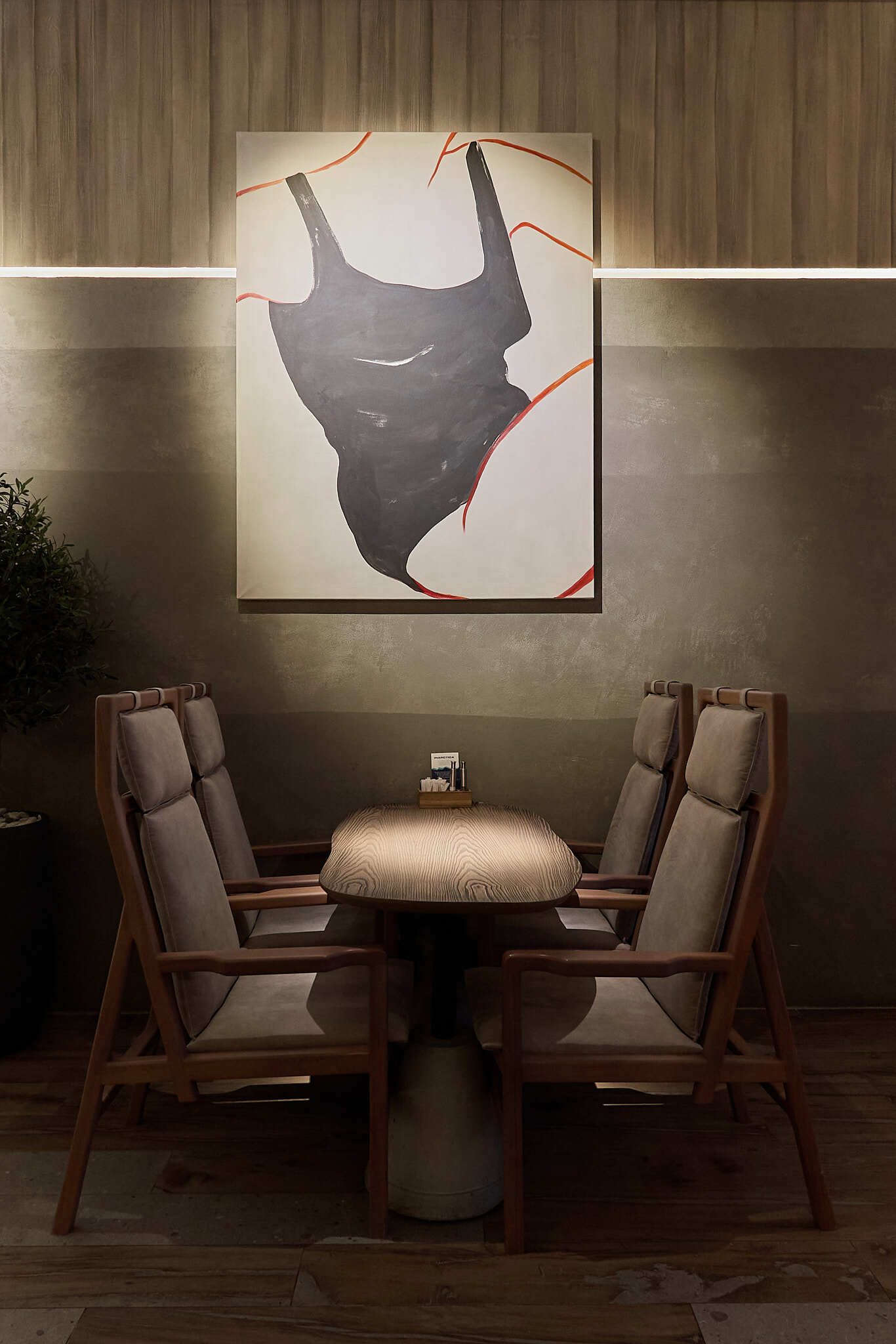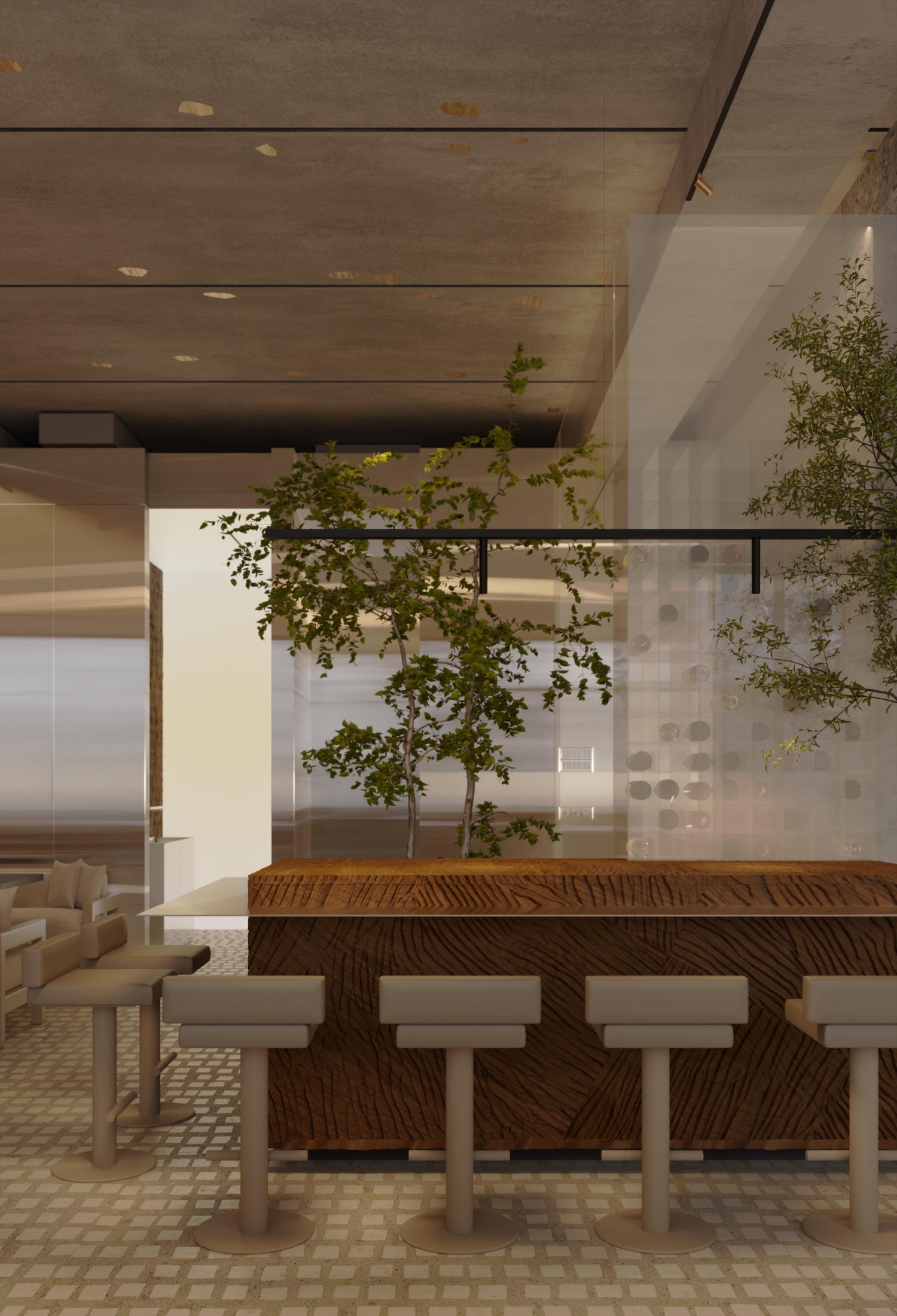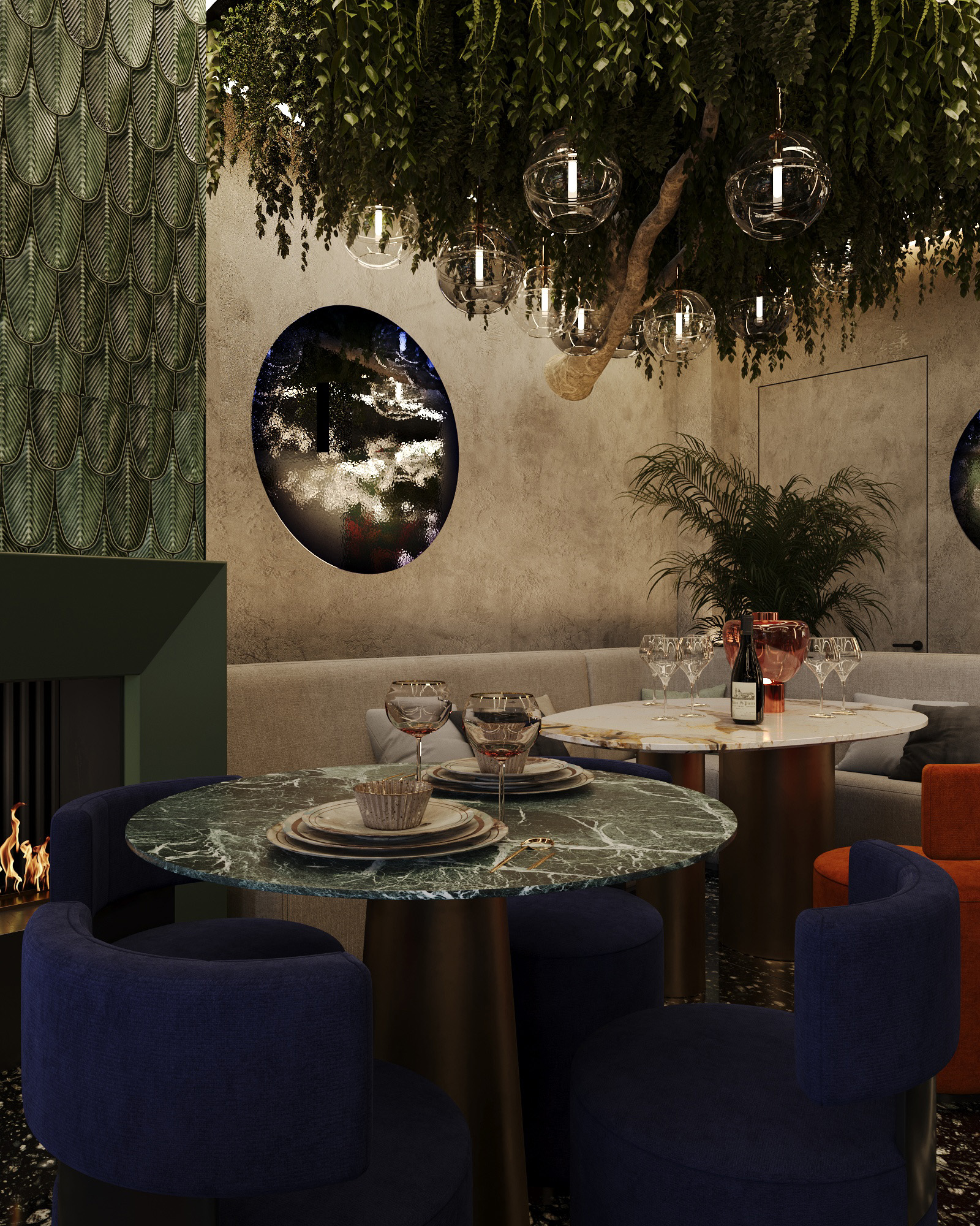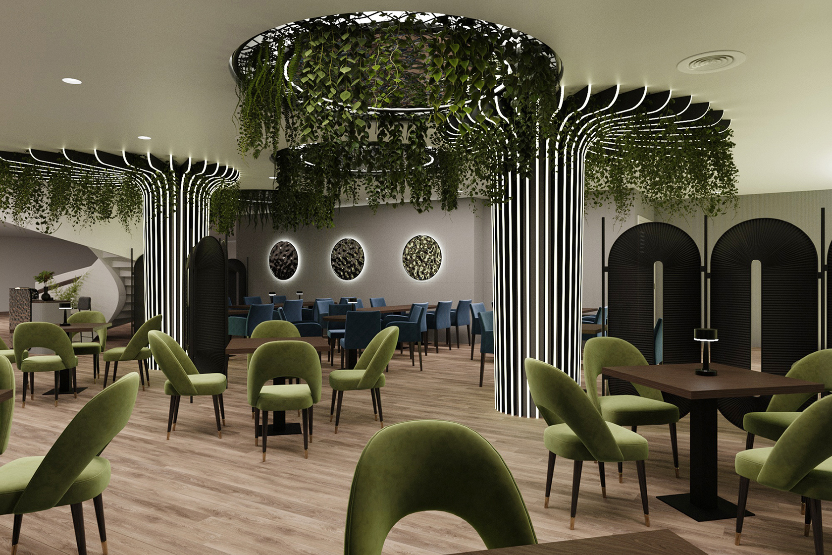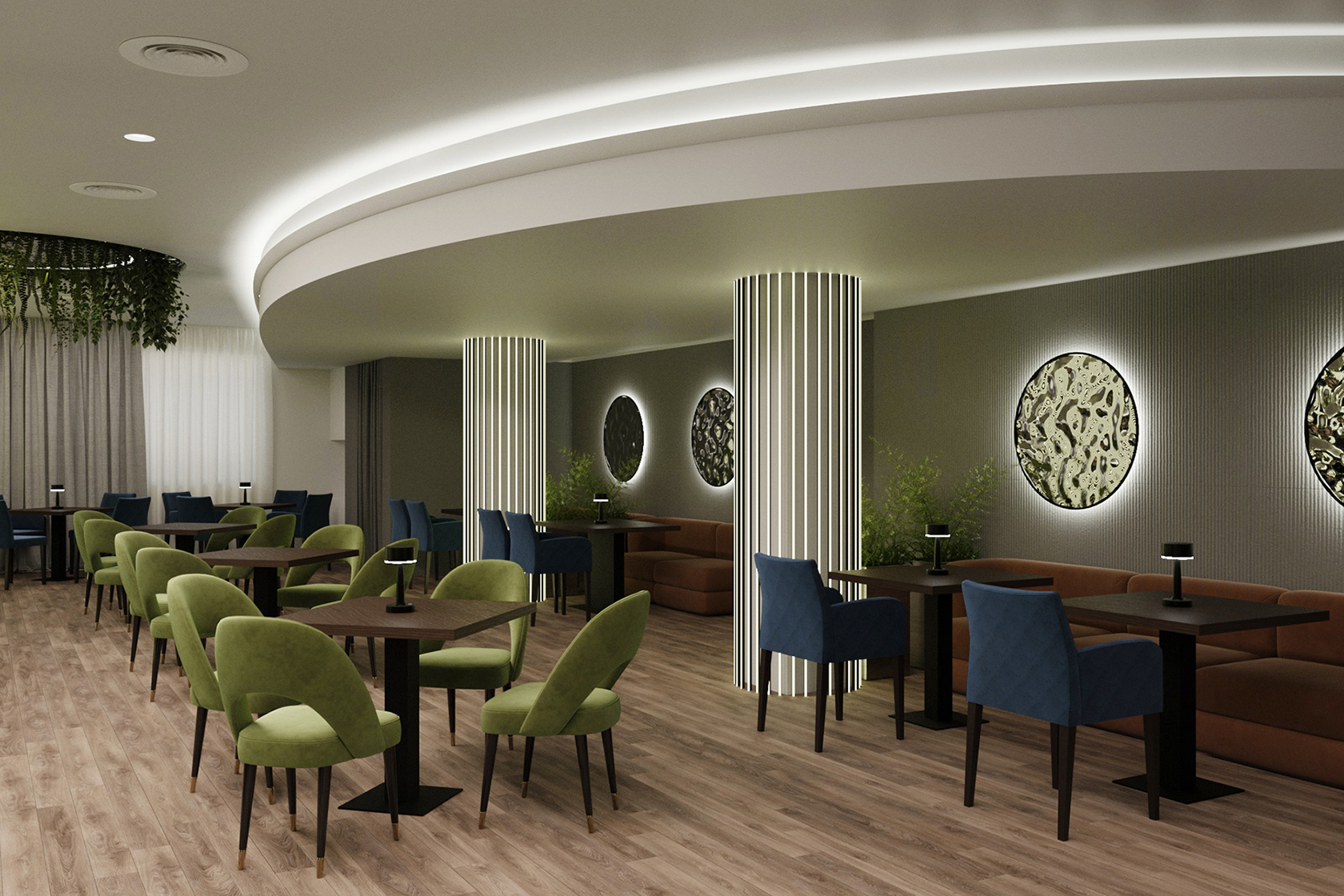 Концепция: Основная идея проекта — создание многофункционального пространства, где дизайн и комфорт служат искусству гастрономии. Концепция построена на контрасте текстур: органическая база из бамбуковых панелей с эффектом камня дополнена металлическими элементами и продуманным миксом мебели (округлые зеленые стулья и брутальные синие кресла), создающим визуальную динамику. Интегрированная подсветка и живая зелень завершают образ, делая каждый визит уникальным опытом.