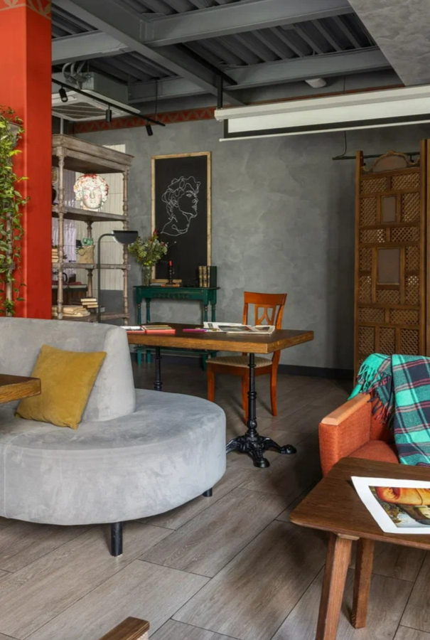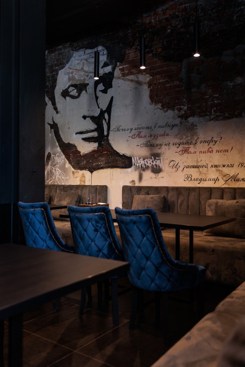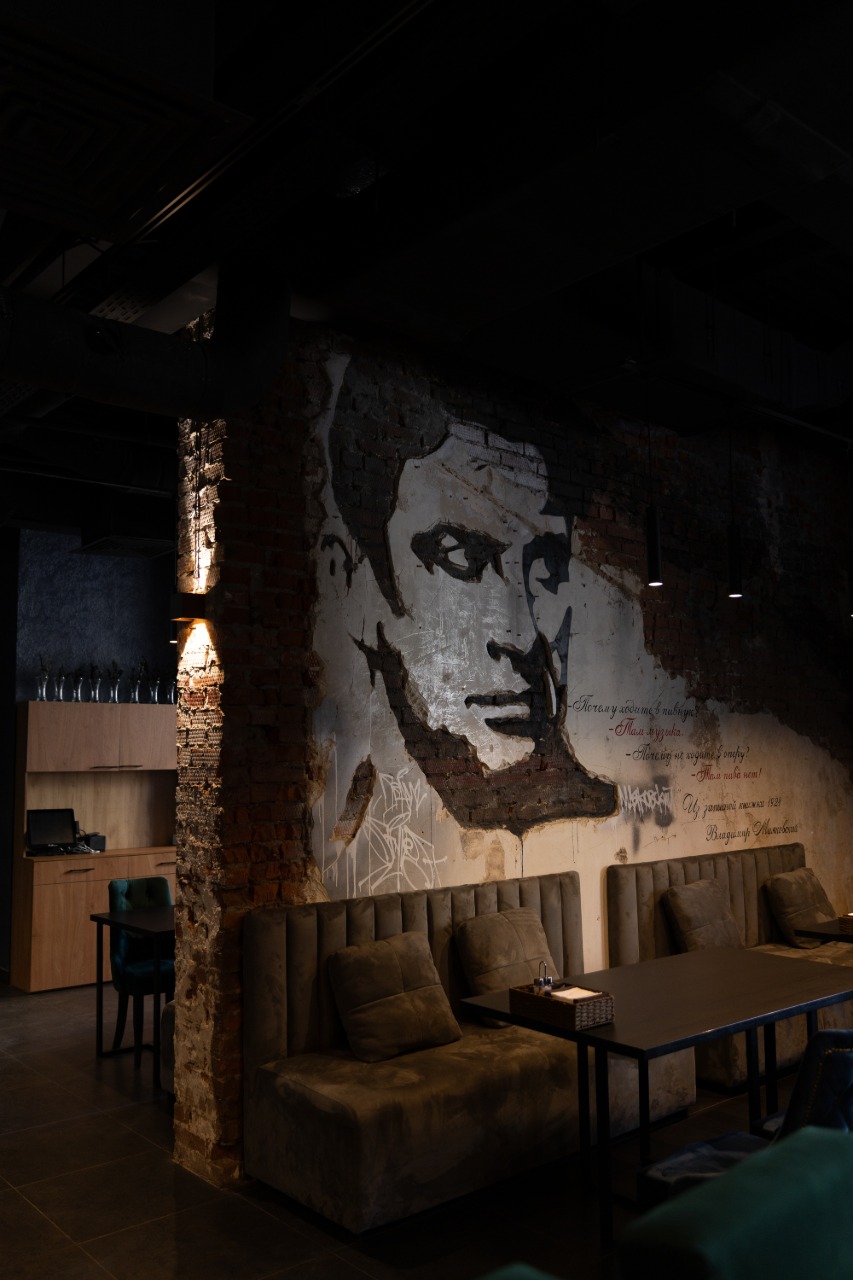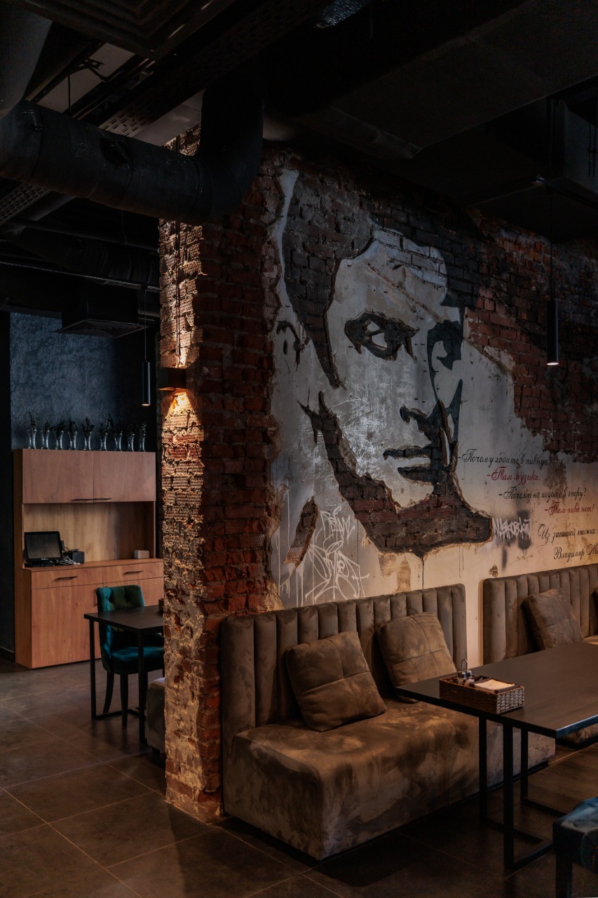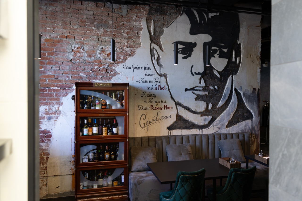 Концепция: В основе дизайна лежит философия открытости пространства: высокие потолки, демонстрация естественной текстуры необработанных кирпичных и бетонных стен, а также открытые коммуникации. Эти элементы не только подчеркивают характер помещения, но и создают особую аутентичную среду. Ключевой художественной деталью являются изображения великих русских поэтов, Есенина и Маяковского, виртуозно выполненные на двух стенах через обработку старой штукатурки, что придает интерьеру глубокую культурную отсылку.