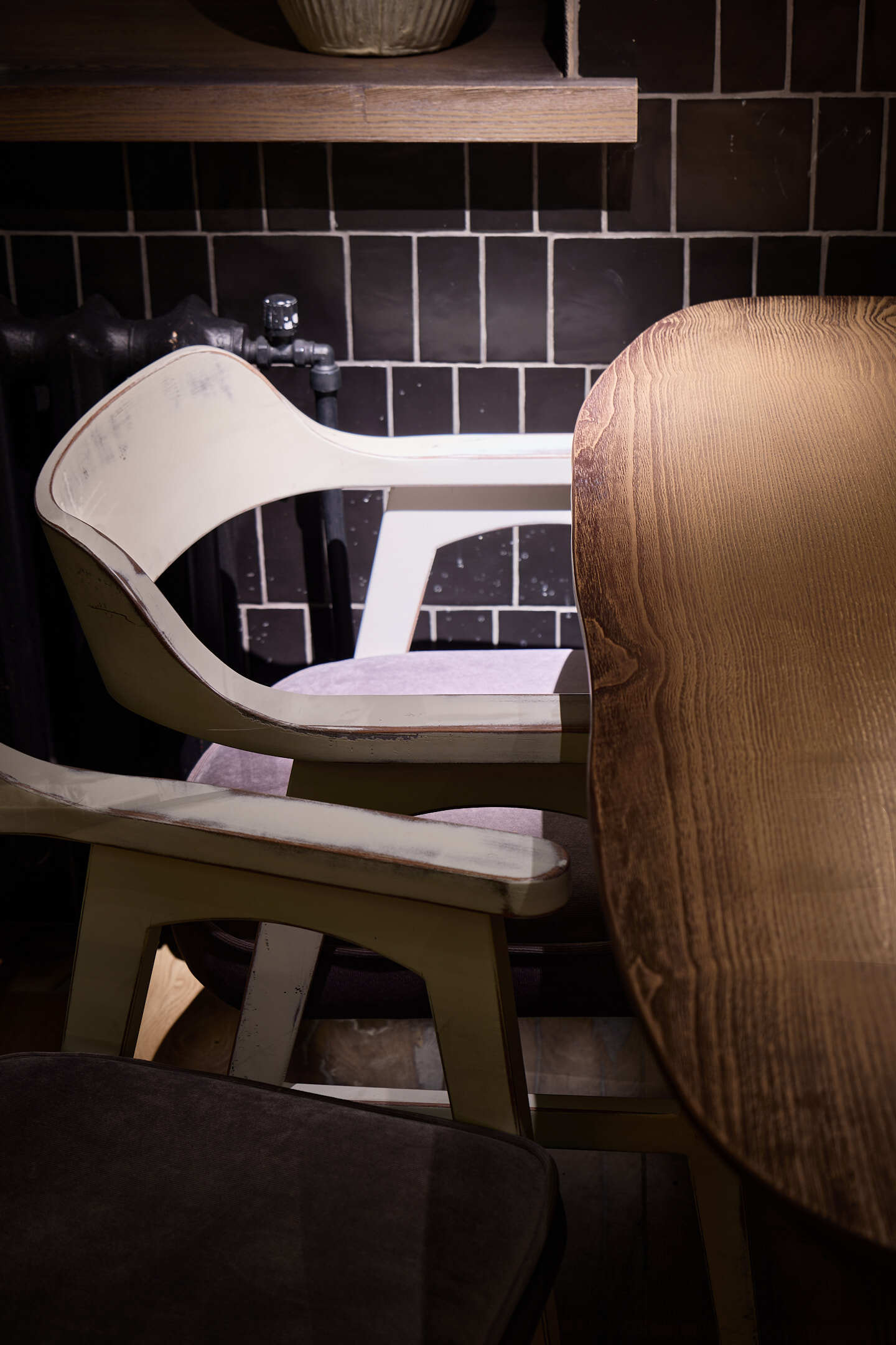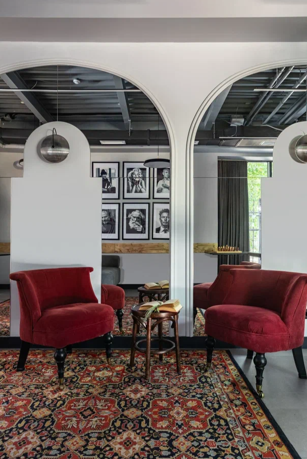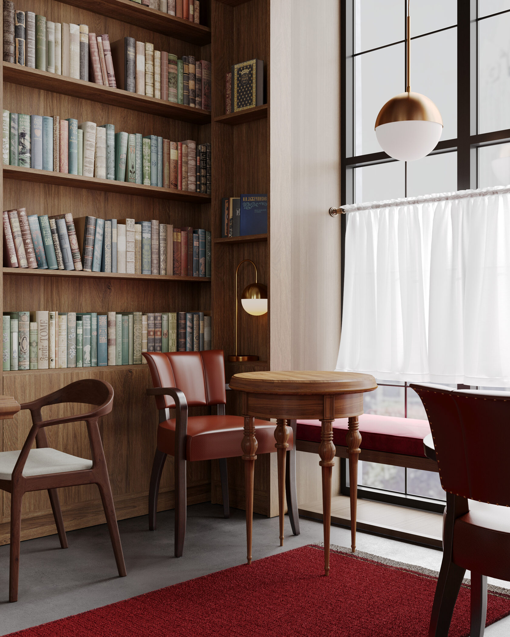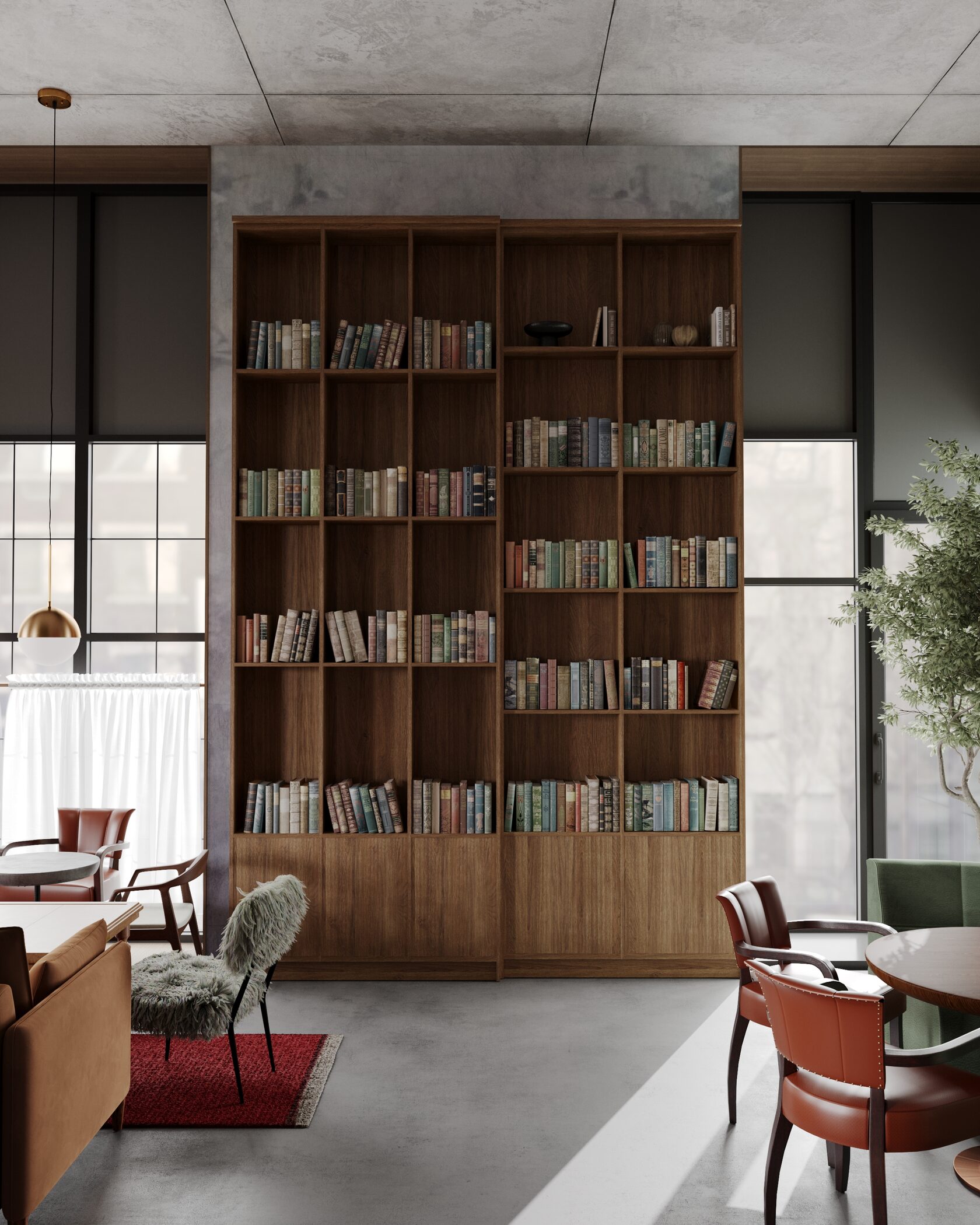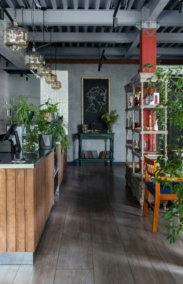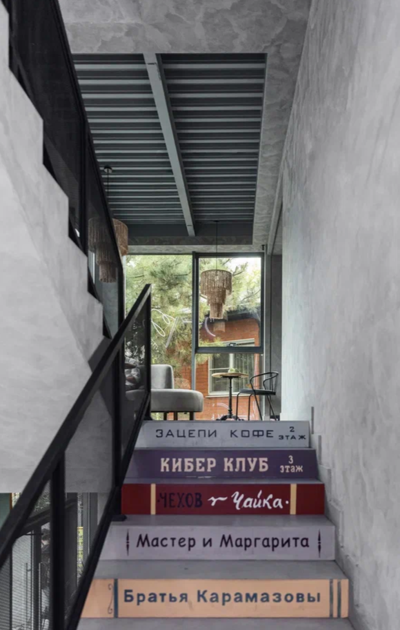 Концепция: В основе дизайна лежит философия открытости пространства: высокие потолки, демонстрация естественной текстуры необработанных кирпичных и бетонных стен, а также открытые коммуникации. Эти элементы не только подчеркивают характер помещения, но и создают особую аутентичную среду. Ключевой художественной деталью являются изображения великих русских поэтов, Есенина и Маяковского, виртуозно выполненные на двух стенах через обработку старой штукатурки, что придает интерьеру глубокую культурную отсылку.