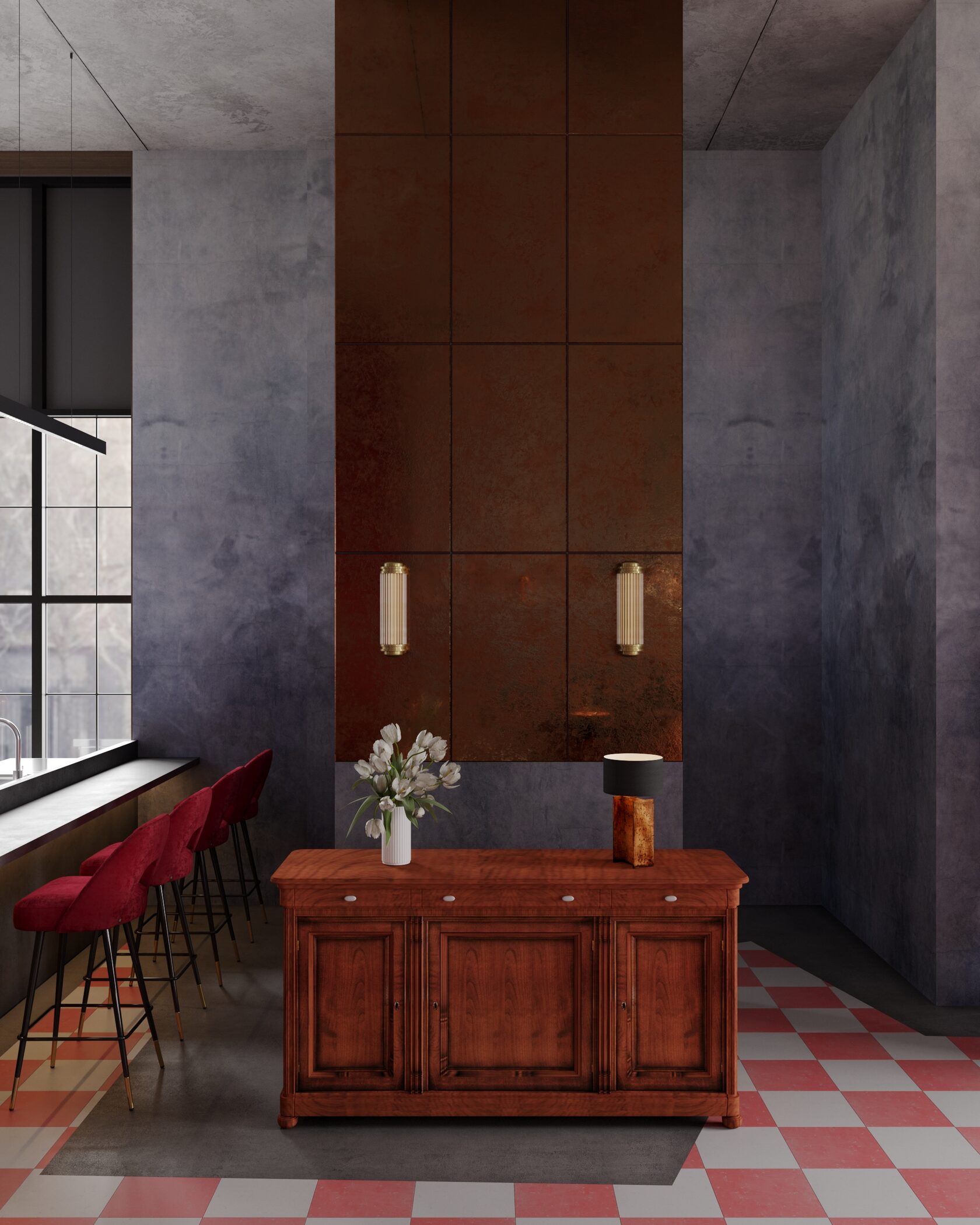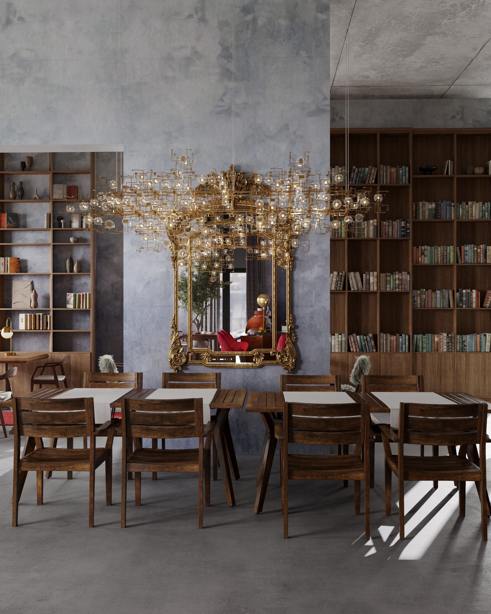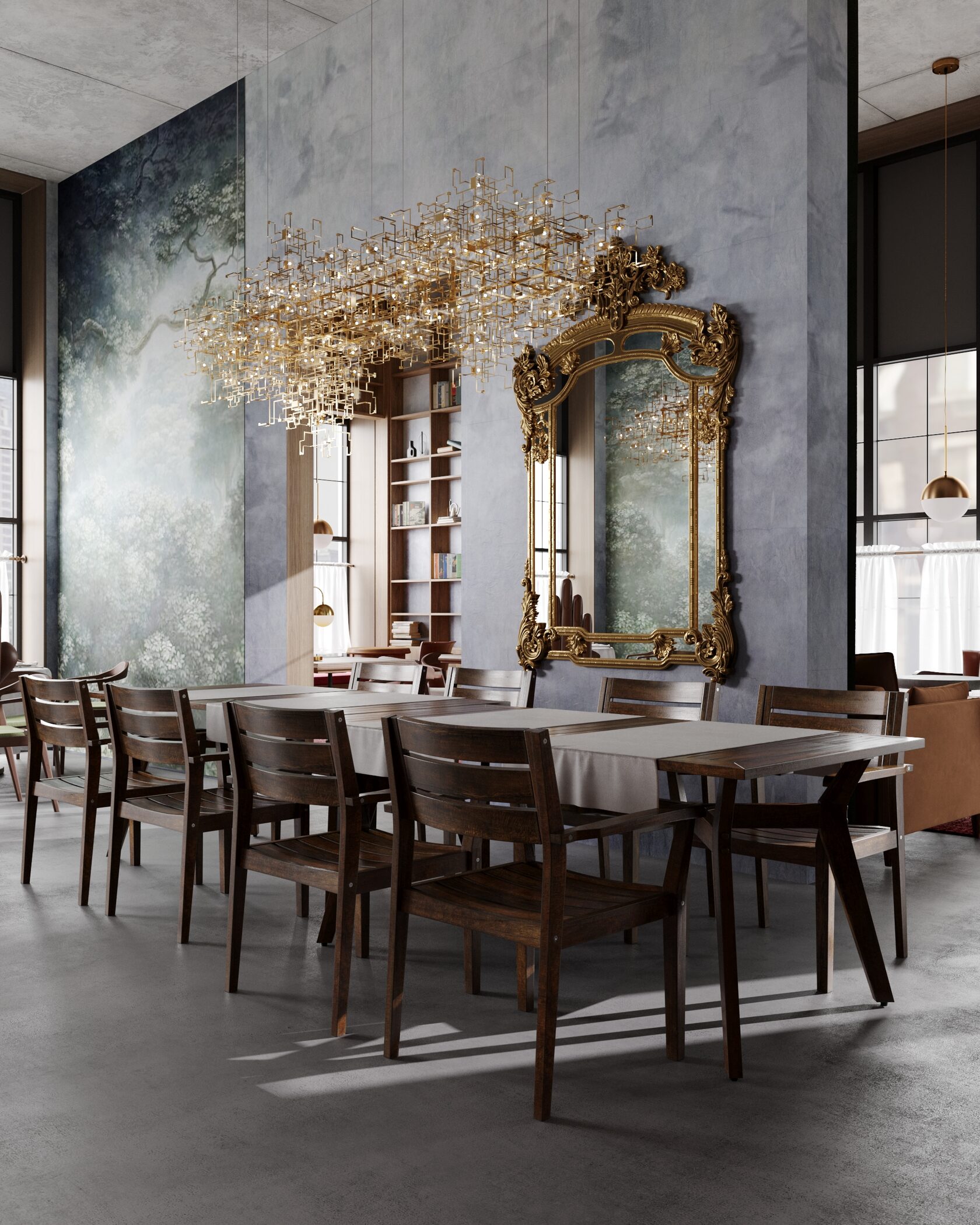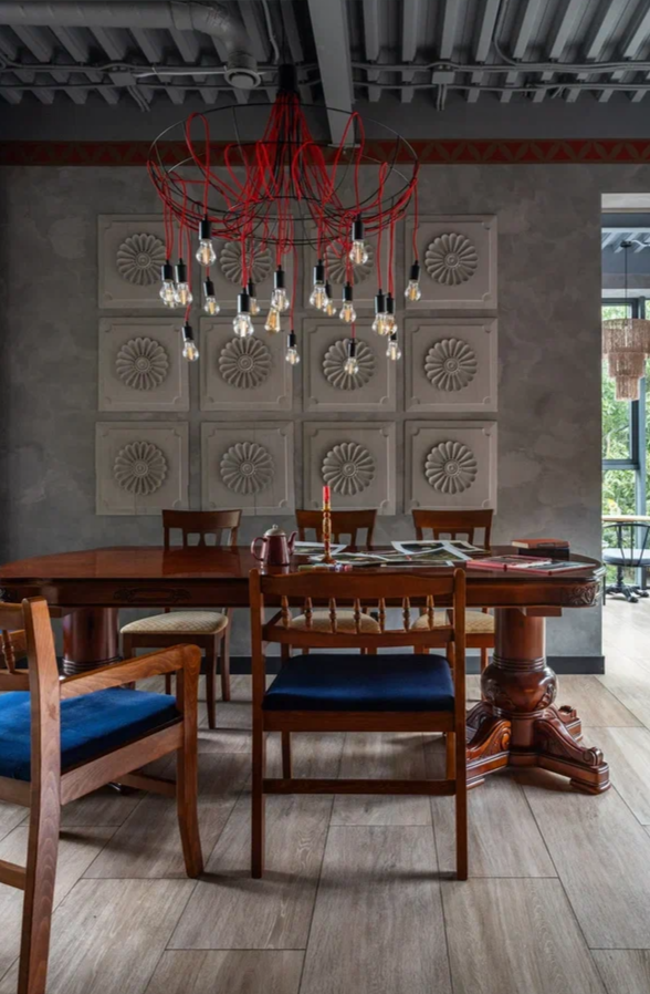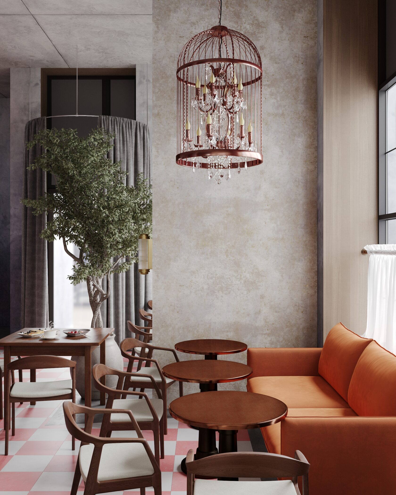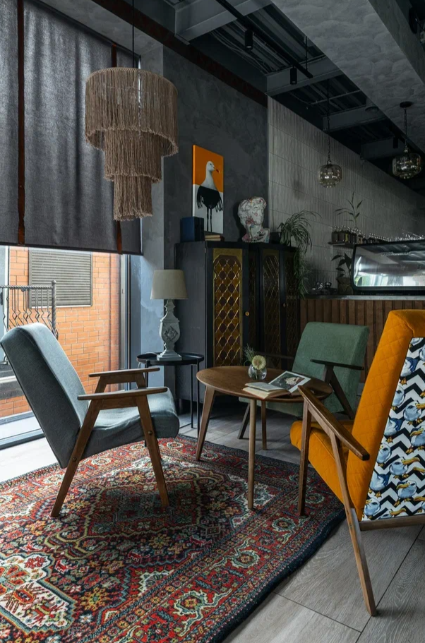 Концепция: Основная концепция — создание уникального и запоминающегося интерьера, провоцирующего на изучение каждой детали. В дизайне применяются оригинальные светильники и мебель из необычных материалов, дополненные динамичными геометрическими формами и смелыми цветовыми сочетаниями. Цель — создать пространство, которое притягивает и вызывает желание рассматривать всё вокруг.