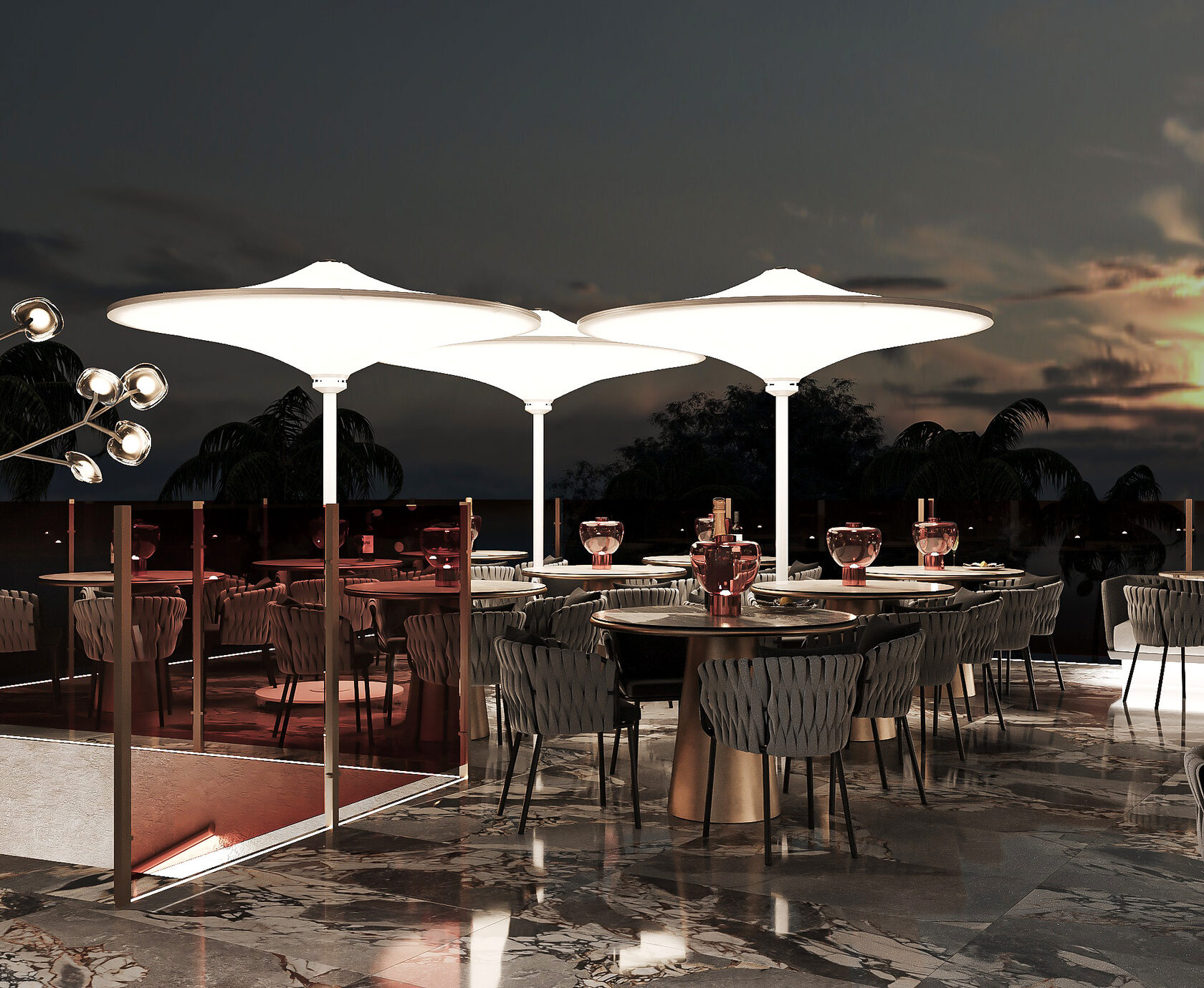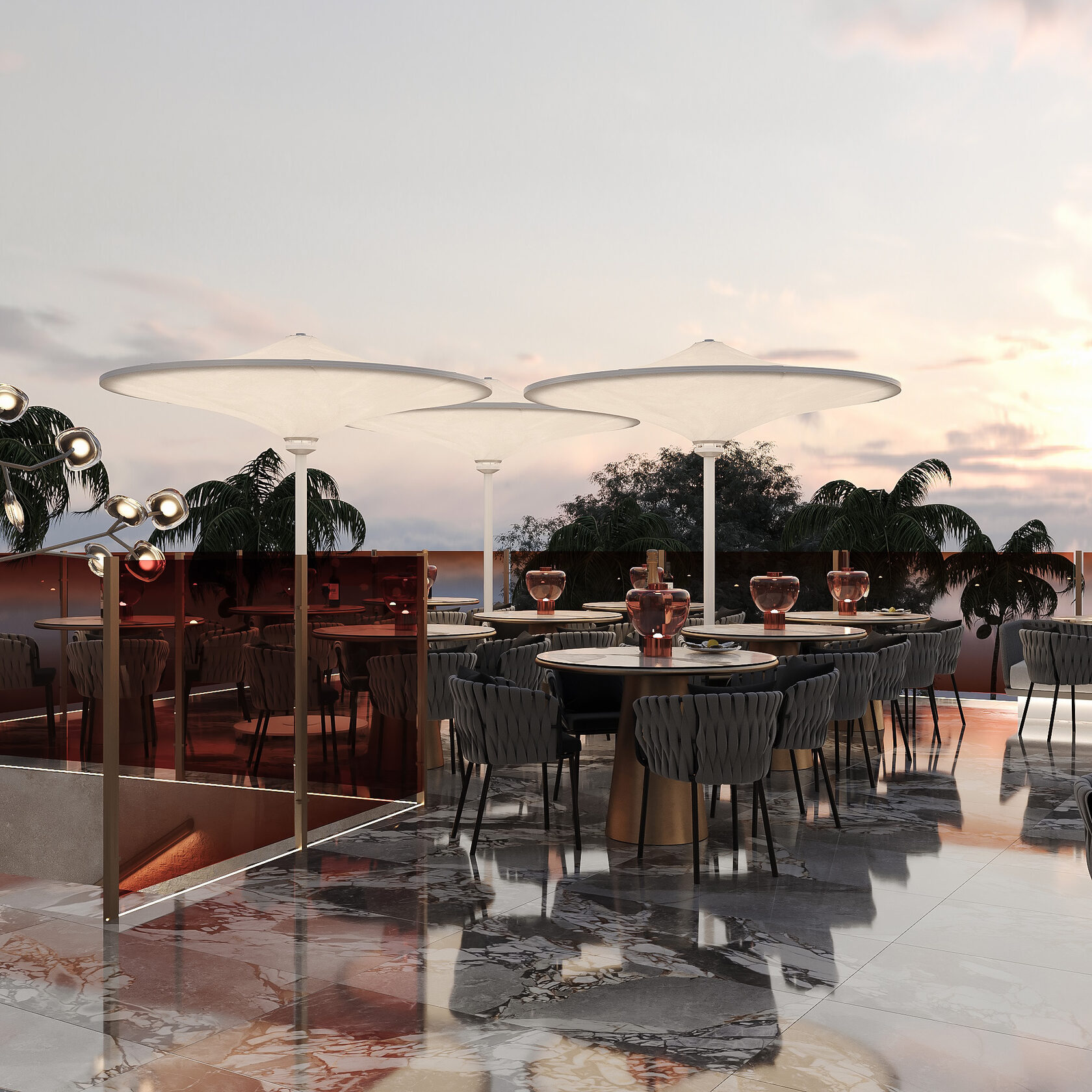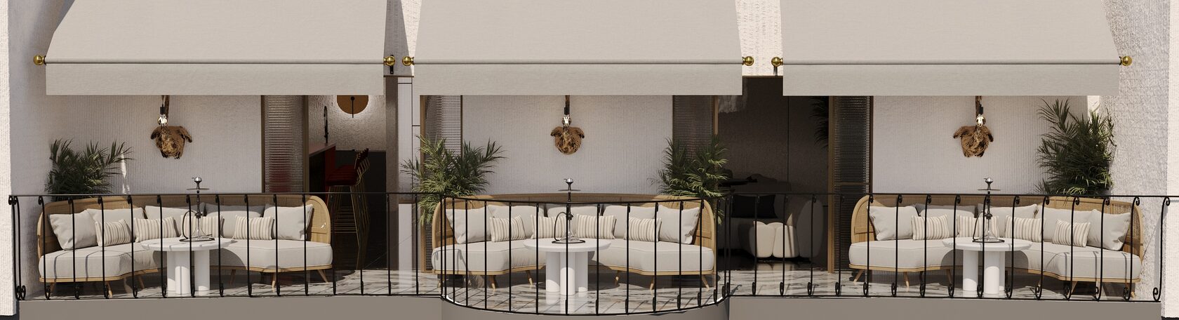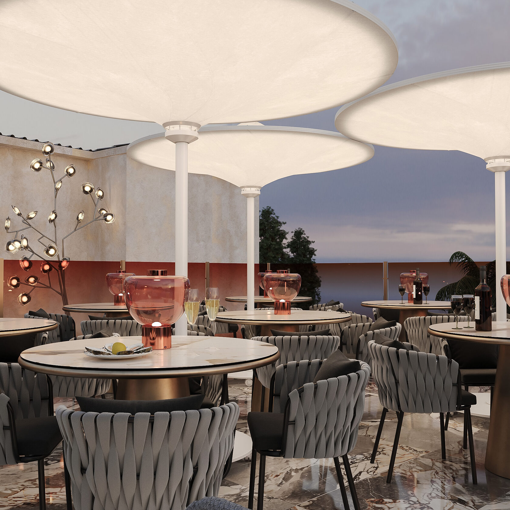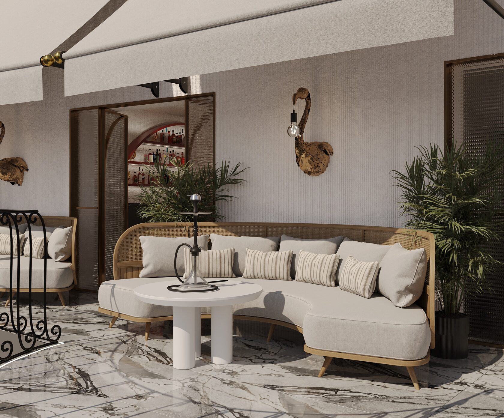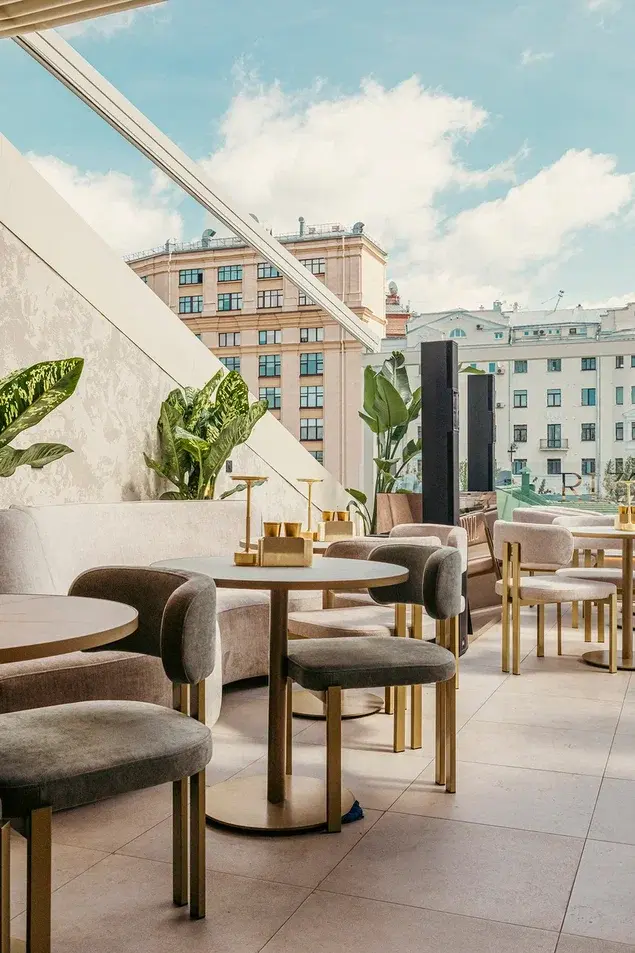 Концепция: Основная идея проекта — создание дизайнерского оазиса свежести, простора и южного уюта прямо в сердце Москвы. Концепция предусматривает перенос атмосферы Средиземноморья в городскую среду через использование природных материалов, обильной зелени и создание функционального, но при этом эстетически безупречного пространства, отвечающего высоким стандартам гостеприимства и жизненно необходимого для столичного лета.
