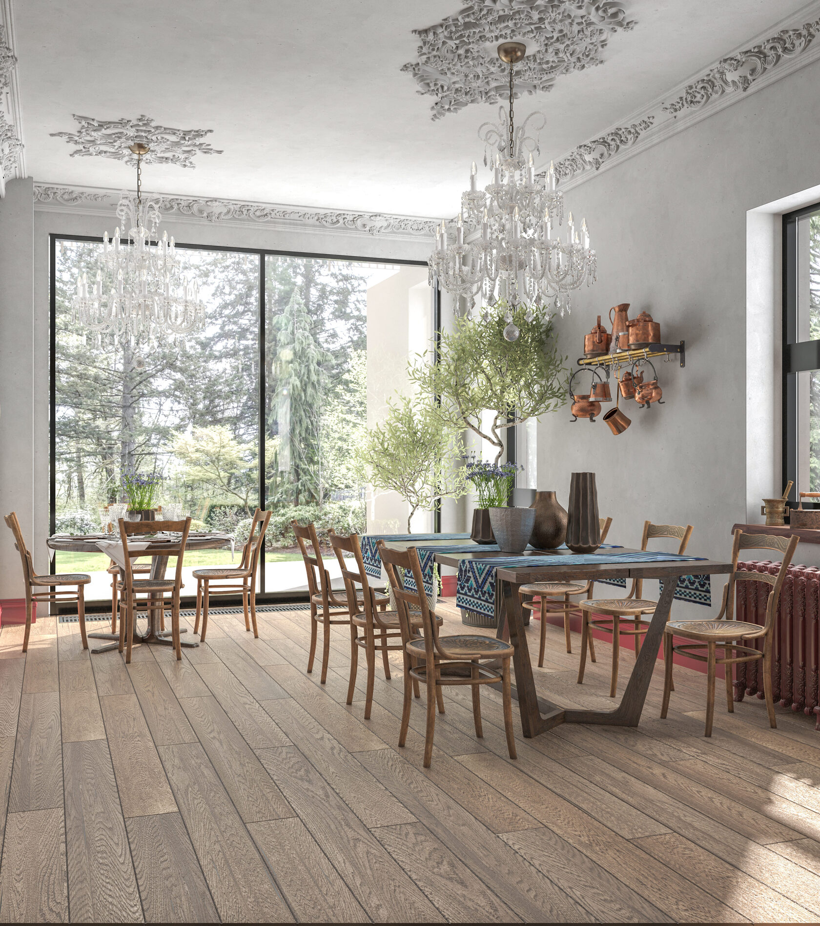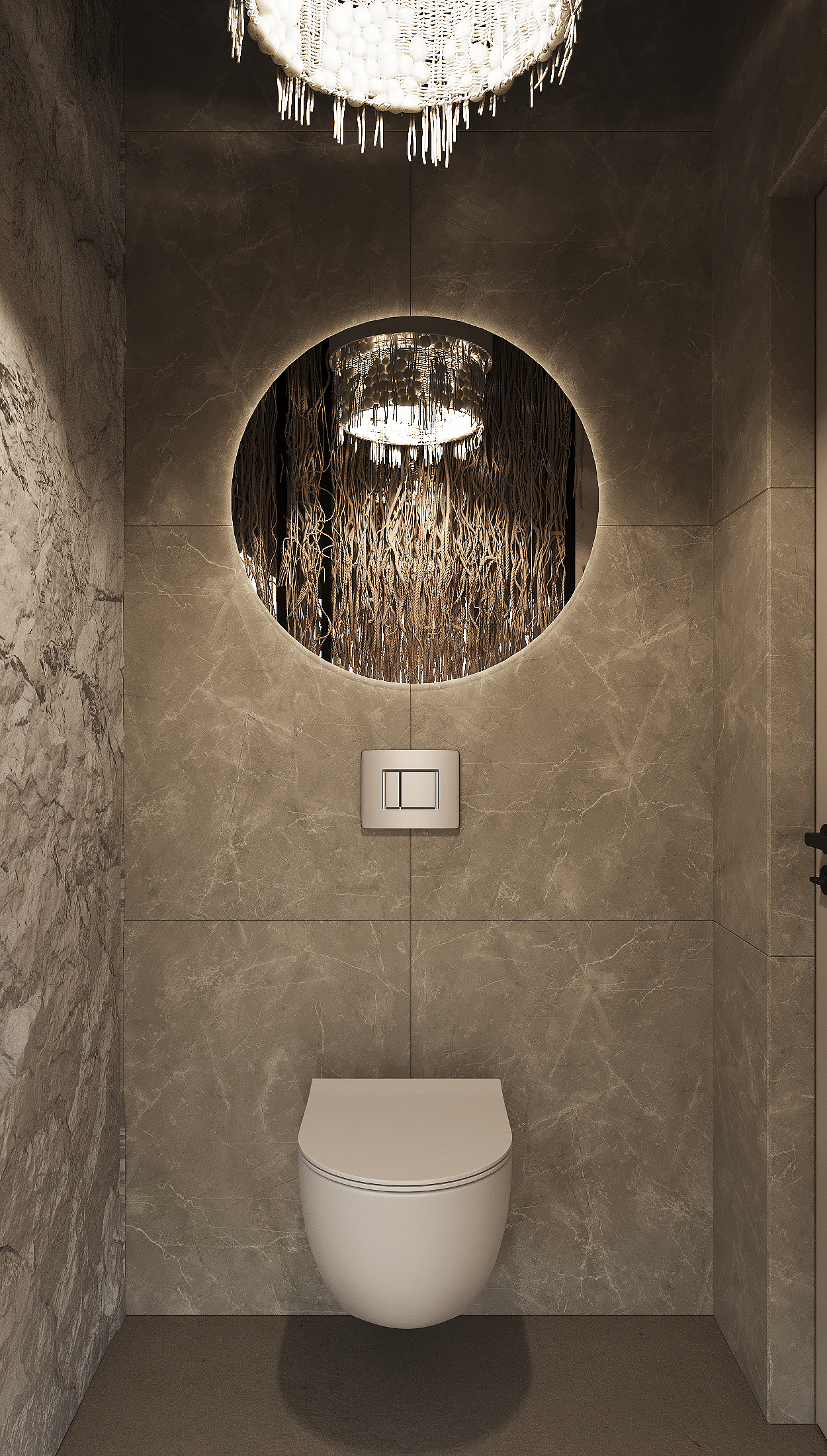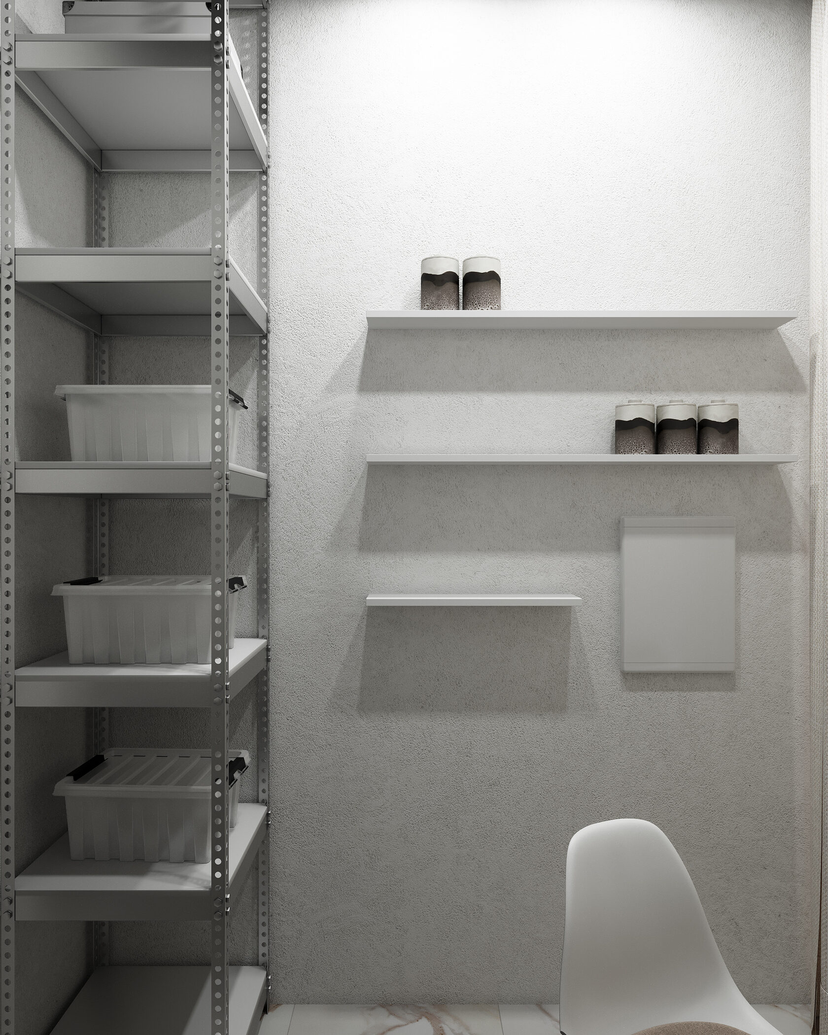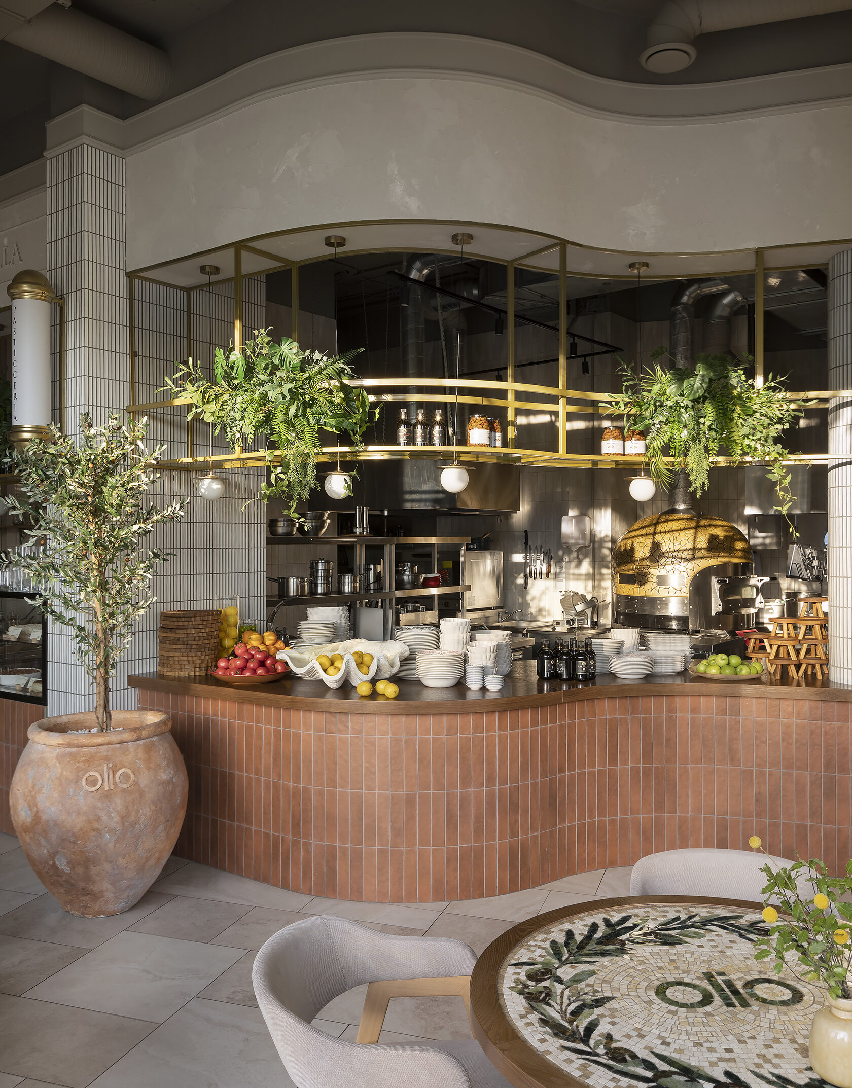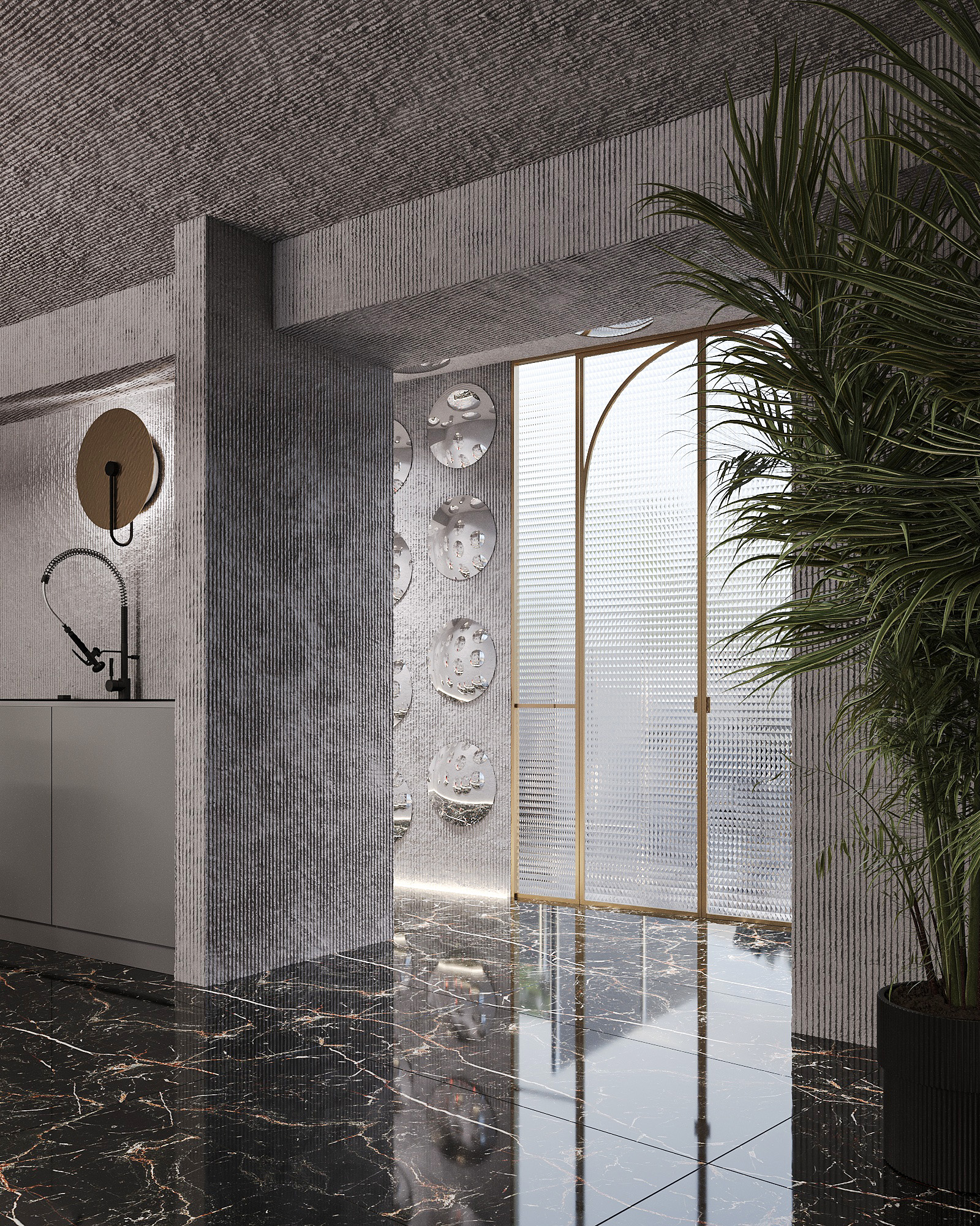 Концепция: Основу концепции составляет глубокое погружение в итальянский пейзаж и культуру. Центральные элементы – уникальные терракотовые горшки с оливковыми деревьями, подчеркивающие природную эстетику. Палитра интерьера сформирована из натуральных материалов: известняка, песчаника, каррарского мрамора и необработанной древесины, объединенных оттенком серой гальки. Вынужденное архитектурное решение с монолитными колоннами было трансформировано в элегантную античную арку, ставшую эффектным центром композиции, вокруг которой организованы обеденная зона и открытая кухня. Декоративные элементы, включая мозаику с оливами, ручную роспись стен по мотивам фресок Виллы Ливия и барельефные надписи на итальянском, довершают формирование неповторимого колорита.