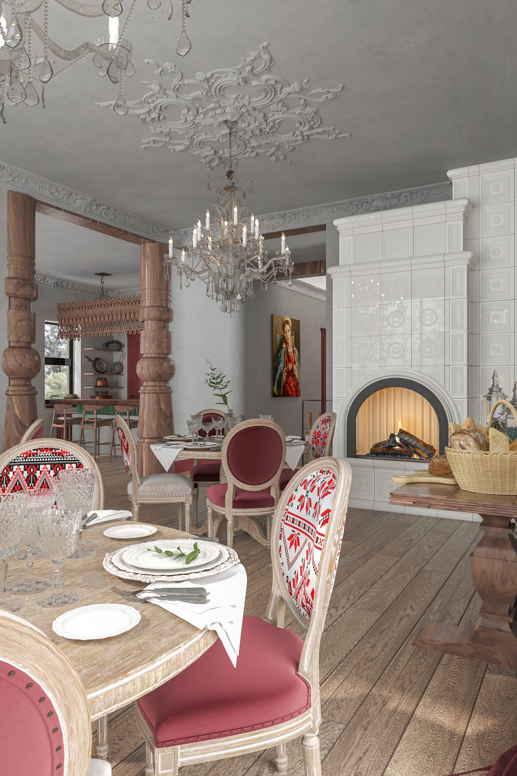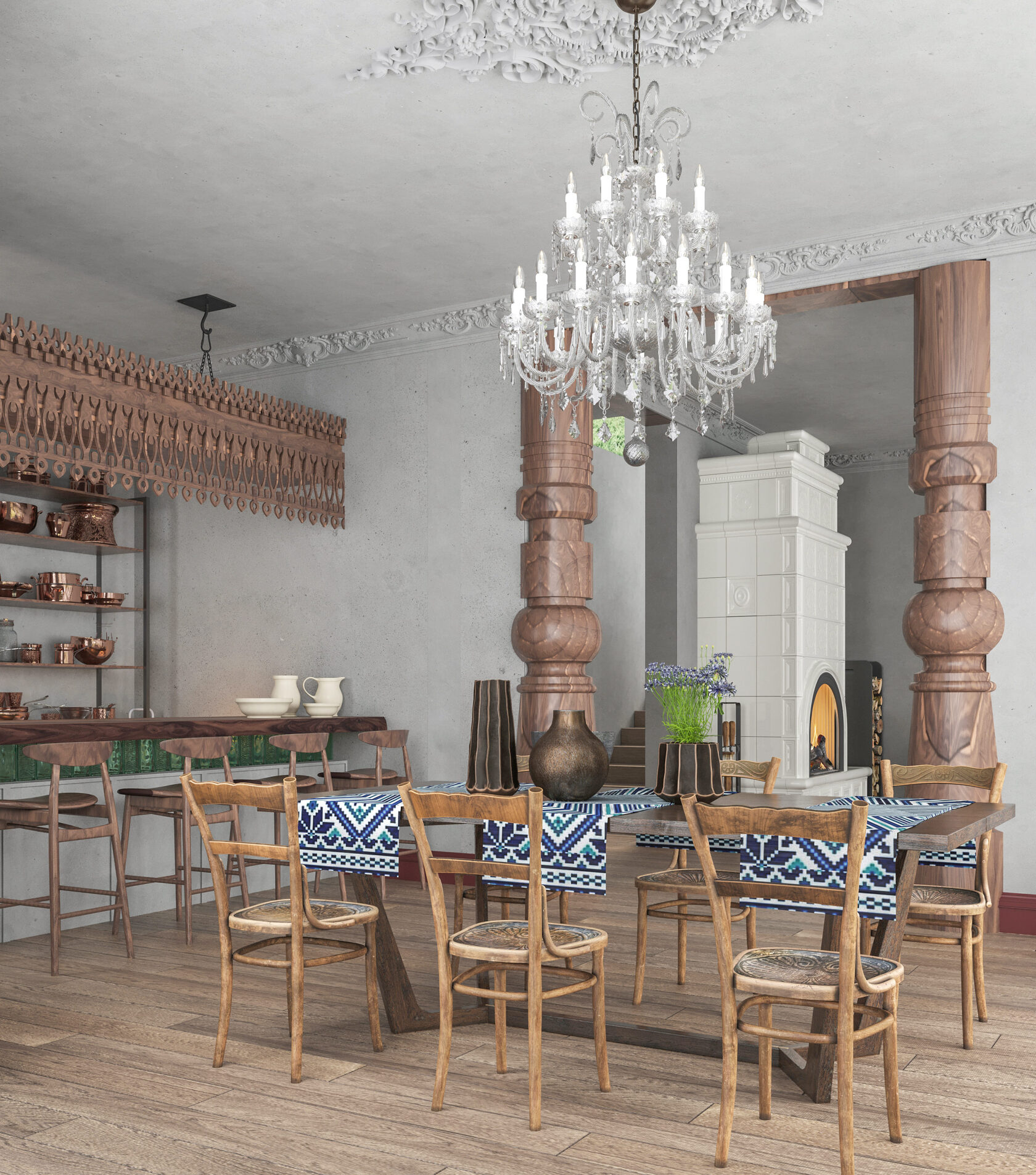 Проект ресторана «ЛадЪ» воссоздает атмосферу исконного русского дома, не имитируя старину, а передавая дух обжитого пространства. Центральным элементом является изразцовый камин-печь, выполненный вручную, символизирующий домашний очаг. Авторская барная стойка и резные порталы из дуба создают эстетический акцент и визуальную связь с традициями. Интерьер выполнен из натуральных материалов: массива дуба, керамики, текстиля с традиционными узорами, меди и кованого металла.