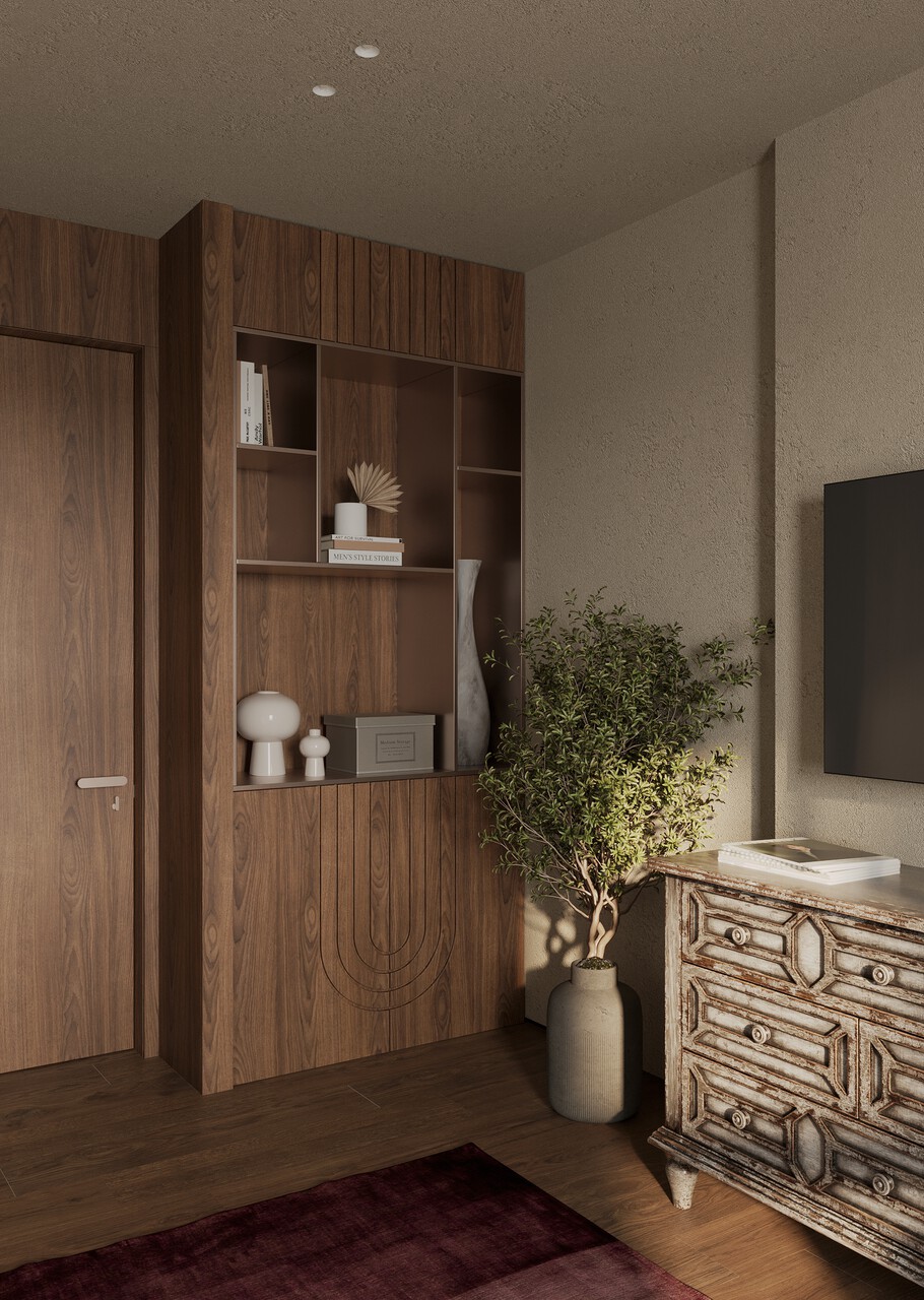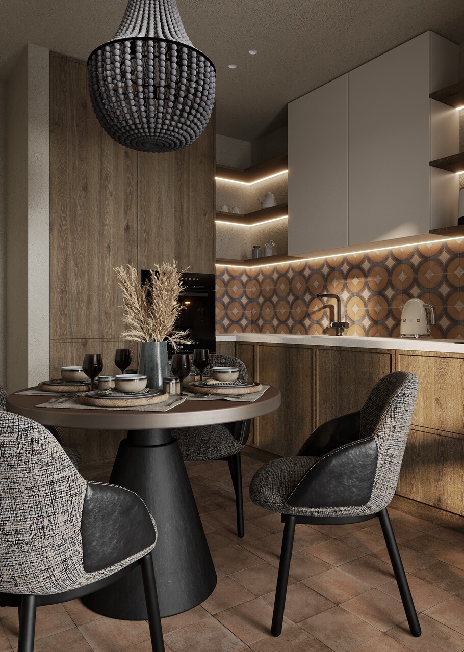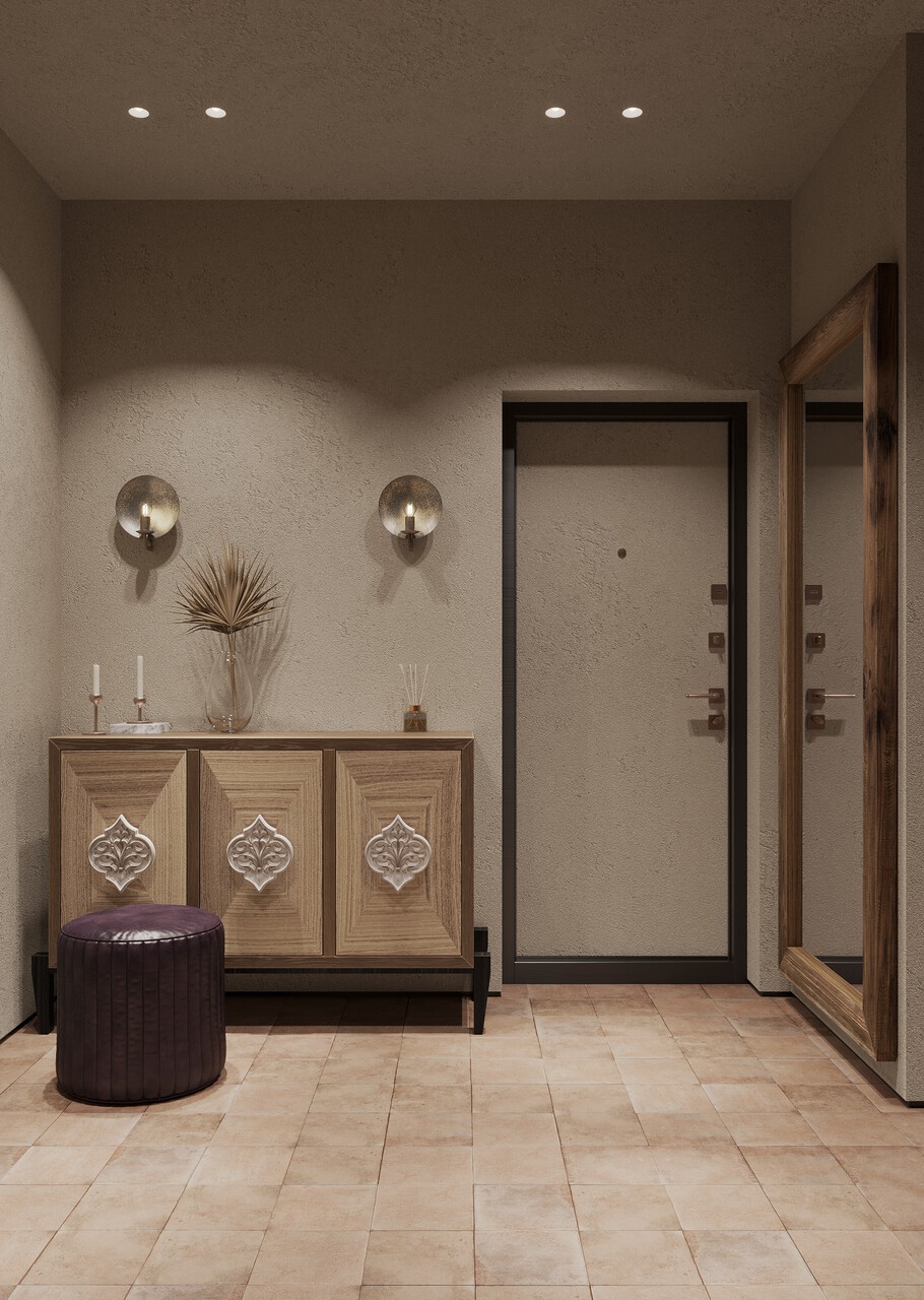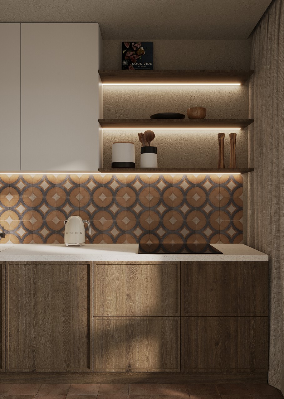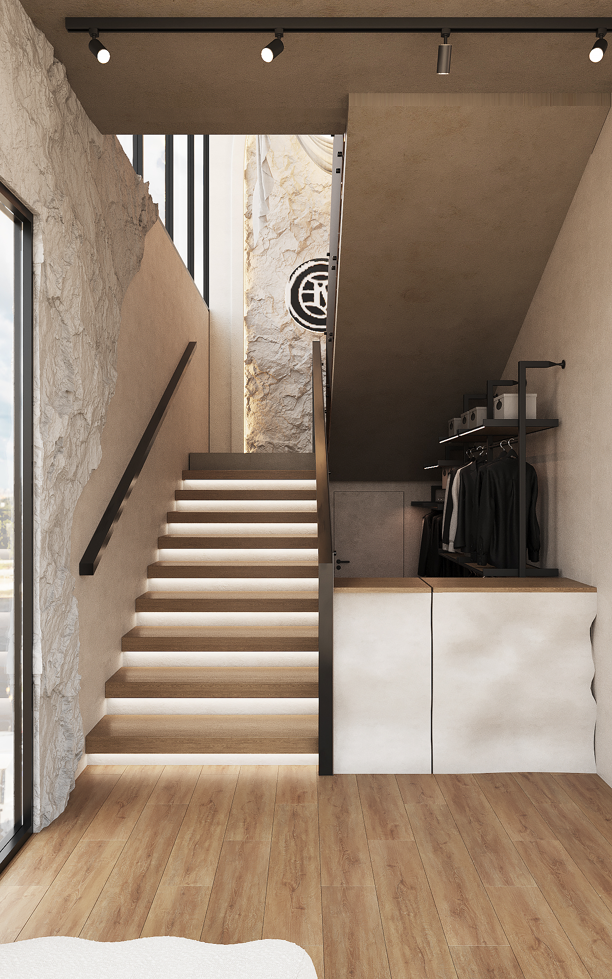 Концепция: Основная идея проекта — формирование динамичного и запоминающегося пространства, где каждый элемент подчеркивает диалог между современными тенденциями и культурным наследием. Ключевая роль отведена рациональному зонированию, позволившему оптимизировать небольшую площадь и создать многоуровневые функциональные зоны. Это достигнуто через смелое сочетание фактур и оттенков, придающих интерьеру уникальную атмосферу уюта и локальной идентичности.