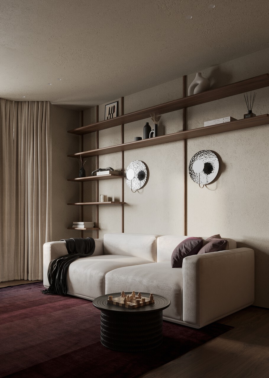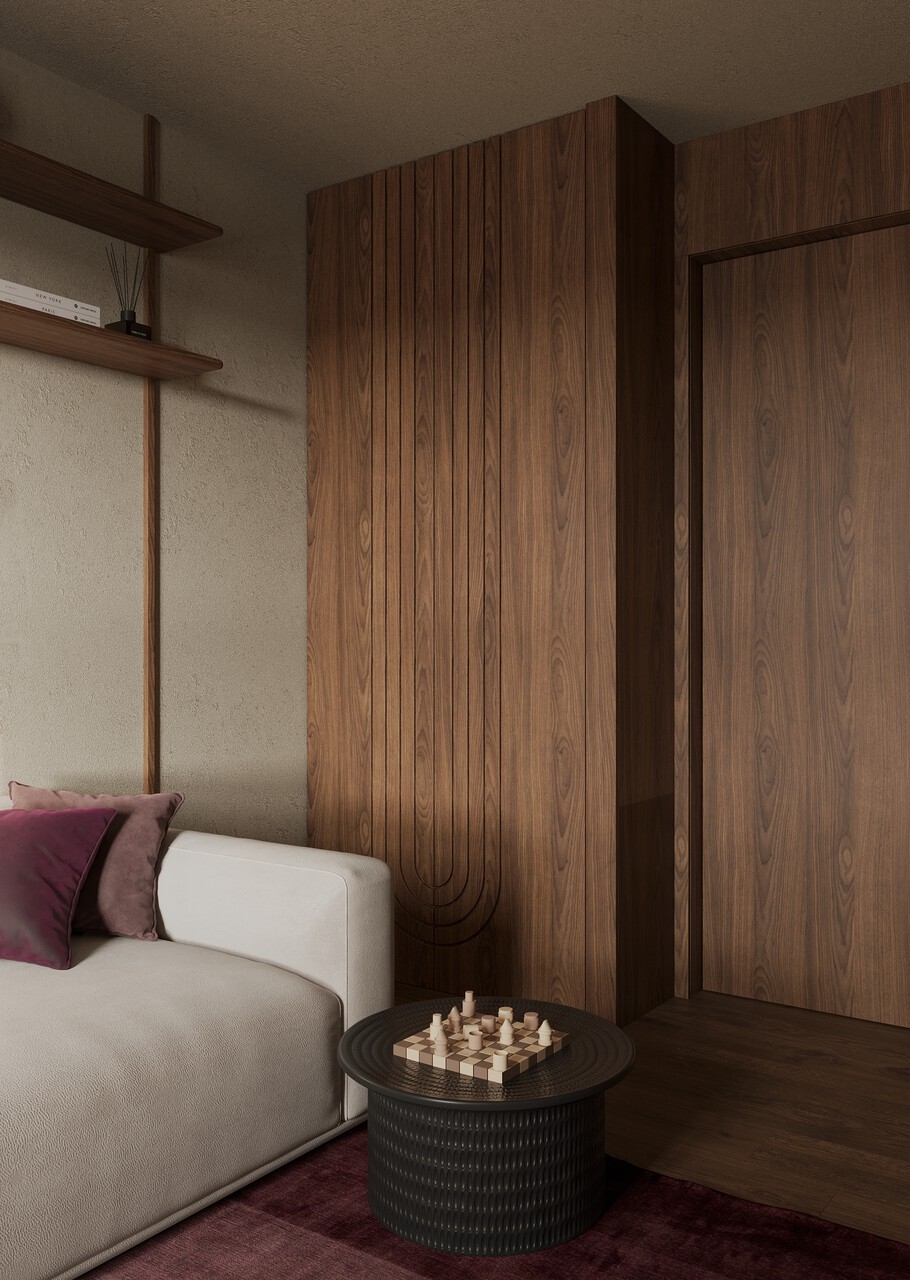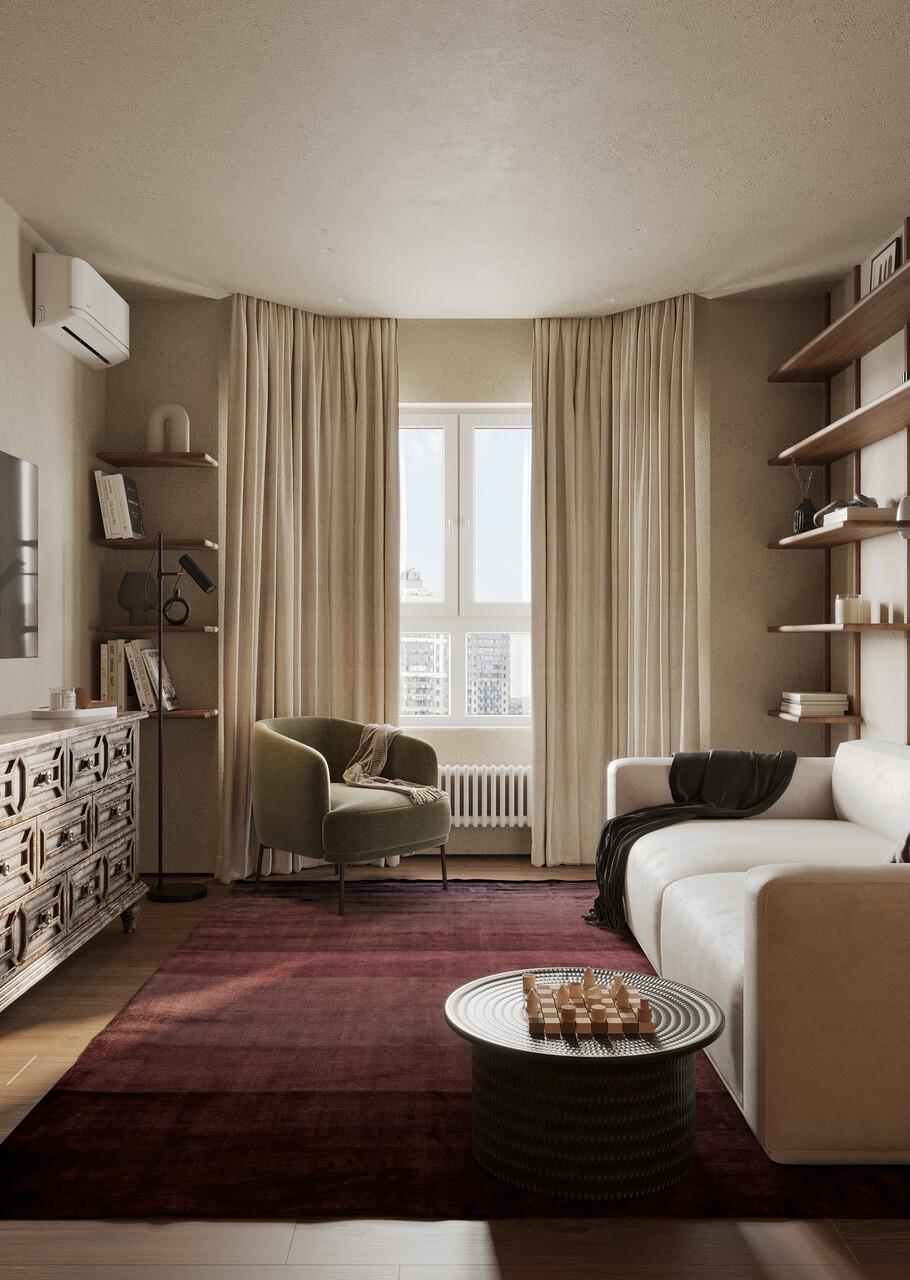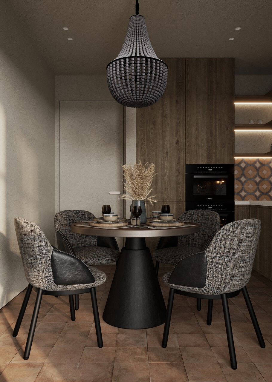 Концепция: Основная идея проекта — формирование динамичного и запоминающегося пространства, где каждый элемент подчеркивает диалог между современными тенденциями и культурным наследием. Ключевая роль отведена рациональному зонированию, позволившему оптимизировать небольшую площадь и создать многоуровневые функциональные зоны. Это достигнуто через смелое сочетание фактур и оттенков, придающих интерьеру уникальную атмосферу уюта и локальной идентичности.