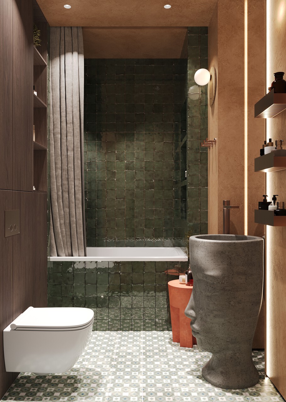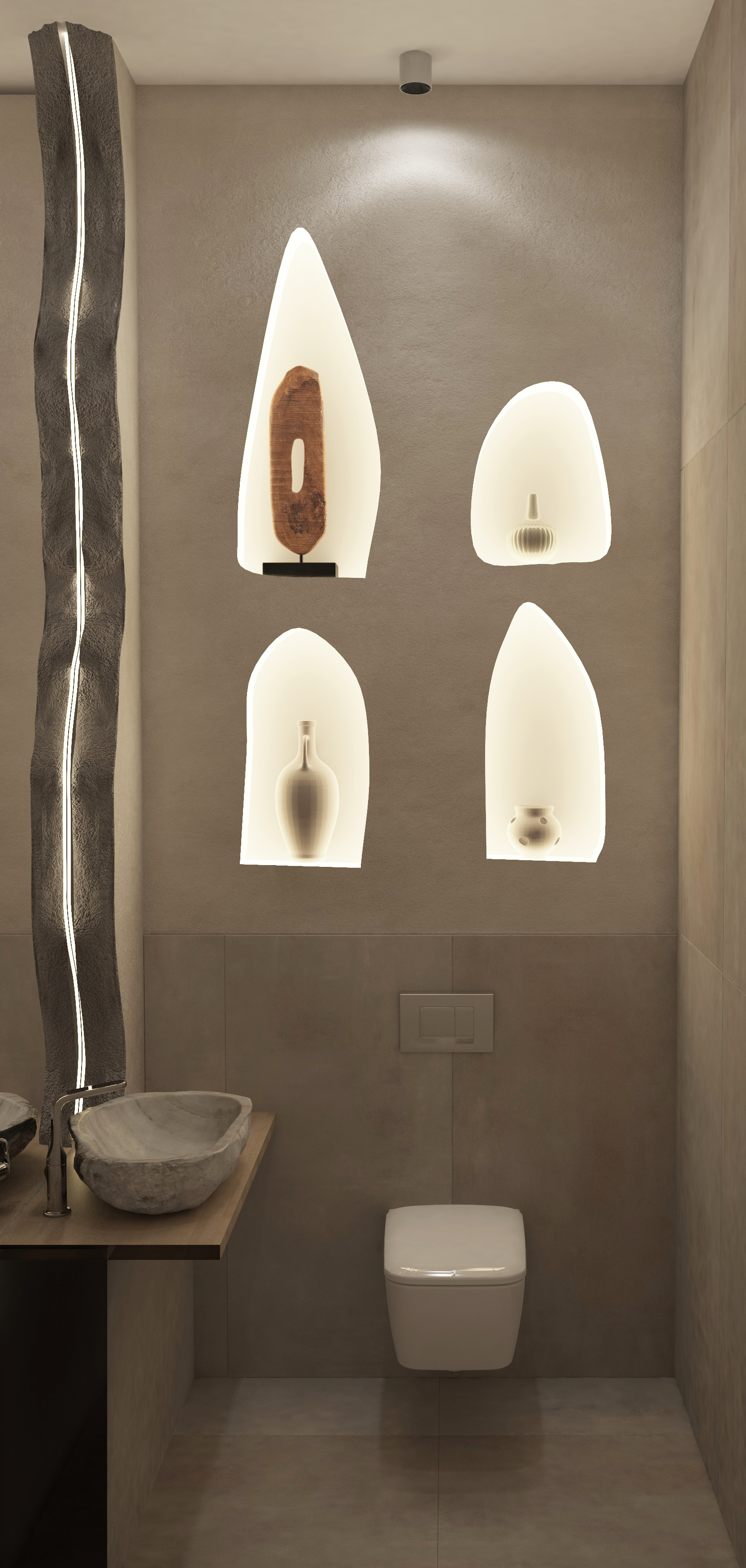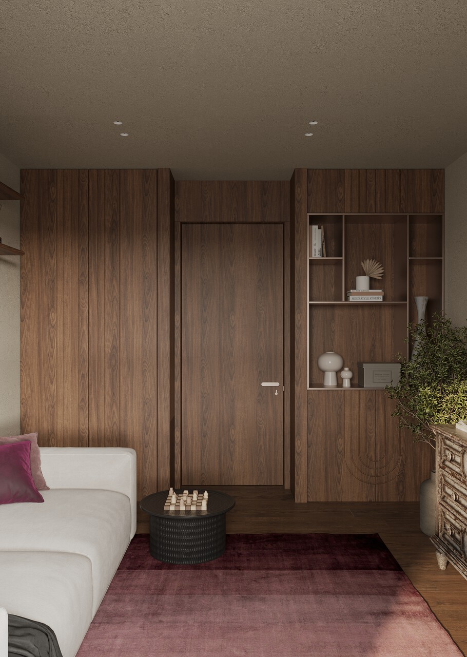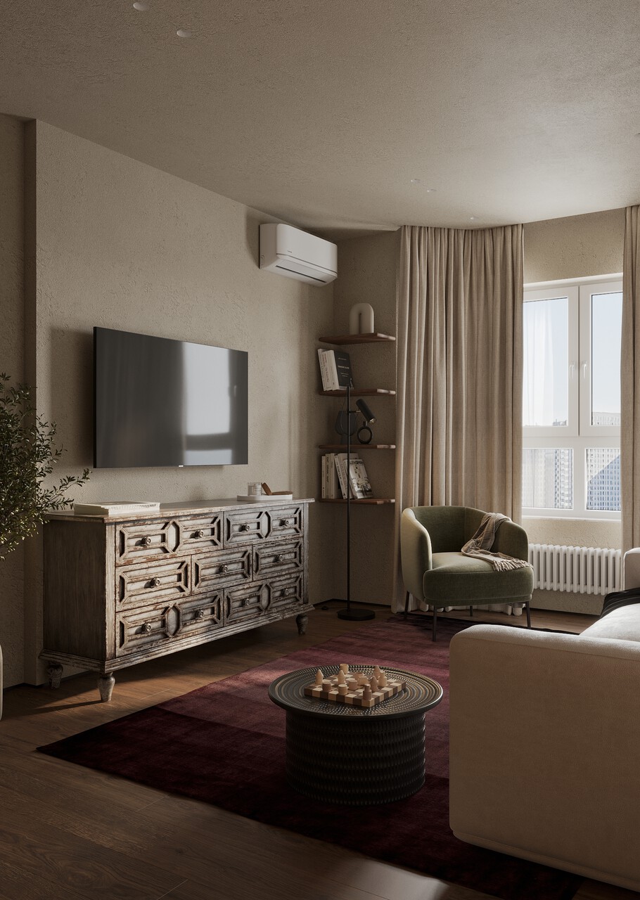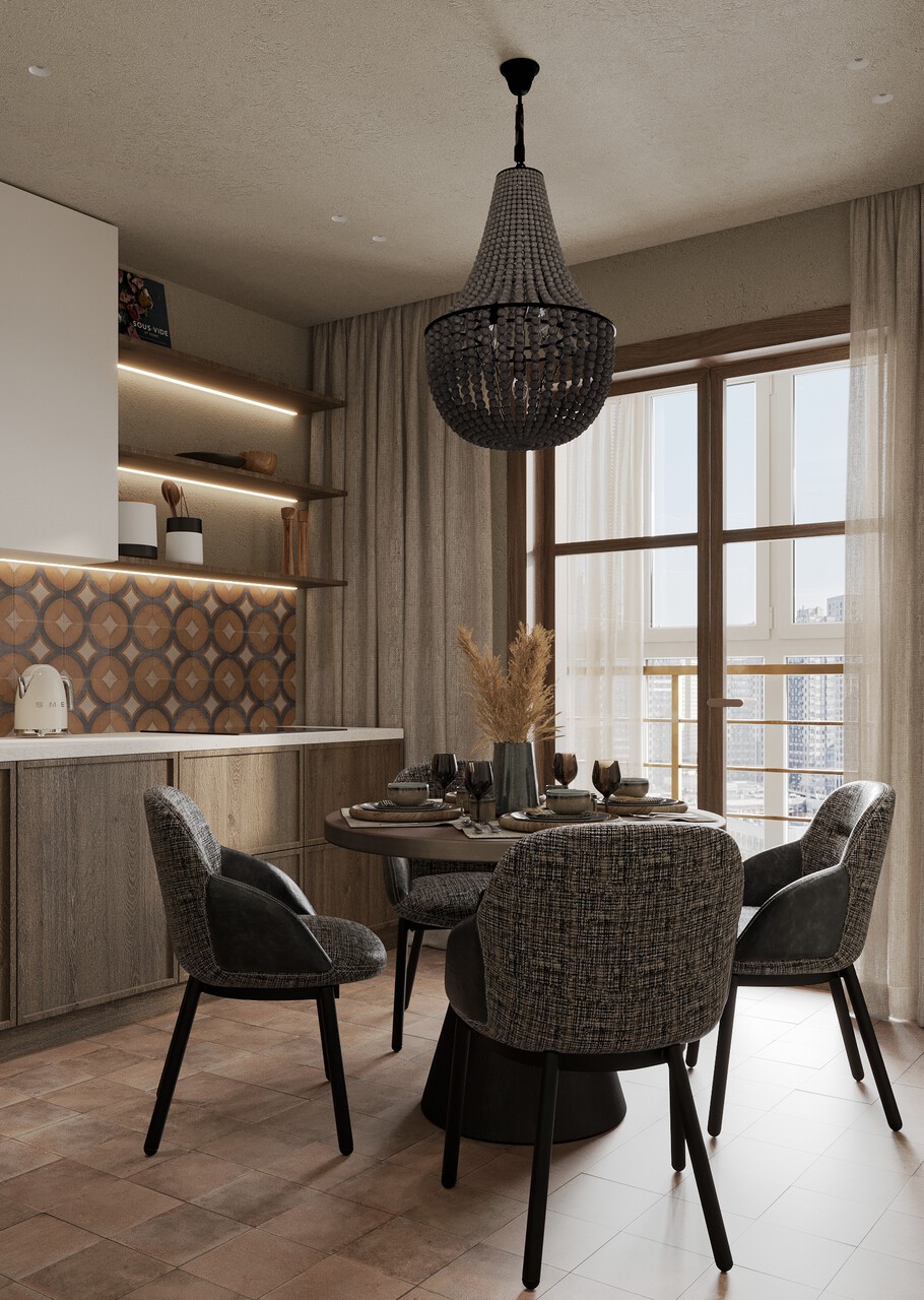 Концепция: Основная идея проекта — формирование динамичного и запоминающегося пространства, где каждый элемент подчеркивает диалог между современными тенденциями и культурным наследием. Ключевая роль отведена рациональному зонированию, позволившему оптимизировать небольшую площадь и создать многоуровневые функциональные зоны. Это достигнуто через смелое сочетание фактур и оттенков, придающих интерьеру уникальную атмосферу уюта и локальной идентичности.