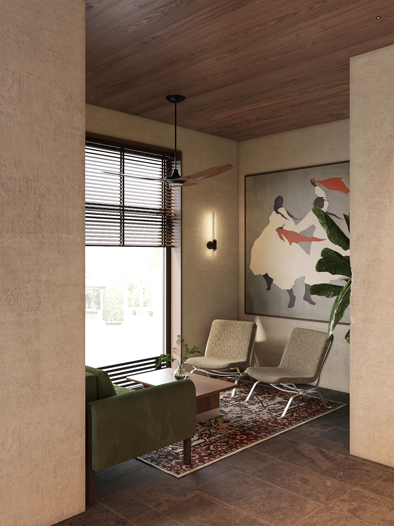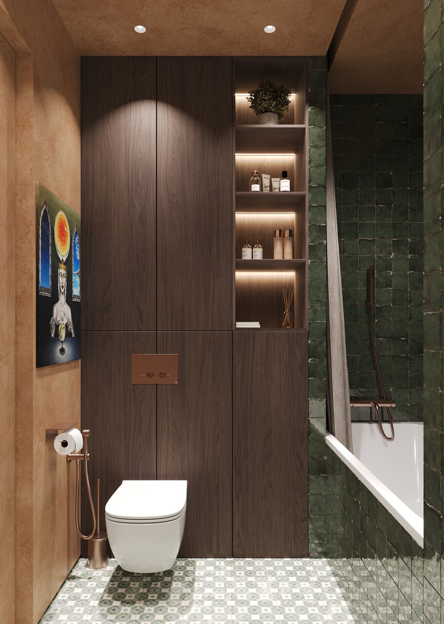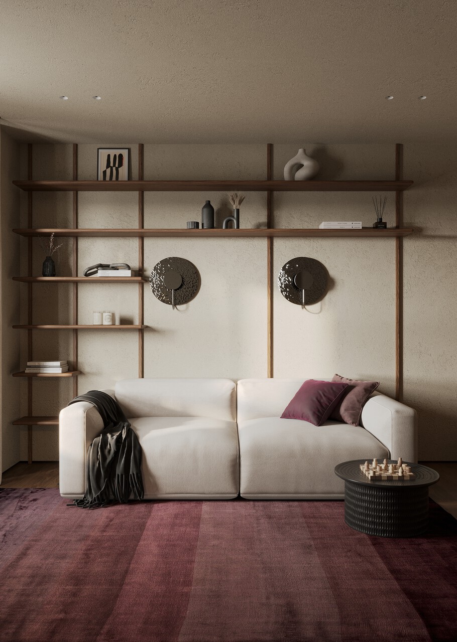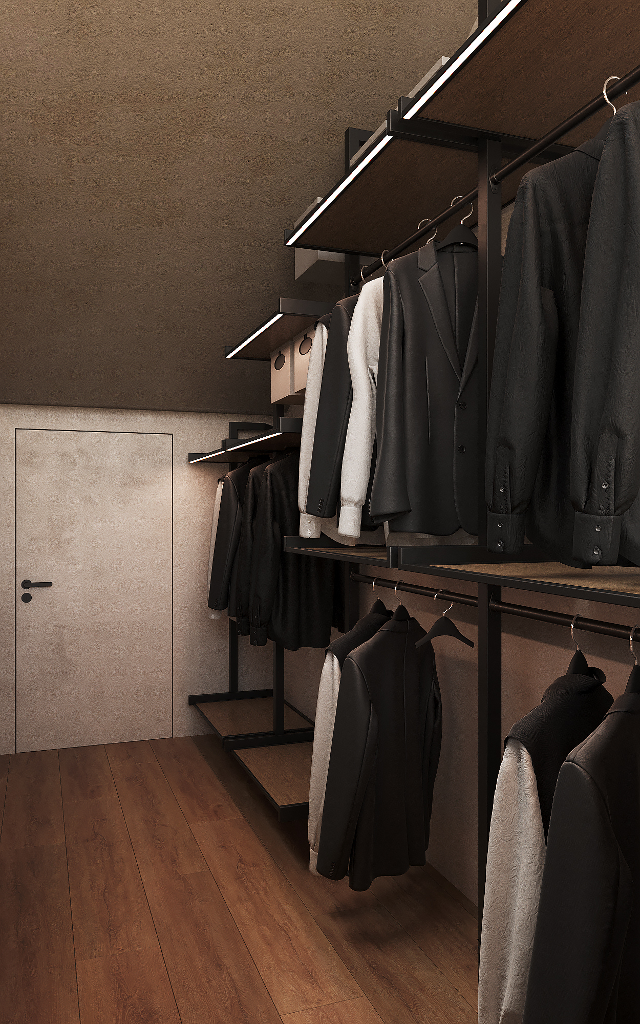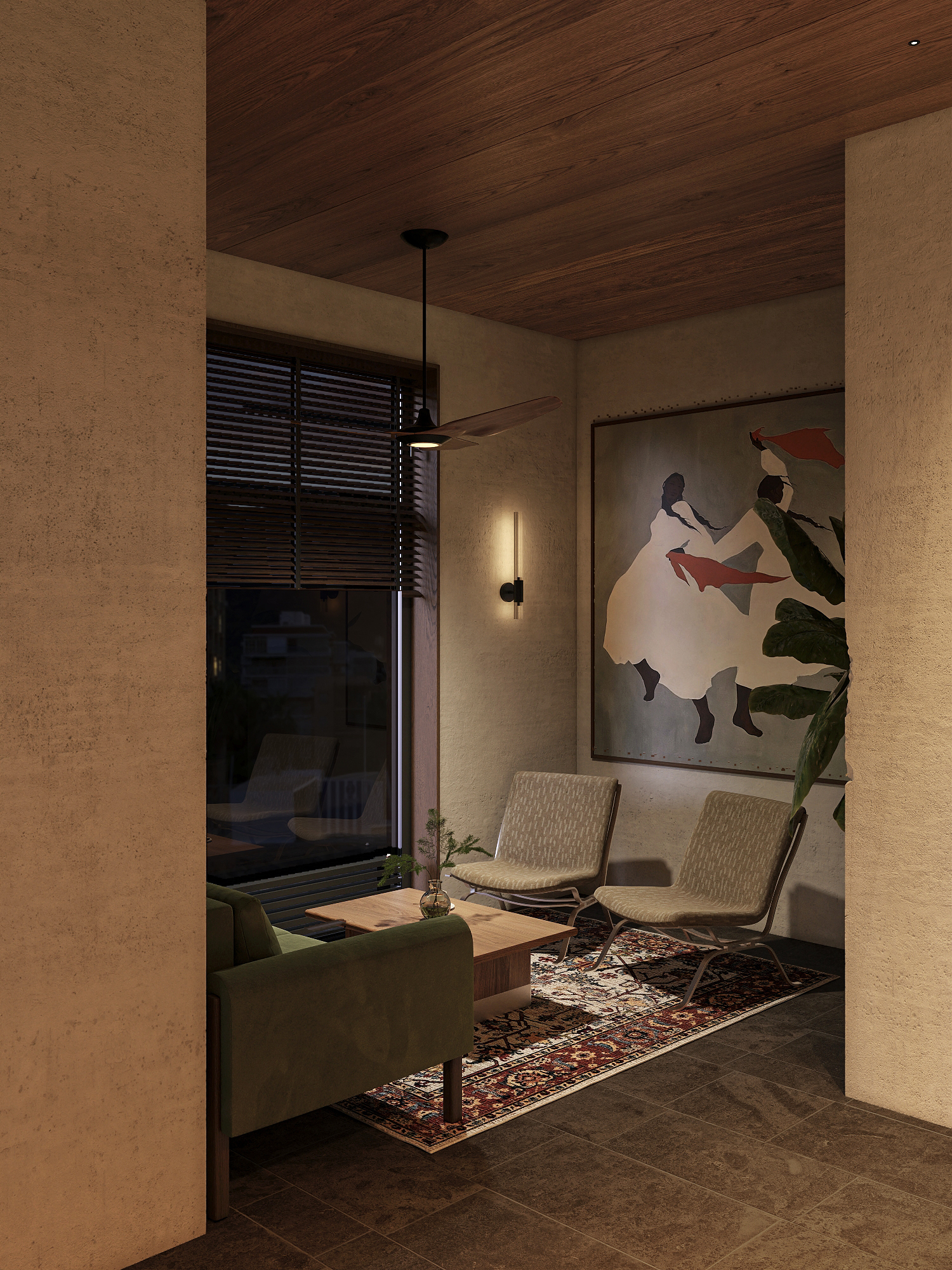 Концепция: Основная идея проекта — формирование динамичного и запоминающегося пространства, где каждый элемент подчеркивает диалог между современными тенденциями и культурным наследием. Ключевая роль отведена рациональному зонированию, позволившему оптимизировать небольшую площадь и создать многоуровневые функциональные зоны. Это достигнуто через смелое сочетание фактур и оттенков, придающих интерьеру уникальную атмосферу уюта и локальной идентичности.