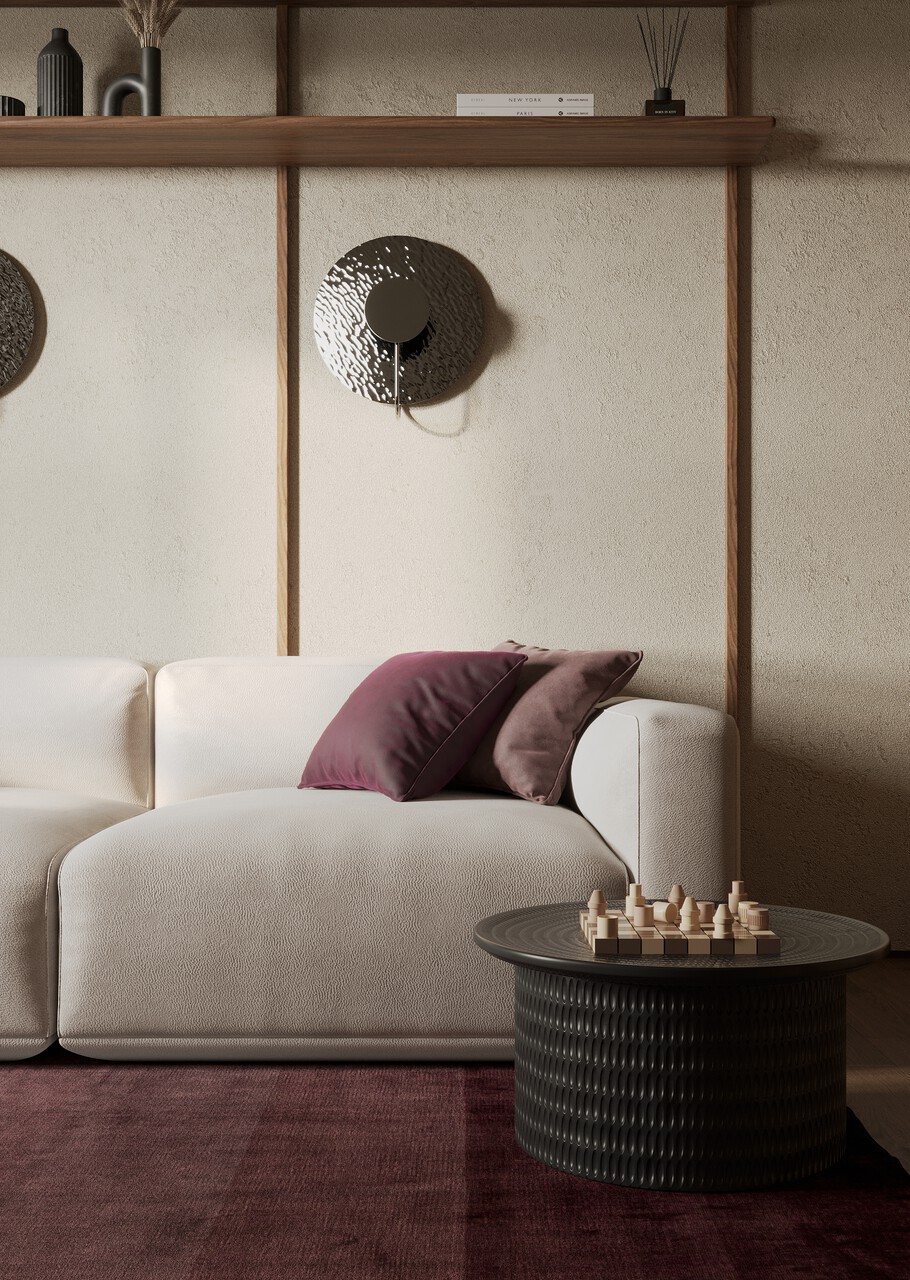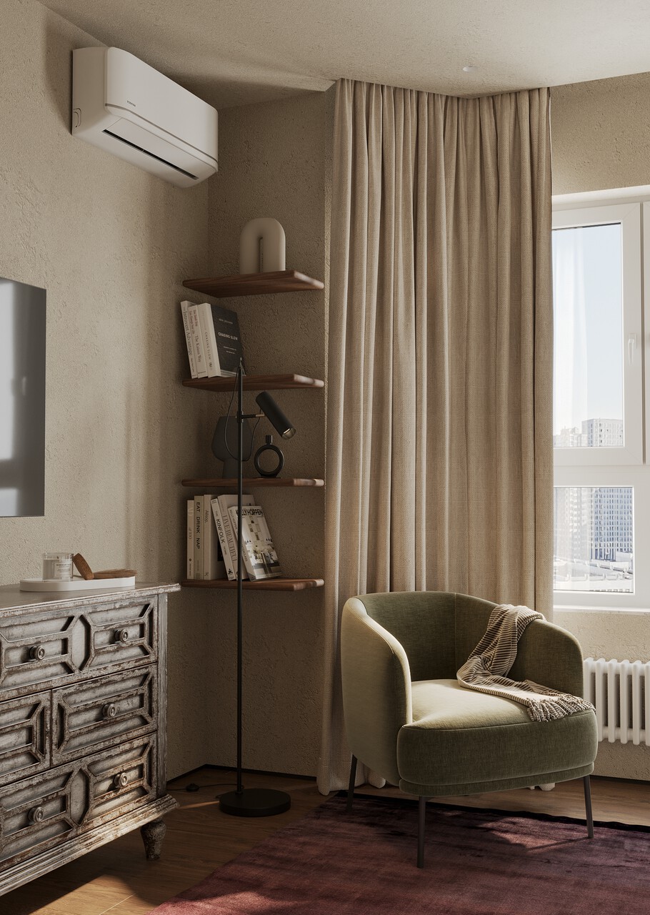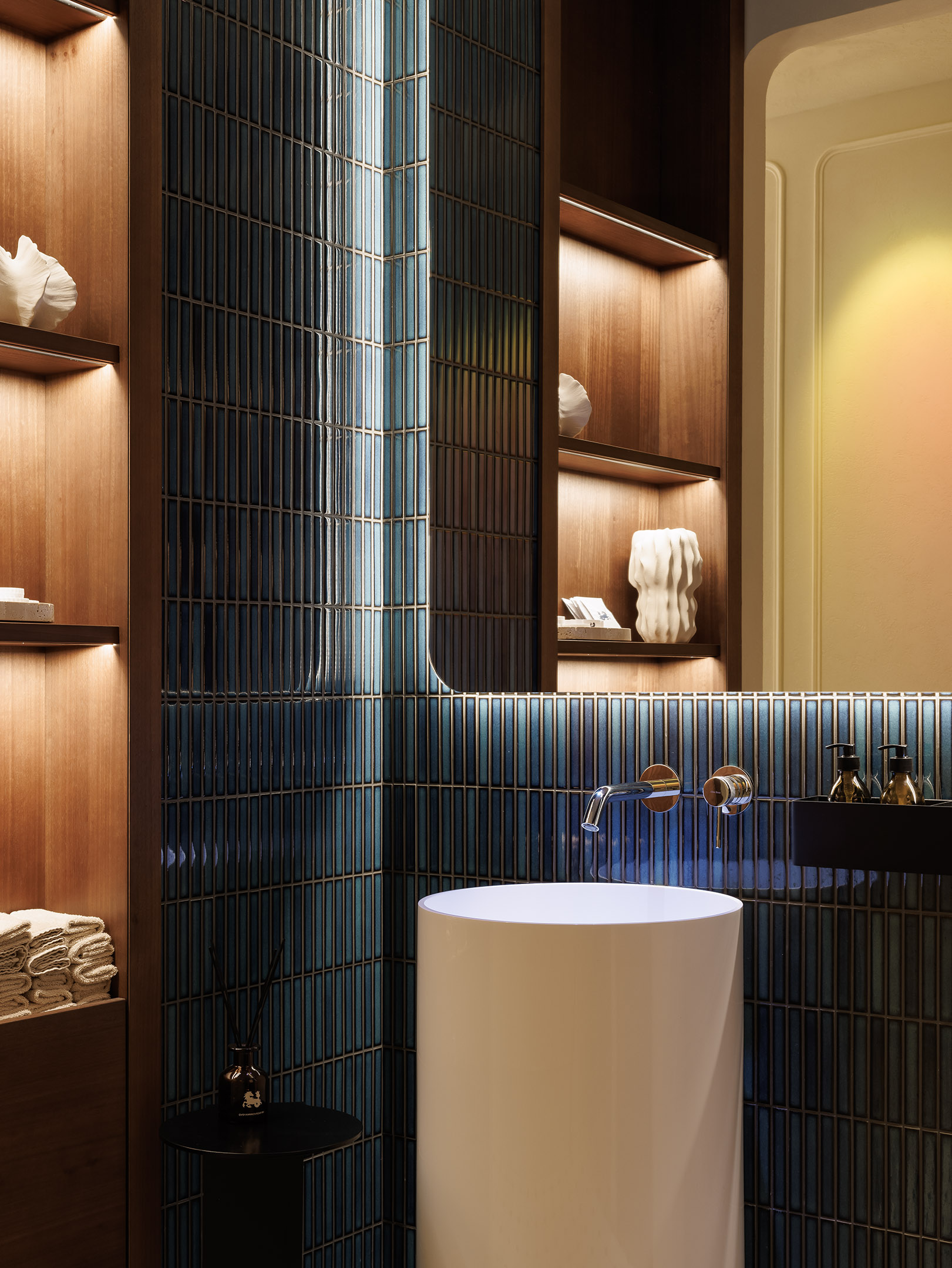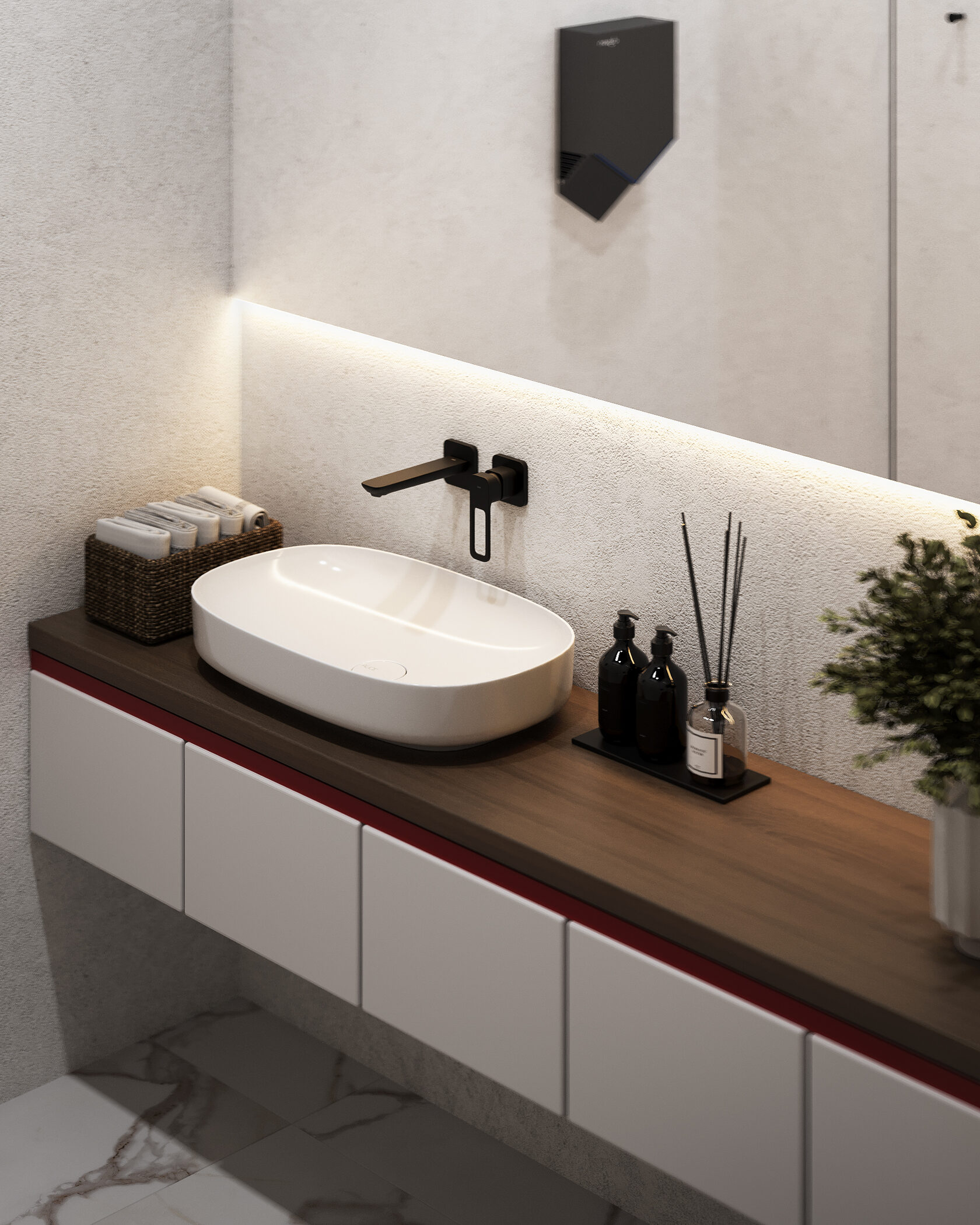 Концепция: Основная идея проекта — формирование динамичного и запоминающегося пространства, где каждый элемент подчеркивает диалог между современными тенденциями и культурным наследием. Ключевая роль отведена рациональному зонированию, позволившему оптимизировать небольшую площадь и создать многоуровневые функциональные зоны. Это достигнуто через смелое сочетание фактур и оттенков, придающих интерьеру уникальную атмосферу уюта и локальной идентичности.