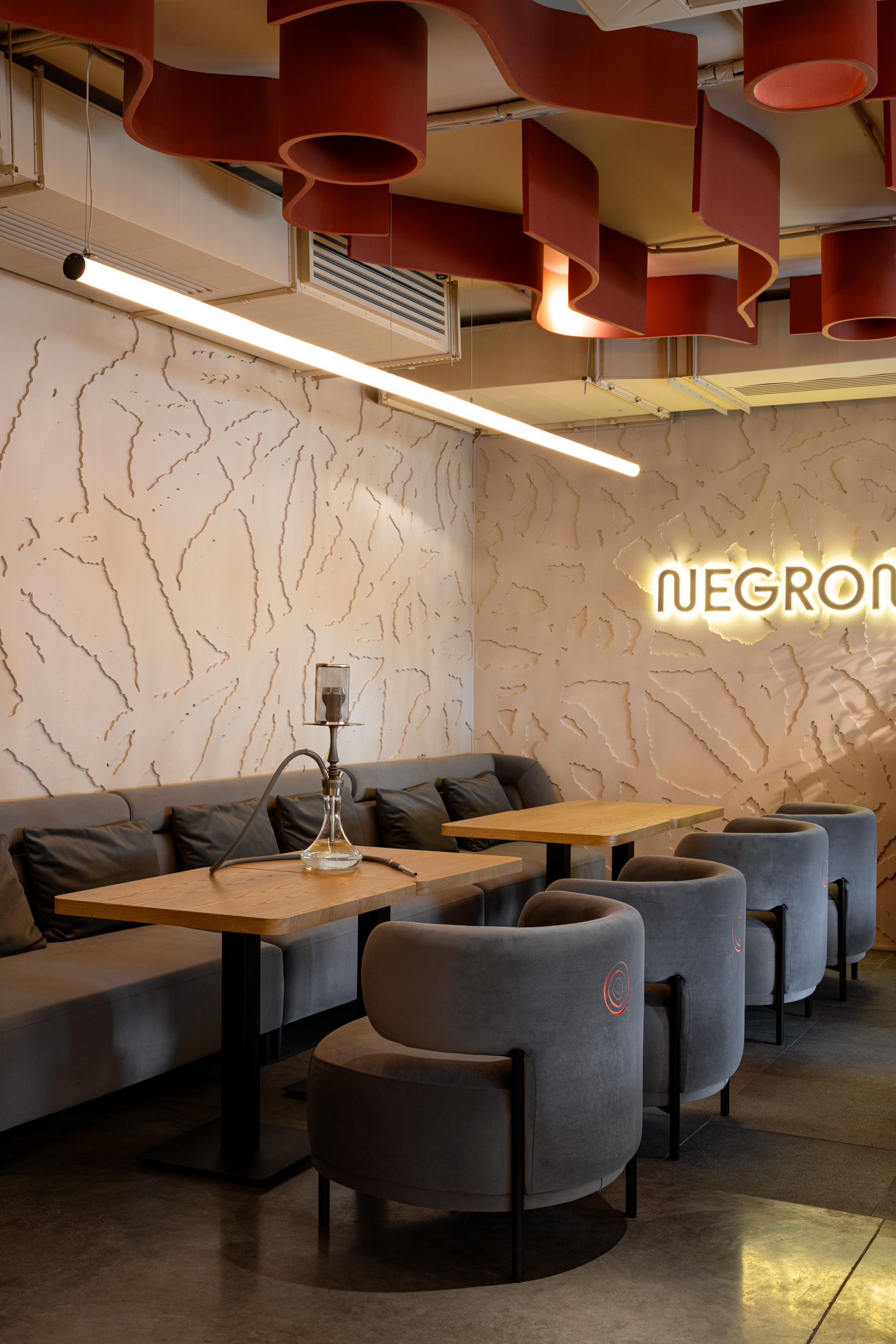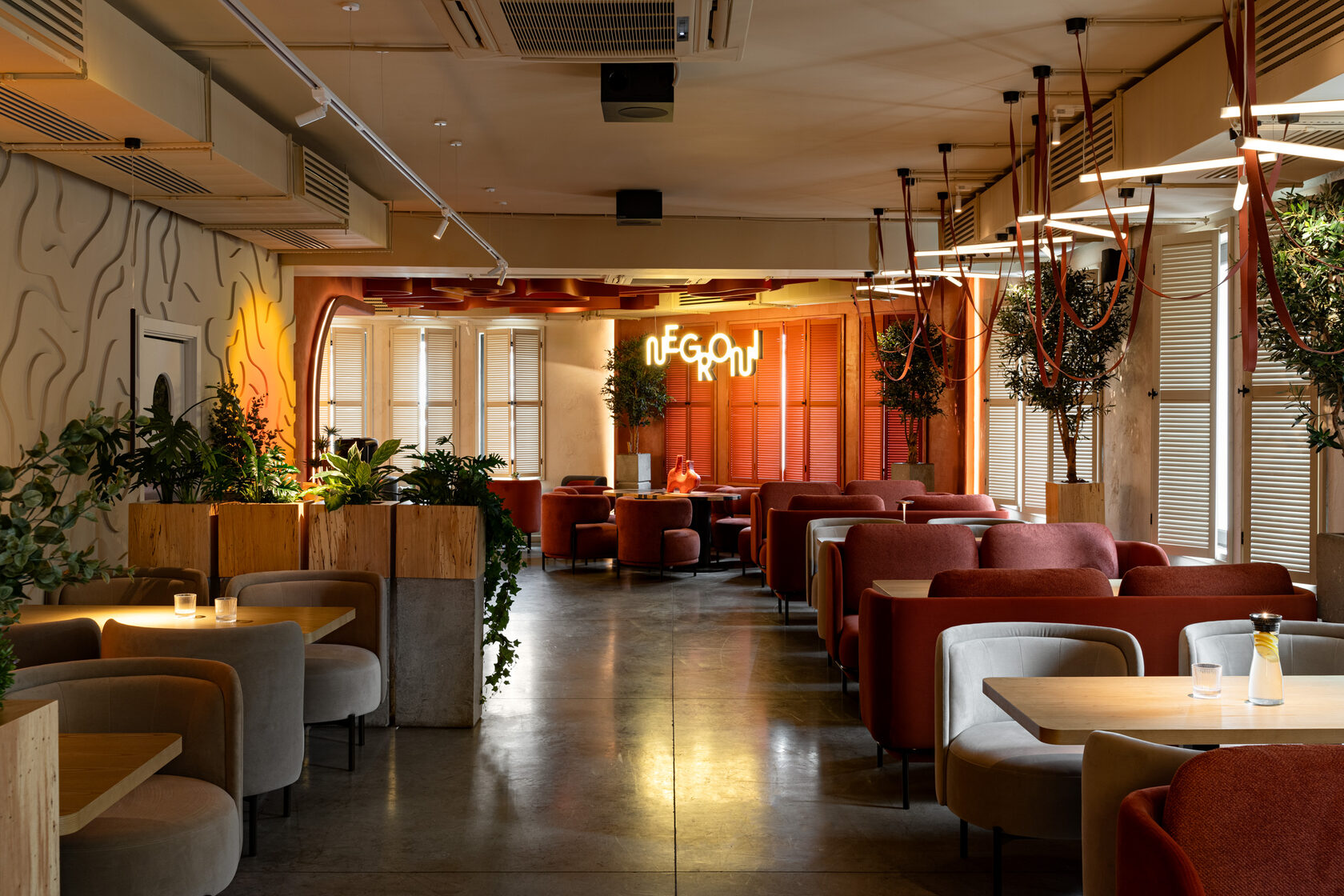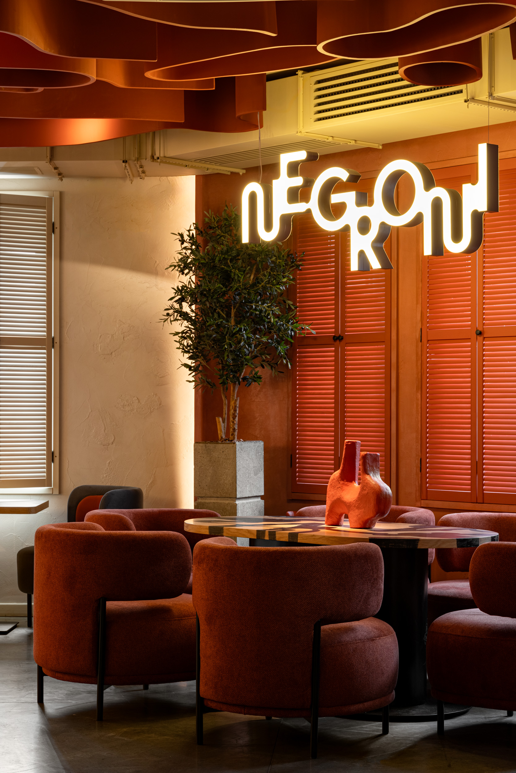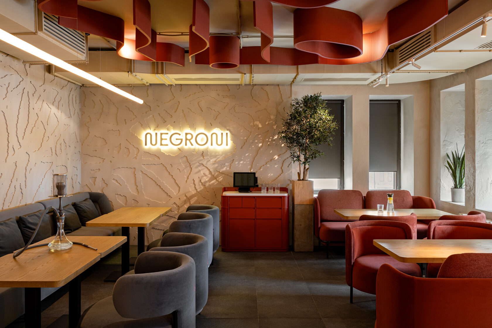 Проект «Negroni» — это воплощение обволачивающей теплоты, солнечных бликов и атмосферы непринужденного отдыха. Вдохновленный легендарным итальянским коктейлем и средиземноморской эстетикой, интерьер создает уникальное пространство для душевного общения. Двенадцатиметровая барная стойка, служащая ярким световым элементом, выступает сердцем заведения и центром притяжения, вокруг которого гармонично организованы все функциональные зоны.