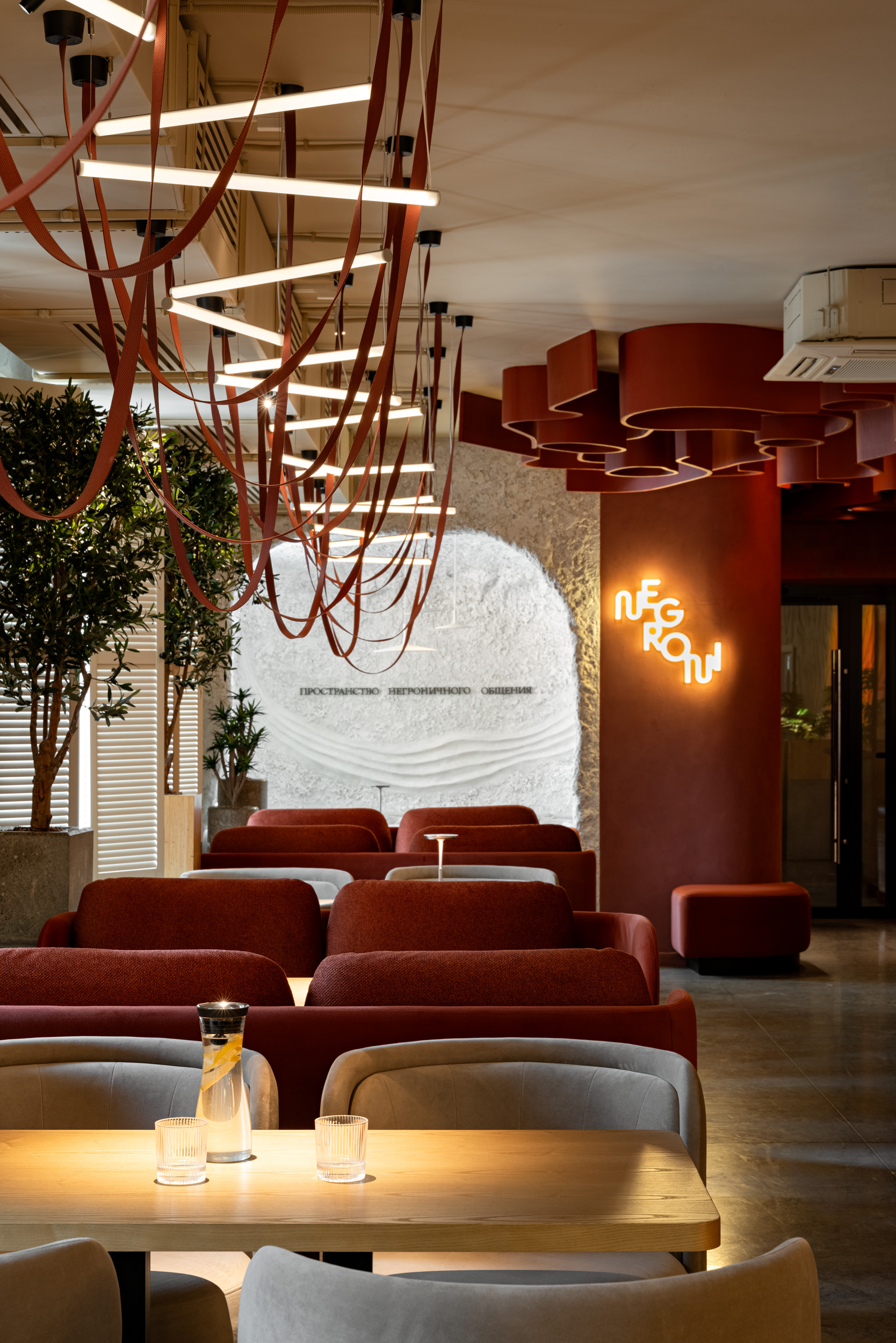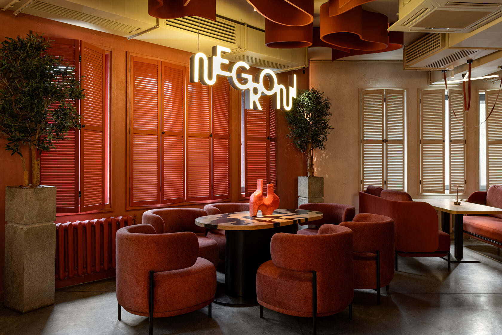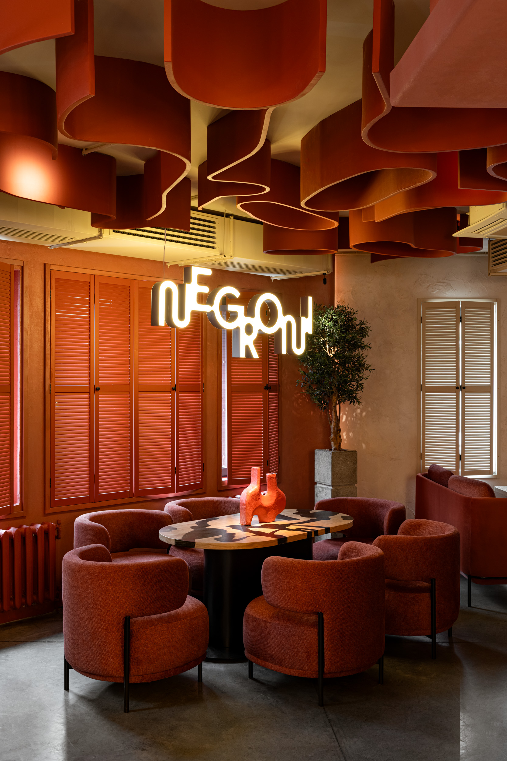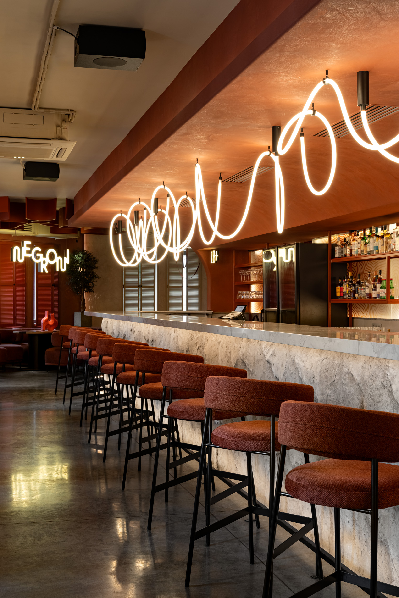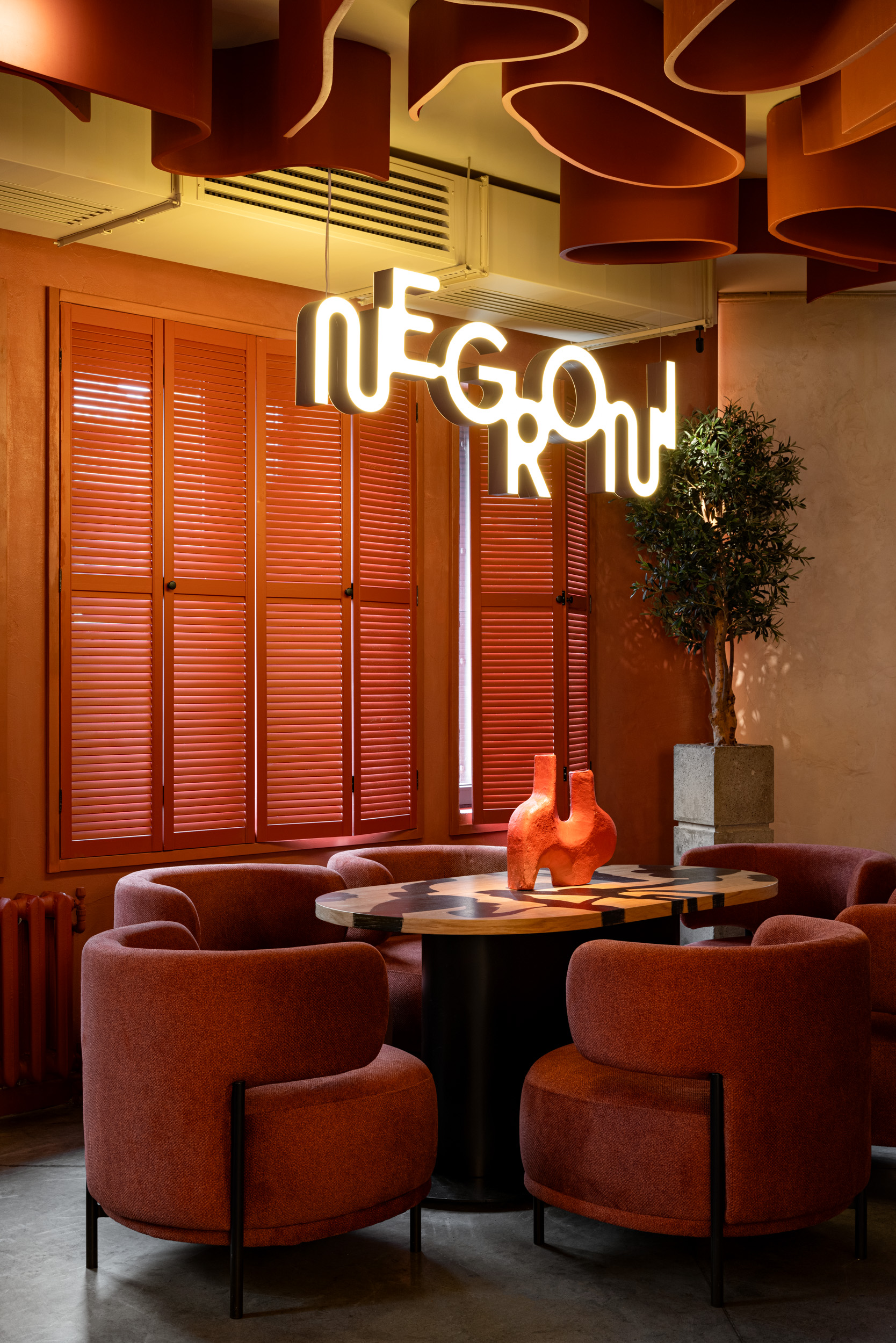 Проект «Negroni» — это воплощение обволачивающей теплоты, солнечных бликов и атмосферы непринужденного отдыха. Вдохновленный легендарным итальянским коктейлем и средиземноморской эстетикой, интерьер создает уникальное пространство для душевного общения. Двенадцатиметровая барная стойка, служащая ярким световым элементом, выступает сердцем заведения и центром притяжения, вокруг которого гармонично организованы все функциональные зоны.