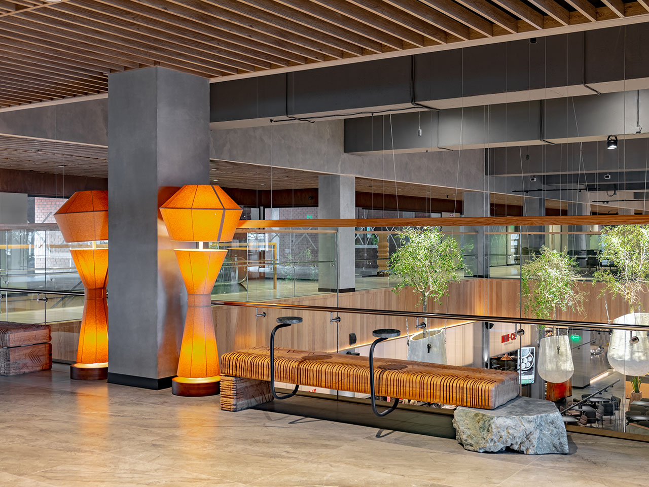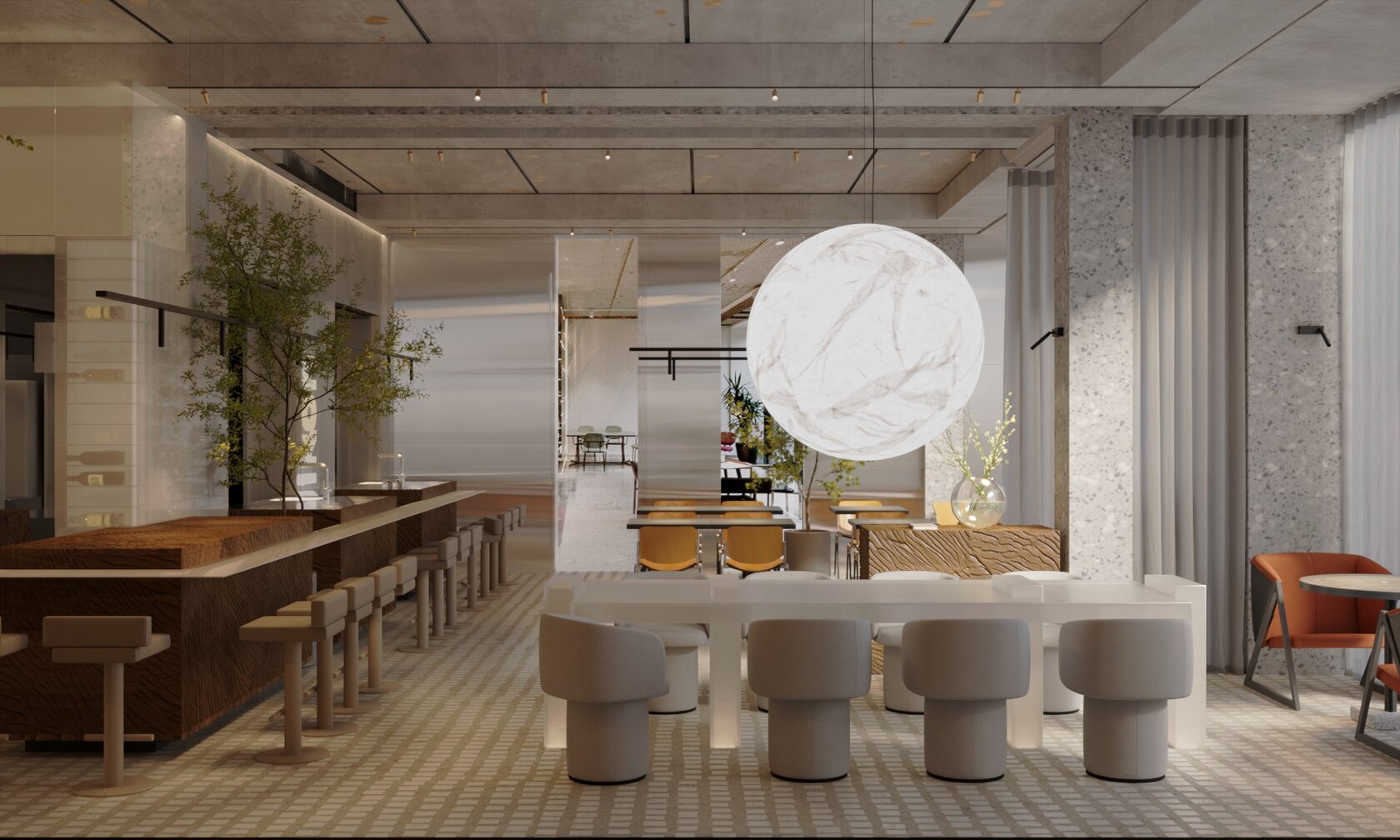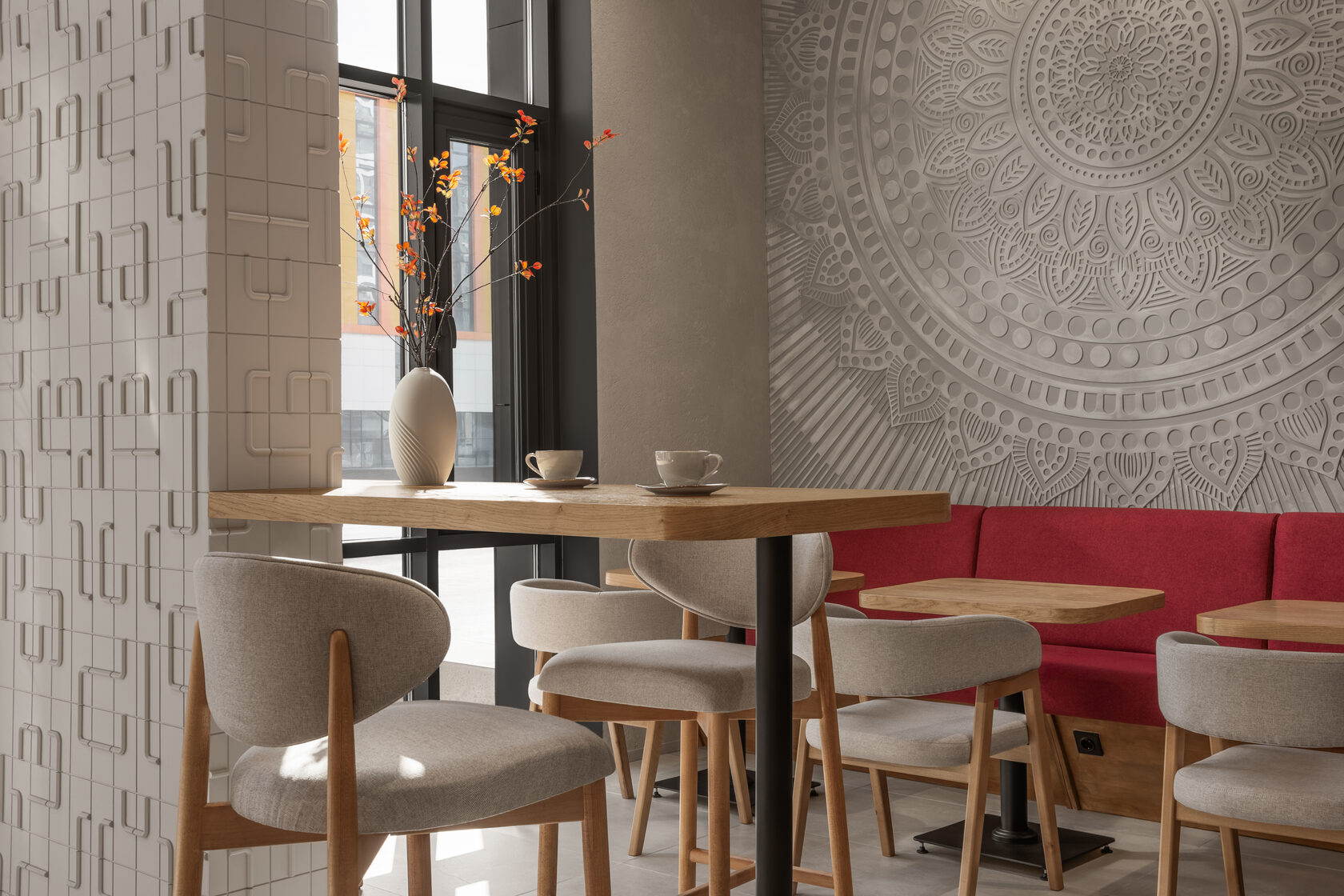 Интерьер ресторана отеля 4* создан для воплощения философии современной гостеприимности, гармонично сочетая природные и инновационные материалы. Бамбуковые панели, металлические панно с подсветкой, модульные диваны и элегантные мобильные ширмы формируют динамичное и адаптируемое пространство, готовое к любому формату мероприятий.