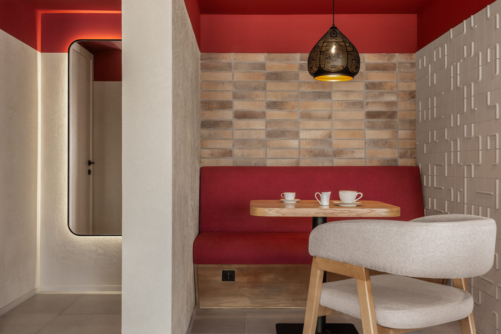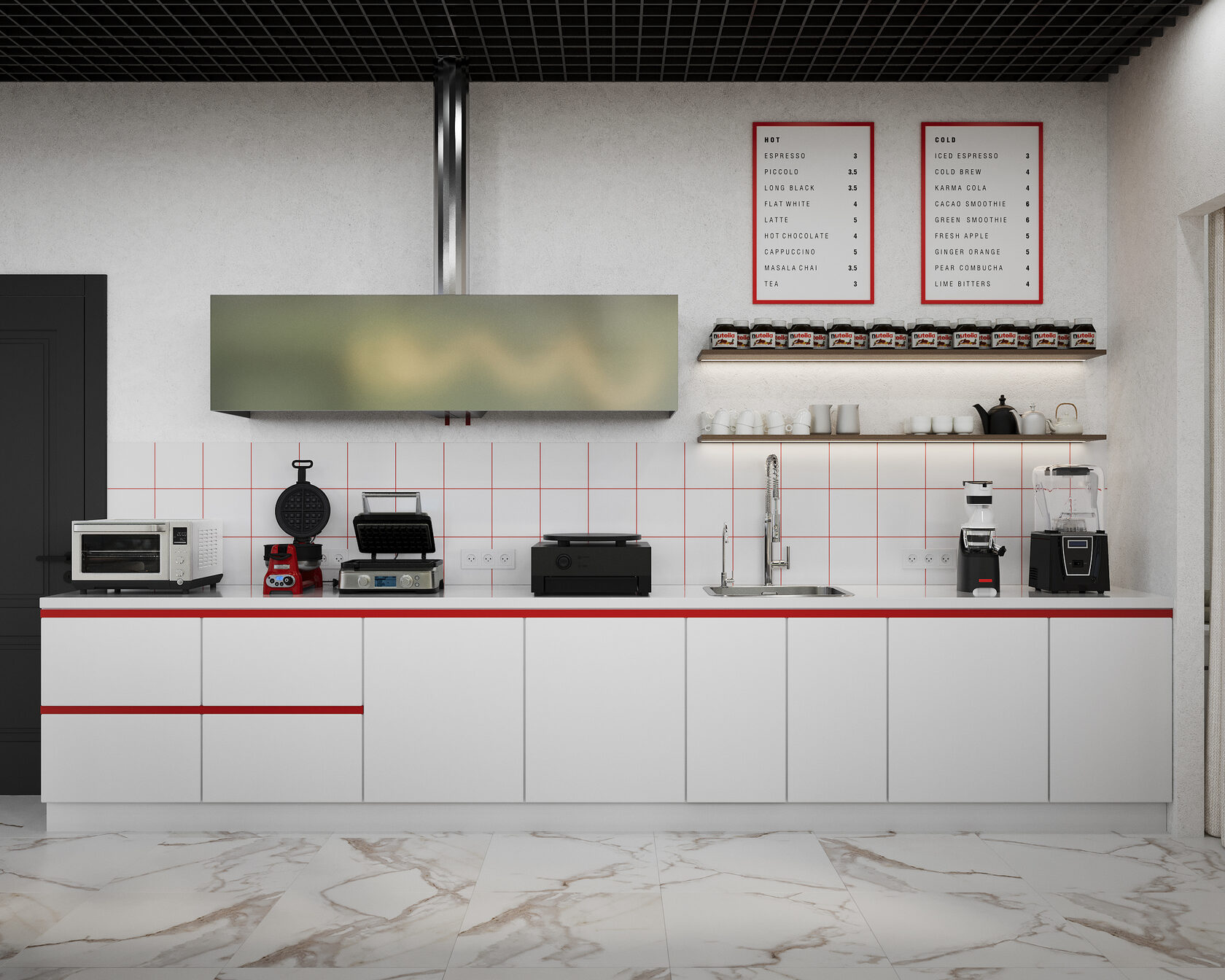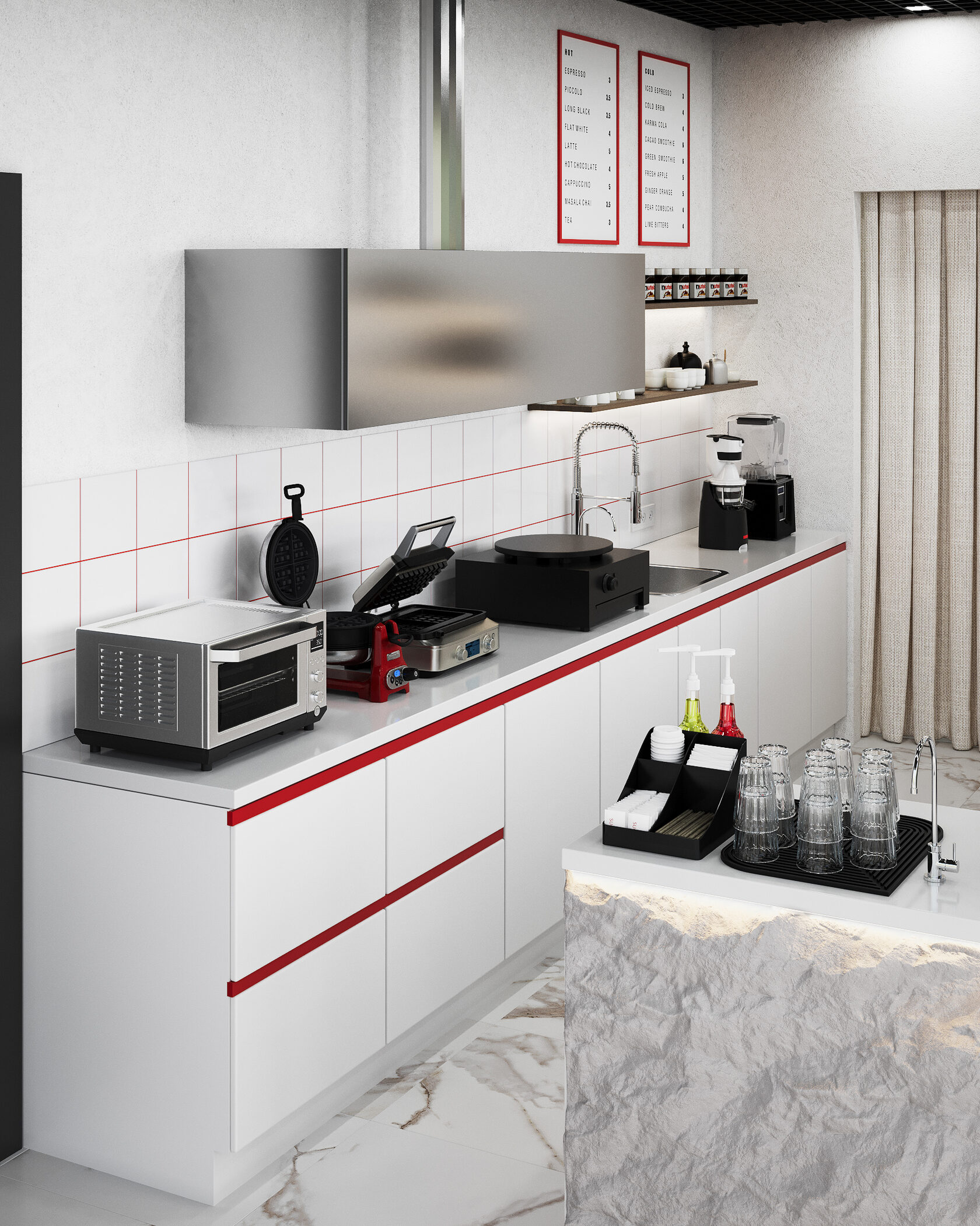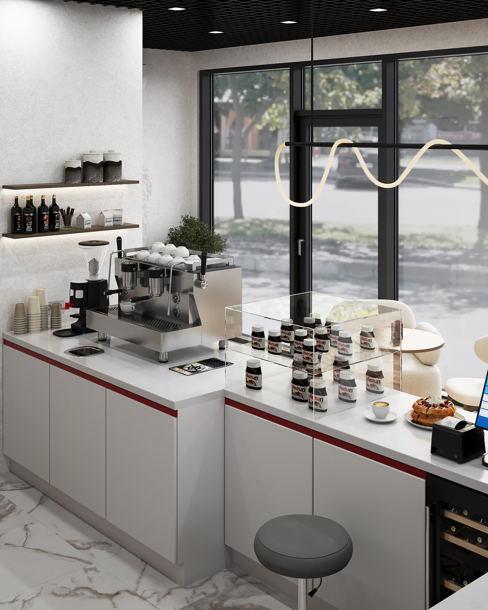 Концепция. Интерьер выдержан в светлой, воздушной палитре - это визуально расширяет небольшое помещение и создаёт ощущение лёгкости и комфорта. Главный акцент - детали. Красная ручка-профиль для мебели и красные швы плитки - тонкая, но узнаваемая отсылка к фирменному логотипу Nutella®. Это как секретный код для посвящённых: кто знает - сразу поймёт. Цвет дерева, использованный в оформлении столов, стульев и даже столешницы в туалетной зоне, тщательно подобран в тон шоколадной пасте - тёплый, насыщенный, аппетитный. Он создаёт ощущение «съедобного» уюта, где хочется задержаться подольше. На кухне и за барной стойкой - всё продумано для безупречного сервиса. Мы оснастили рабочую зону профессиональной кофемашиной, где эргономика - не роскошь, а необходимость. Ринзер для быстрой промывки портафильтра, нок-бокс для удобного выбивания, отработанного кофе, всё под рукой - ни одного лишнего движения. Бариста работает в потоке, сохраняя концентрацию на вкусе, а не на поиске инструментов.