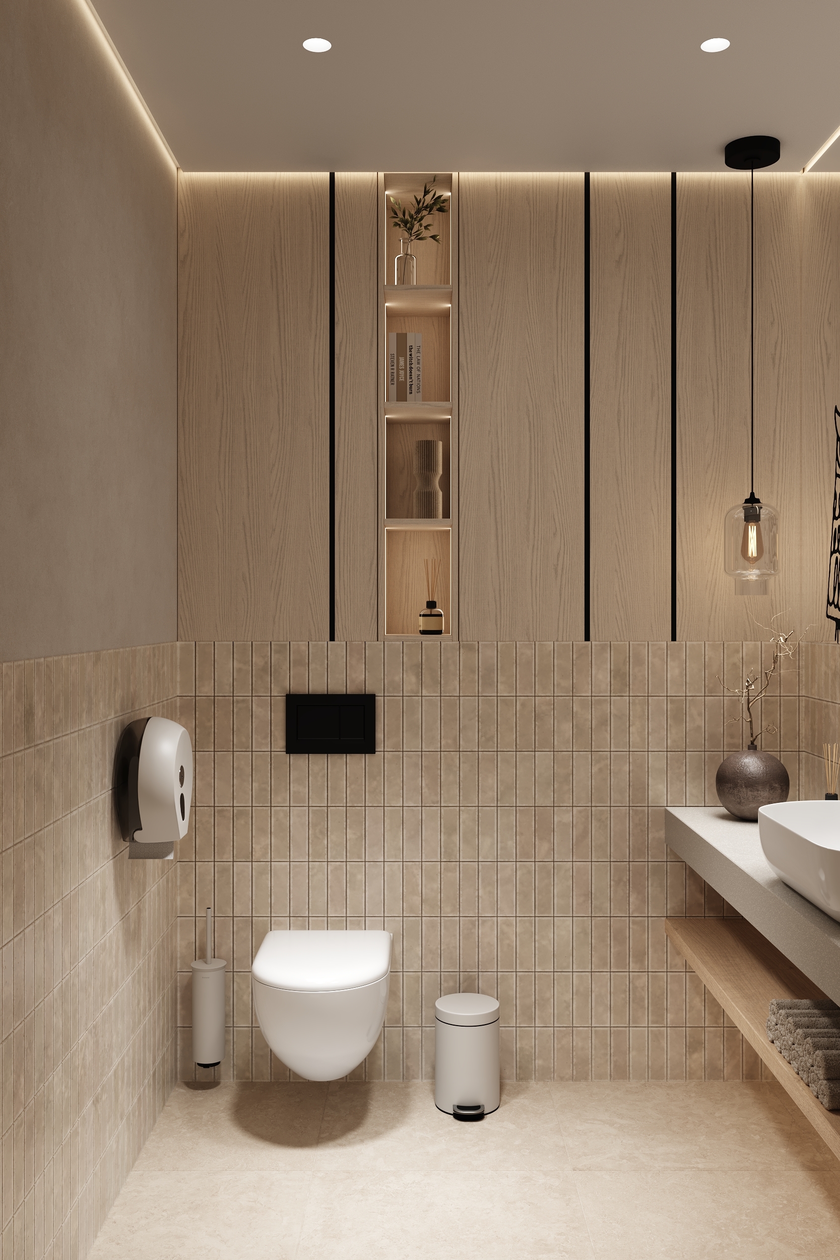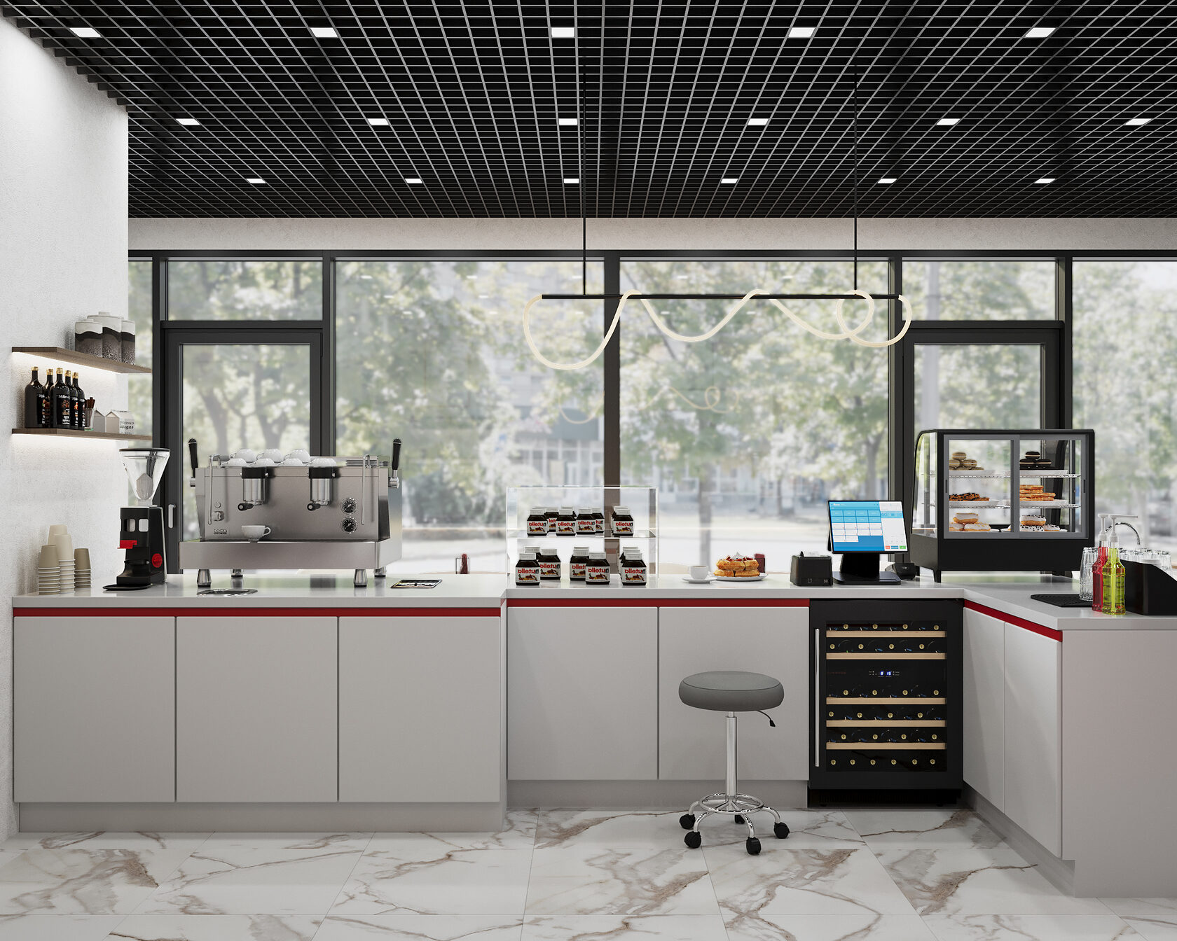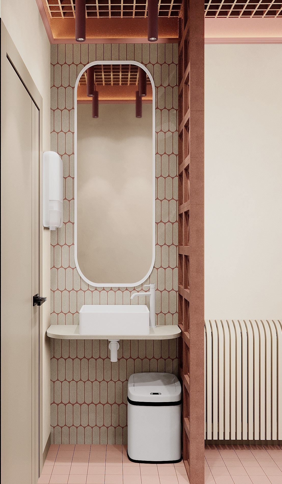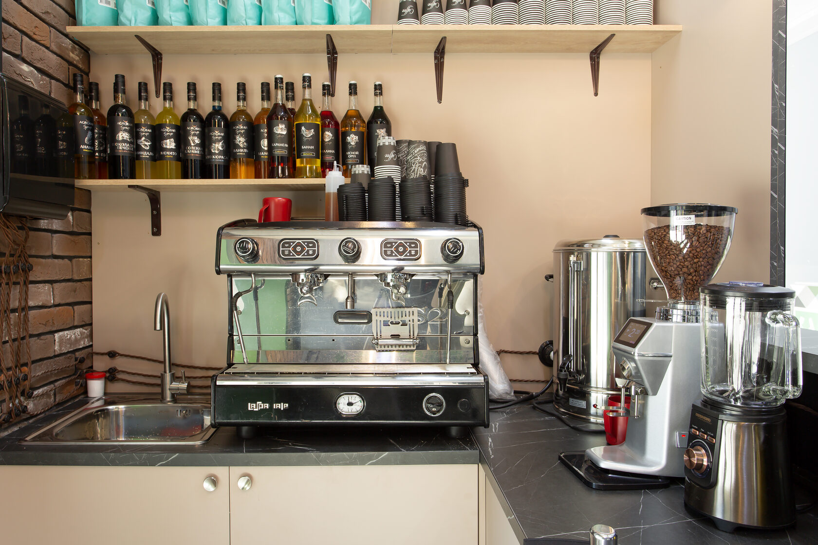 Концепция. Интерьер выдержан в светлой, воздушной палитре - это визуально расширяет небольшое помещение и создаёт ощущение лёгкости и комфорта. Главный акцент - детали. Красная ручка-профиль для мебели и красные швы плитки - тонкая, но узнаваемая отсылка к фирменному логотипу Nutella®. Это как секретный код для посвящённых: кто знает - сразу поймёт. Цвет дерева, использованный в оформлении столов, стульев и даже столешницы в туалетной зоне, тщательно подобран в тон шоколадной пасте - тёплый, насыщенный, аппетитный. Он создаёт ощущение «съедобного» уюта, где хочется задержаться подольше. На кухне и за барной стойкой - всё продумано для безупречного сервиса. Мы оснастили рабочую зону профессиональной кофемашиной, где эргономика - не роскошь, а необходимость. Ринзер для быстрой промывки портафильтра, нок-бокс для удобного выбивания, отработанного кофе, всё под рукой - ни одного лишнего движения. Бариста работает в потоке, сохраняя концентрацию на вкусе, а не на поиске инструментов.