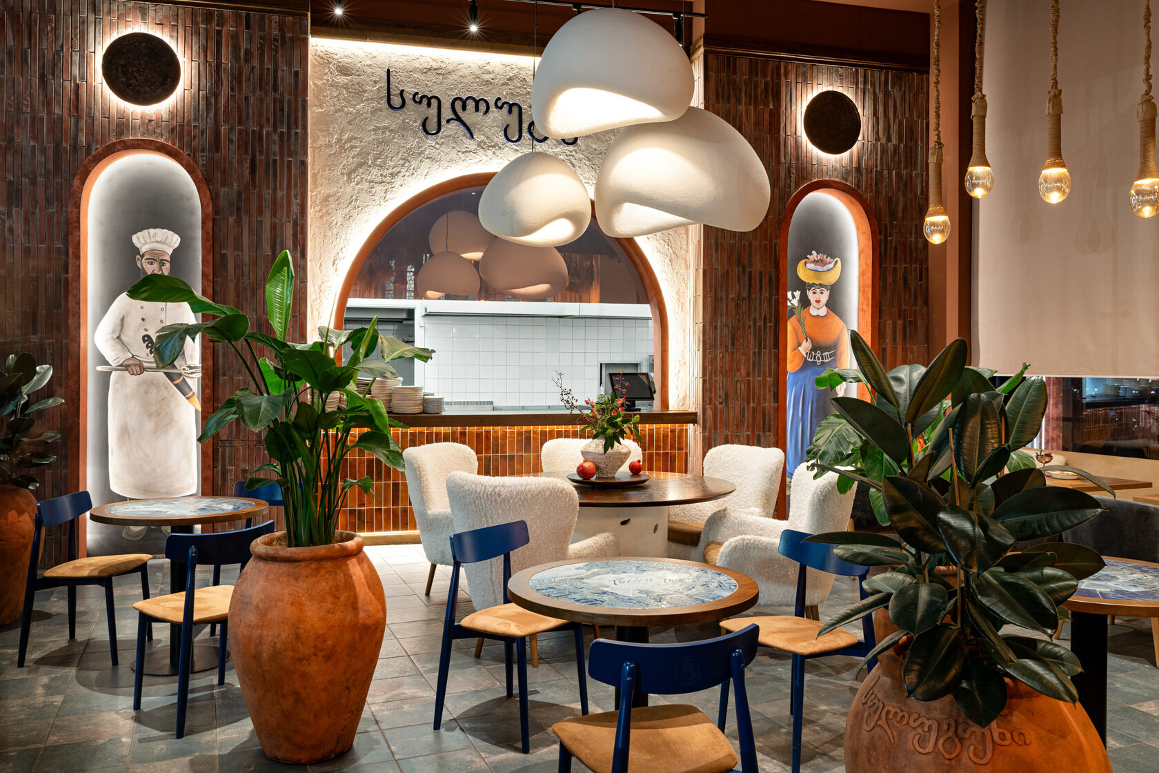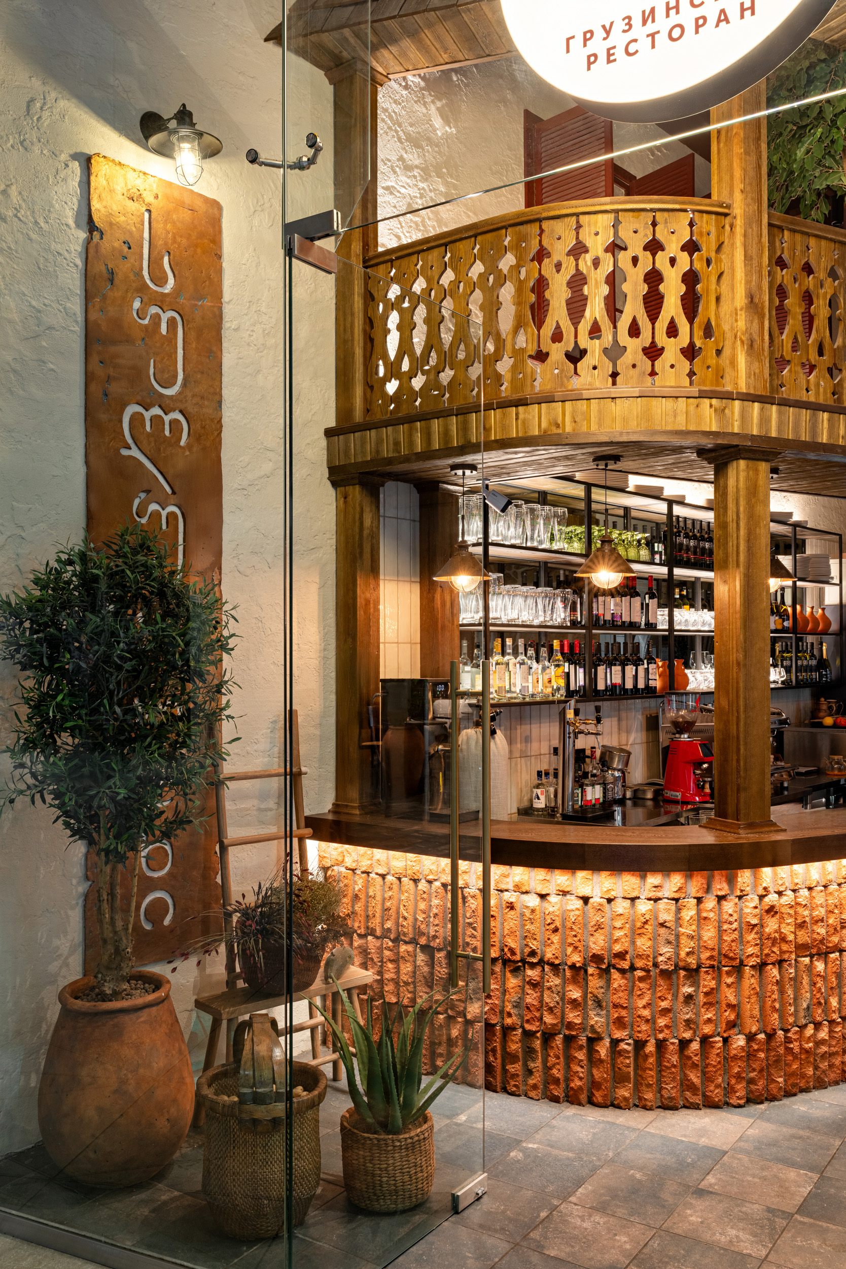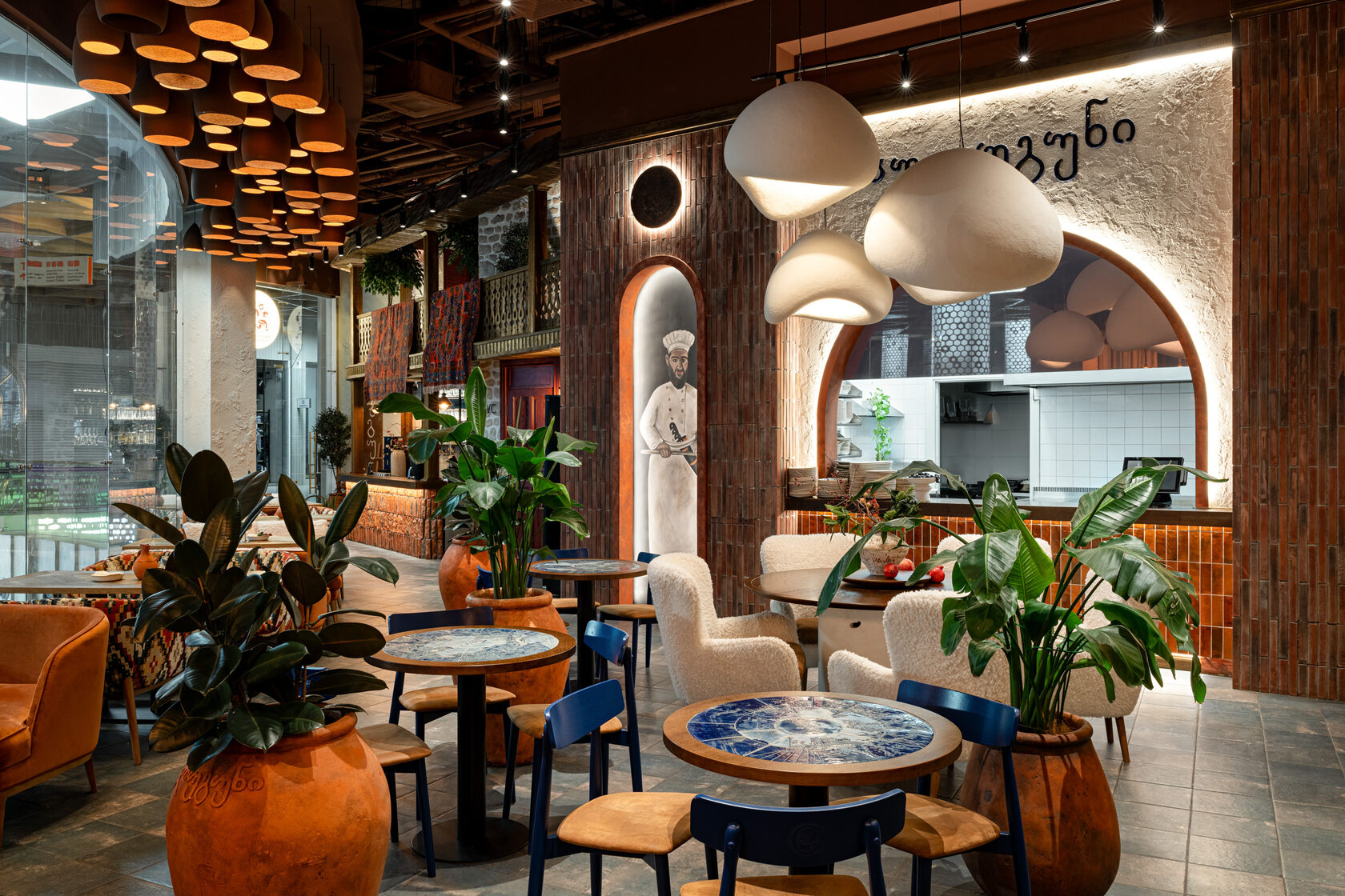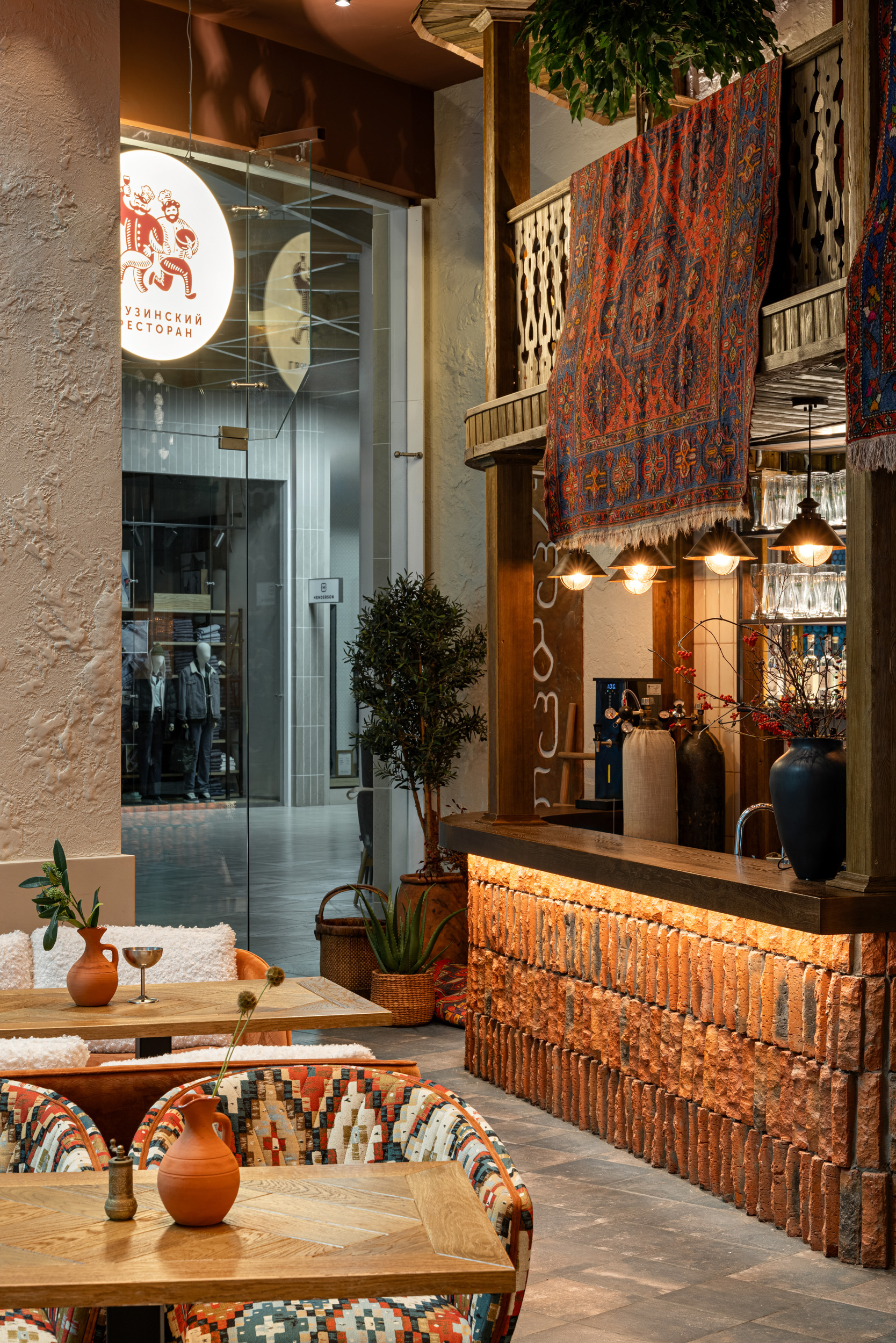 Концепция: Основная идея проекта — создание иммерсивного пространства, тщательно воспроизводящего каждый аспект традиционного грузинского быта. Центральный проход имитирует узкие дворики, а кухня, сердце заведения, расположена в центре обеденного зала, украшенная произведениями Нико Пиросмани. Медные блюда и уникальный орнамент грузинских скатертей на общем столе подчеркивают гостеприимство. Особое внимание уделено деталям: от обивки стульев, имитирующей мех козлика, до эксклюзивных керамических столов ручной работы, каждый из которых символизирует знаменитые города Грузии и украшен их достопримечательностями.