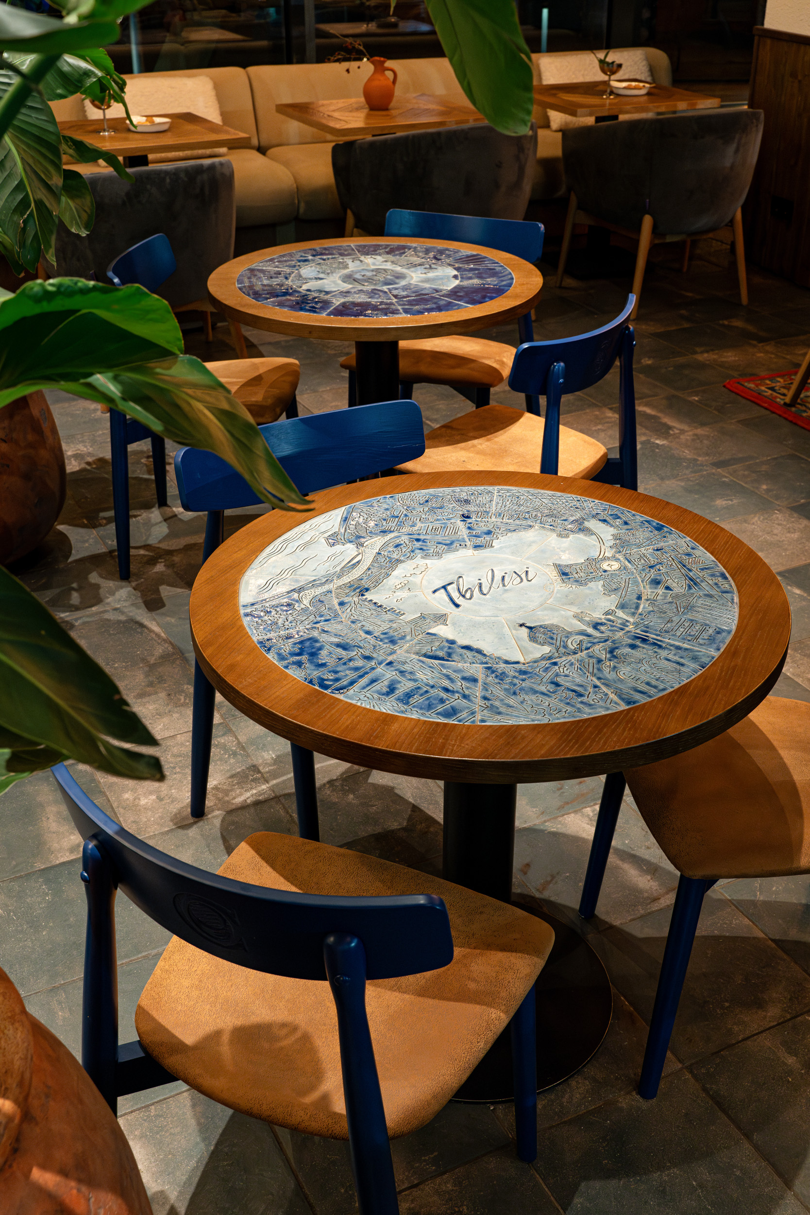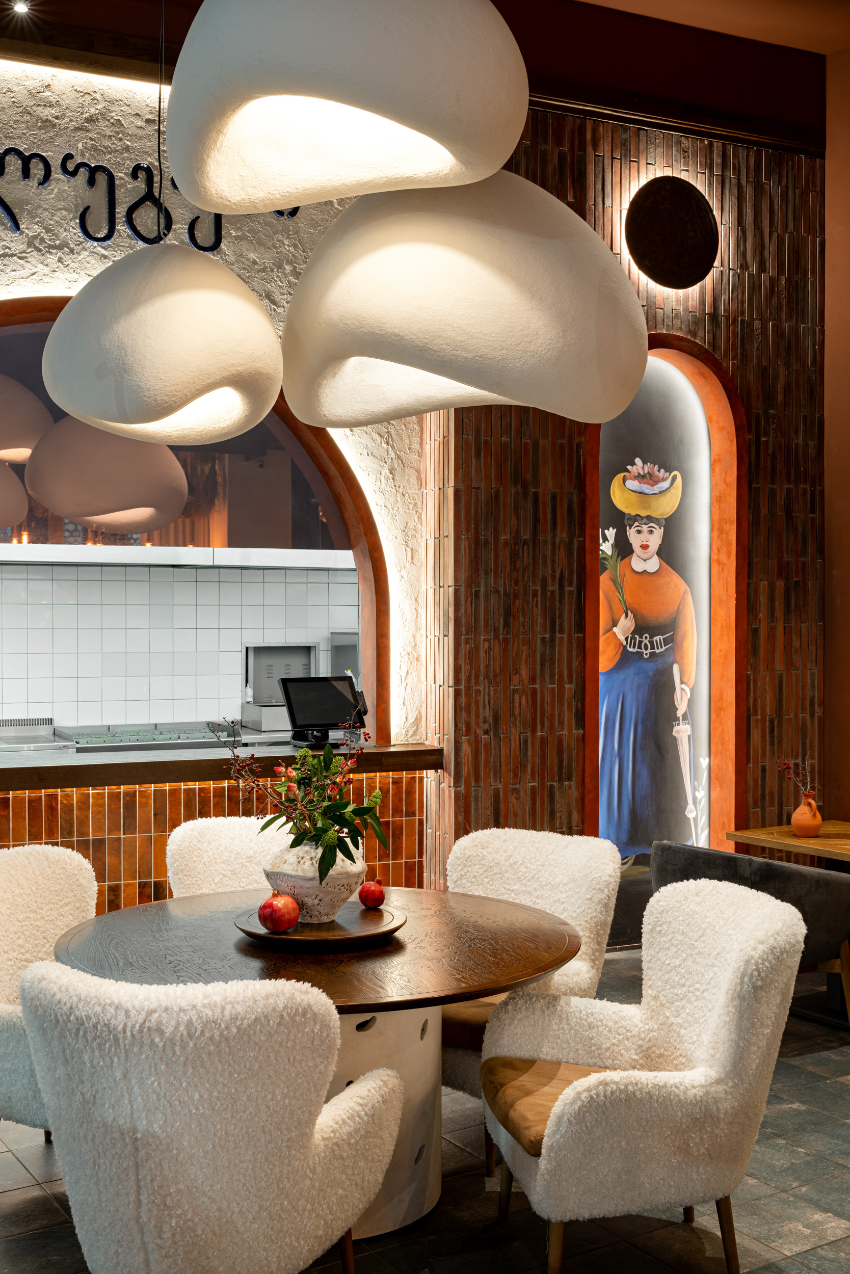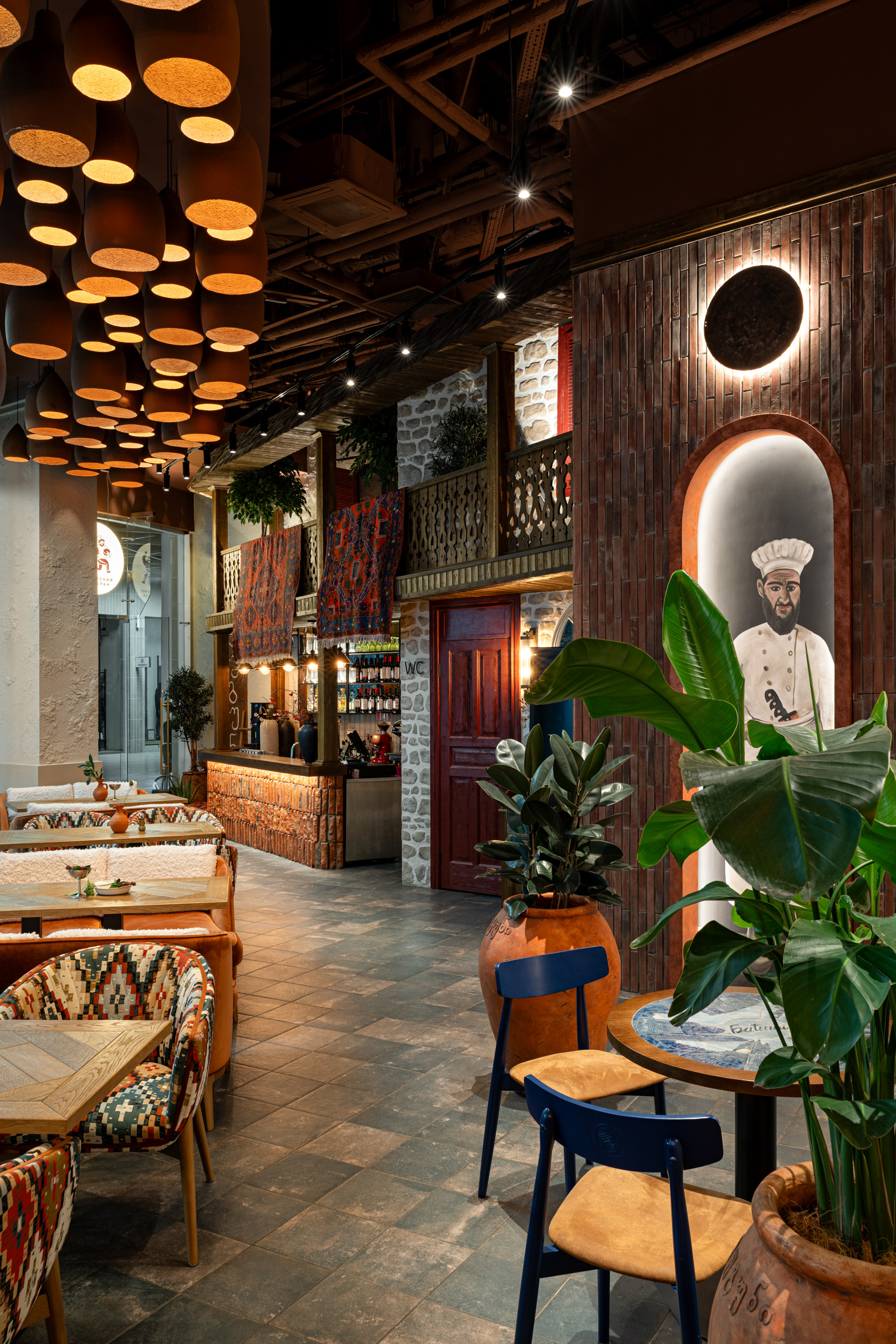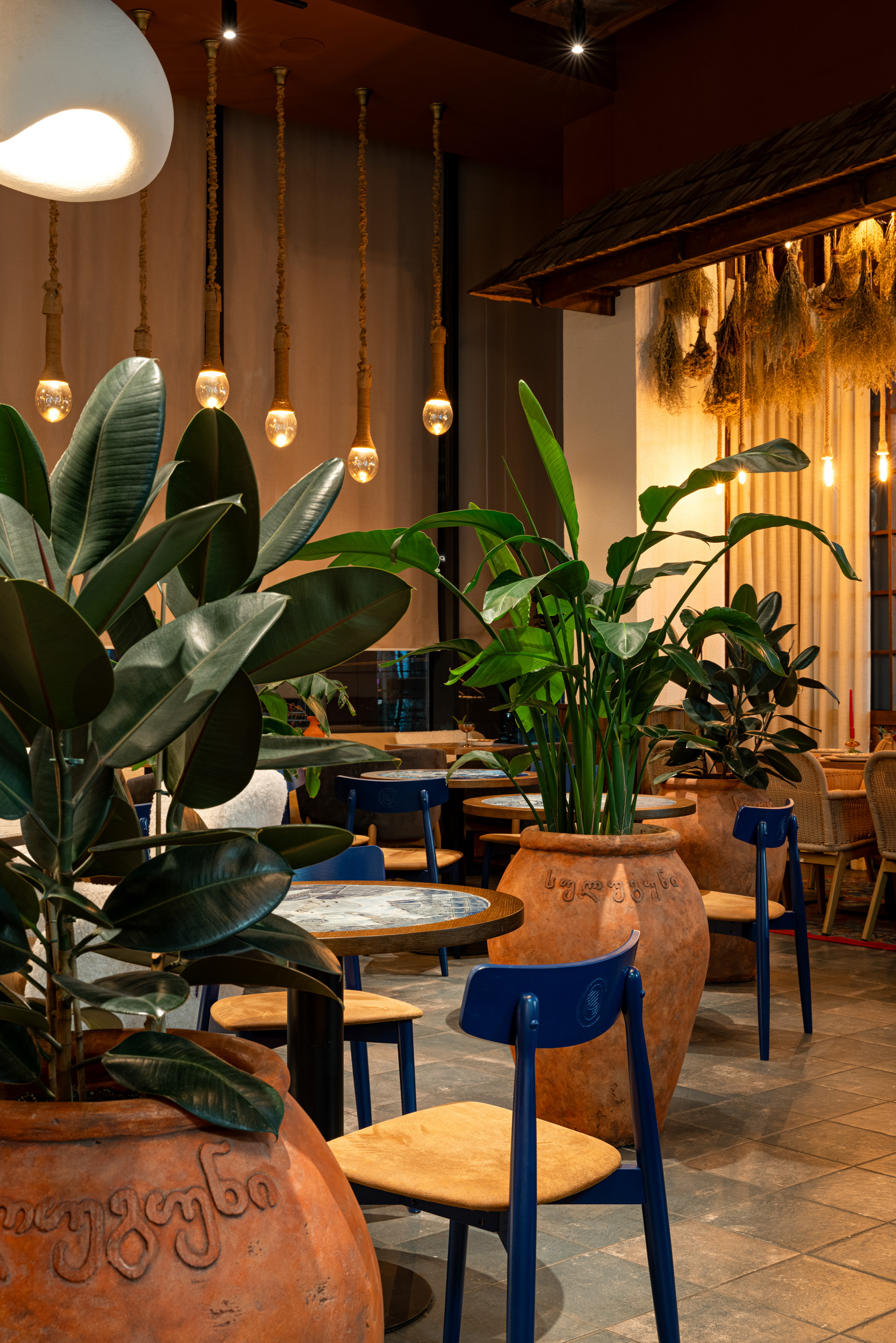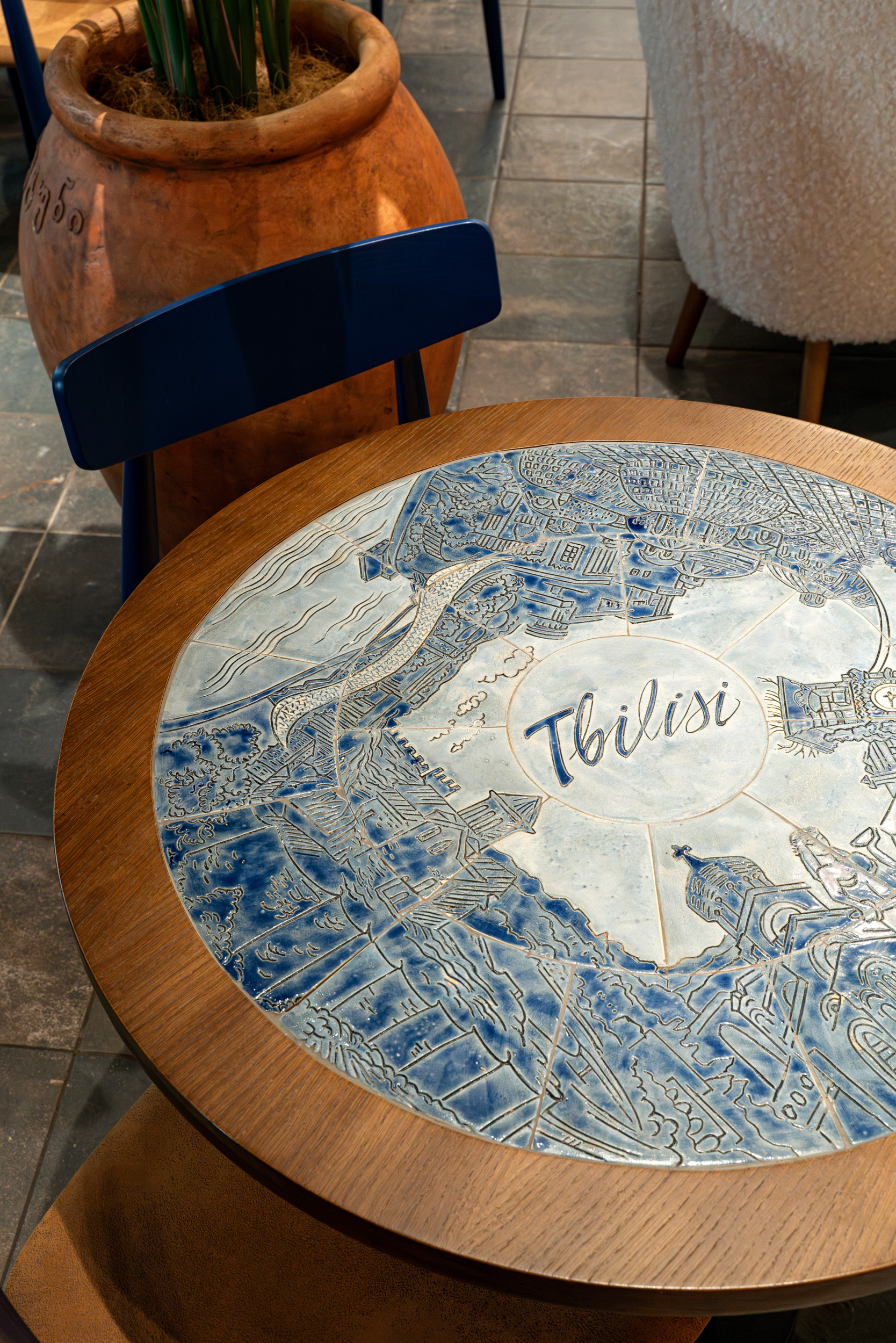 Концепция: Основная идея проекта — создание иммерсивного пространства, тщательно воспроизводящего каждый аспект традиционного грузинского быта. Центральный проход имитирует узкие дворики, а кухня, сердце заведения, расположена в центре обеденного зала, украшенная произведениями Нико Пиросмани. Медные блюда и уникальный орнамент грузинских скатертей на общем столе подчеркивают гостеприимство. Особое внимание уделено деталям: от обивки стульев, имитирующей мех козлика, до эксклюзивных керамических столов ручной работы, каждый из которых символизирует знаменитые города Грузии и украшен их достопримечательностями.