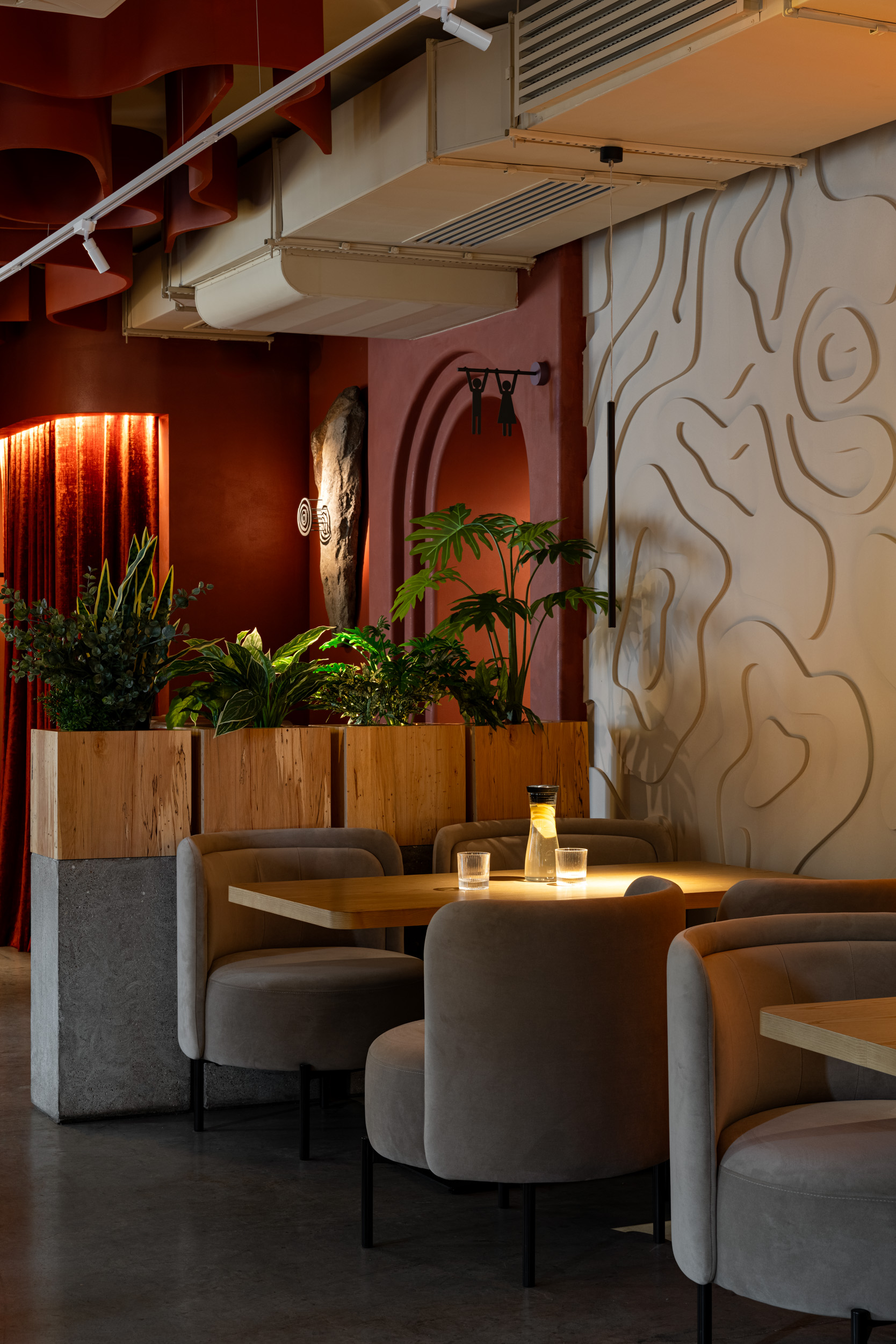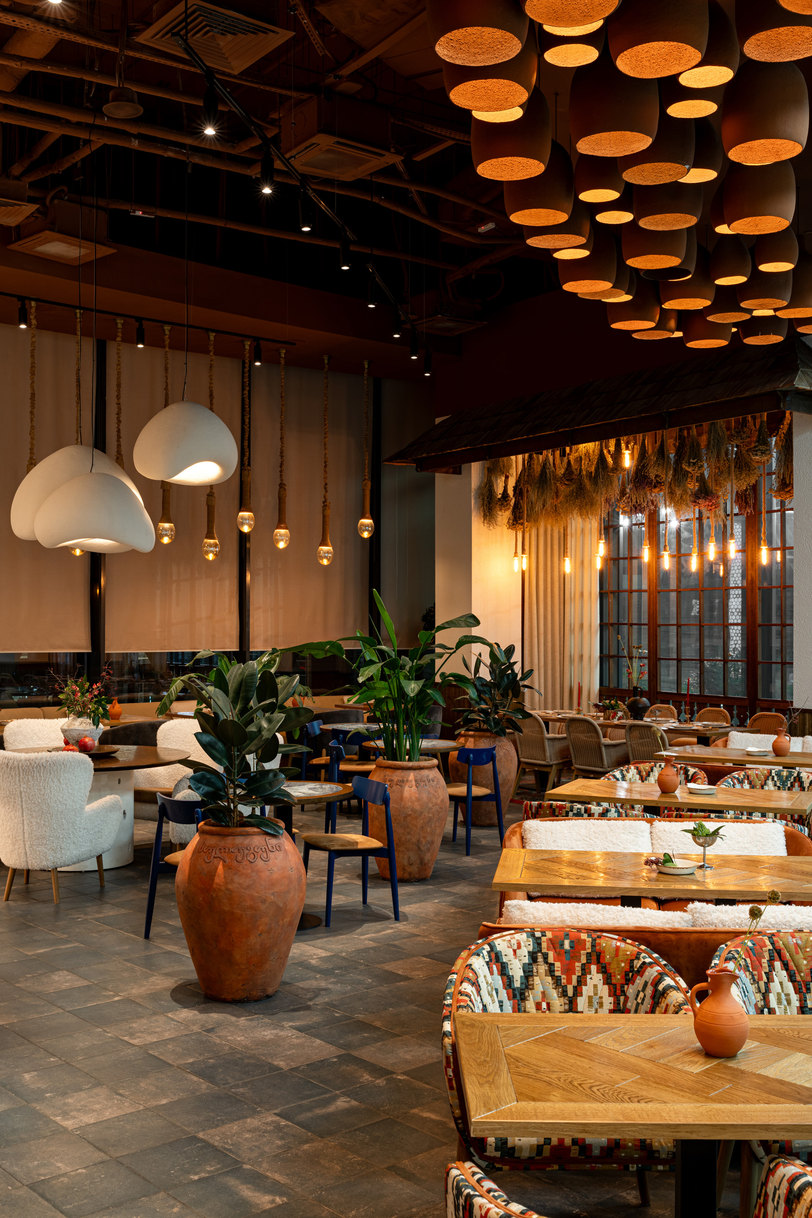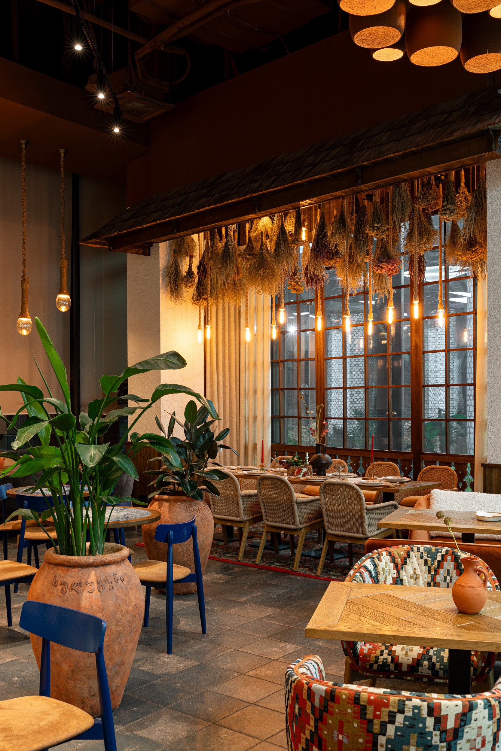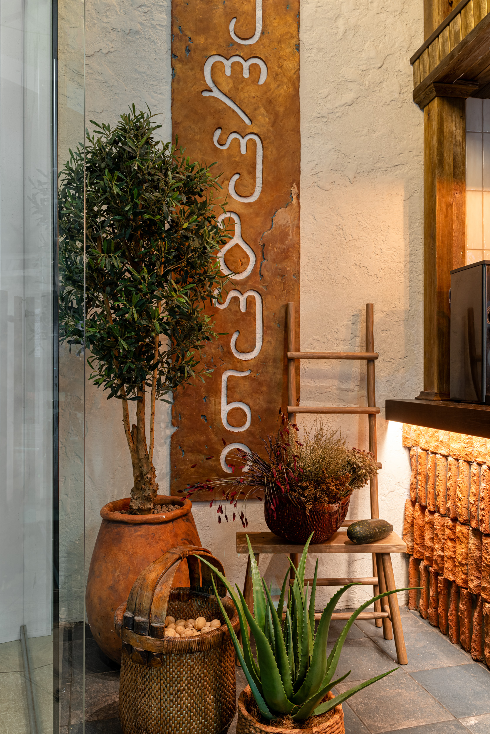 Концепция: Основная идея проекта — создание иммерсивного пространства, тщательно воспроизводящего каждый аспект традиционного грузинского быта. Центральный проход имитирует узкие дворики, а кухня, сердце заведения, расположена в центре обеденного зала, украшенная произведениями Нико Пиросмани. Медные блюда и уникальный орнамент грузинских скатертей на общем столе подчеркивают гостеприимство. Особое внимание уделено деталям: от обивки стульев, имитирующей мех козлика, до эксклюзивных керамических столов ручной работы, каждый из которых символизирует знаменитые города Грузии и украшен их достопримечательностями.