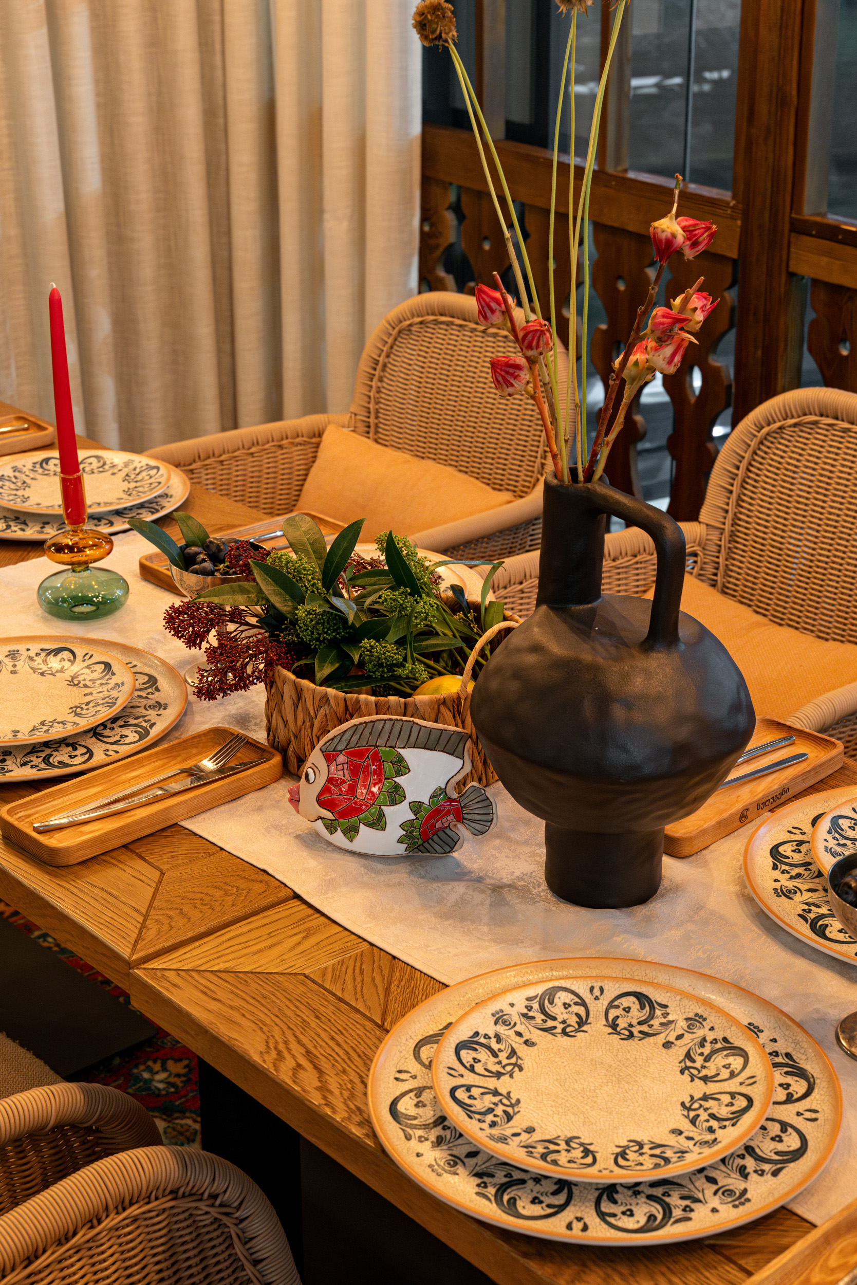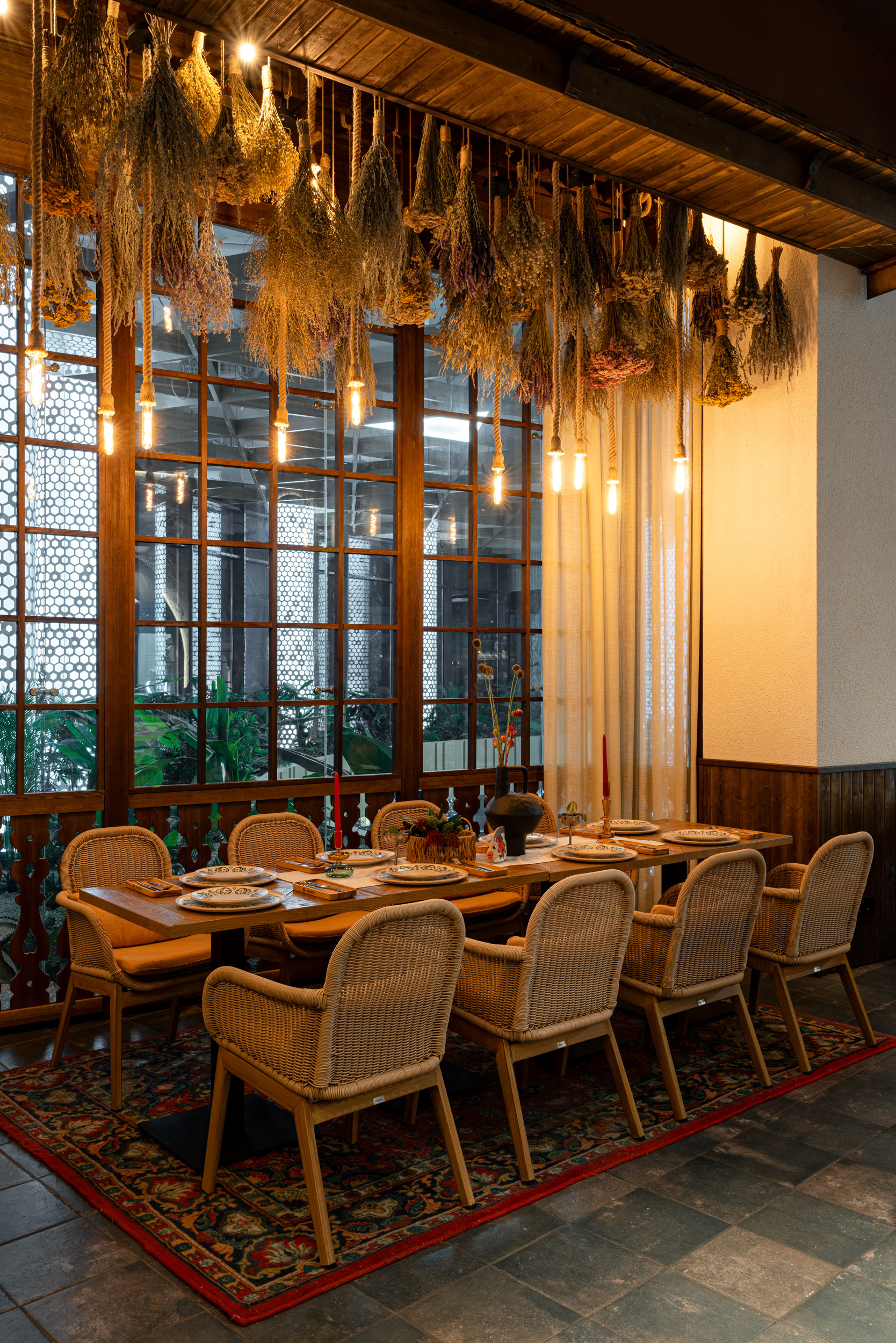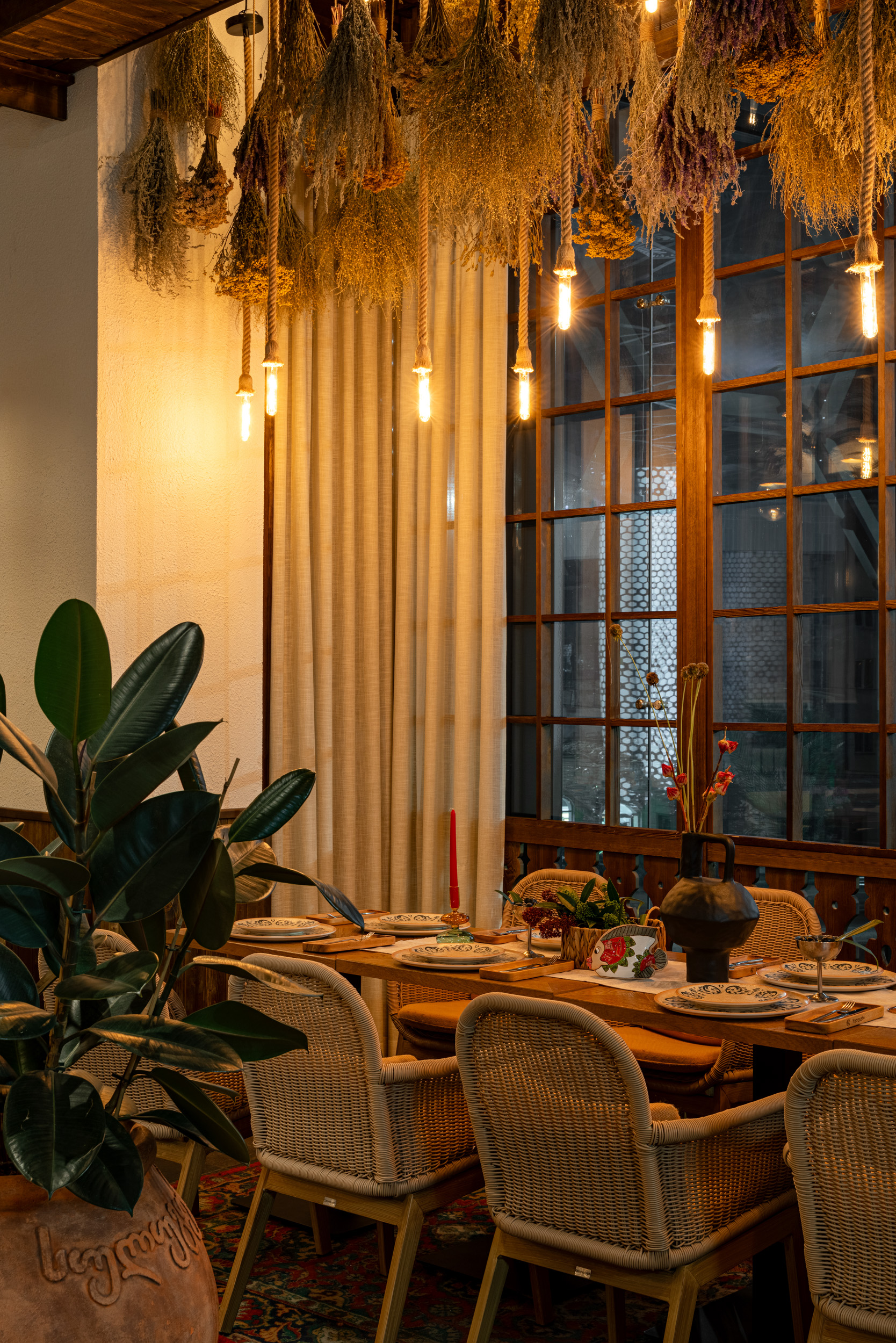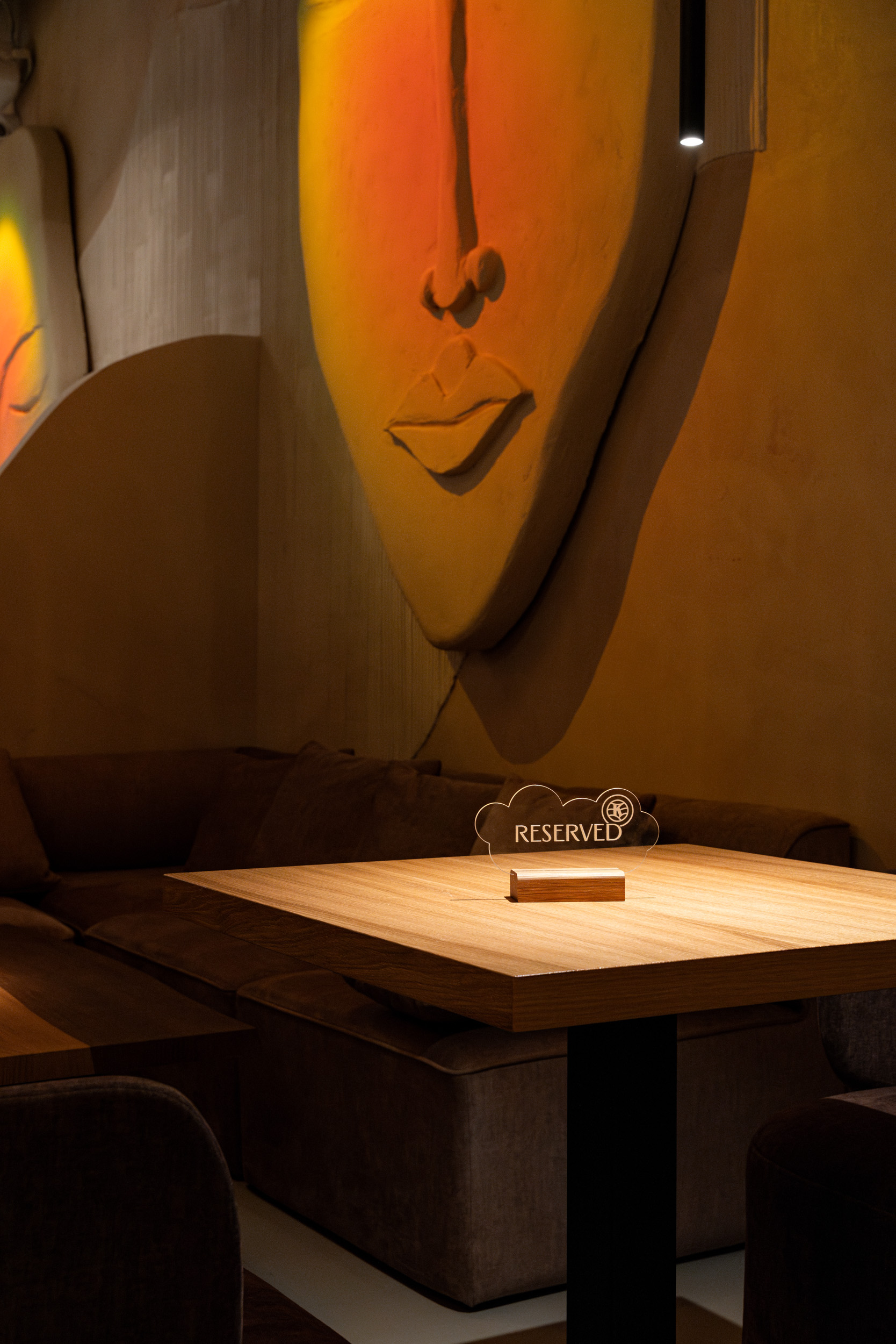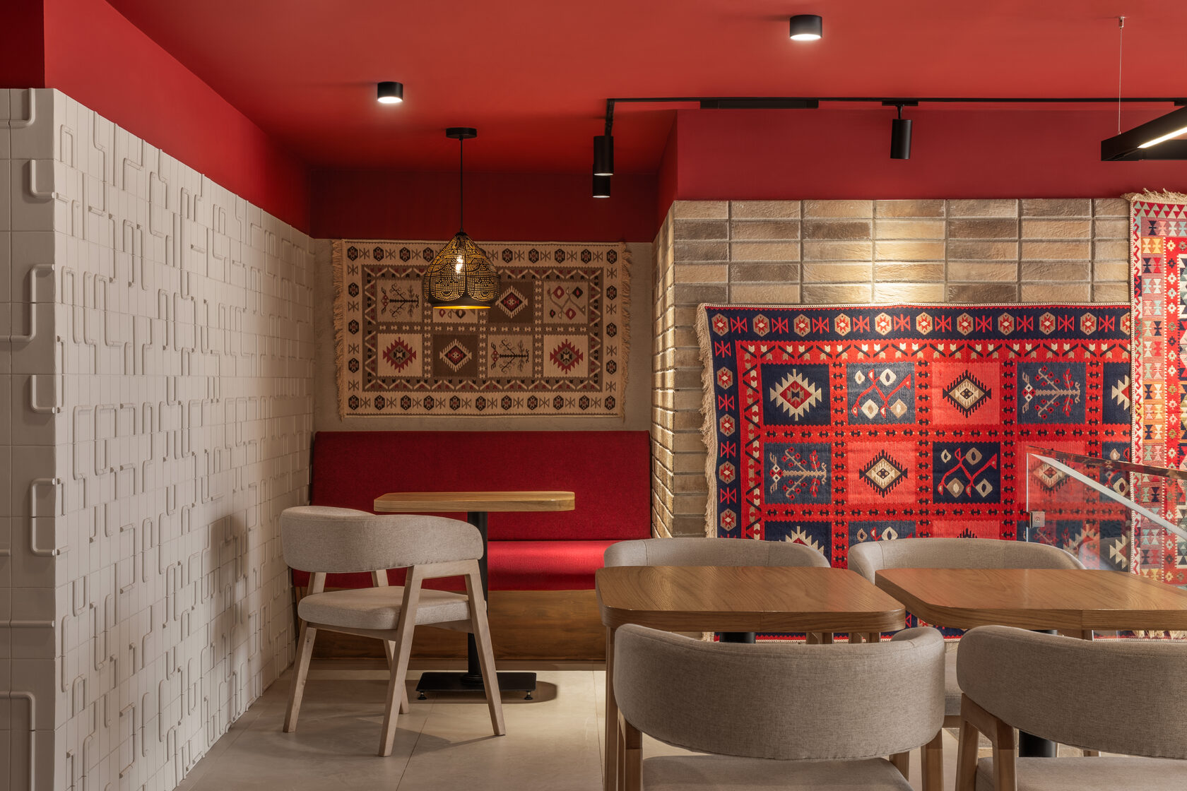 Концепция: Основная идея проекта — создание иммерсивного пространства, тщательно воспроизводящего каждый аспект традиционного грузинского быта. Центральный проход имитирует узкие дворики, а кухня, сердце заведения, расположена в центре обеденного зала, украшенная произведениями Нико Пиросмани. Медные блюда и уникальный орнамент грузинских скатертей на общем столе подчеркивают гостеприимство. Особое внимание уделено деталям: от обивки стульев, имитирующей мех козлика, до эксклюзивных керамических столов ручной работы, каждый из которых символизирует знаменитые города Грузии и украшен их достопримечательностями.
