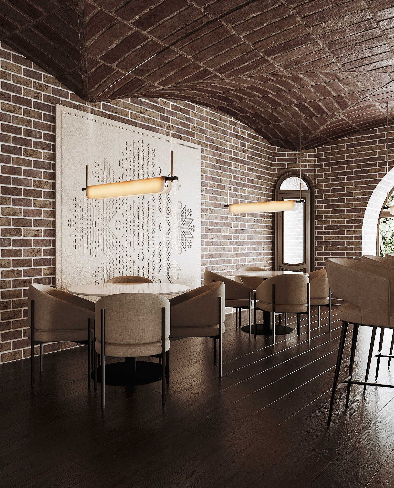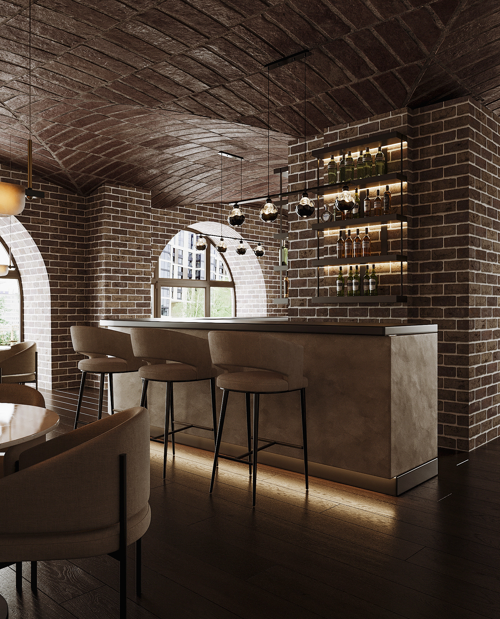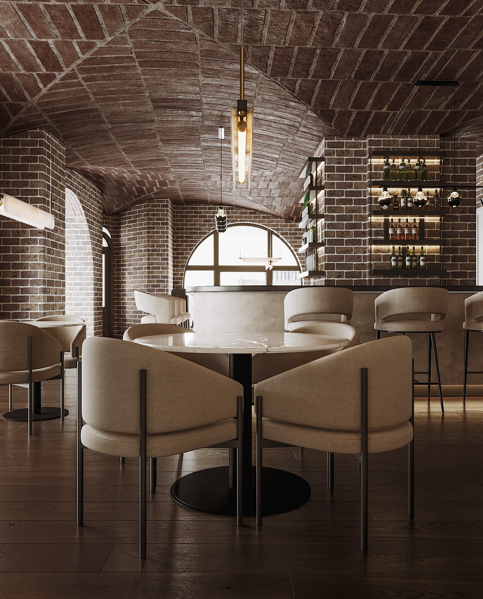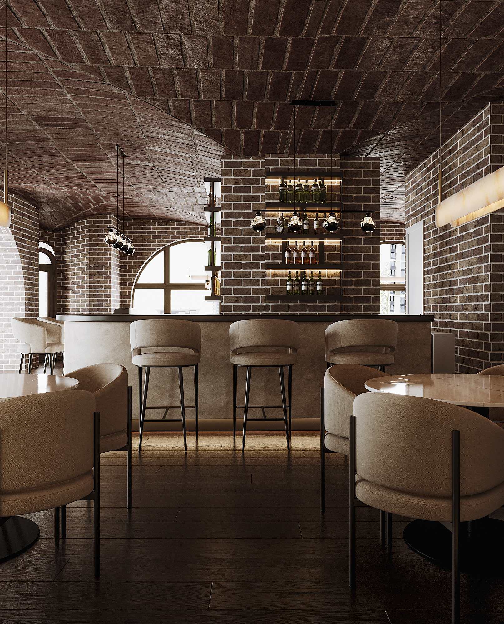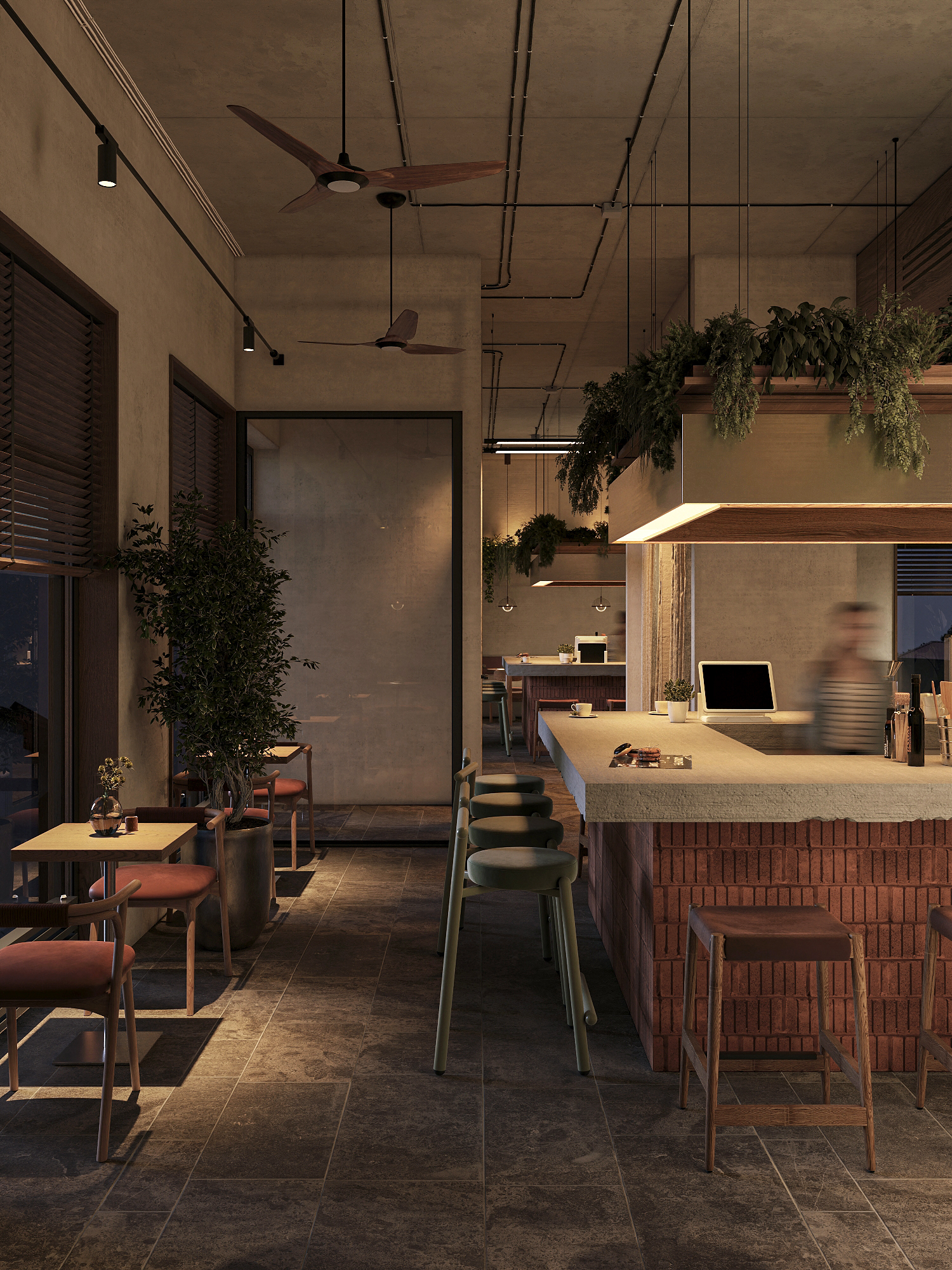 Ресторан расположен в жилом комплексе и ориентирован на местных жителей, преимущественно семейные пары старше 35 лет. Пространство продумано как место для завтрака, обеда, ужина, встреч с друзьями и детьми, а также для работы и творчества. Дизайн сочетает брутальные бетонные и кирпичные поверхности с уютными велюровыми фактурами, создавая баланс строгости и женственности. Три зала выполняют разные функции: кофе и завтрак, обед и ужин при свечах, работа и общение с соседями.