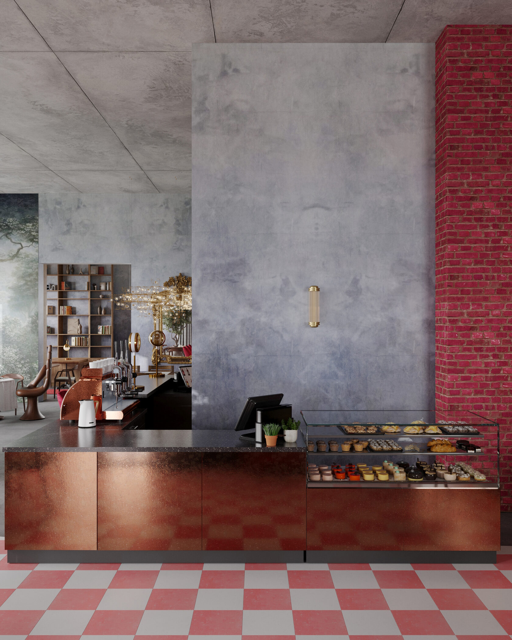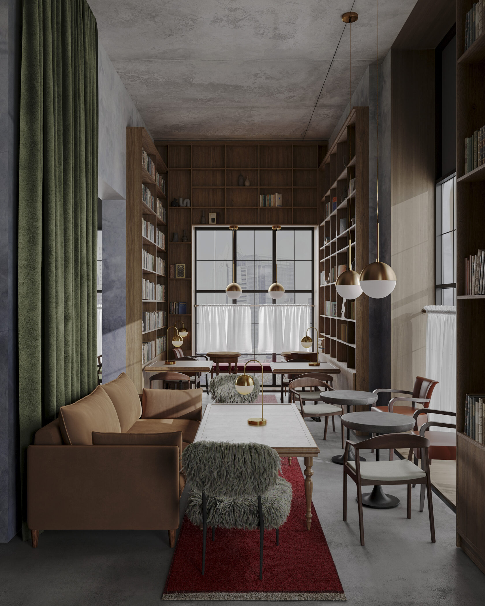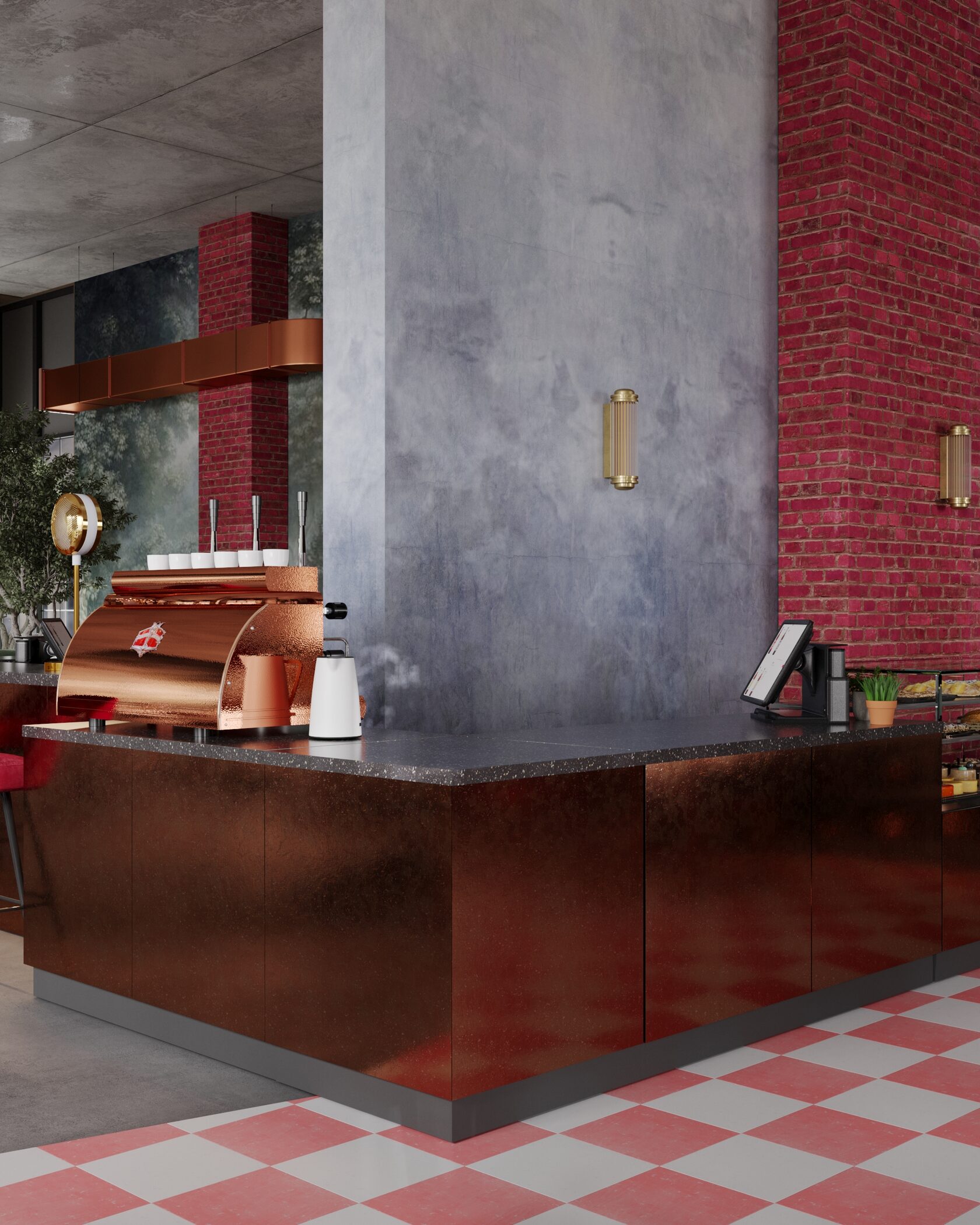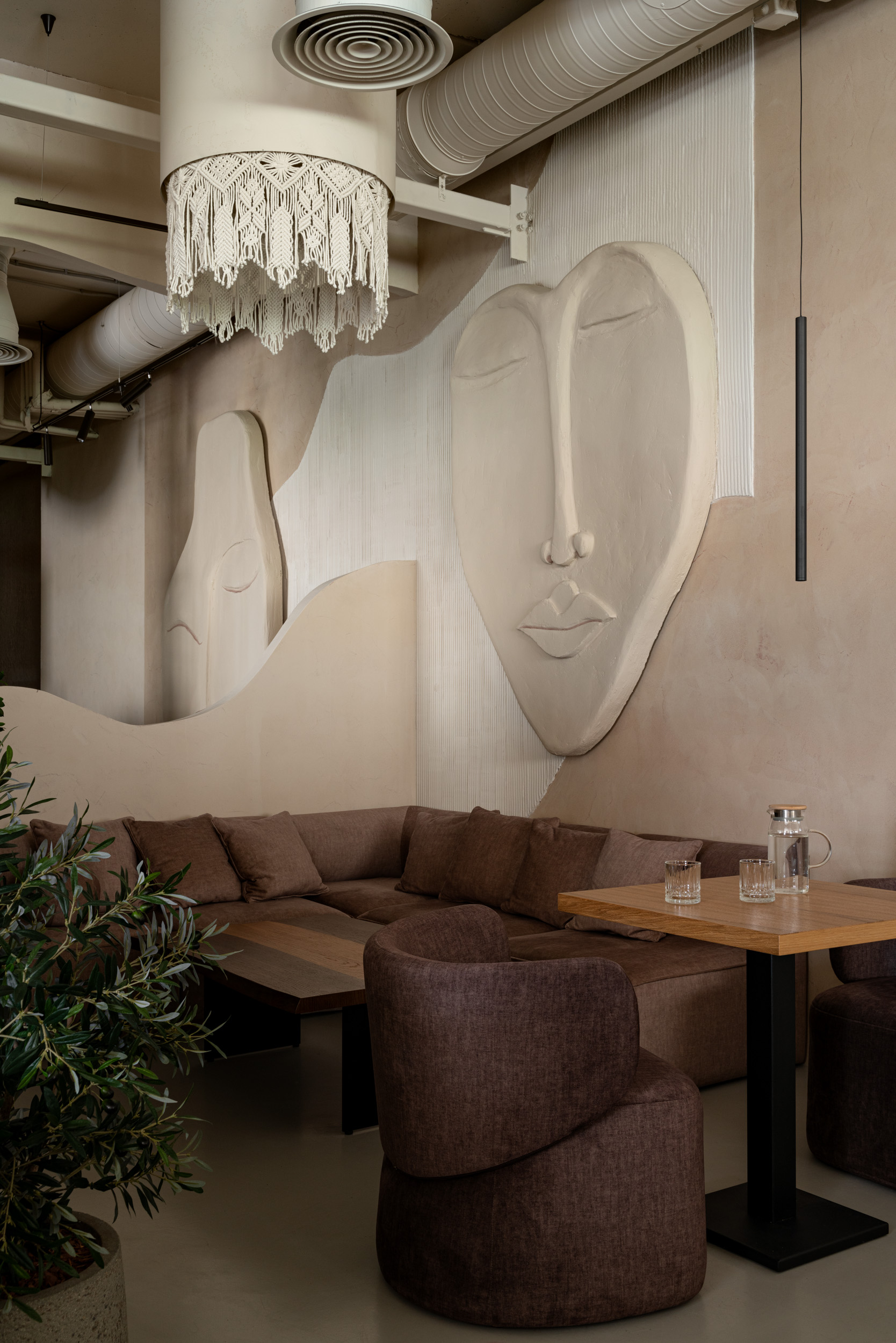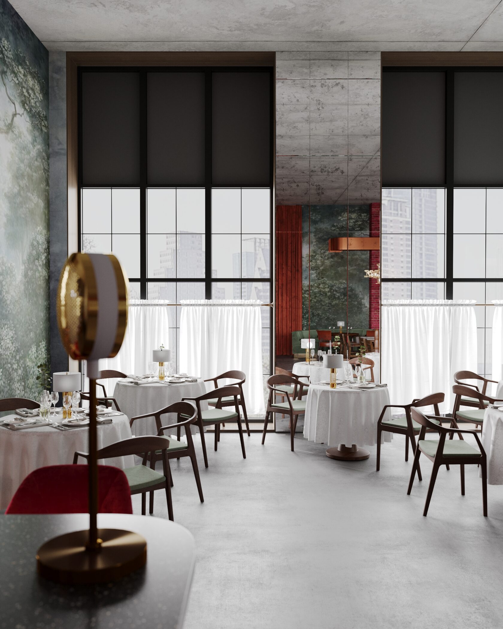 Ресторан расположен в жилом комплексе и ориентирован на местных жителей, преимущественно семейные пары старше 35 лет. Пространство продумано как место для завтрака, обеда, ужина, встреч с друзьями и детьми, а также для работы и творчества. Дизайн сочетает брутальные бетонные и кирпичные поверхности с уютными велюровыми фактурами, создавая баланс строгости и женственности. Три зала выполняют разные функции: кофе и завтрак, обед и ужин при свечах, работа и общение с соседями.