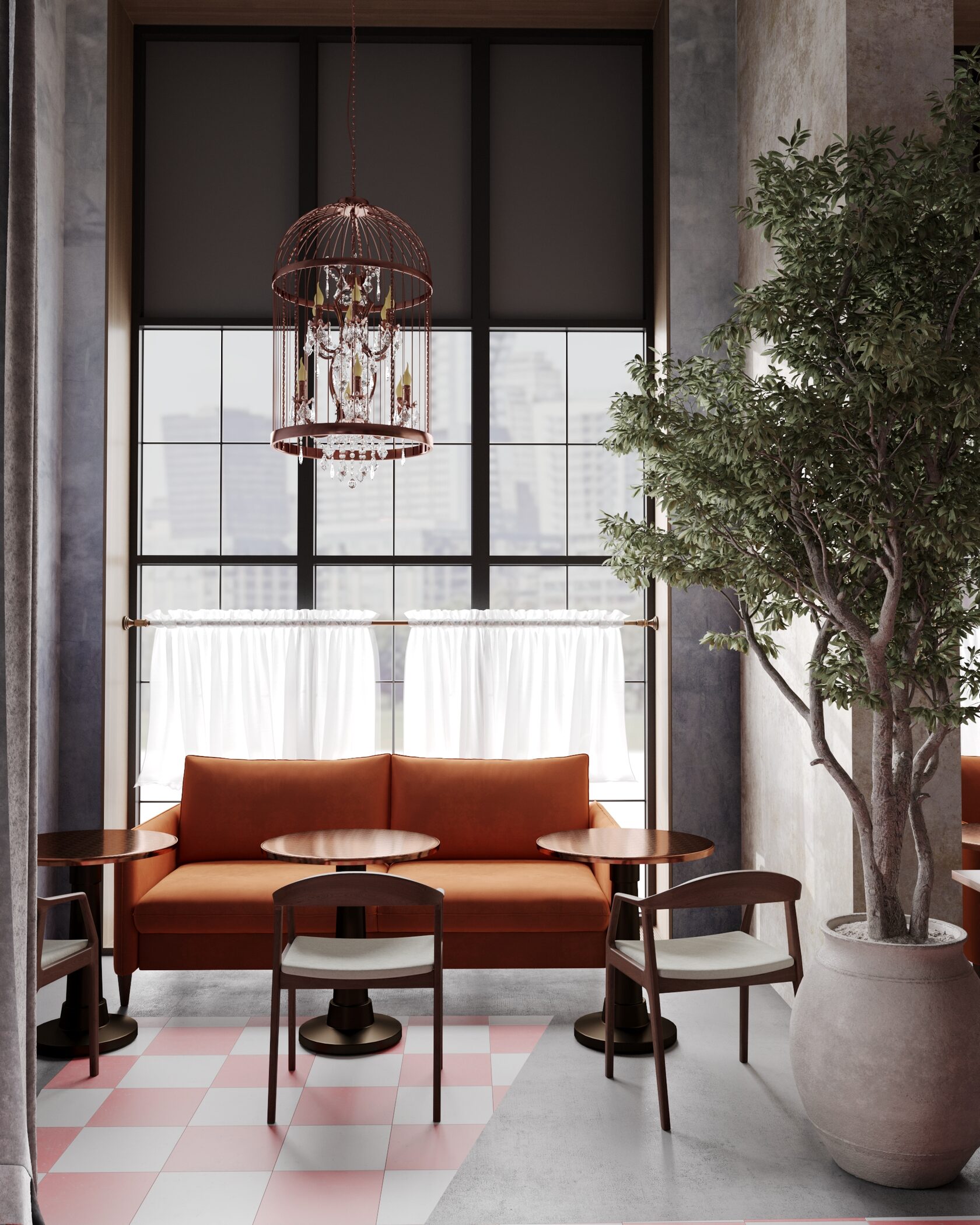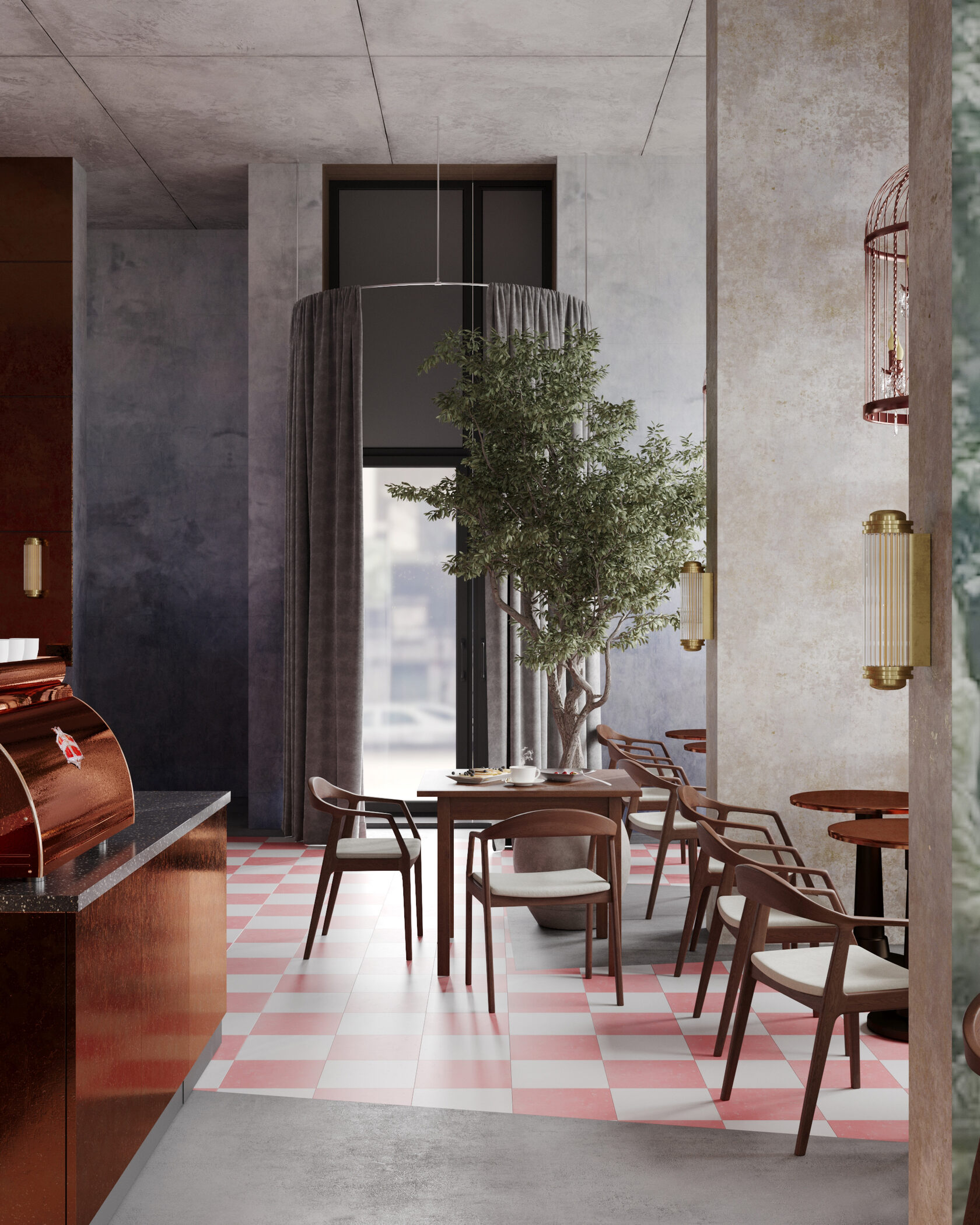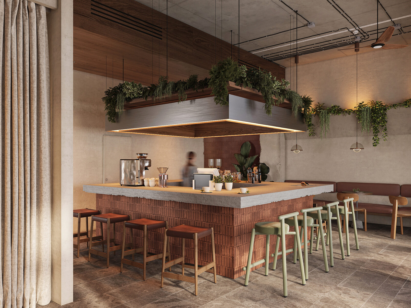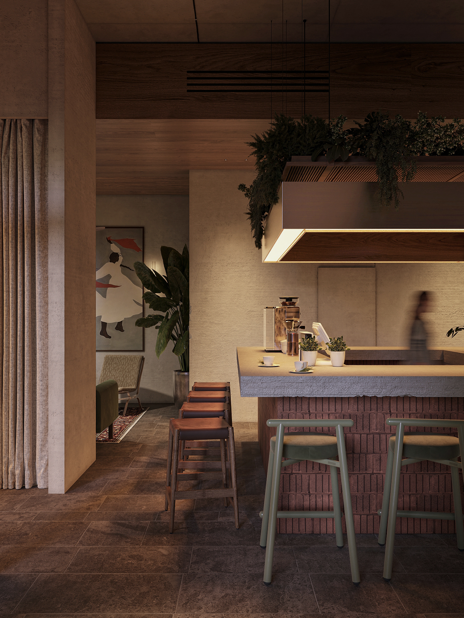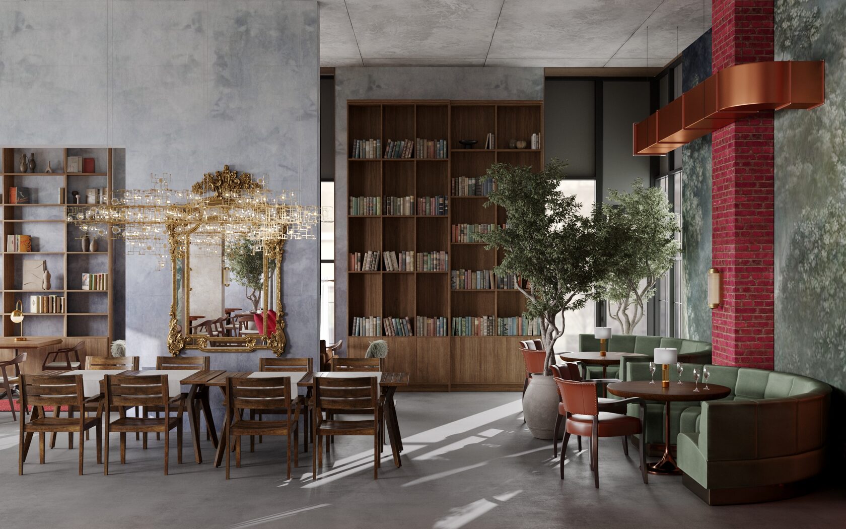 Ресторан расположен в жилом комплексе и ориентирован на местных жителей, преимущественно семейные пары старше 35 лет. Пространство продумано как место для завтрака, обеда, ужина, встреч с друзьями и детьми, а также для работы и творчества. Дизайн сочетает брутальные бетонные и кирпичные поверхности с уютными велюровыми фактурами, создавая баланс строгости и женственности. Три зала выполняют разные функции: кофе и завтрак, обед и ужин при свечах, работа и общение с соседями.