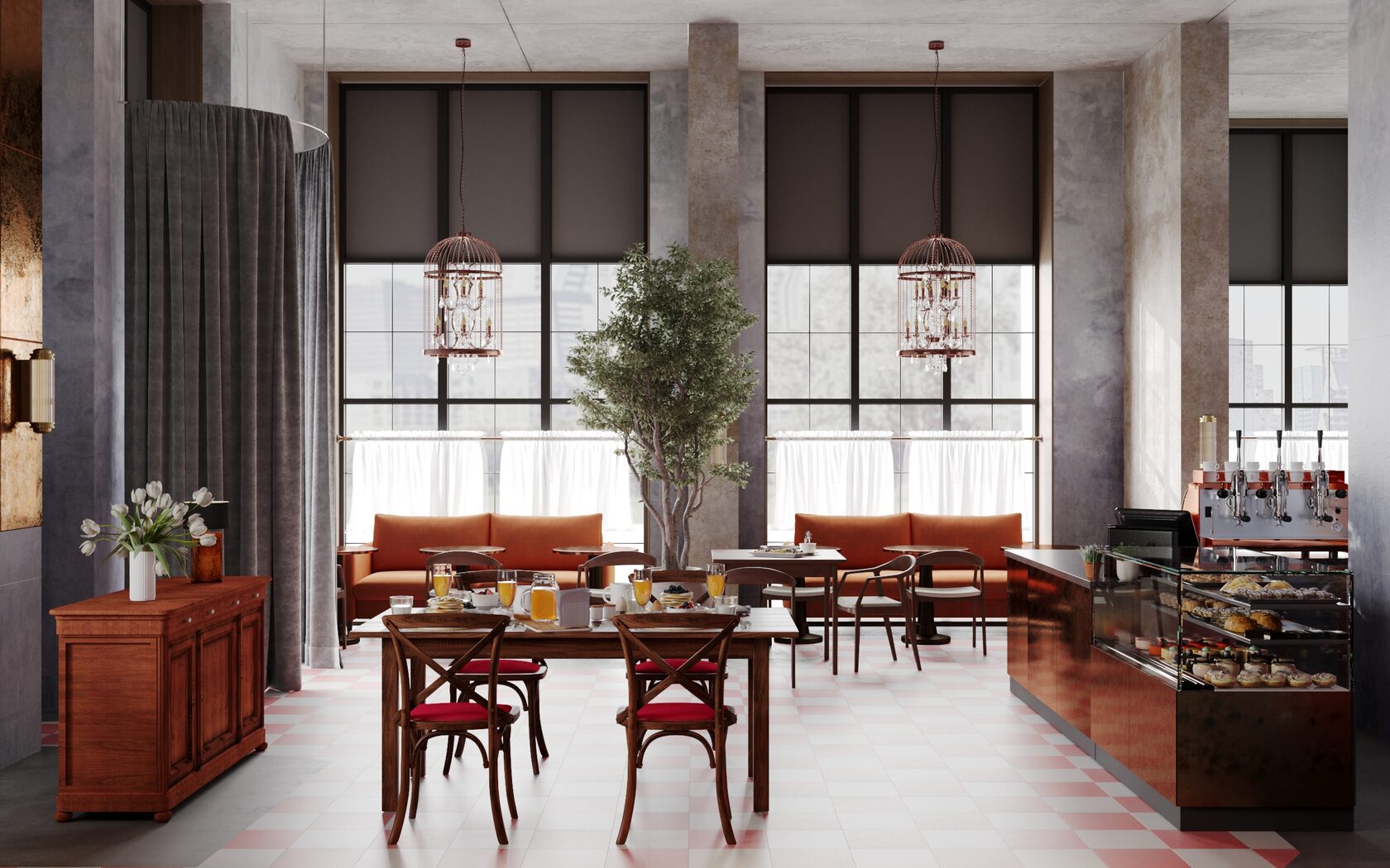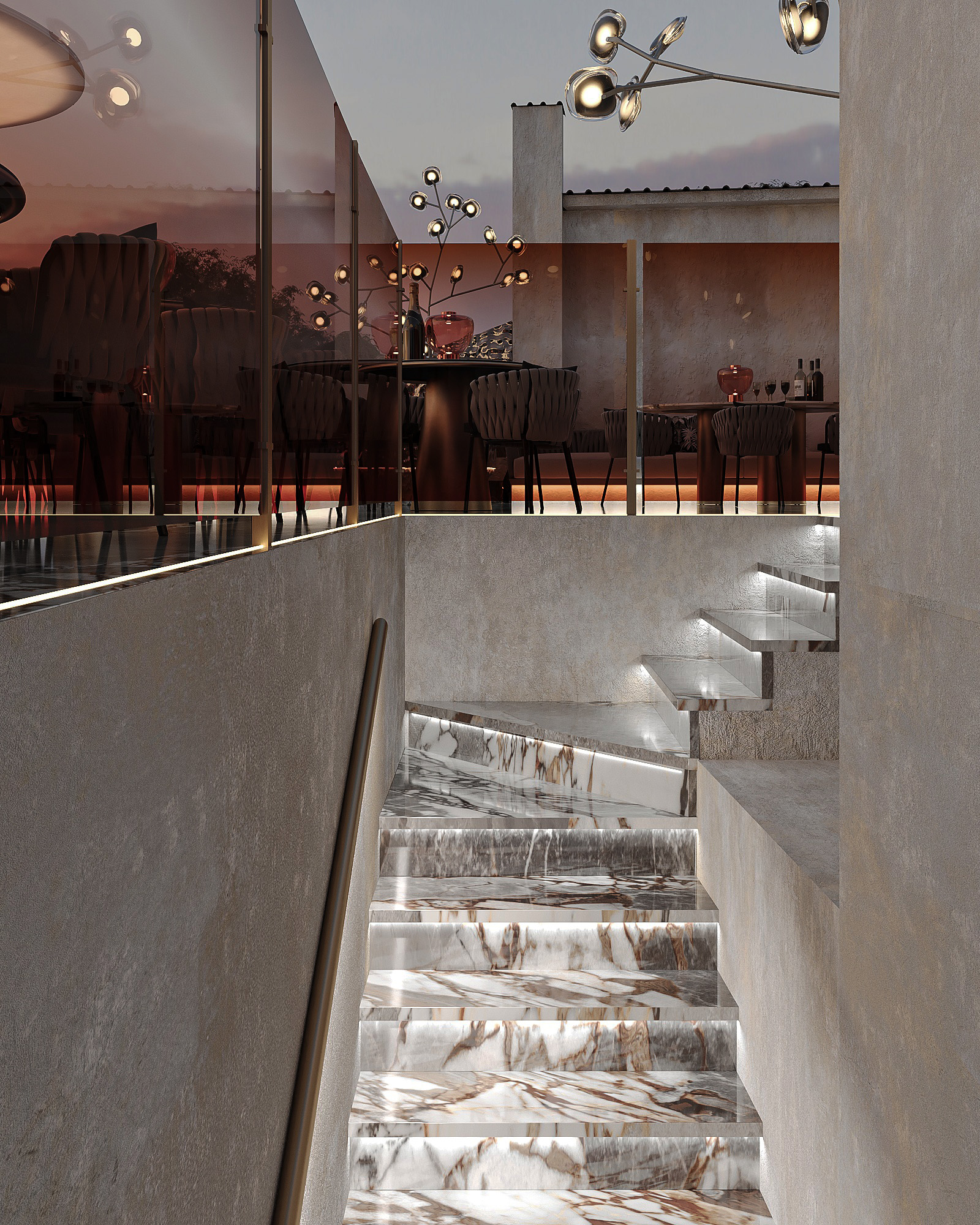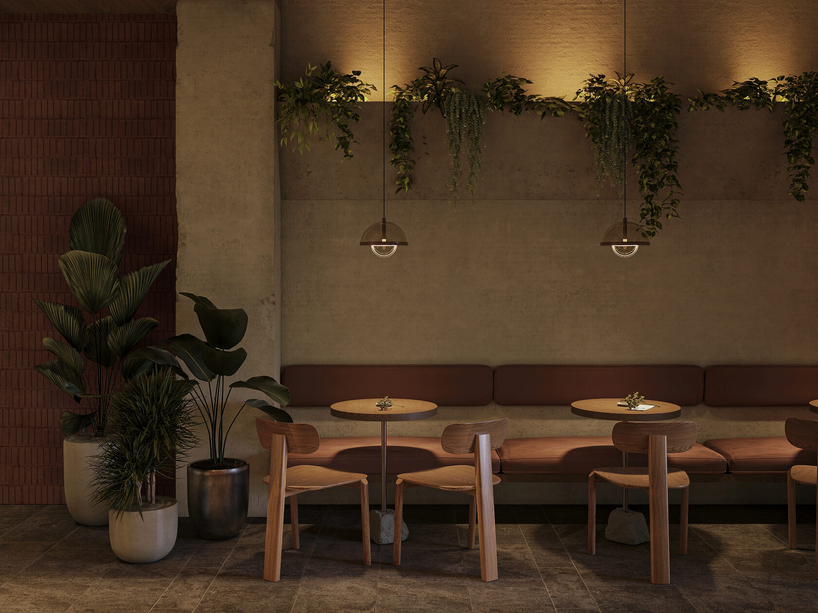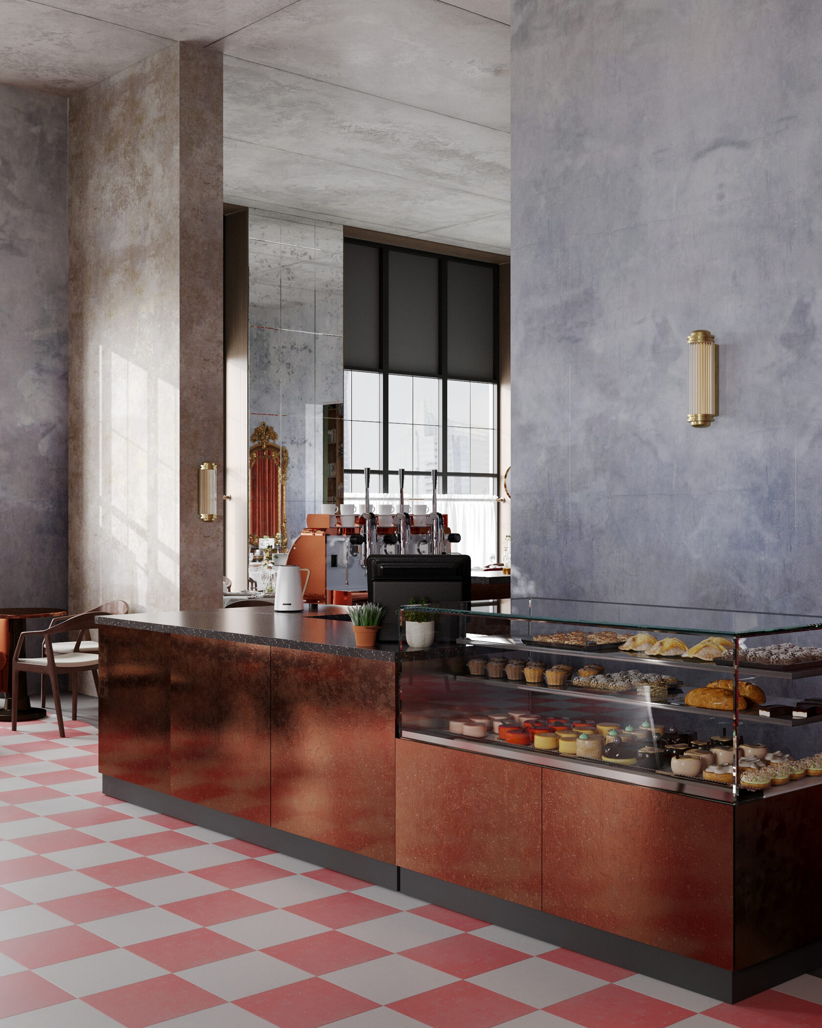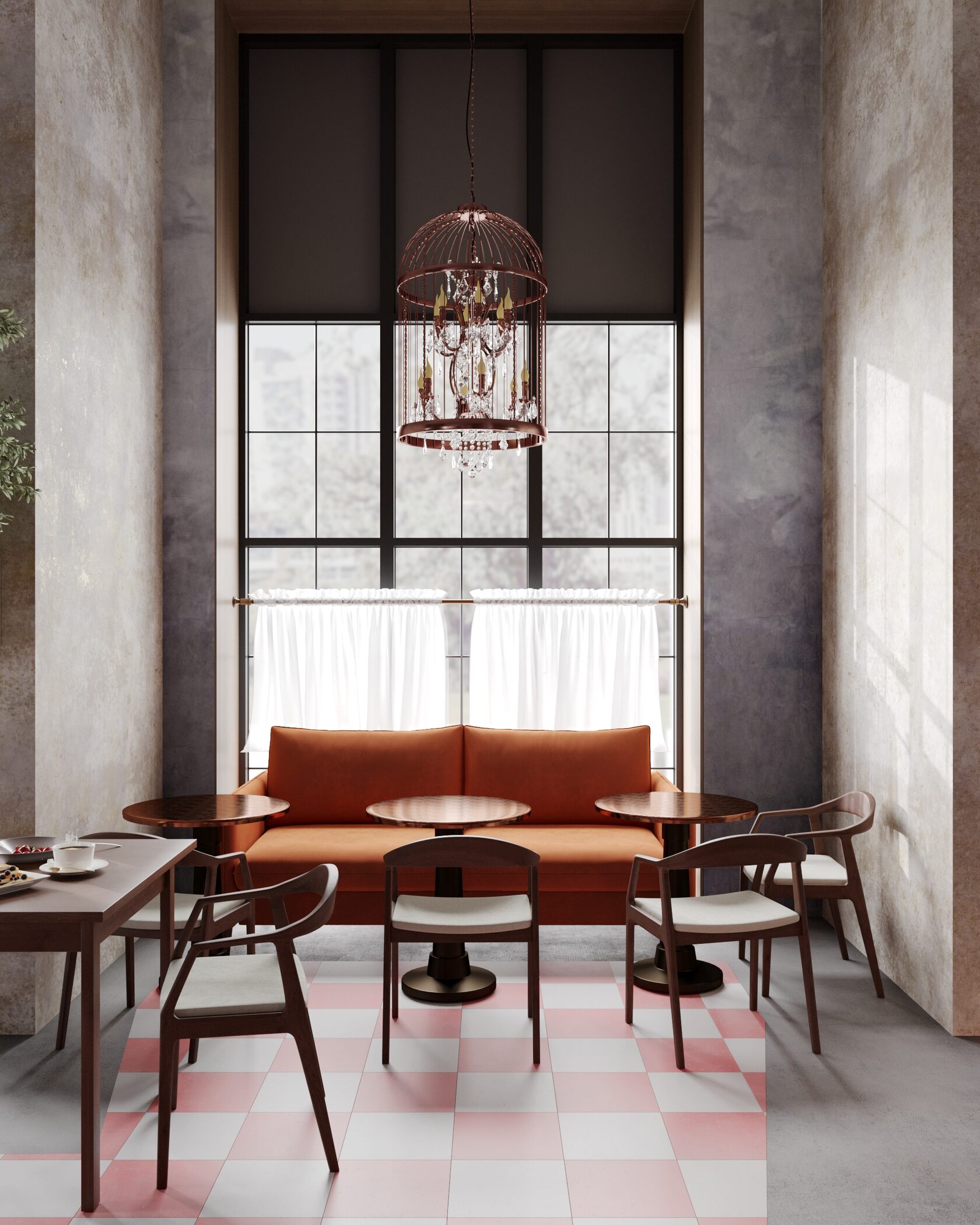 Ресторан расположен в жилом комплексе и ориентирован на местных жителей, преимущественно семейные пары старше 35 лет. Пространство продумано как место для завтрака, обеда, ужина, встреч с друзьями и детьми, а также для работы и творчества. Дизайн сочетает брутальные бетонные и кирпичные поверхности с уютными велюровыми фактурами, создавая баланс строгости и женственности. Три зала выполняют разные функции: кофе и завтрак, обед и ужин при свечах, работа и общение с соседями.