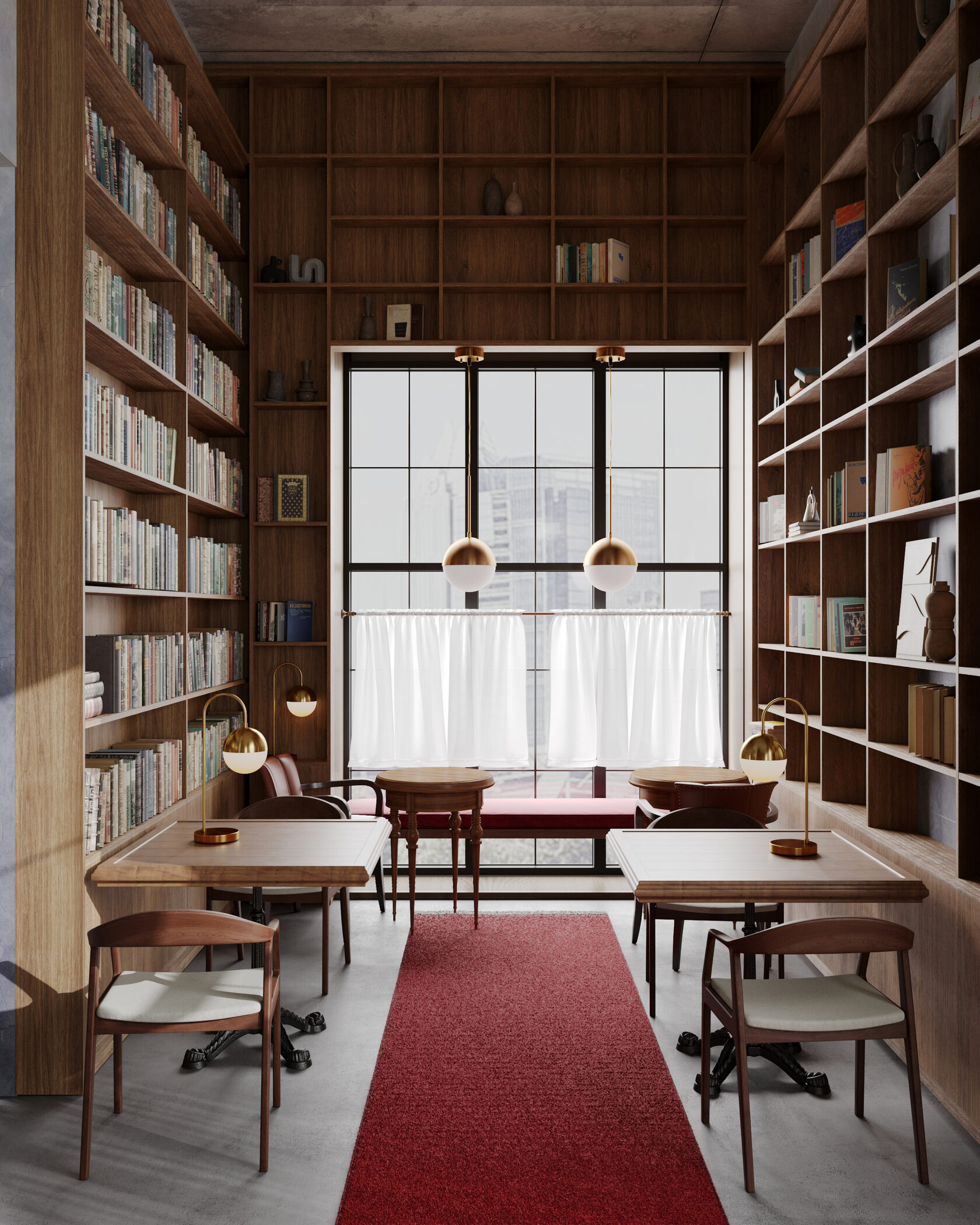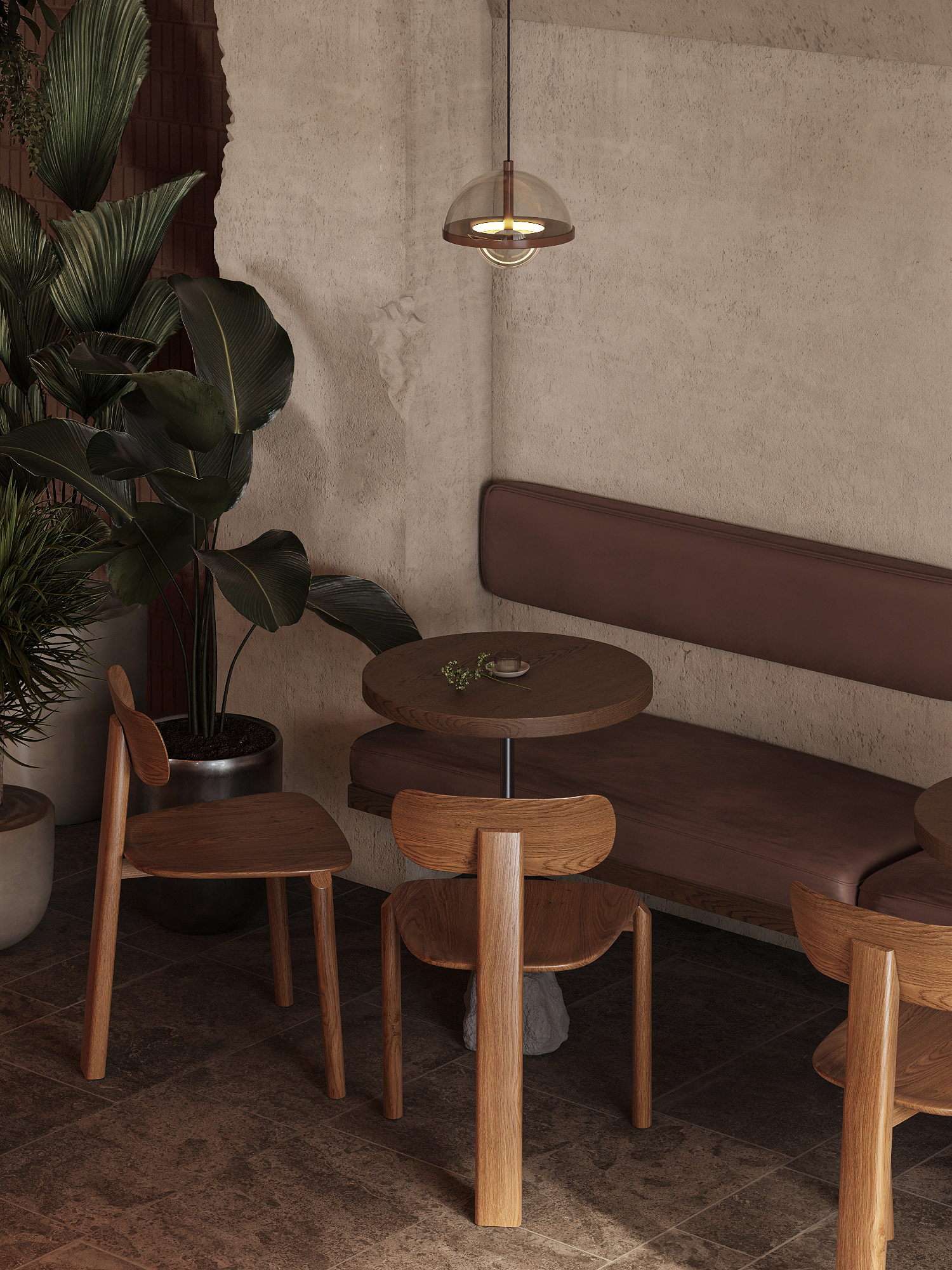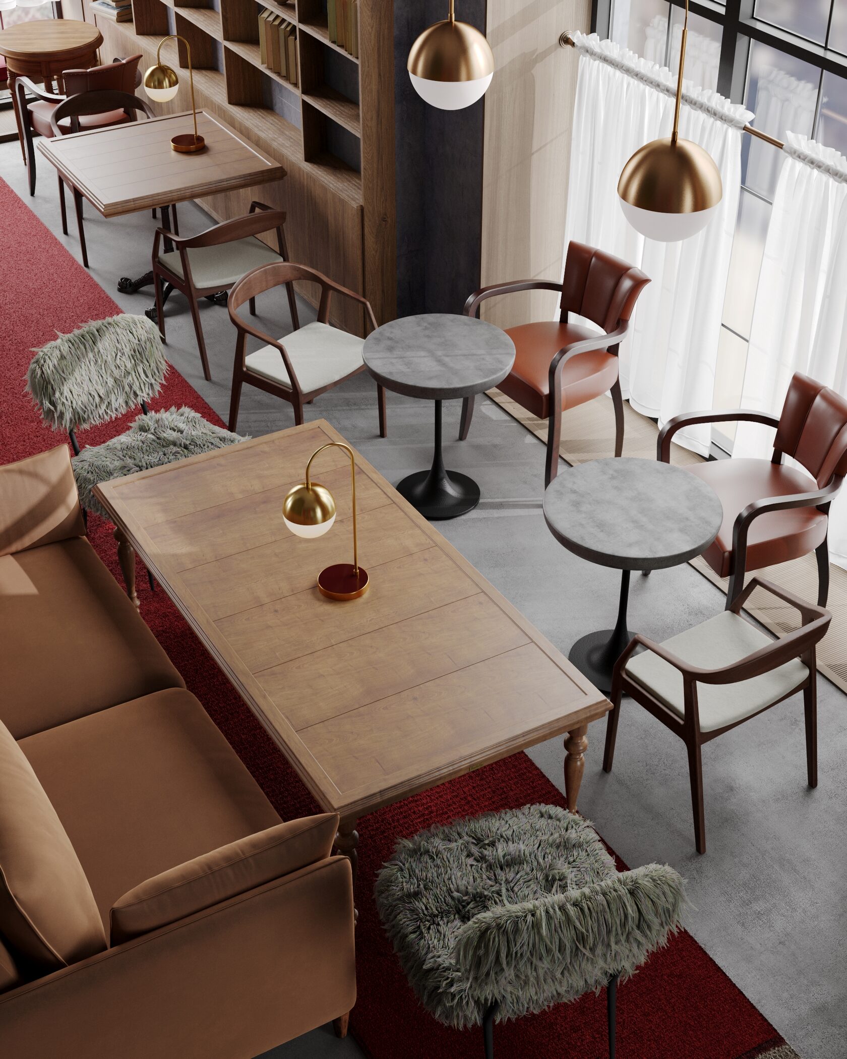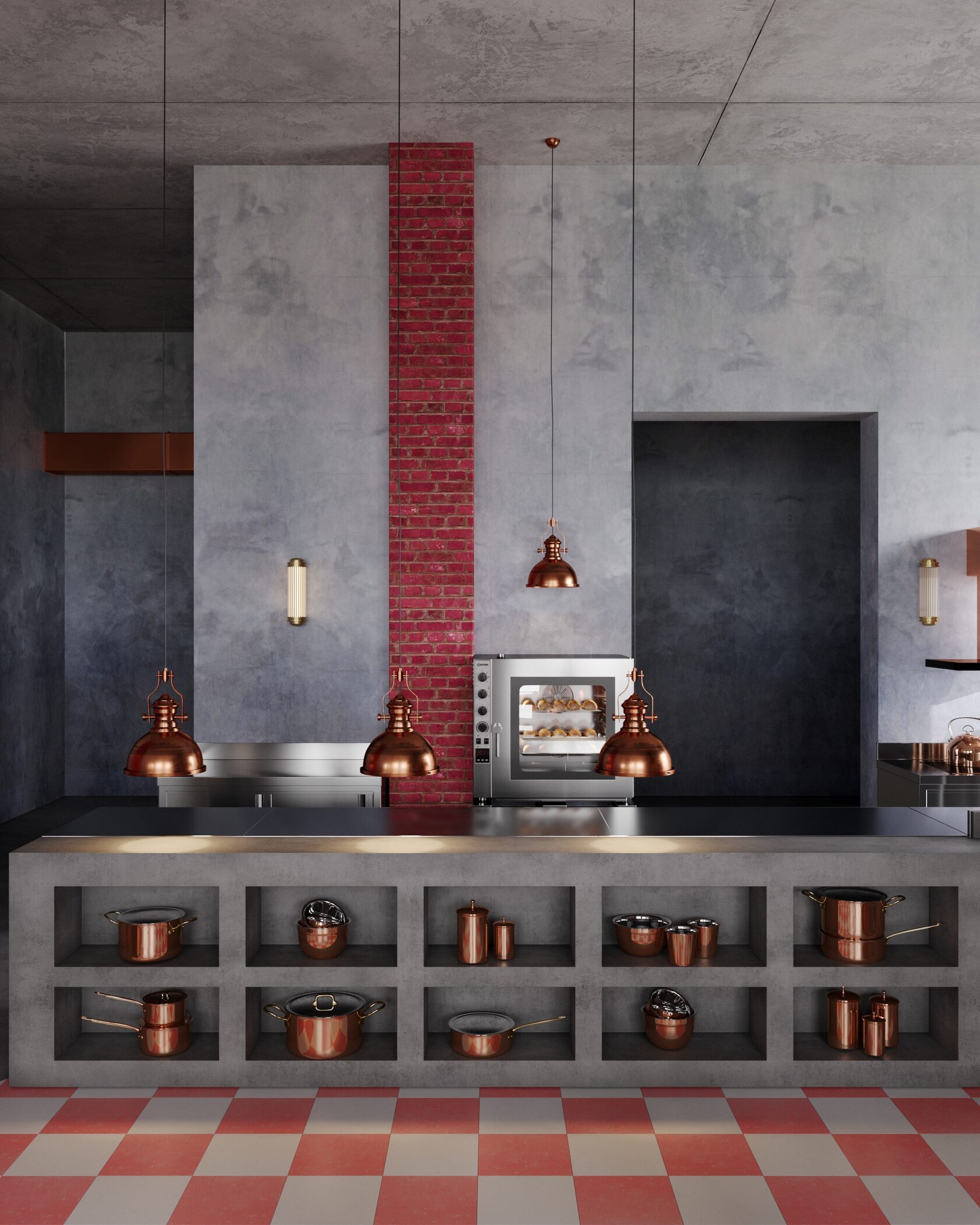 Ресторан расположен в жилом комплексе и ориентирован на местных жителей, преимущественно семейные пары старше 35 лет. Пространство продумано как место для завтрака, обеда, ужина, встреч с друзьями и детьми, а также для работы и творчества. Дизайн сочетает брутальные бетонные и кирпичные поверхности с уютными велюровыми фактурами, создавая баланс строгости и женственности. Три зала выполняют разные функции: кофе и завтрак, обед и ужин при свечах, работа и общение с соседями.
