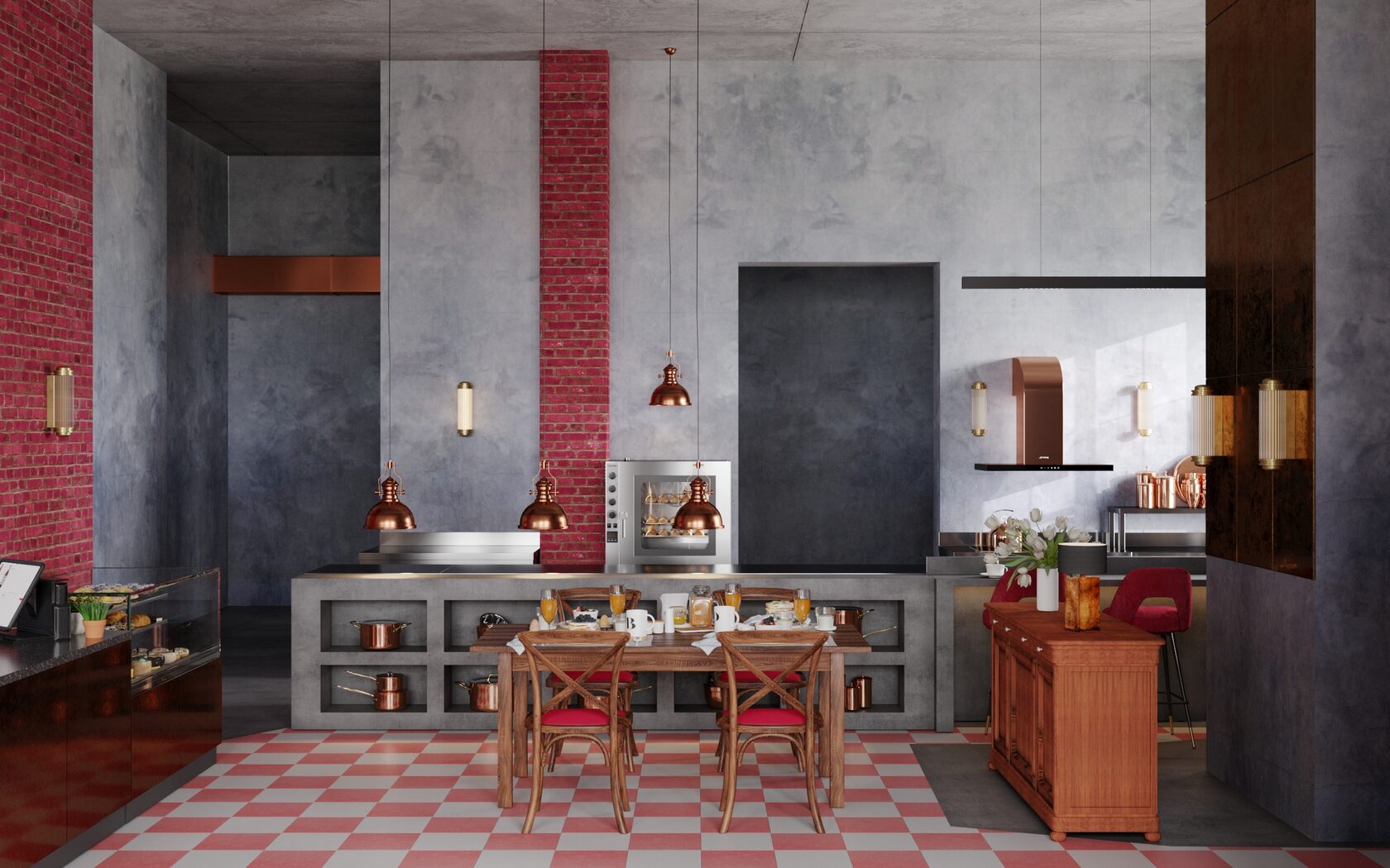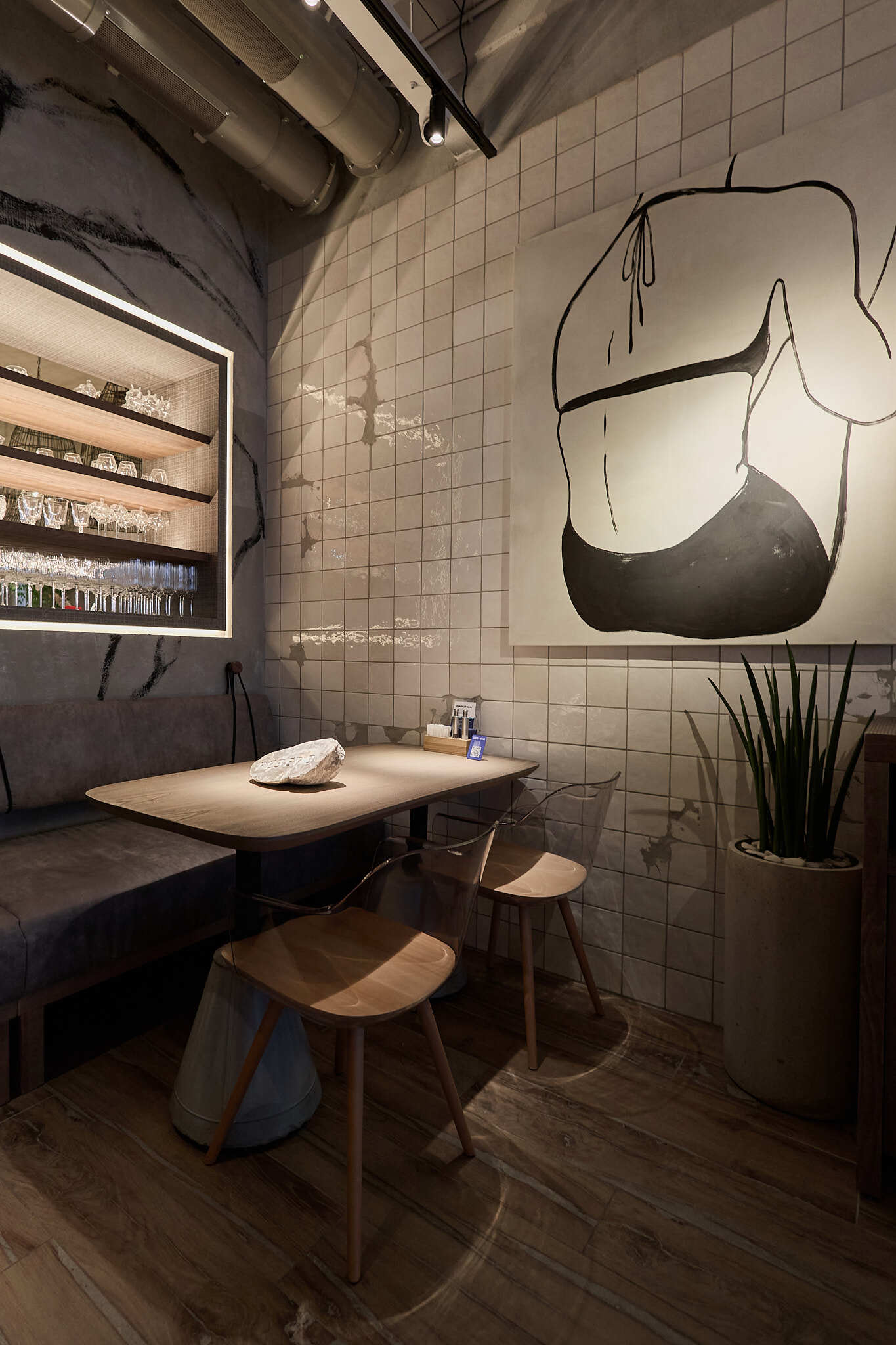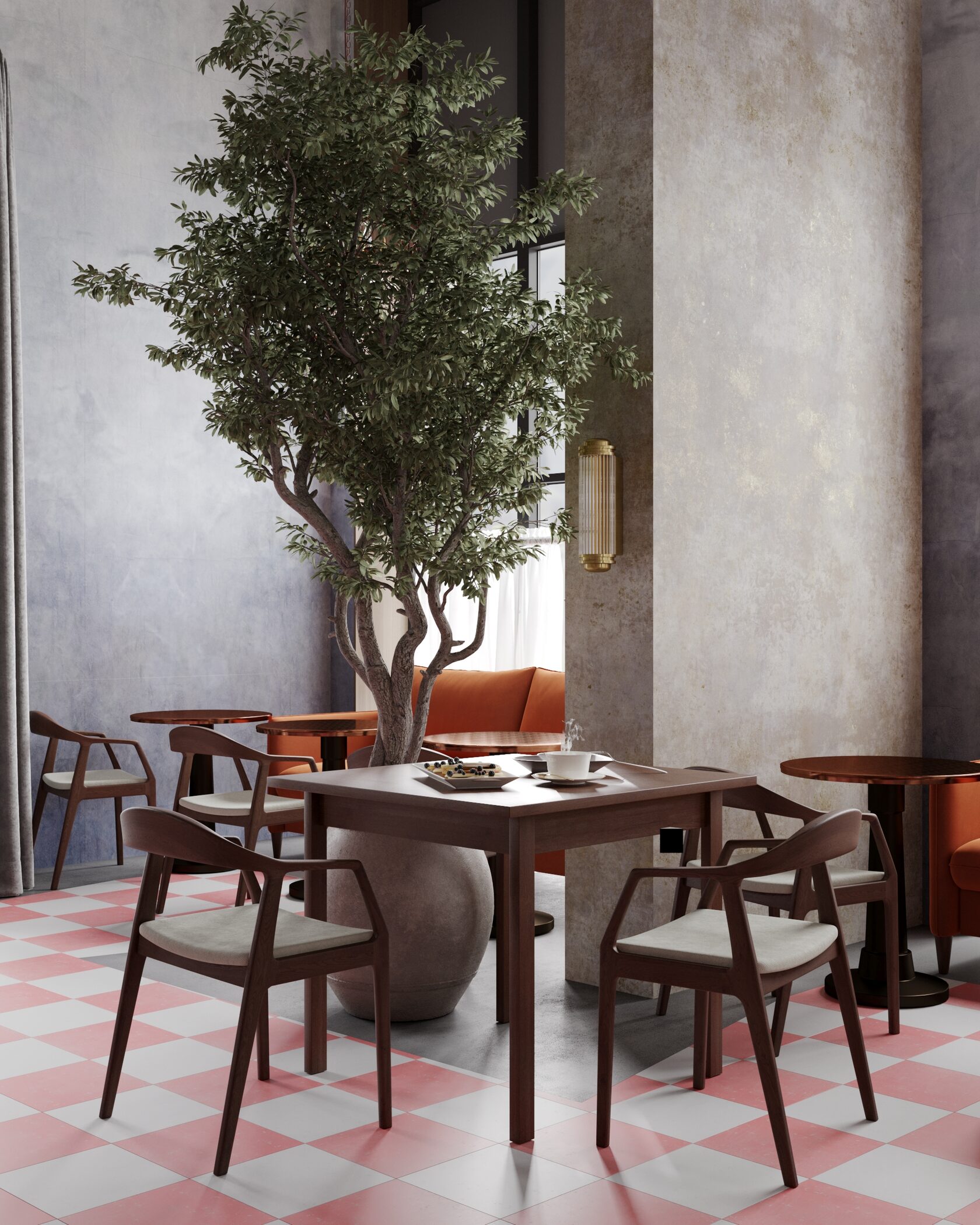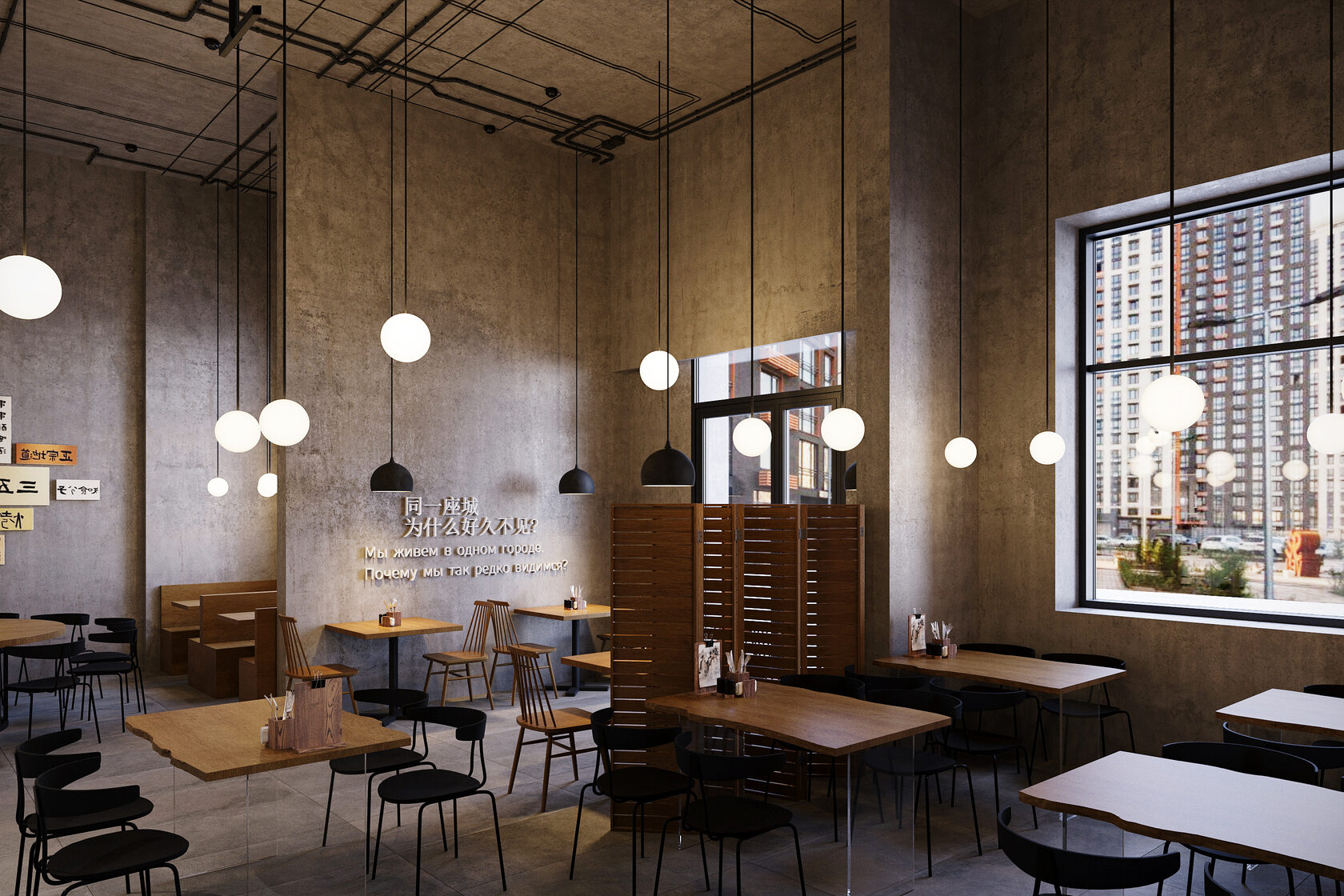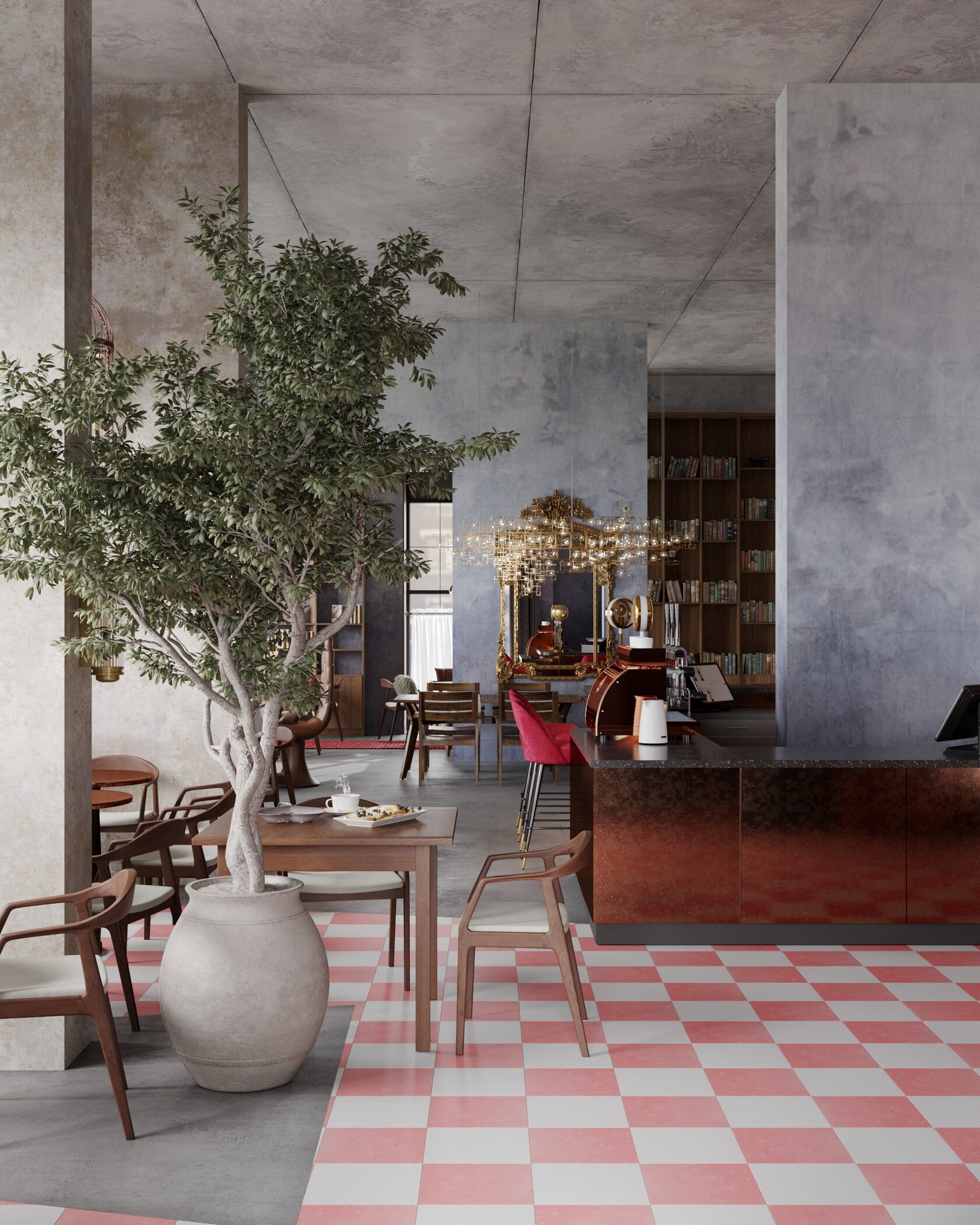 Ресторан расположен в жилом комплексе и ориентирован на местных жителей, преимущественно семейные пары старше 35 лет. Пространство продумано как место для завтрака, обеда, ужина, встреч с друзьями и детьми, а также для работы и творчества. Дизайн сочетает брутальные бетонные и кирпичные поверхности с уютными велюровыми фактурами, создавая баланс строгости и женственности. Три зала выполняют разные функции: кофе и завтрак, обед и ужин при свечах, работа и общение с соседями.