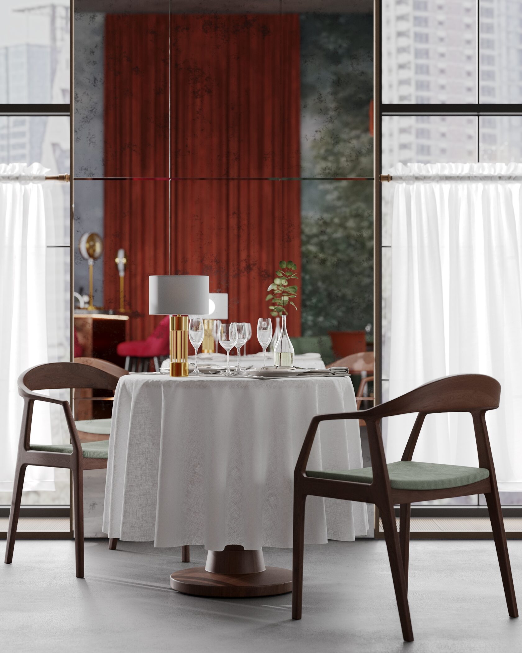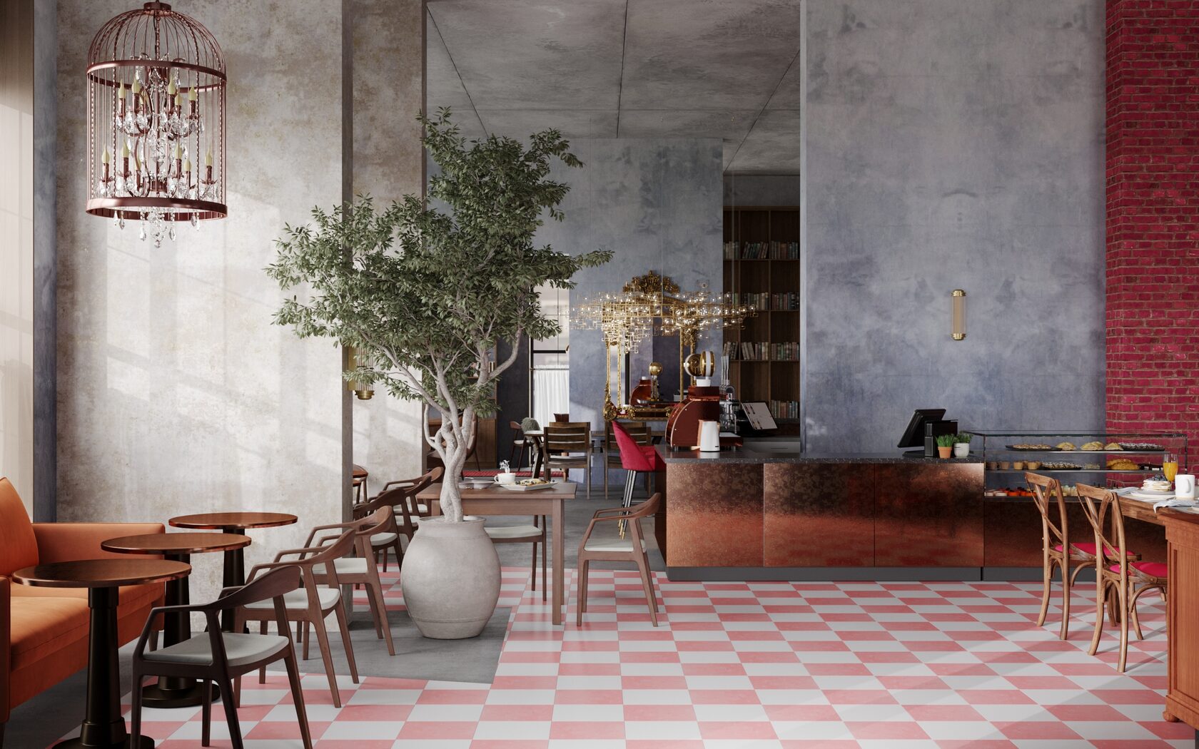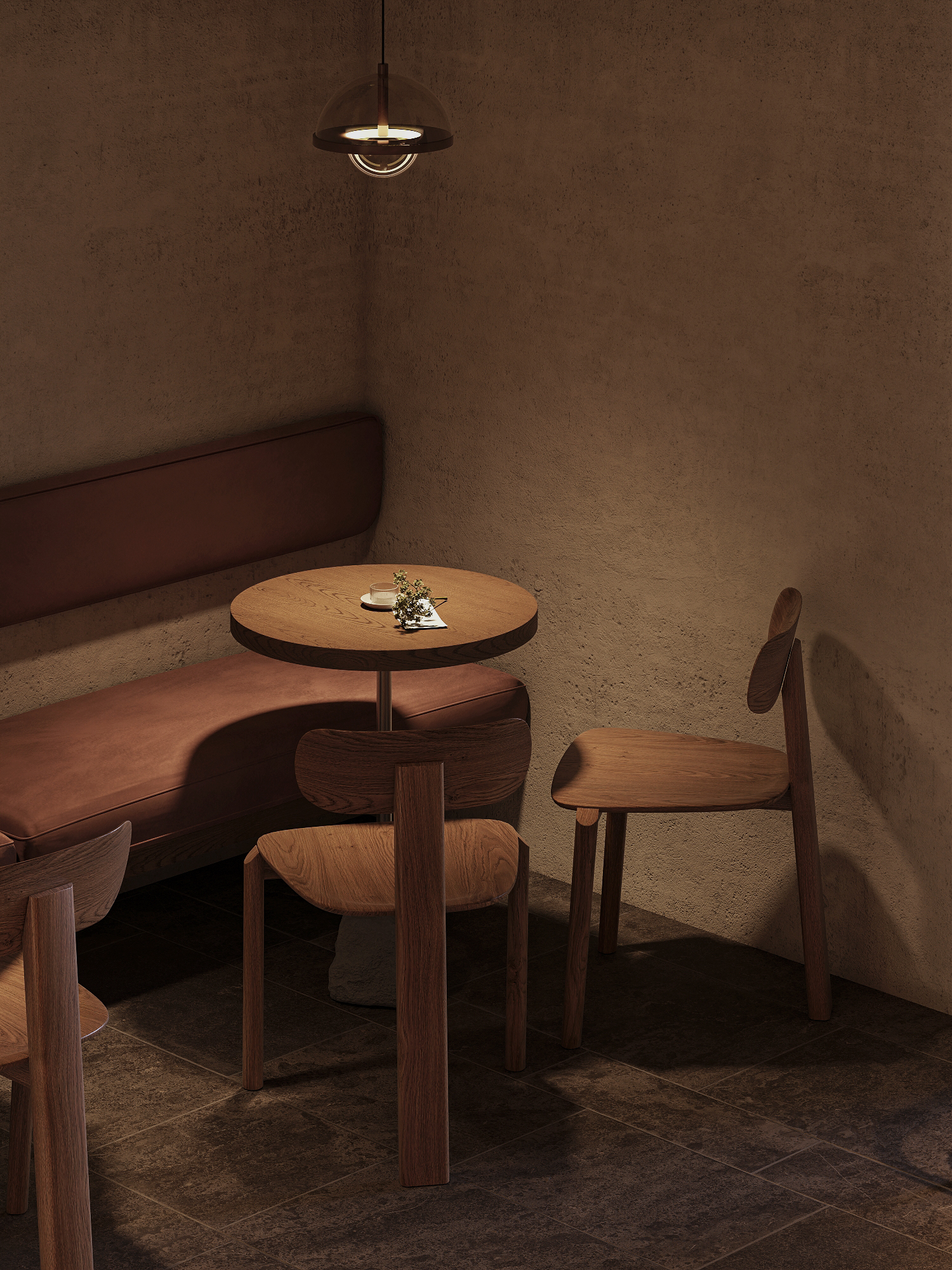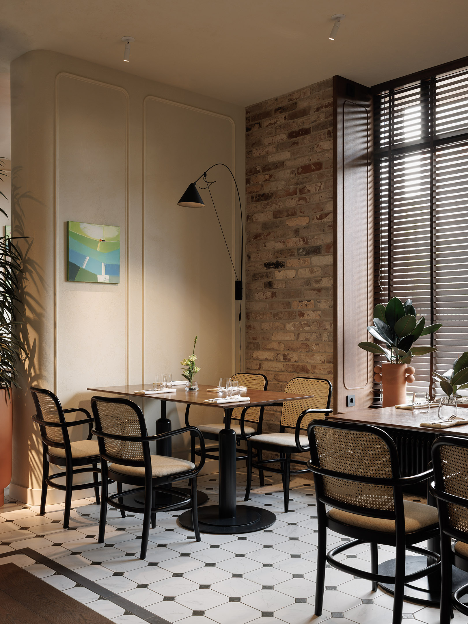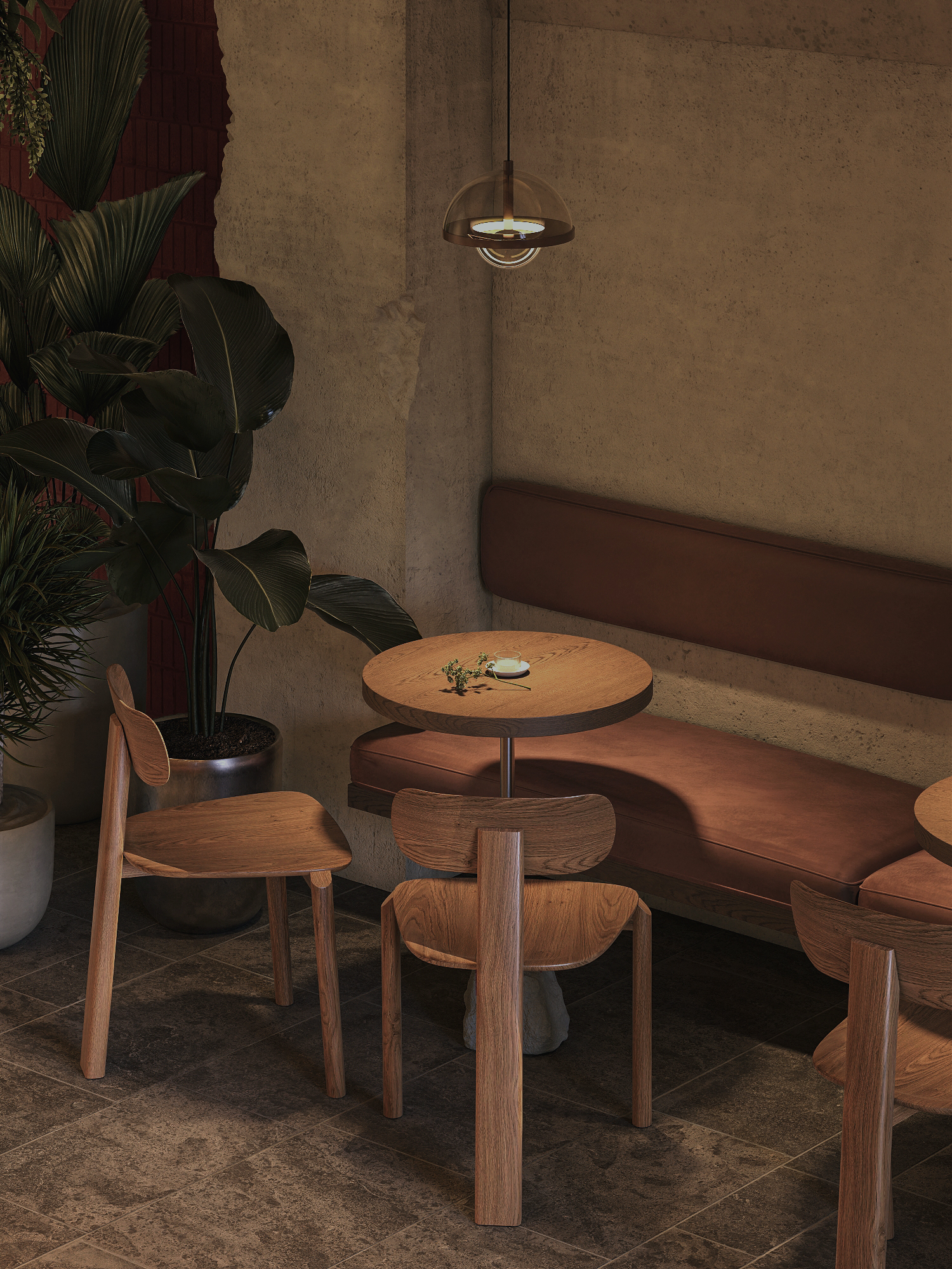 Ресторан расположен в жилом комплексе и ориентирован на местных жителей, преимущественно семейные пары старше 35 лет. Пространство продумано как место для завтрака, обеда, ужина, встреч с друзьями и детьми, а также для работы и творчества. Дизайн сочетает брутальные бетонные и кирпичные поверхности с уютными велюровыми фактурами, создавая баланс строгости и женственности. Три зала выполняют разные функции: кофе и завтрак, обед и ужин при свечах, работа и общение с соседями.