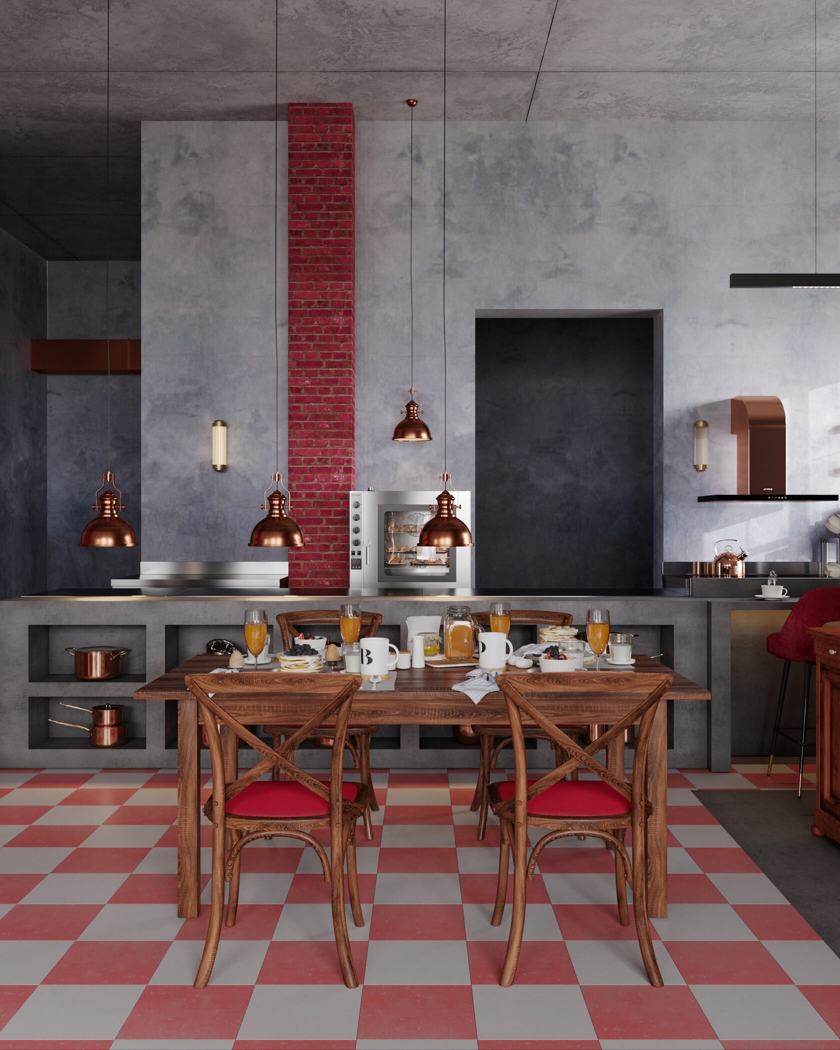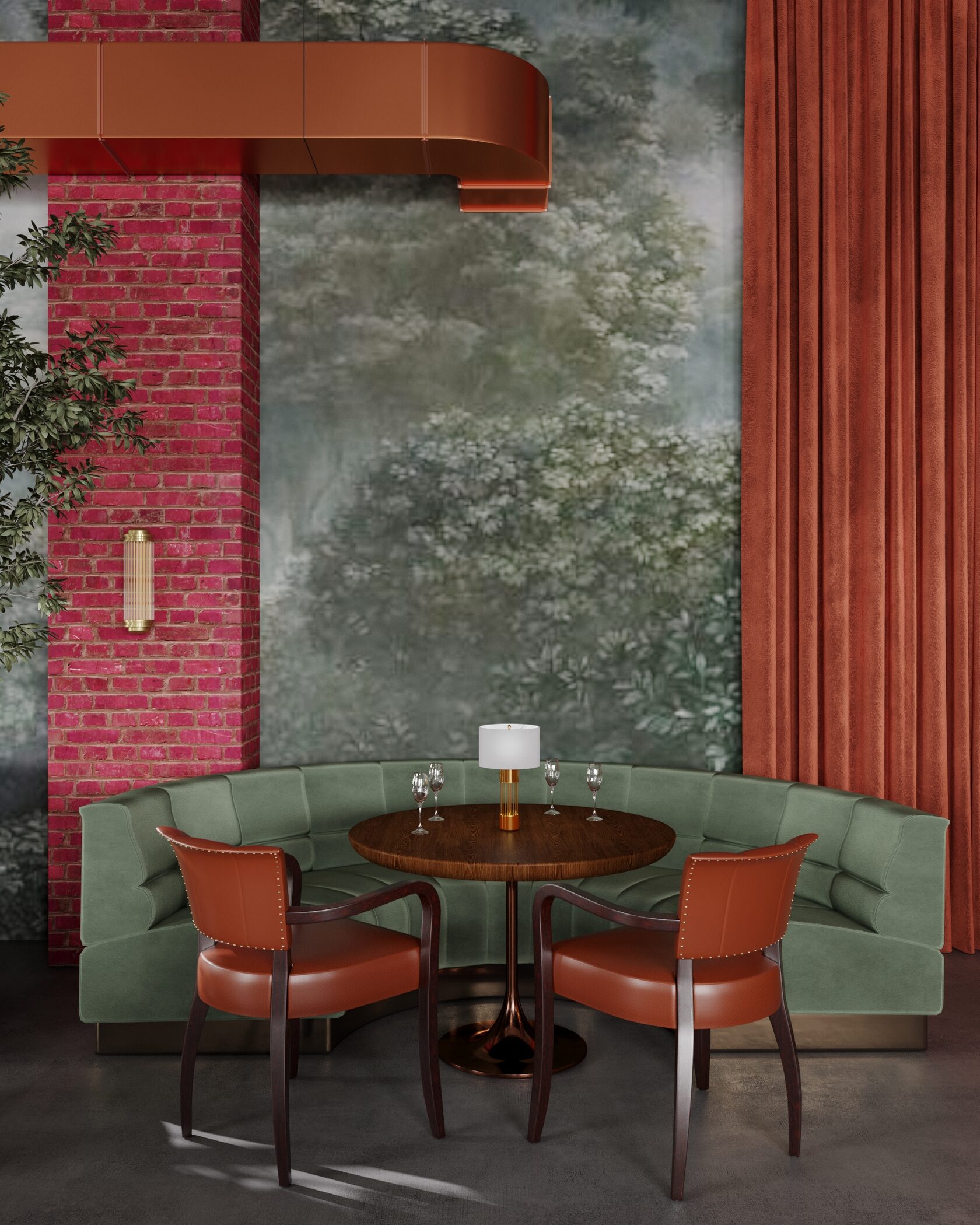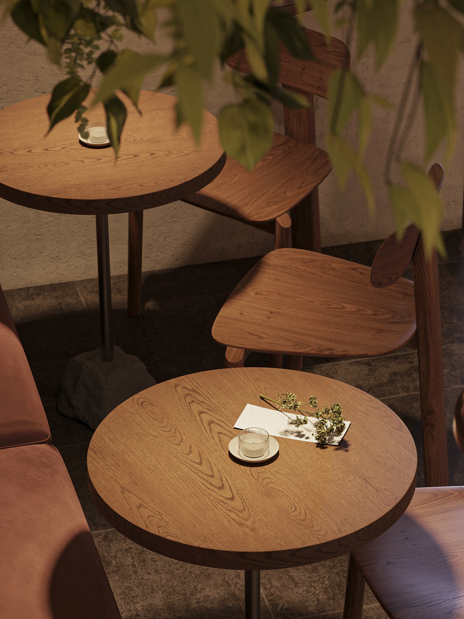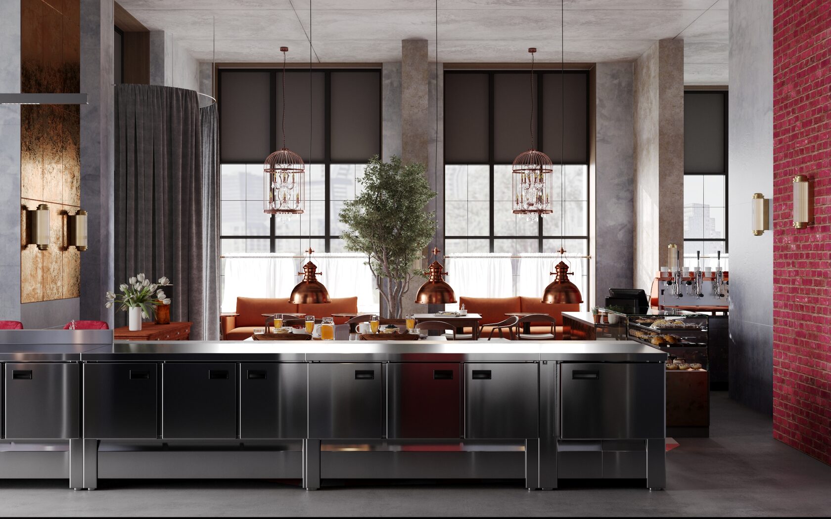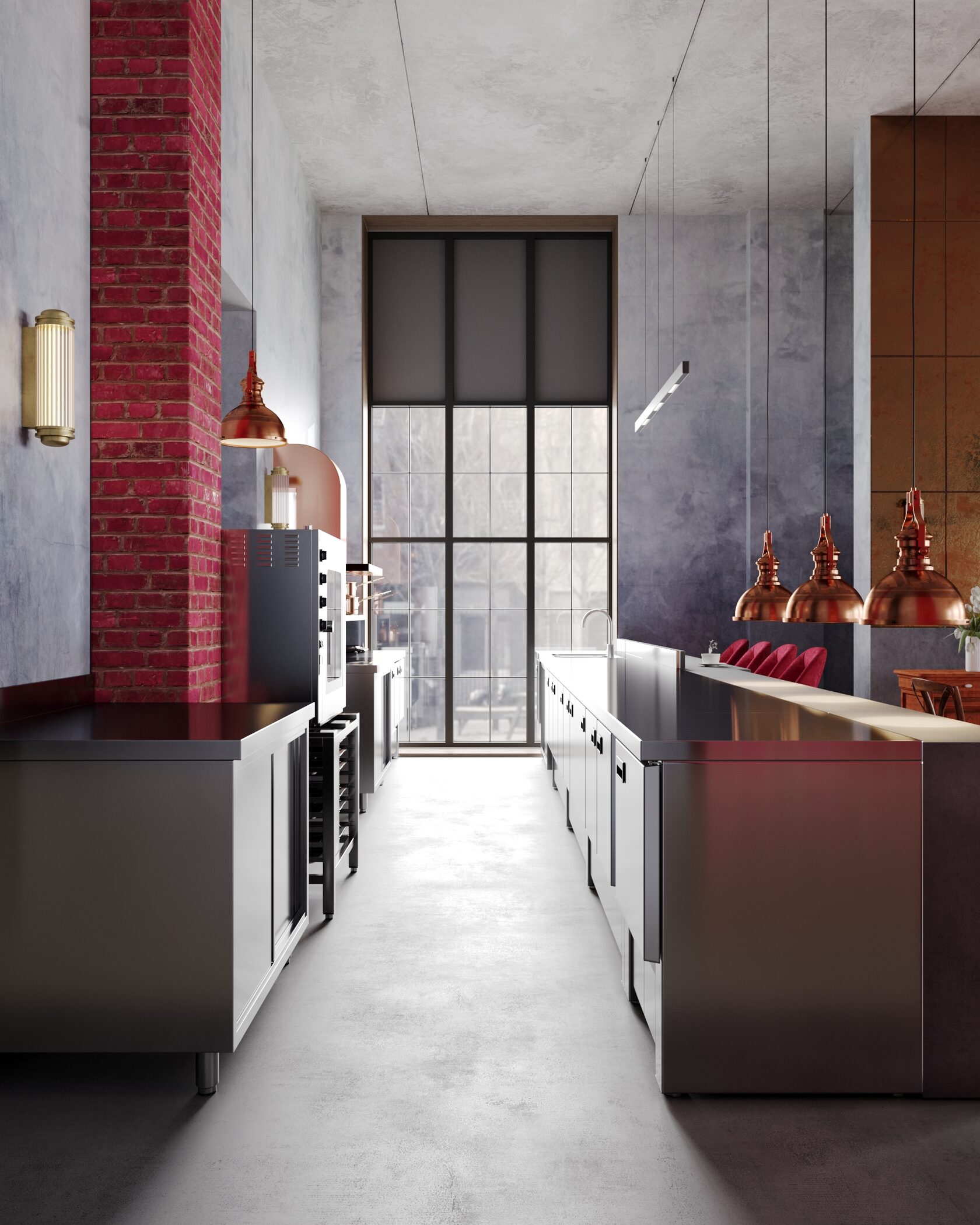 Ресторан расположен в жилом комплексе и ориентирован на местных жителей, преимущественно семейные пары старше 35 лет. Пространство продумано как место для завтрака, обеда, ужина, встреч с друзьями и детьми, а также для работы и творчества. Дизайн сочетает брутальные бетонные и кирпичные поверхности с уютными велюровыми фактурами, создавая баланс строгости и женственности. Три зала выполняют разные функции: кофе и завтрак, обед и ужин при свечах, работа и общение с соседями.