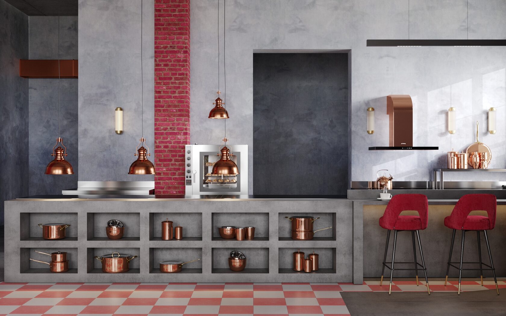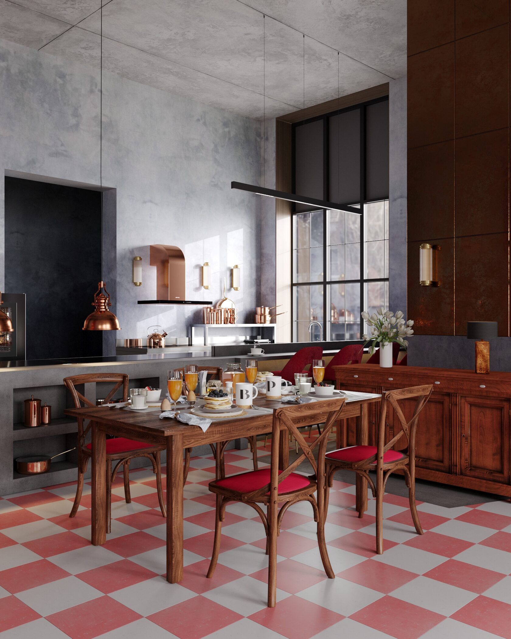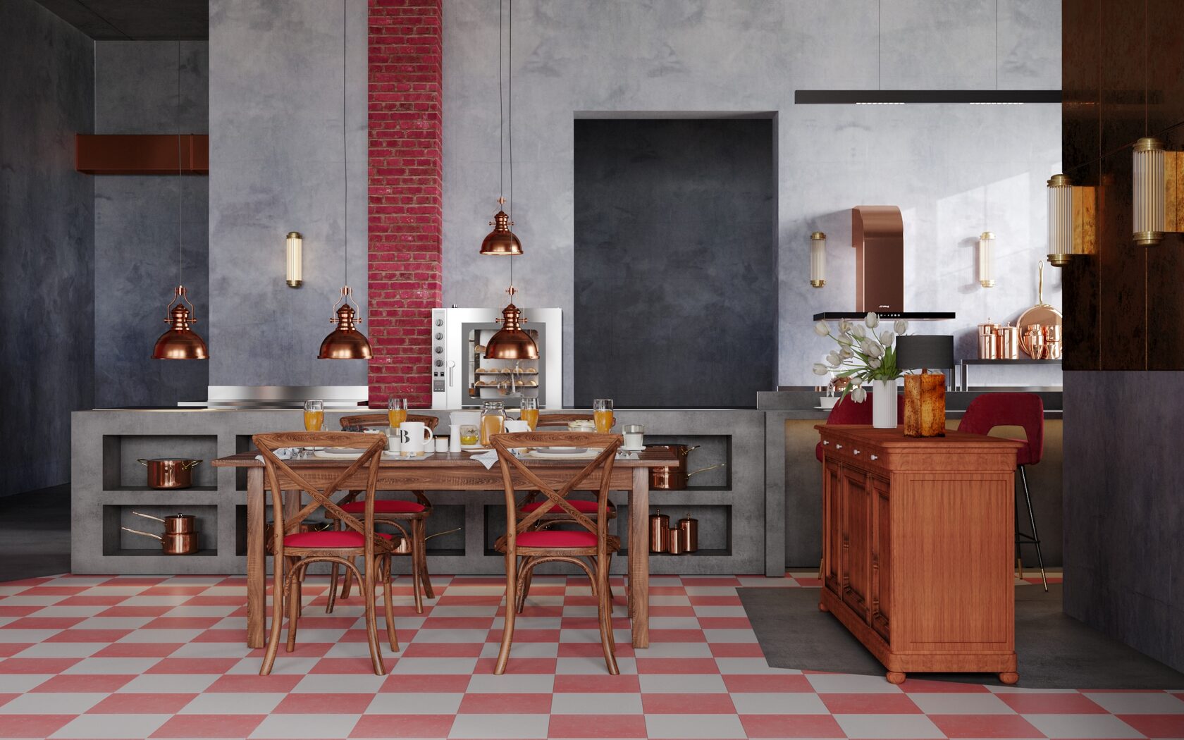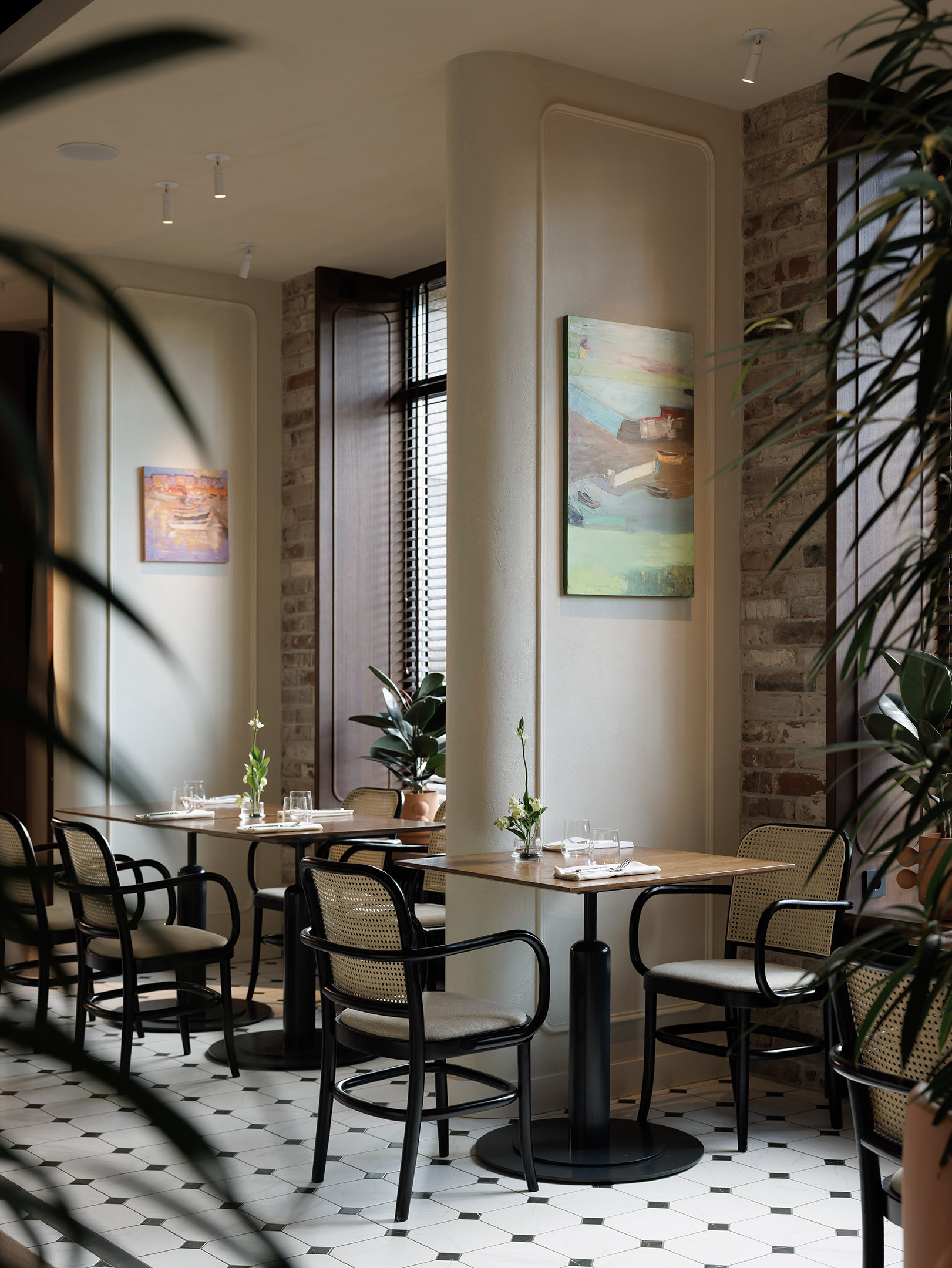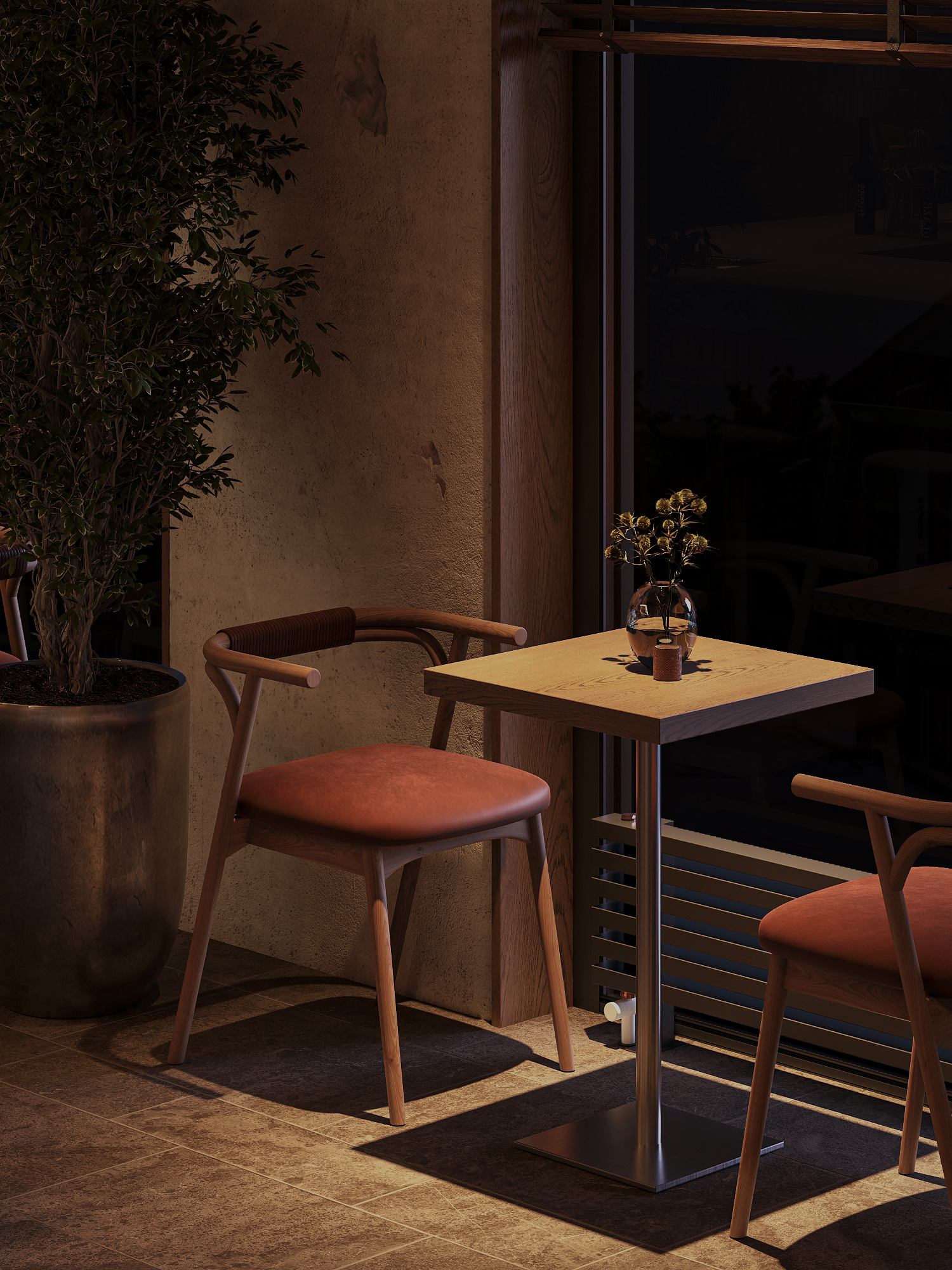 Ресторан расположен в жилом комплексе и ориентирован на местных жителей, преимущественно семейные пары старше 35 лет. Пространство продумано как место для завтрака, обеда, ужина, встреч с друзьями и детьми, а также для работы и творчества. Дизайн сочетает брутальные бетонные и кирпичные поверхности с уютными велюровыми фактурами, создавая баланс строгости и женственности. Три зала выполняют разные функции: кофе и завтрак, обед и ужин при свечах, работа и общение с соседями.