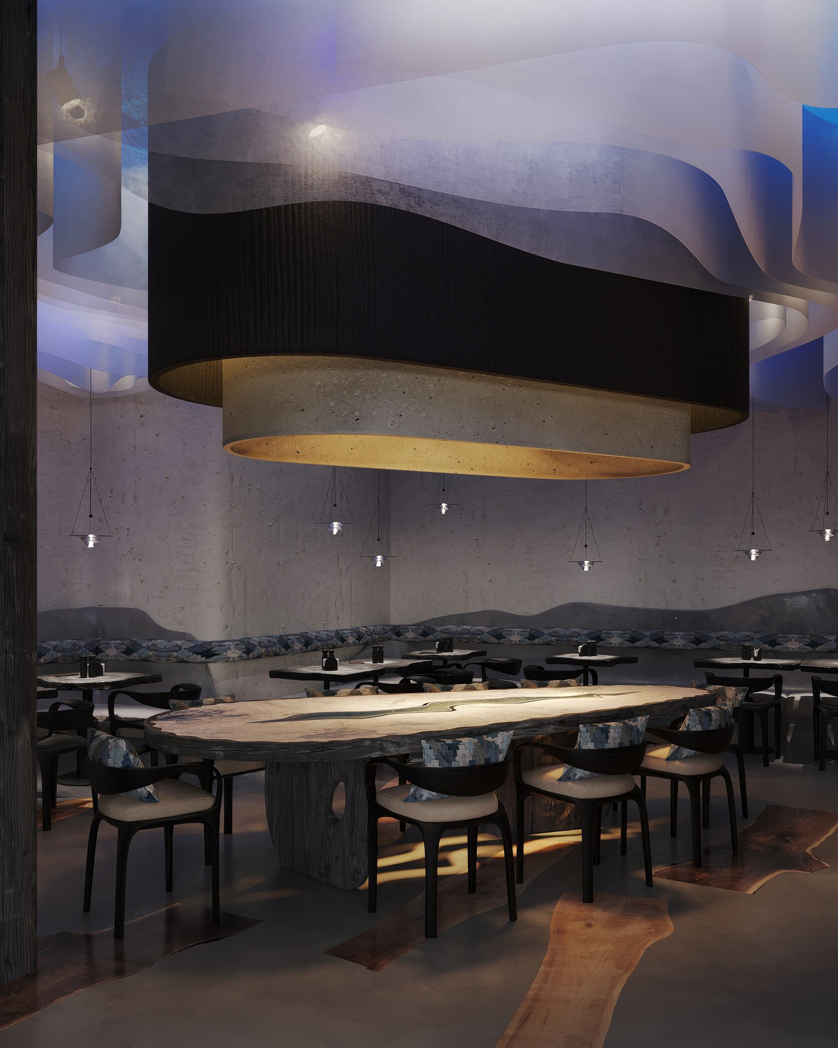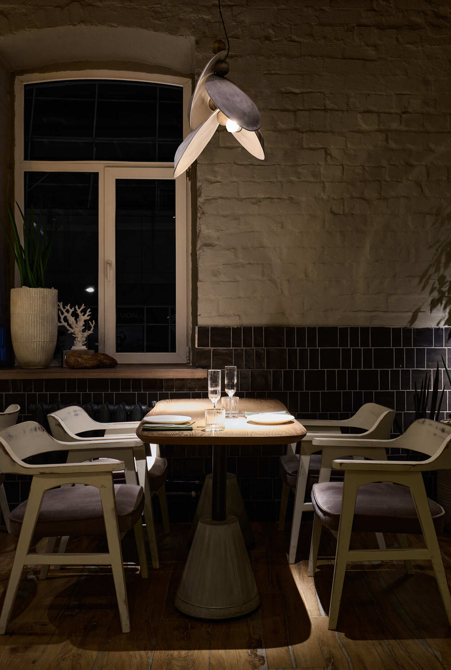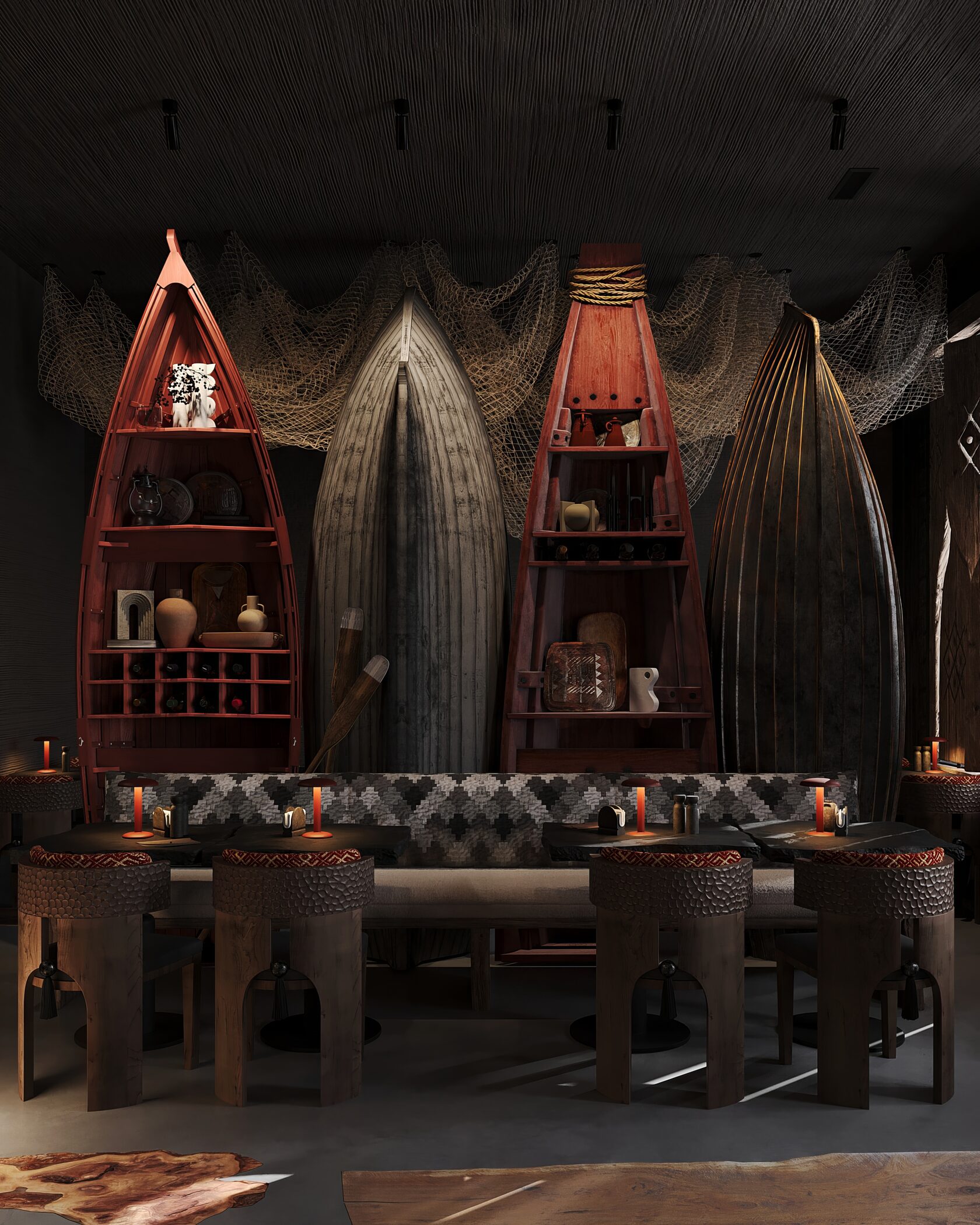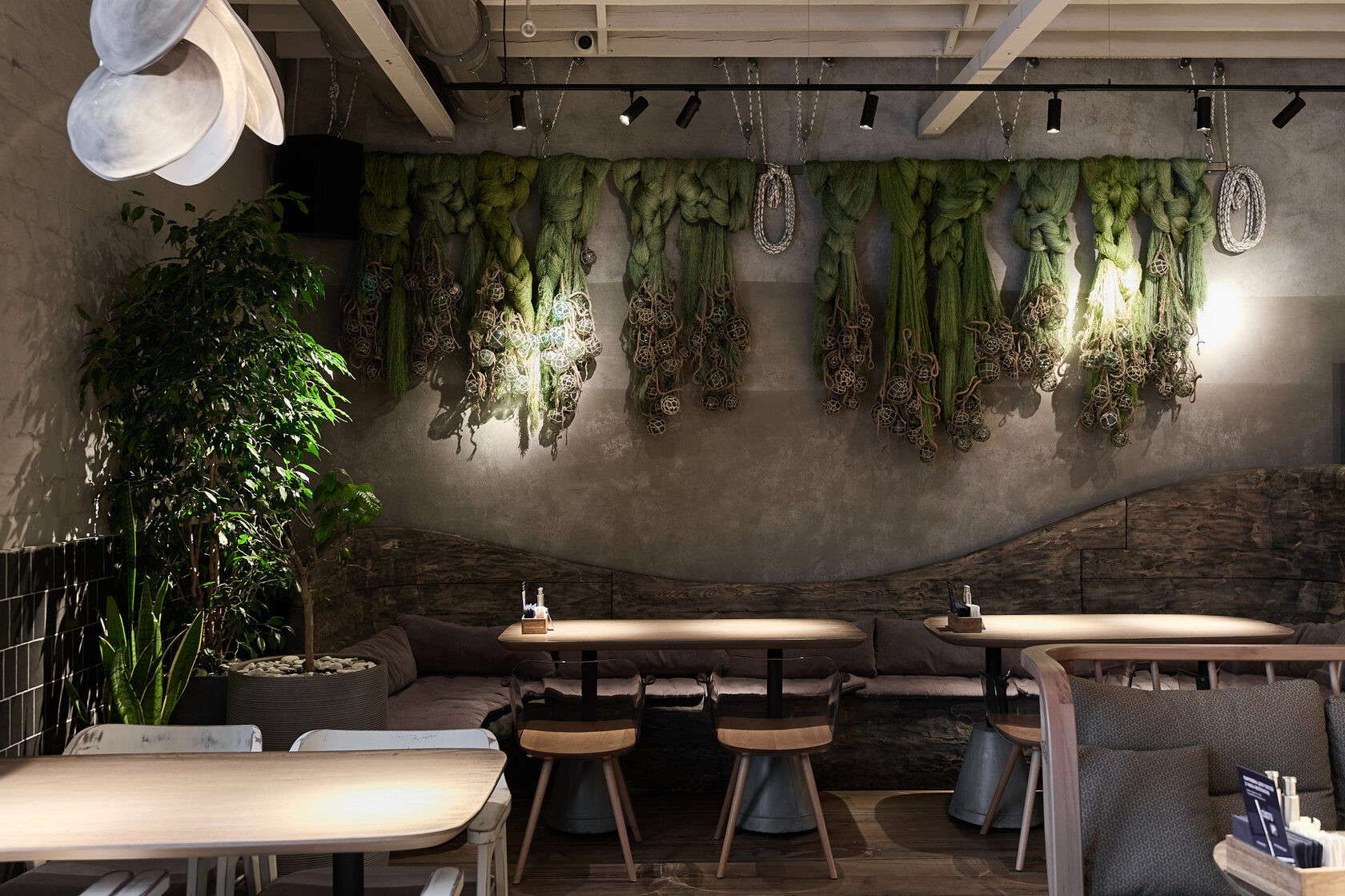 Концепция: Основная идея проекта — полное погружение в морскую эстетику, где «главный скульптор — это море». Интерьер вдохновлен образами рыбацких поселений и портовых рынков, избегая пафоса в пользу искренности. Детализация продумана до мелочей: абажуры имитируют рыболовные ловушки, светильники напоминают раковины мидий, а декор выполнен из винтажных стеклянных поплавков начала XX века. Формы диванов и барной стойки органичны, словно обработаны морскими волнами, создавая ощущение природной гармонии и уюта.