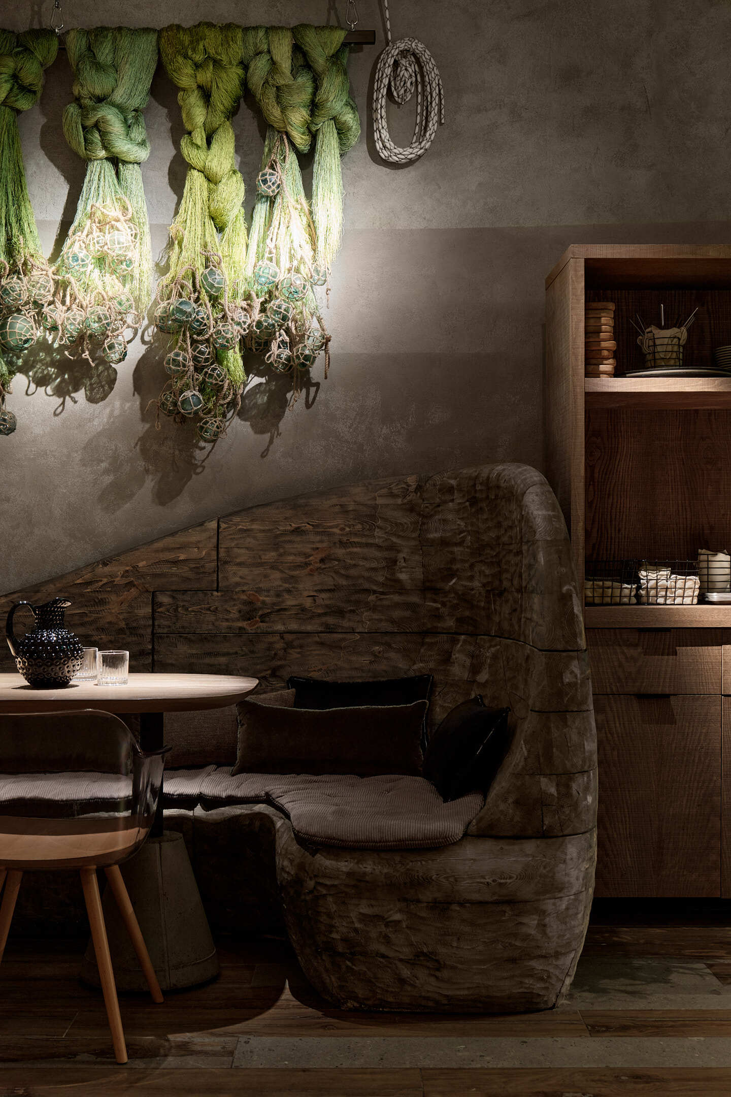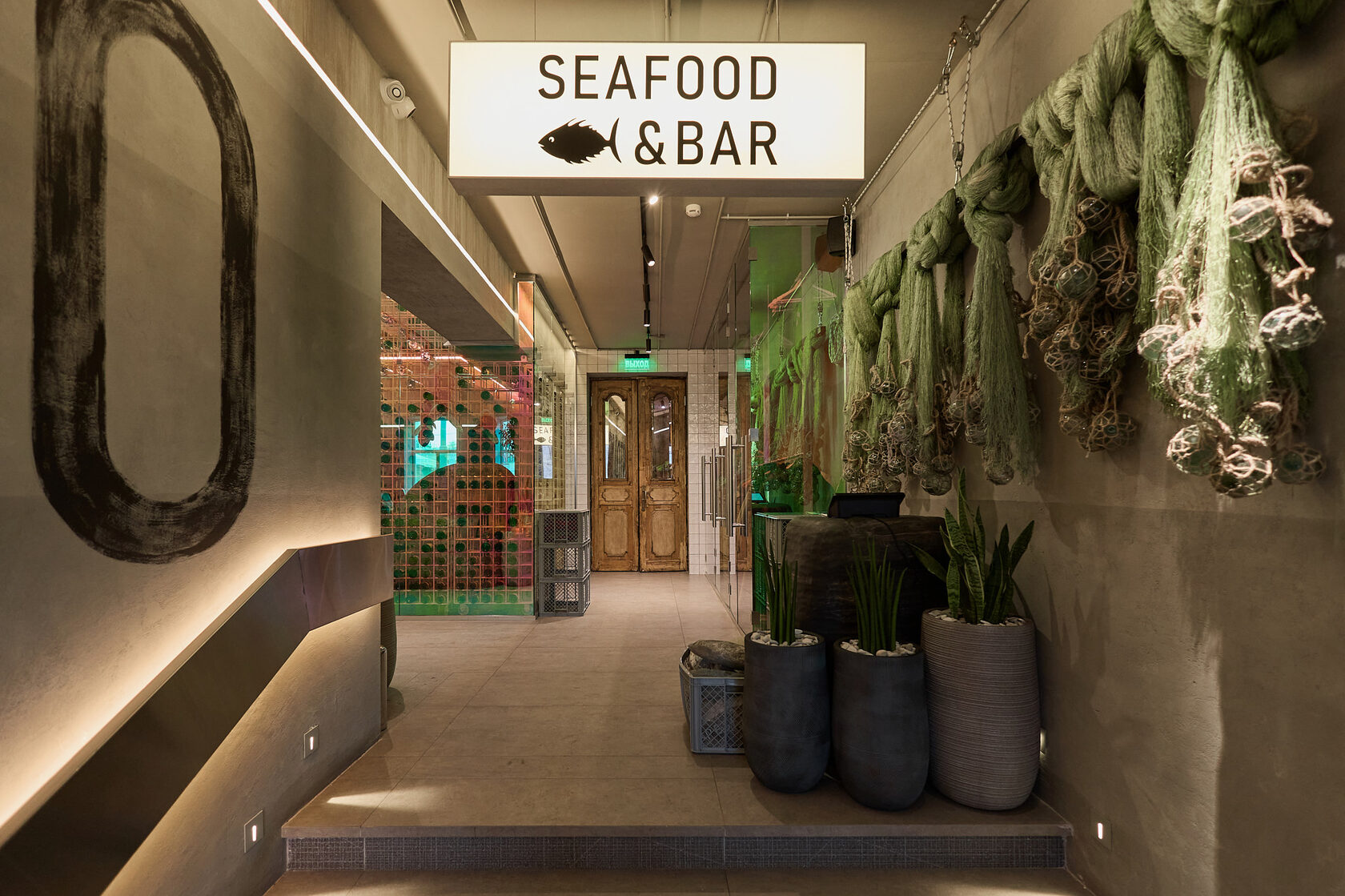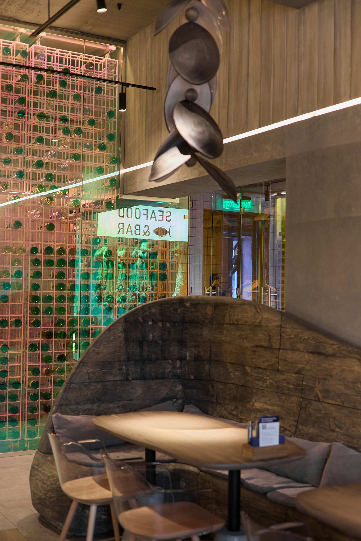 Концепция: Основная идея проекта — полное погружение в морскую эстетику, где «главный скульптор — это море». Интерьер вдохновлен образами рыбацких поселений и портовых рынков, избегая пафоса в пользу искренности. Детализация продумана до мелочей: абажуры имитируют рыболовные ловушки, светильники напоминают раковины мидий, а декор выполнен из винтажных стеклянных поплавков начала XX века. Формы диванов и барной стойки органичны, словно обработаны морскими волнами, создавая ощущение природной гармонии и уюта.