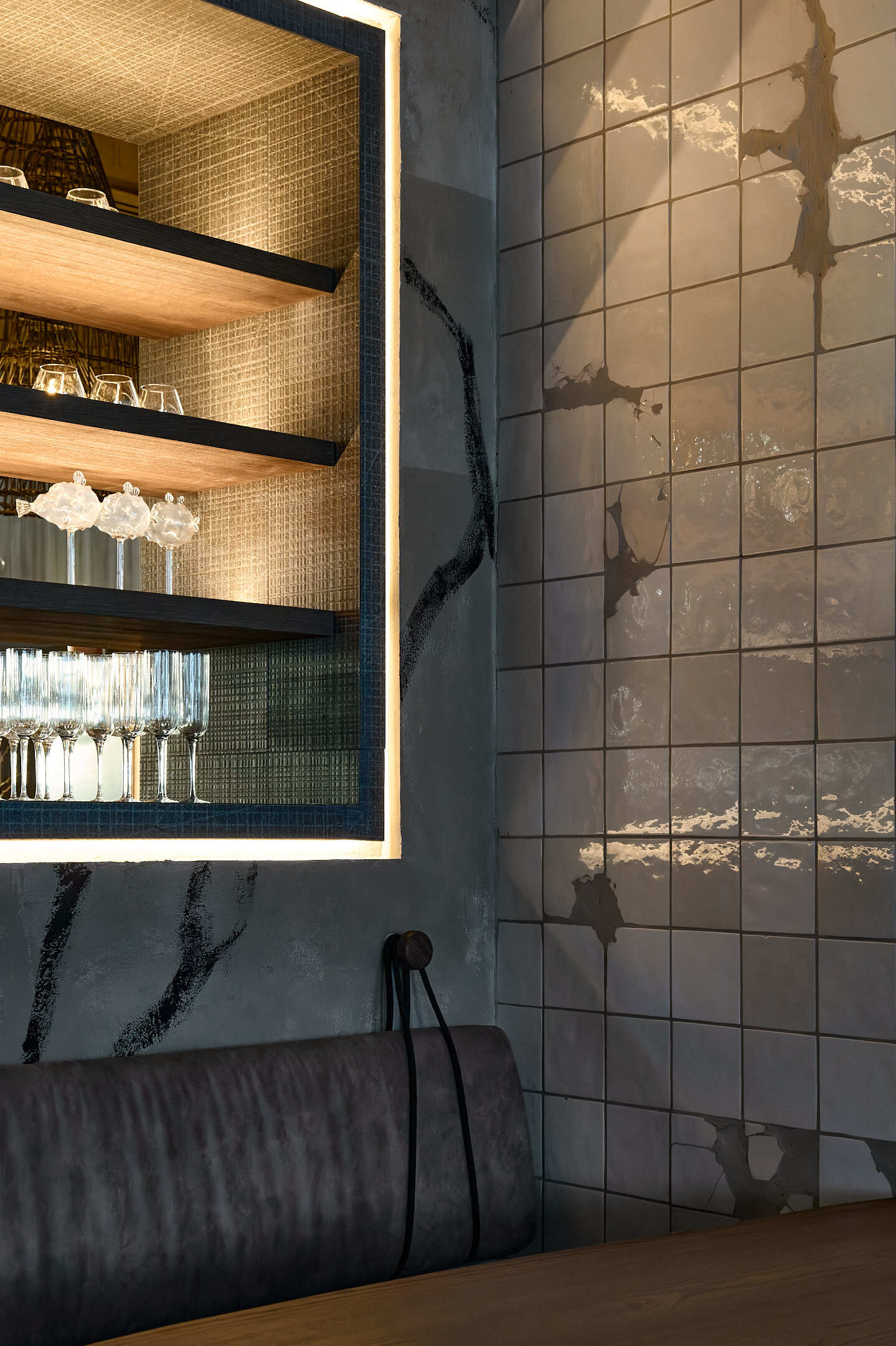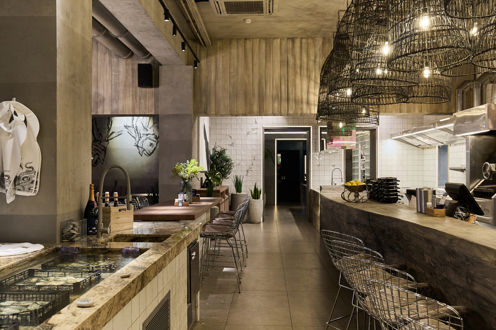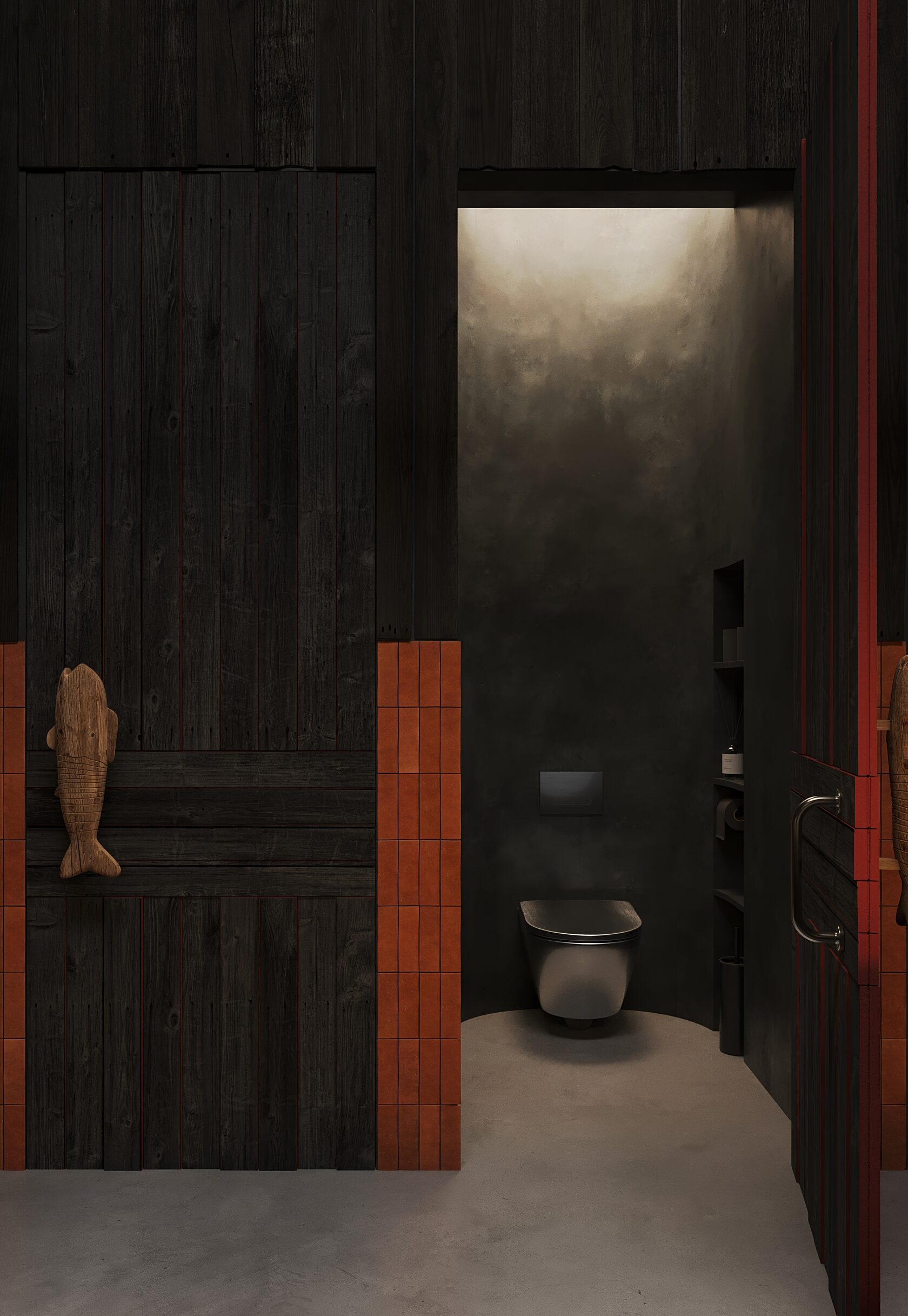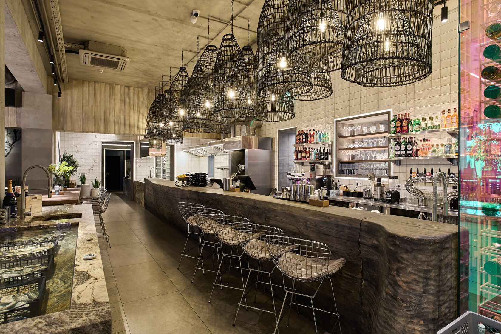Концепция: Основная идея проекта — полное погружение в морскую эстетику, где «главный скульптор — это море». Интерьер вдохновлен образами рыбацких поселений и портовых рынков, избегая пафоса в пользу искренности. Детализация продумана до мелочей: абажуры имитируют рыболовные ловушки, светильники напоминают раковины мидий, а декор выполнен из винтажных стеклянных поплавков начала XX века. Формы диванов и барной стойки органичны, словно обработаны морскими волнами, создавая ощущение природной гармонии и уюта.