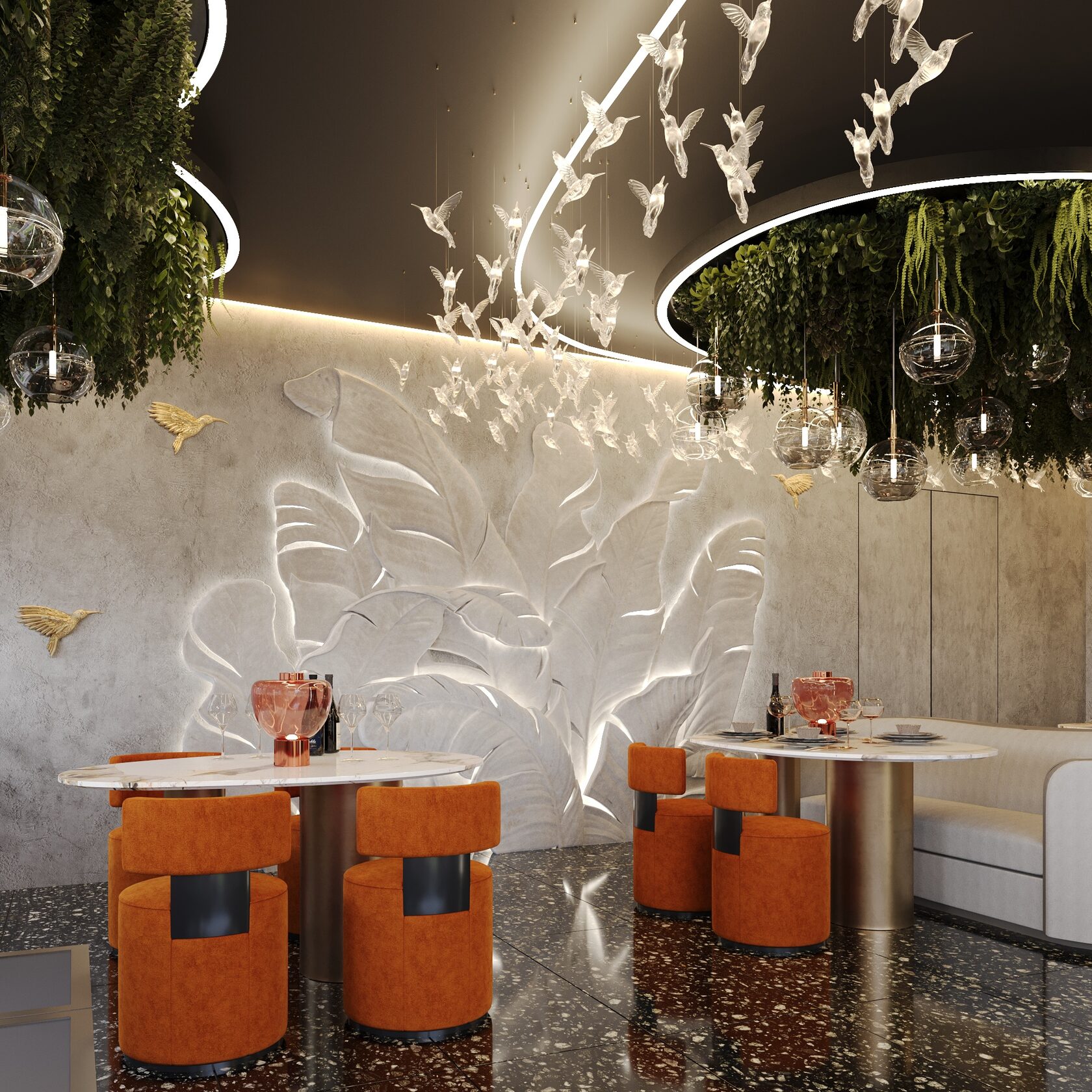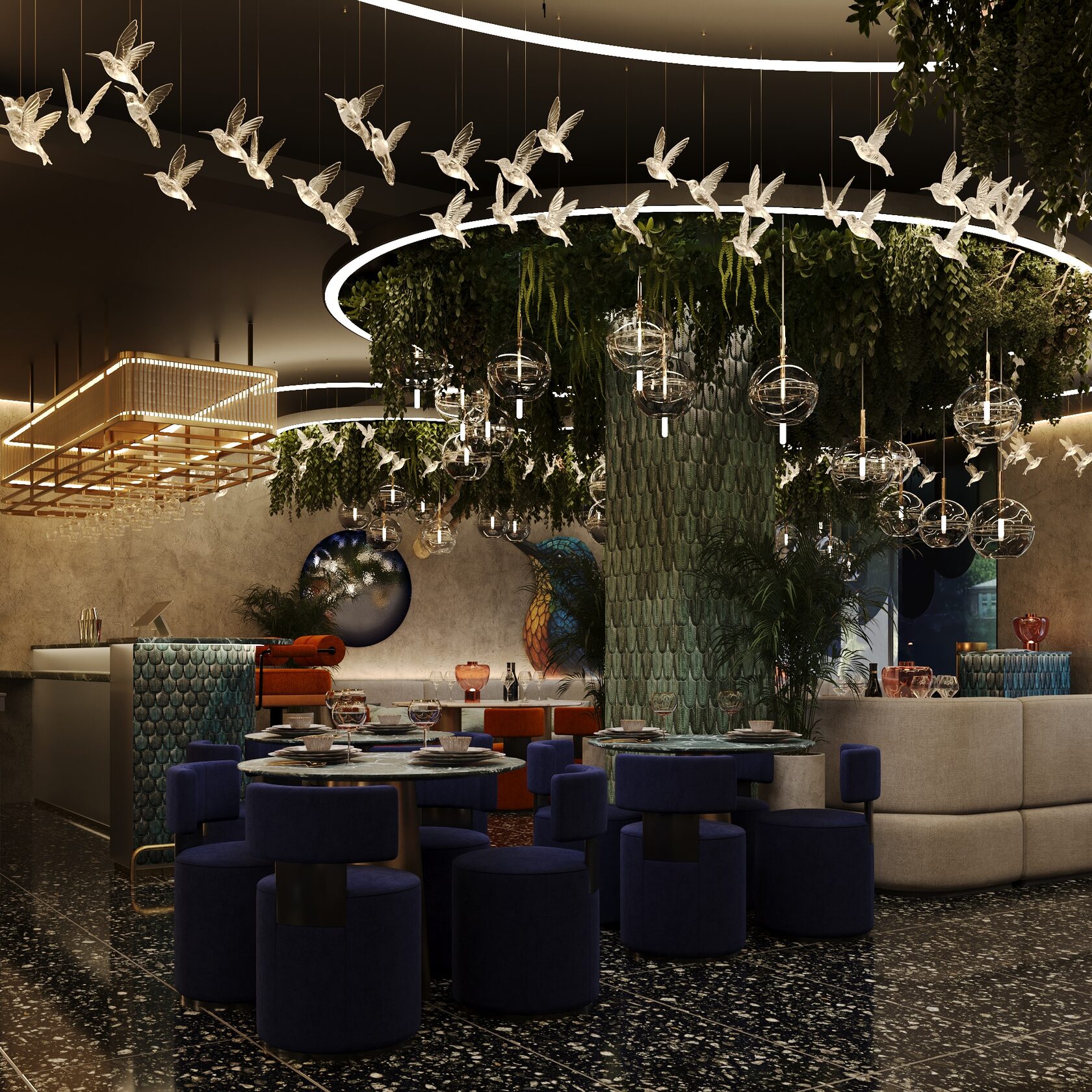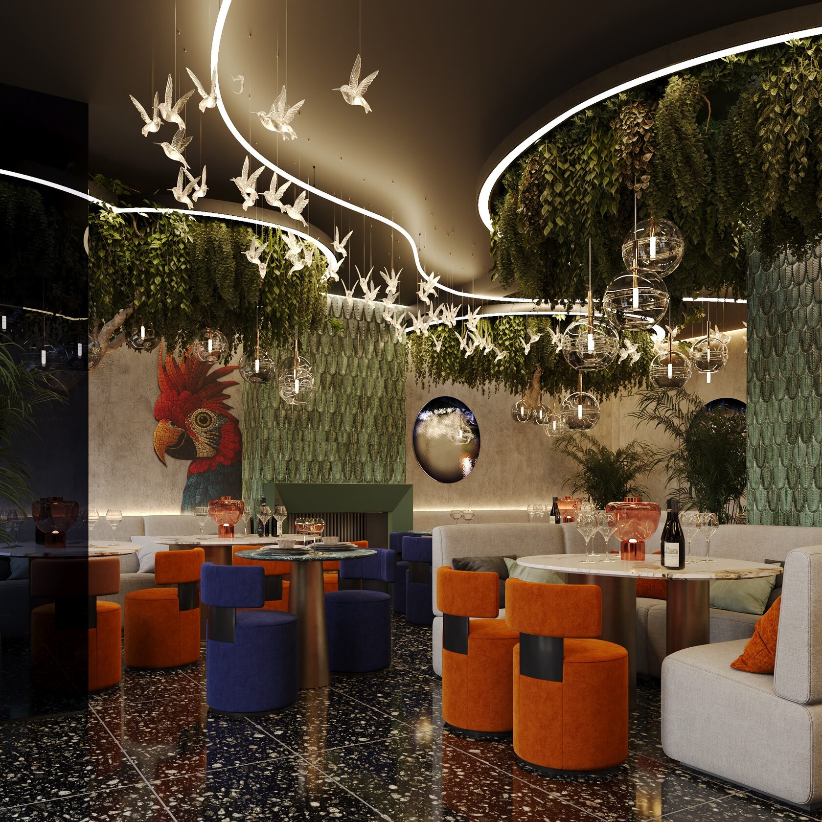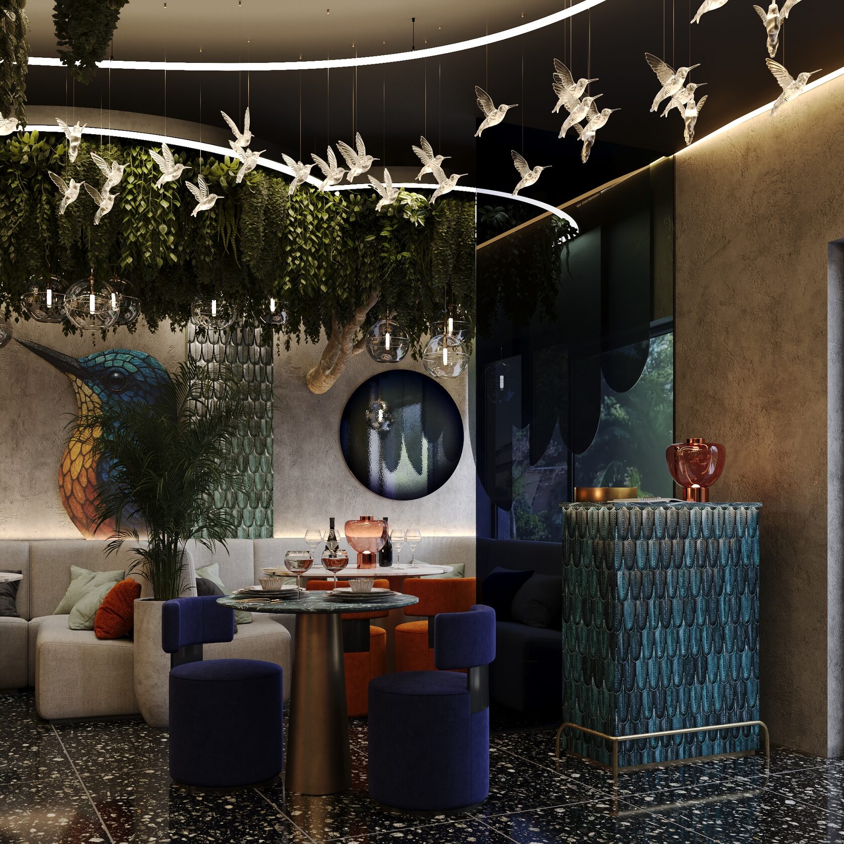 Концепция: В основу дизайн-концепции легли яркие мотивы экзотических птиц, что позволило привнести в интерьер выразительность и динамику. При этом, проектирование строго соответствовало установленным нормам и стандартам для заведений премиум-класса, обеспечивая гармоничное сочетание смелого эстетического решения и безупречной функциональности.