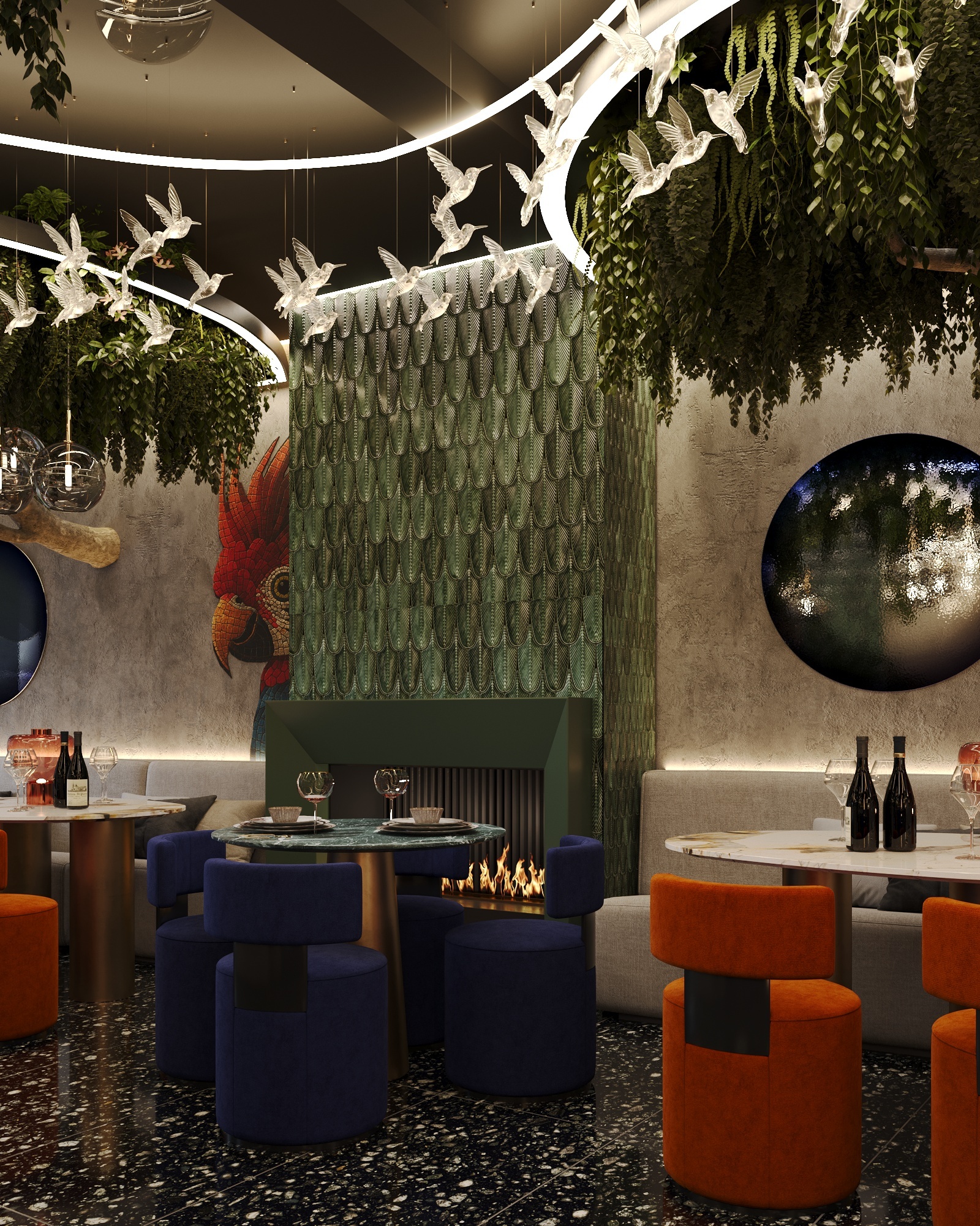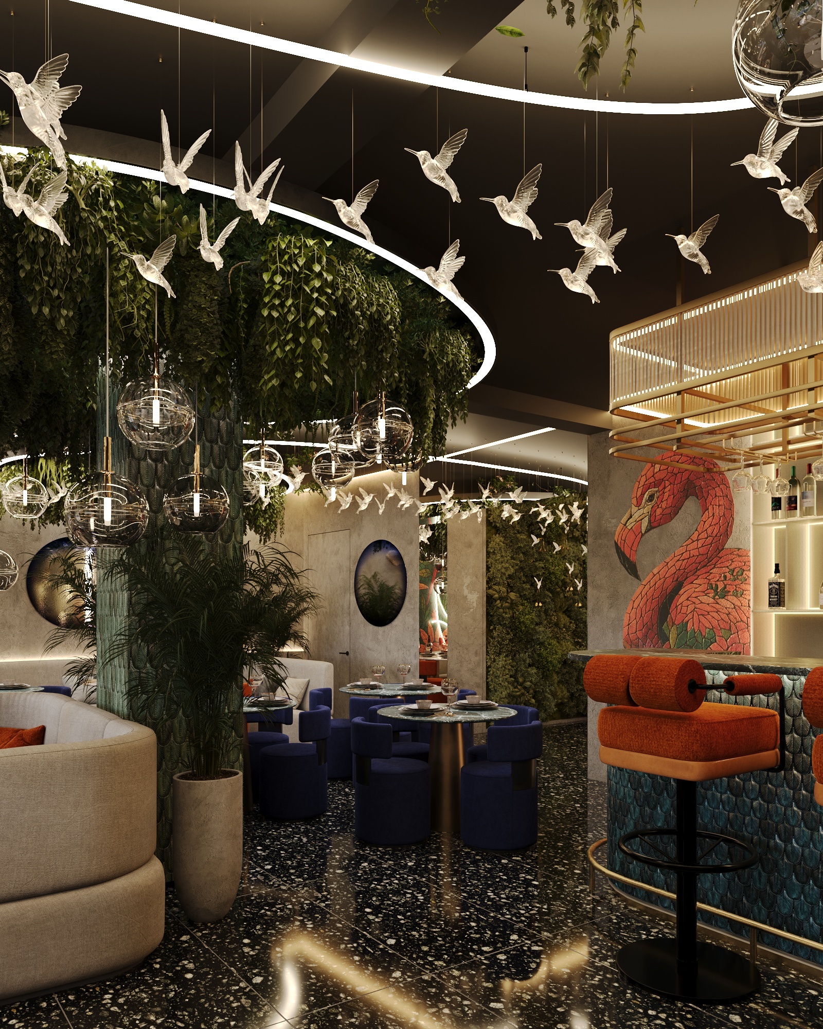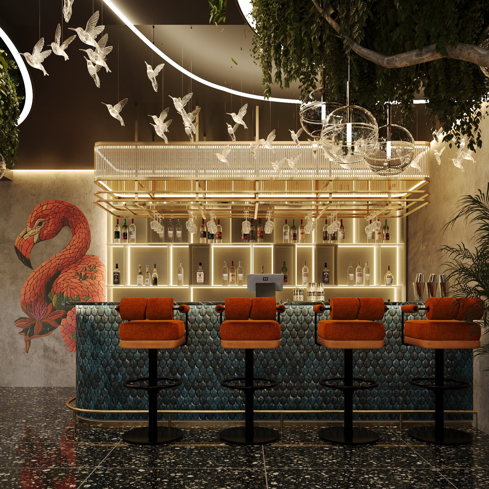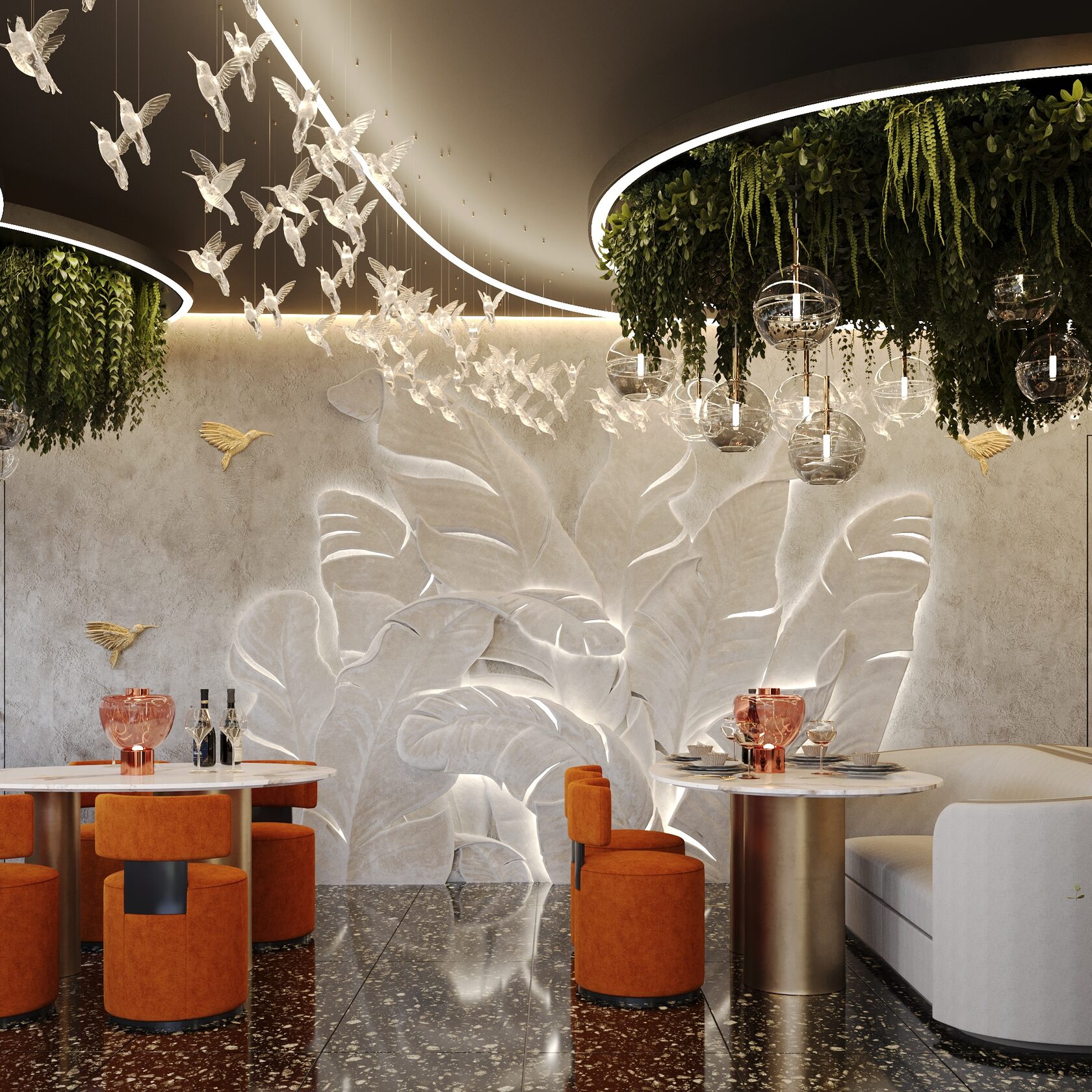 Концепция: В основу дизайн-концепции легли яркие мотивы экзотических птиц, что позволило привнести в интерьер выразительность и динамику. При этом, проектирование строго соответствовало установленным нормам и стандартам для заведений премиум-класса, обеспечивая гармоничное сочетание смелого эстетического решения и безупречной функциональности.