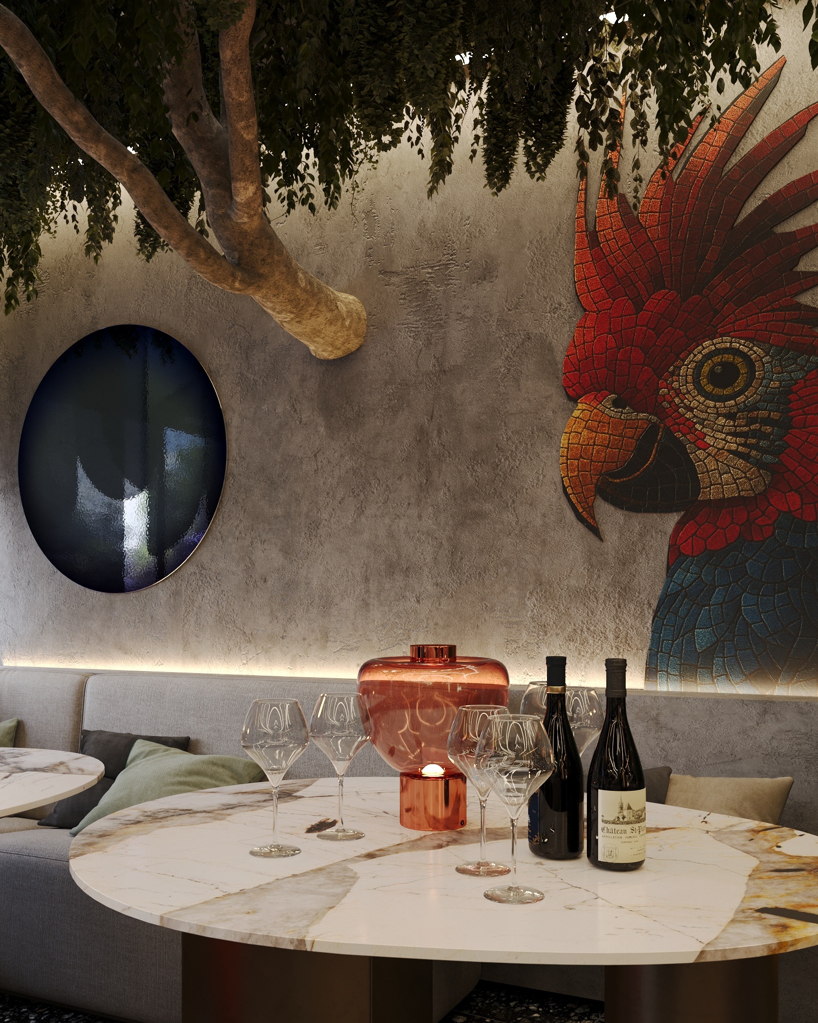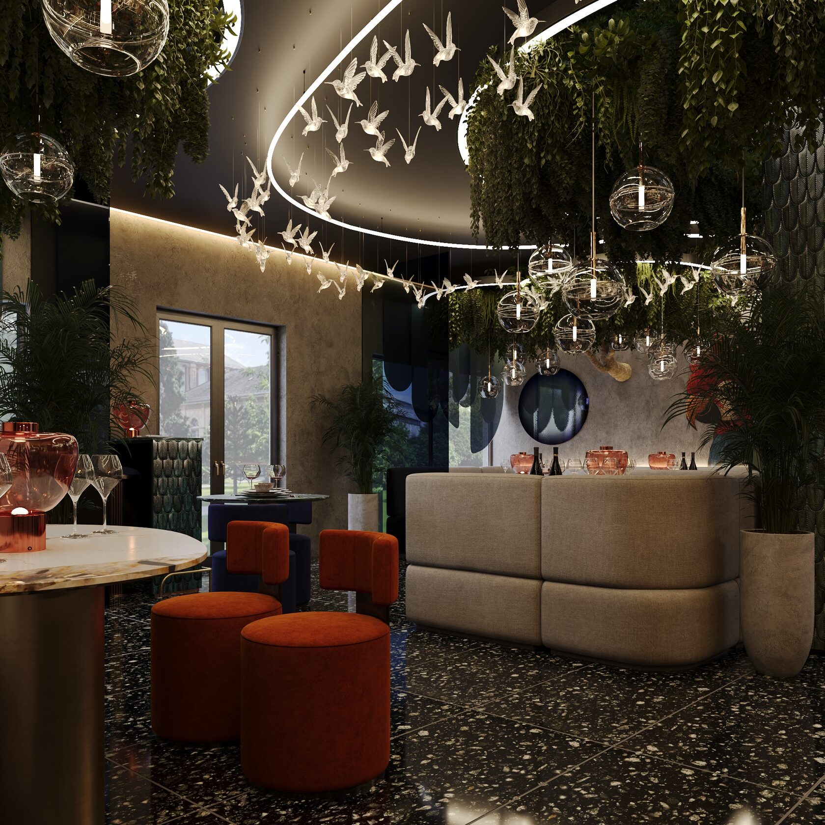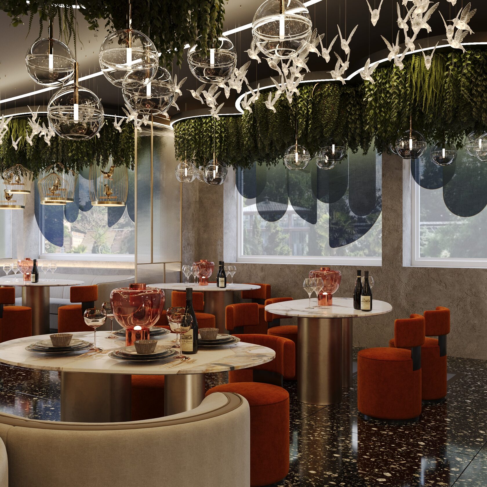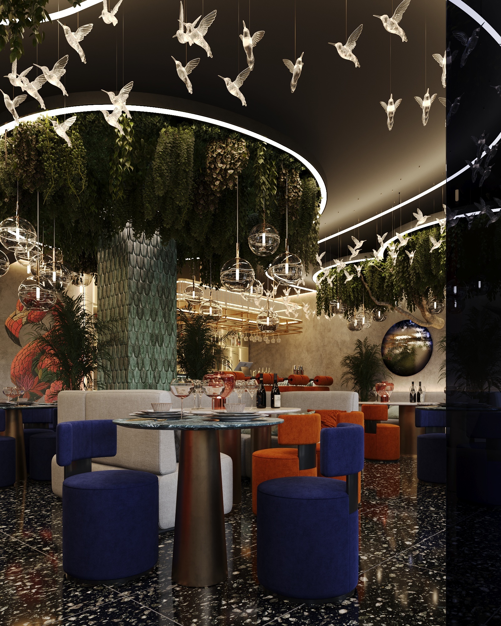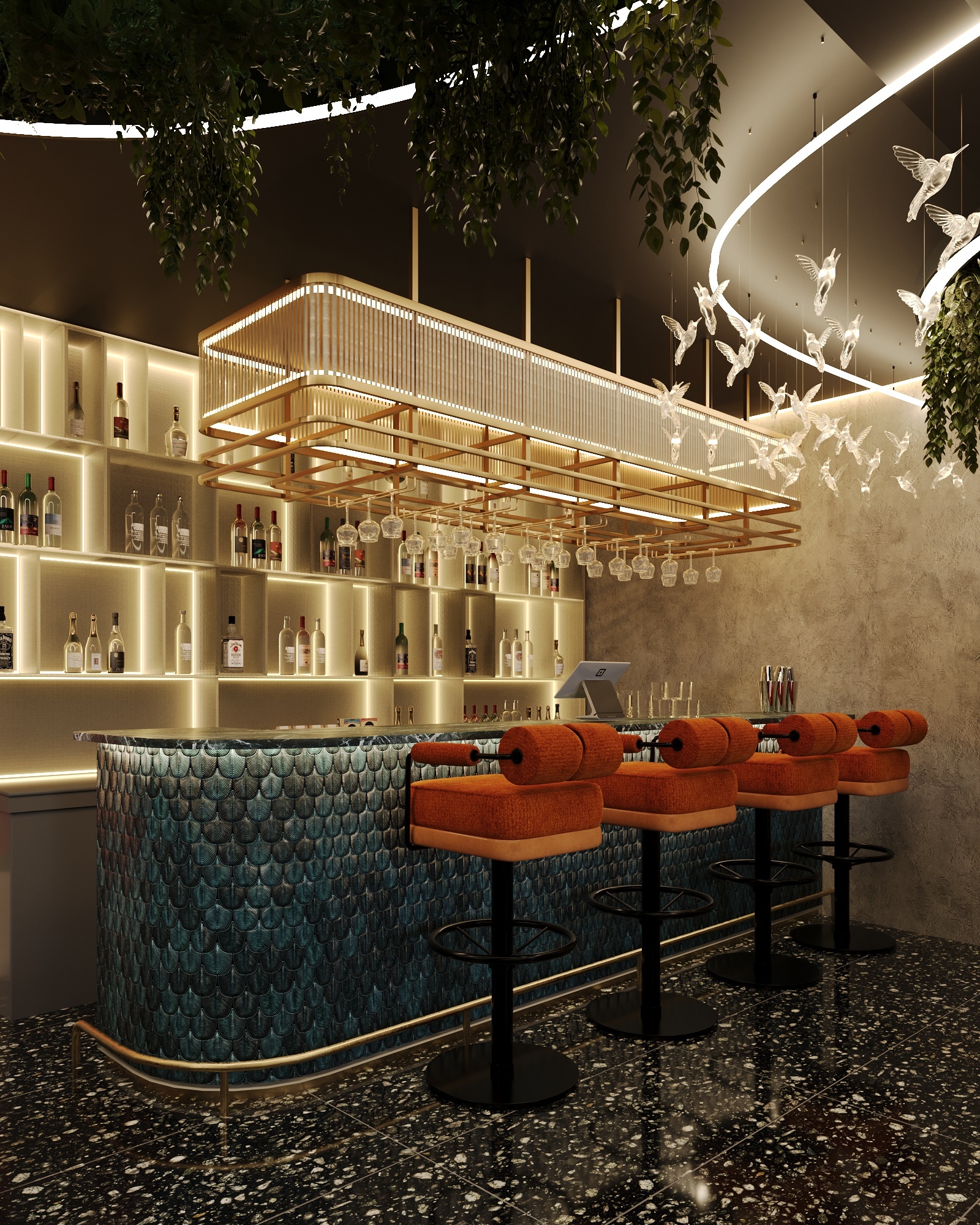 Концепция: В основу дизайн-концепции легли яркие мотивы экзотических птиц, что позволило привнести в интерьер выразительность и динамику. При этом, проектирование строго соответствовало установленным нормам и стандартам для заведений премиум-класса, обеспечивая гармоничное сочетание смелого эстетического решения и безупречной функциональности.