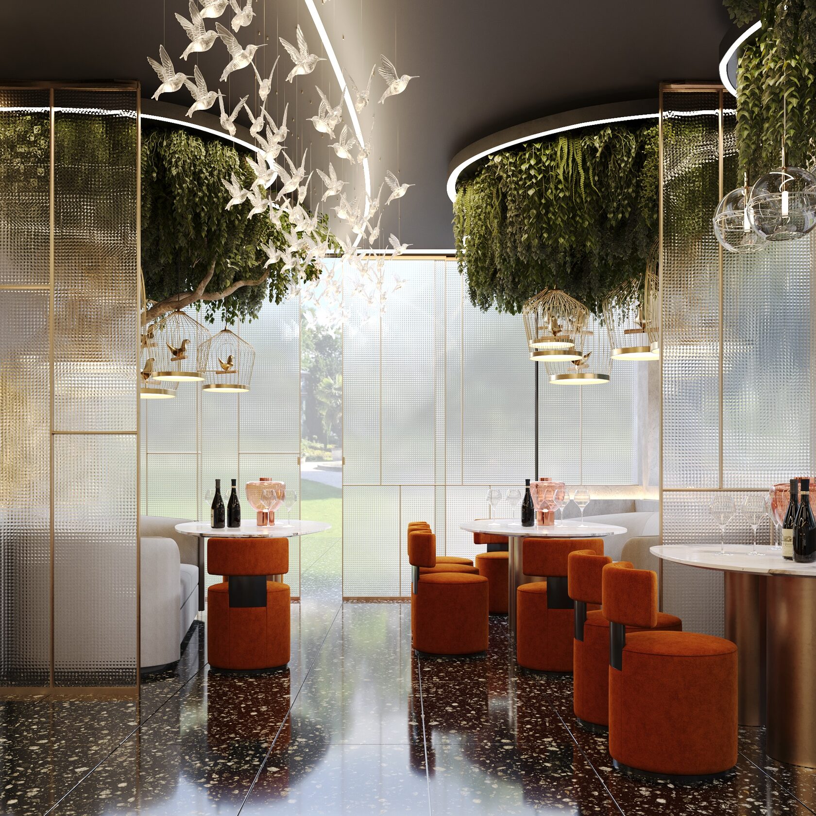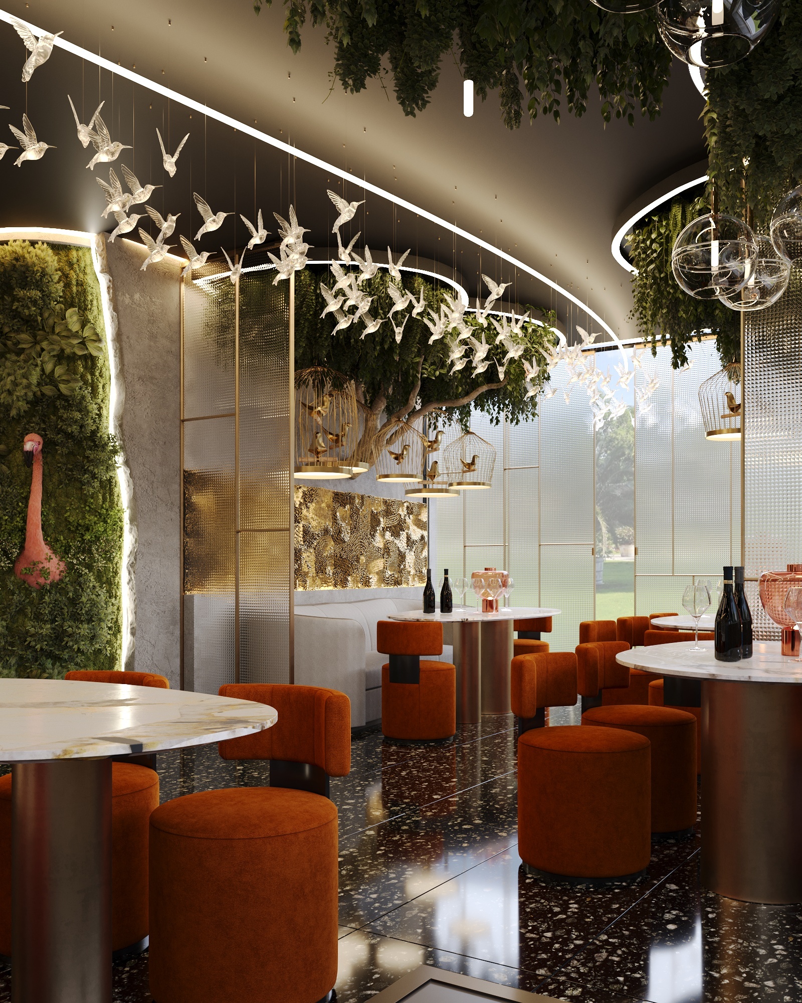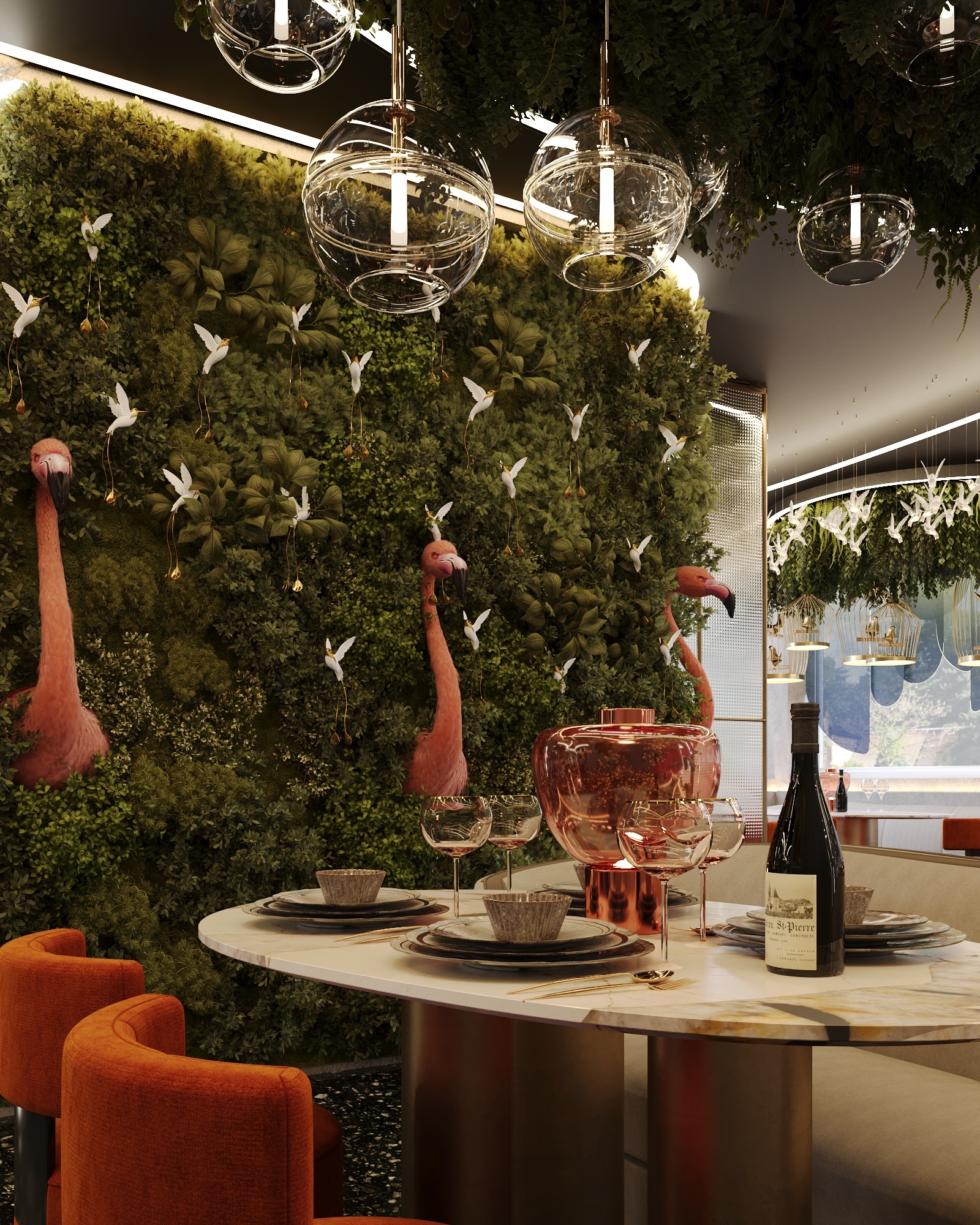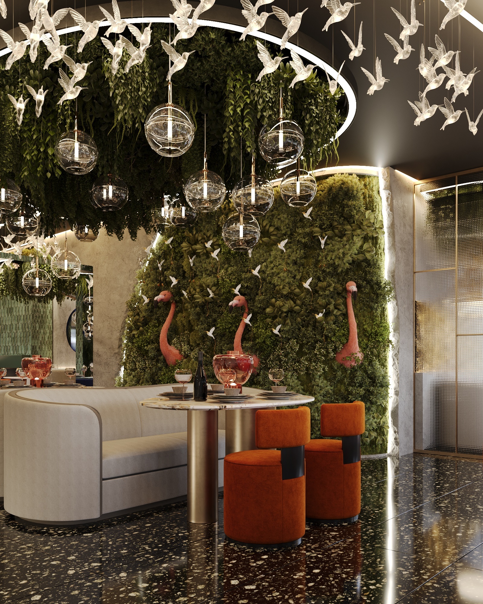Концепция: В основу дизайн-концепции легли яркие мотивы экзотических птиц, что позволило привнести в интерьер выразительность и динамику. При этом, проектирование строго соответствовало установленным нормам и стандартам для заведений премиум-класса, обеспечивая гармоничное сочетание смелого эстетического решения и безупречной функциональности.