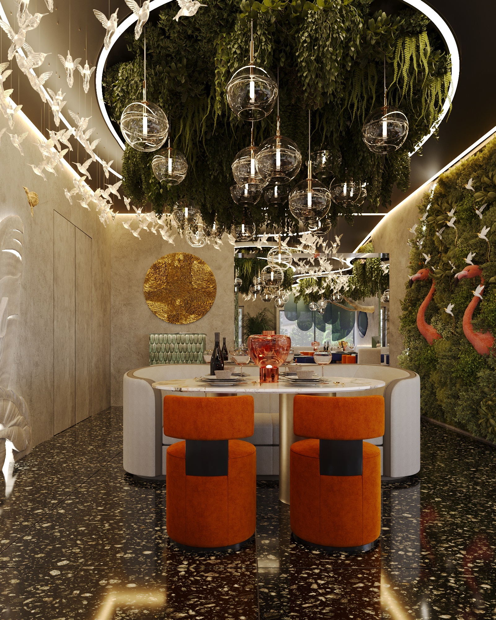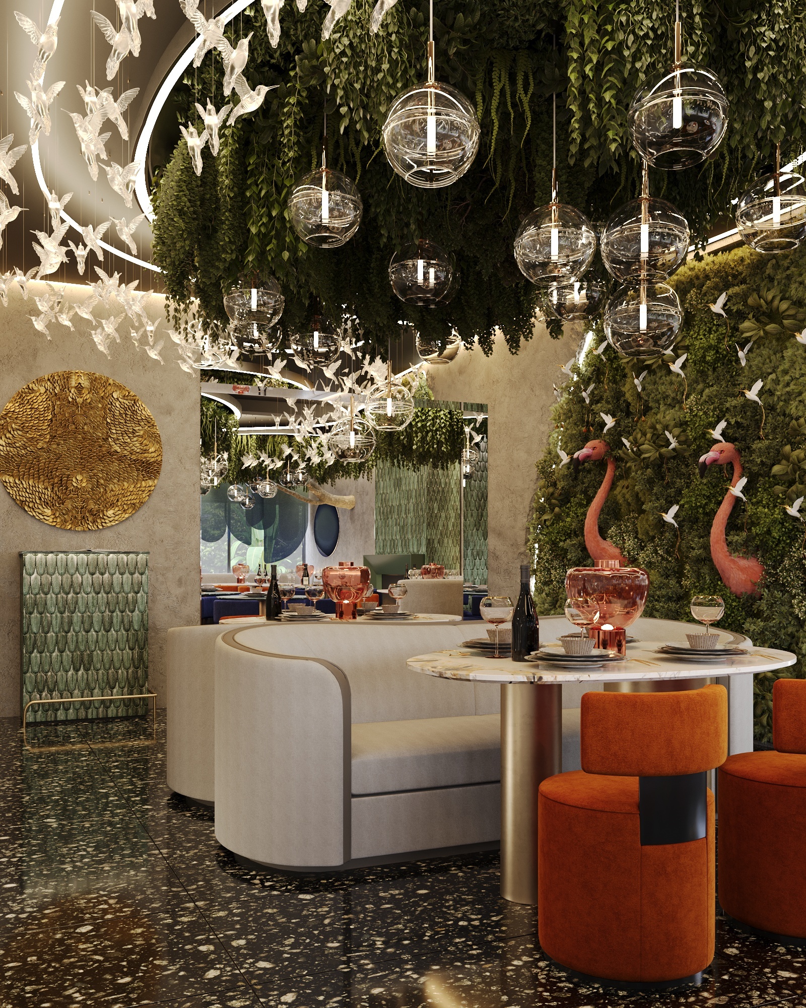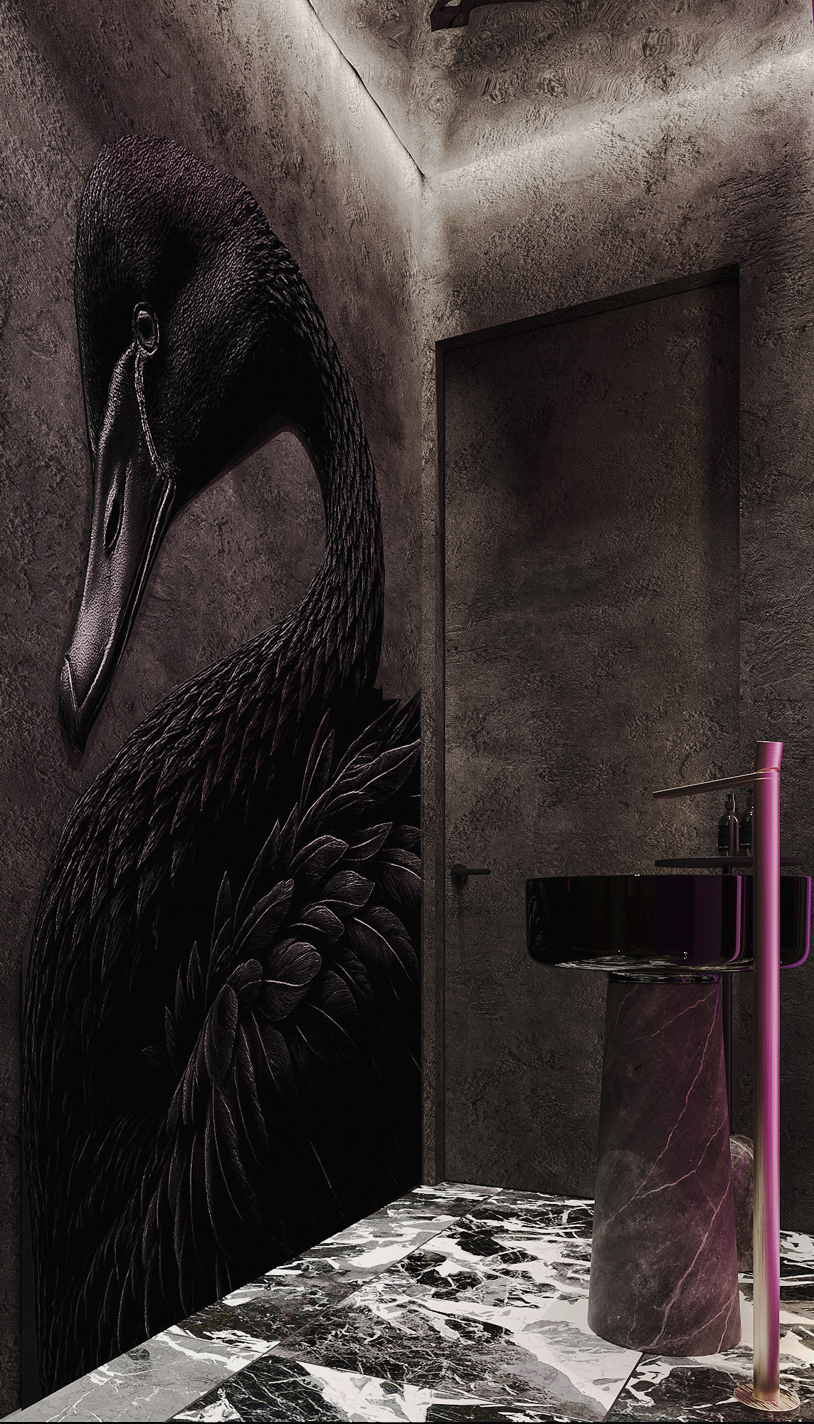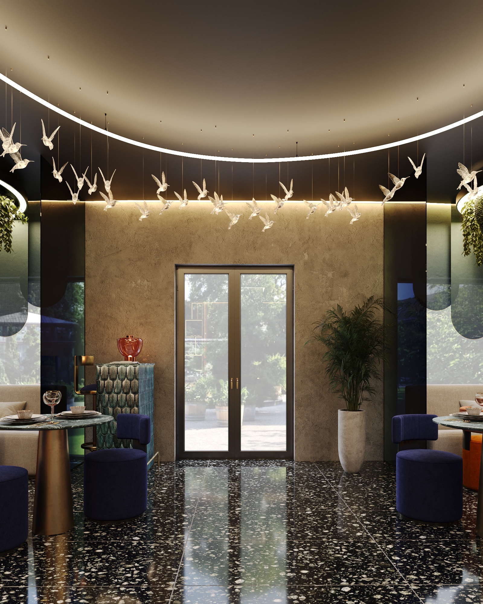 Концепция: В основу дизайн-концепции легли яркие мотивы экзотических птиц, что позволило привнести в интерьер выразительность и динамику. При этом, проектирование строго соответствовало установленным нормам и стандартам для заведений премиум-класса, обеспечивая гармоничное сочетание смелого эстетического решения и безупречной функциональности.