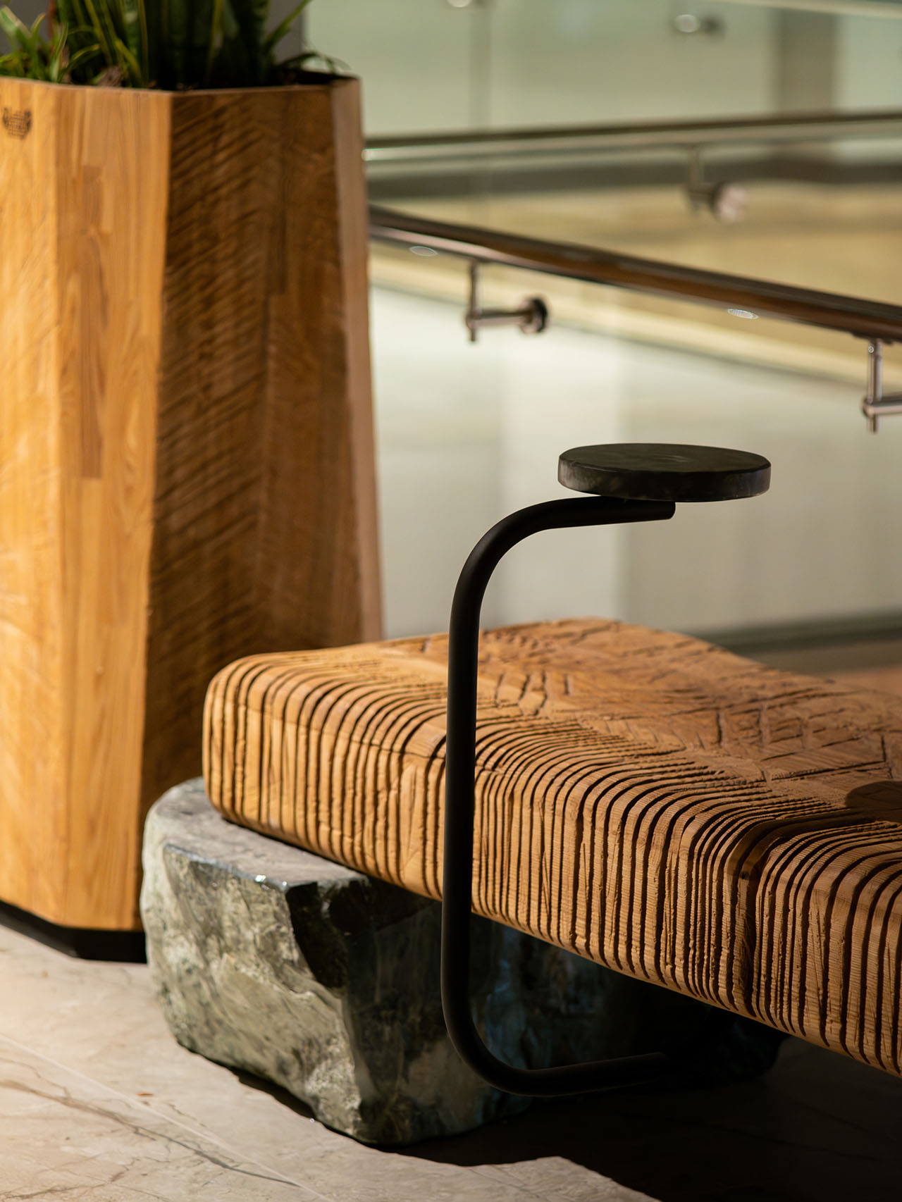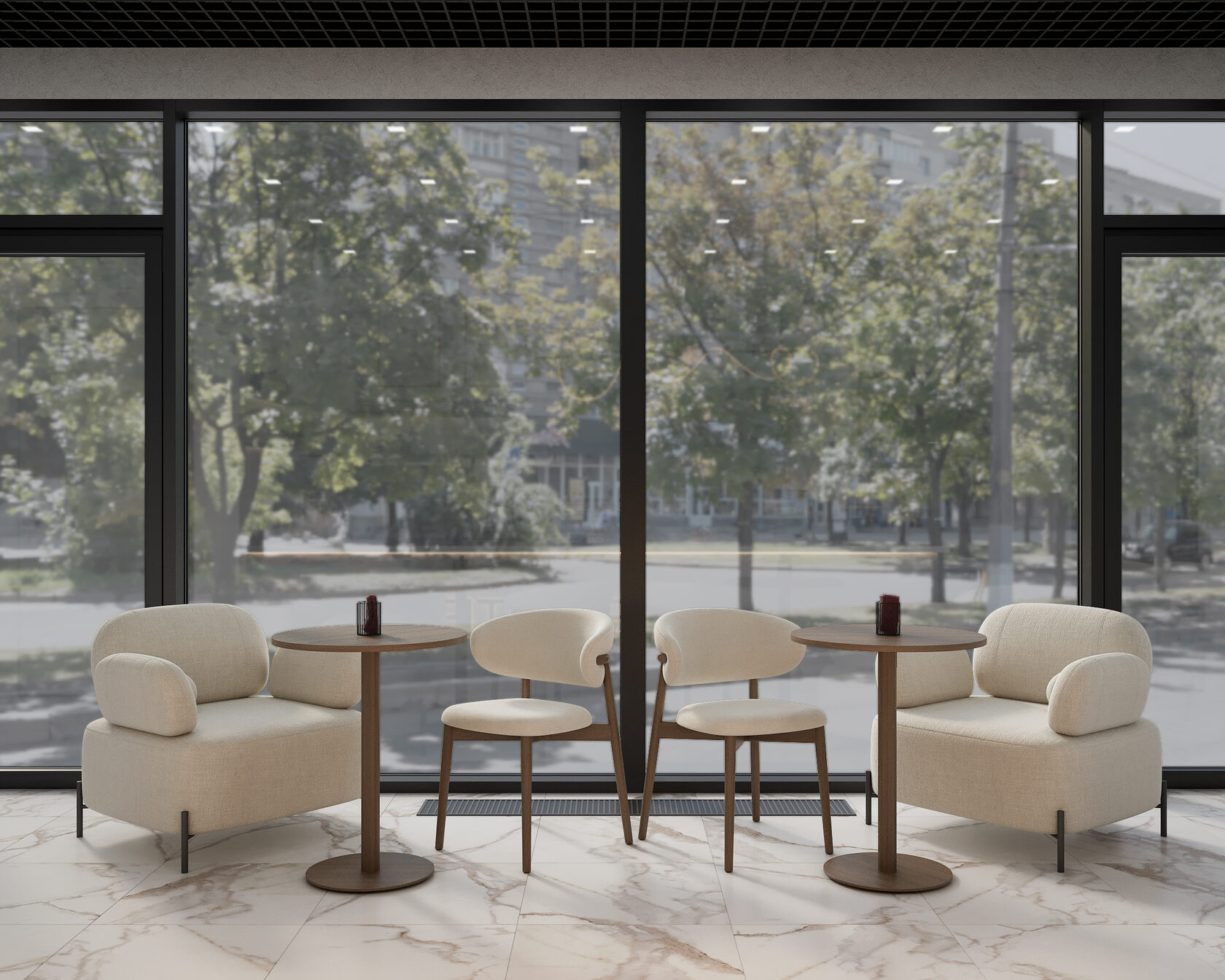 Зона отдыха не выбивается из общей концепции: удобные посадочные места, продуманный свет и ощущение камерности даже в проходном месте.
