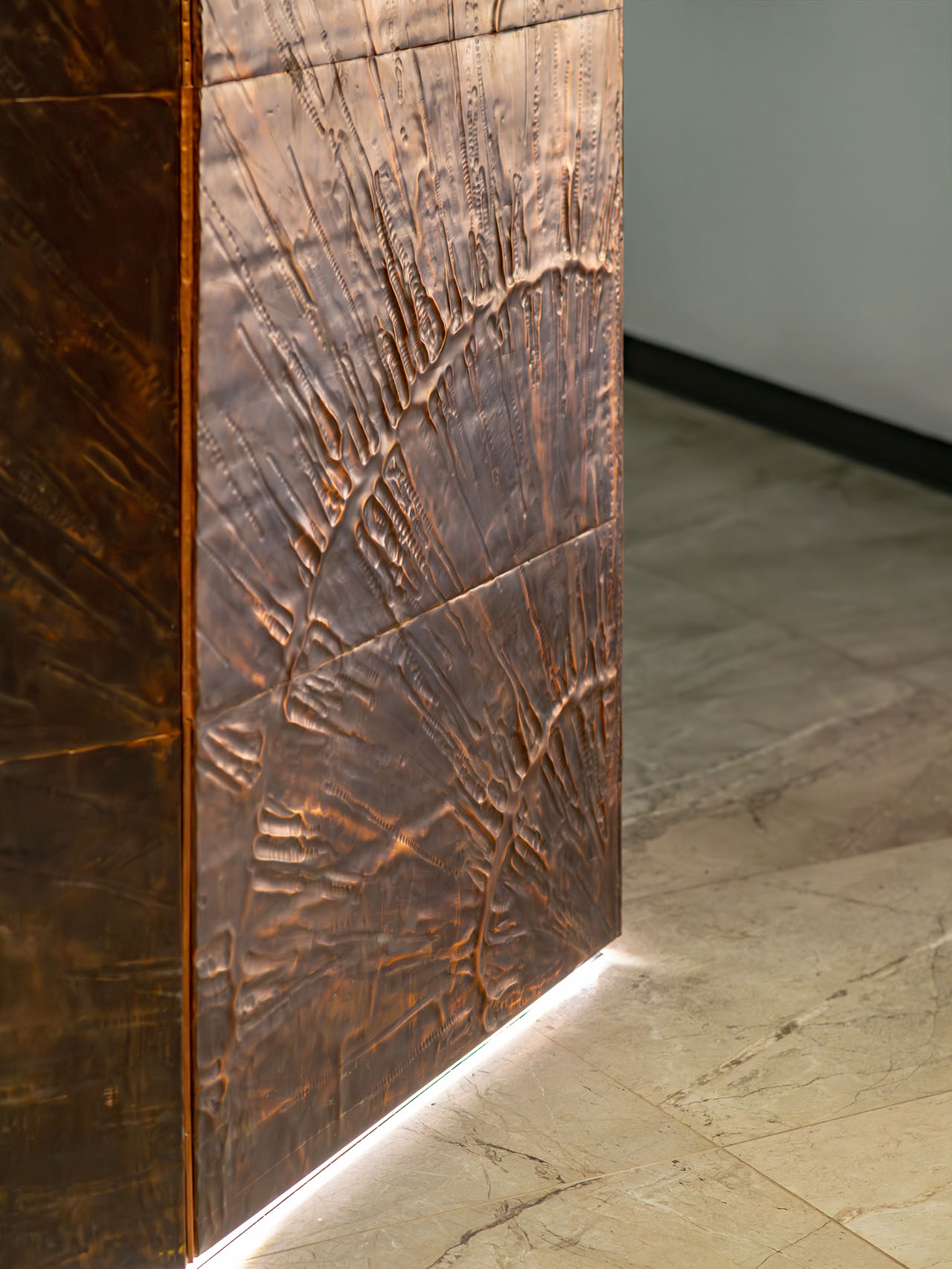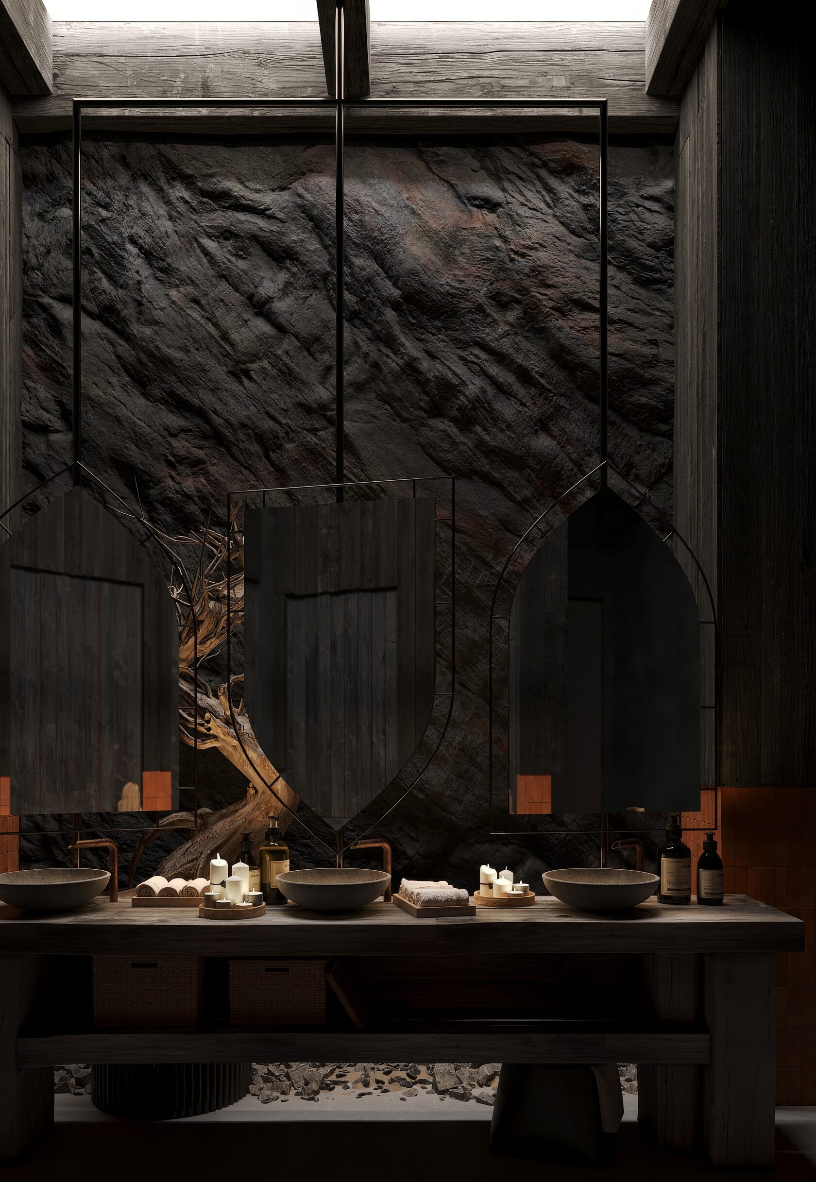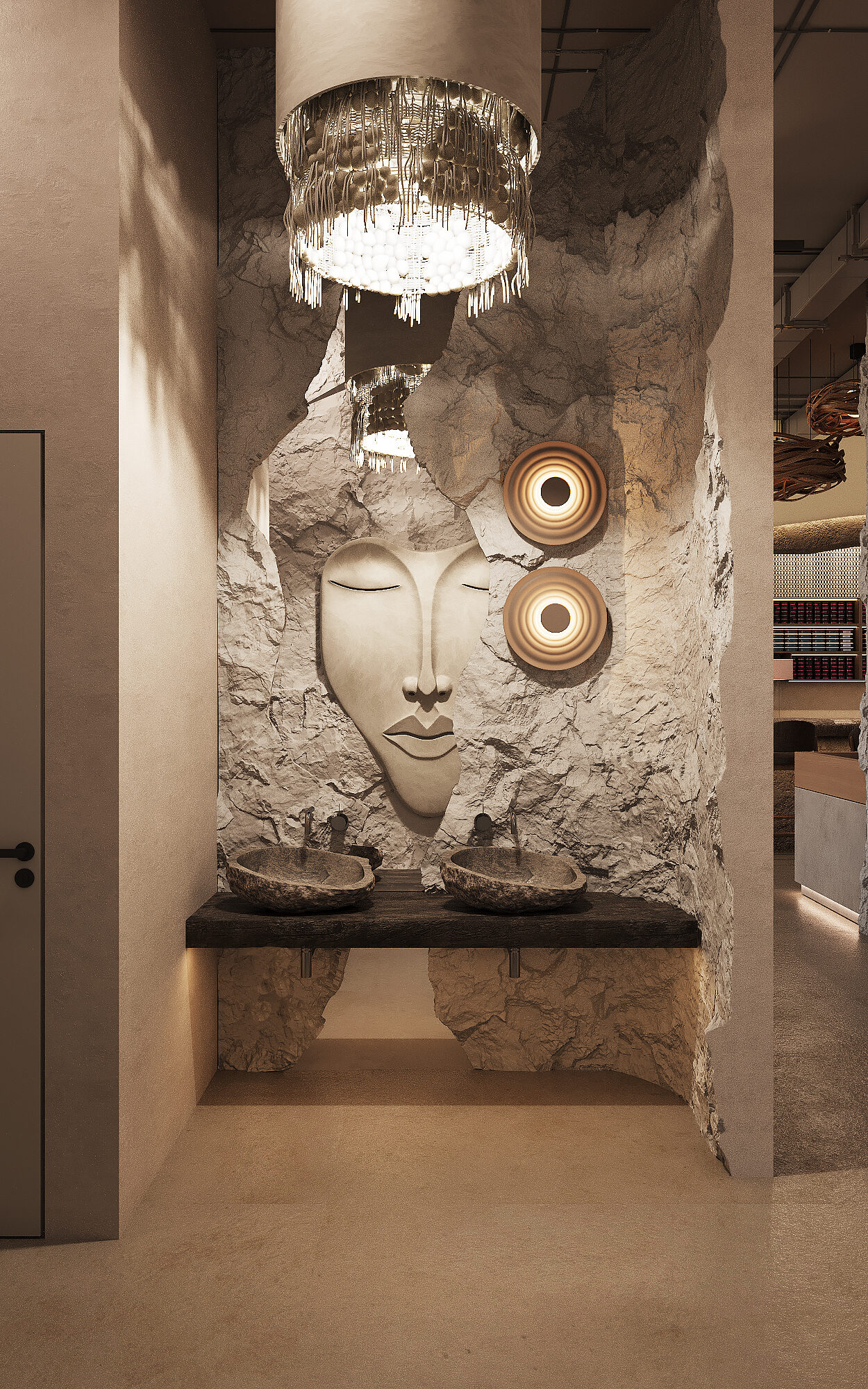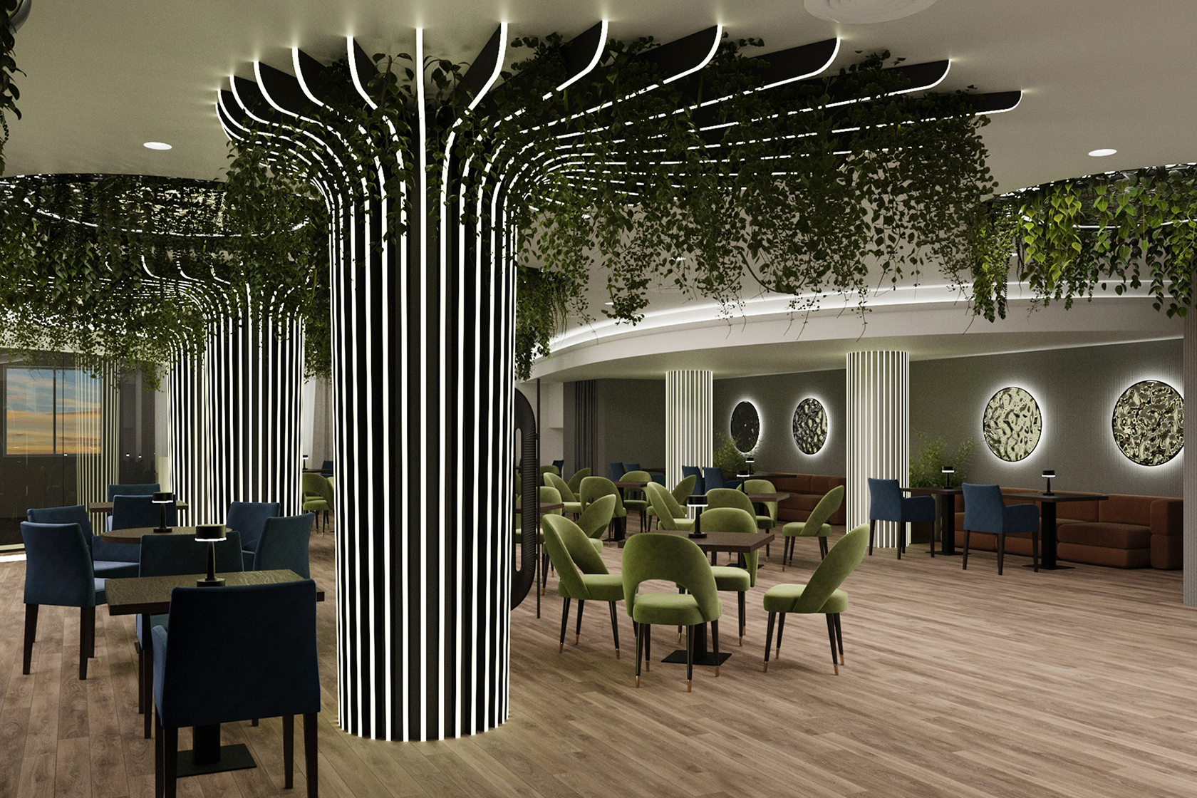 Концепция: Основная концепция проекта — глубокое погружение в уральскую идентичность. Ключевым источником вдохновения послужил древнейший Шигирский идол, а также природные материалы региона, такие как змеевик и медь, используемые в декоре и мебели. Орнаменты и образы в элементах интерьера, включая медное панно, отсылают к посланиям предков и духам леса, создавая уникальную связь с корнями и культурой Урала.