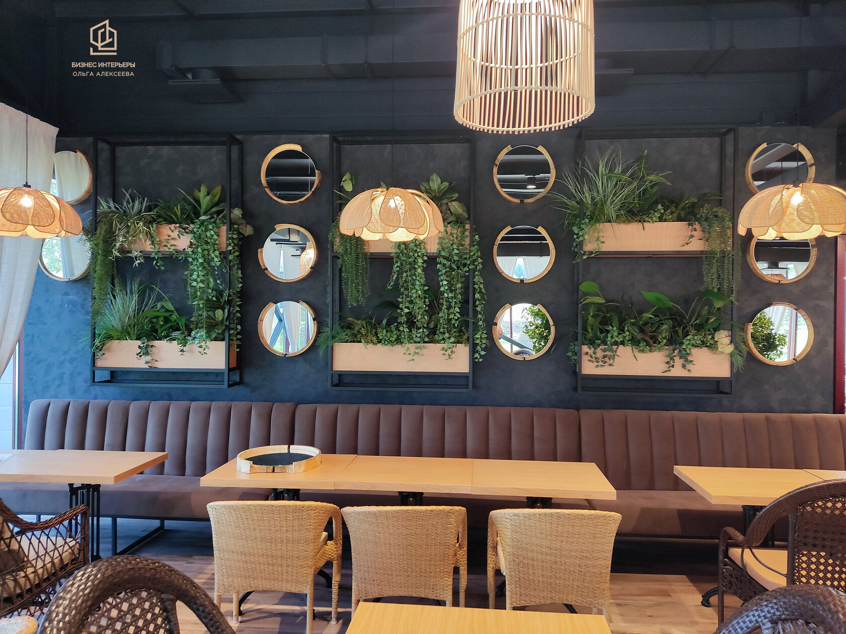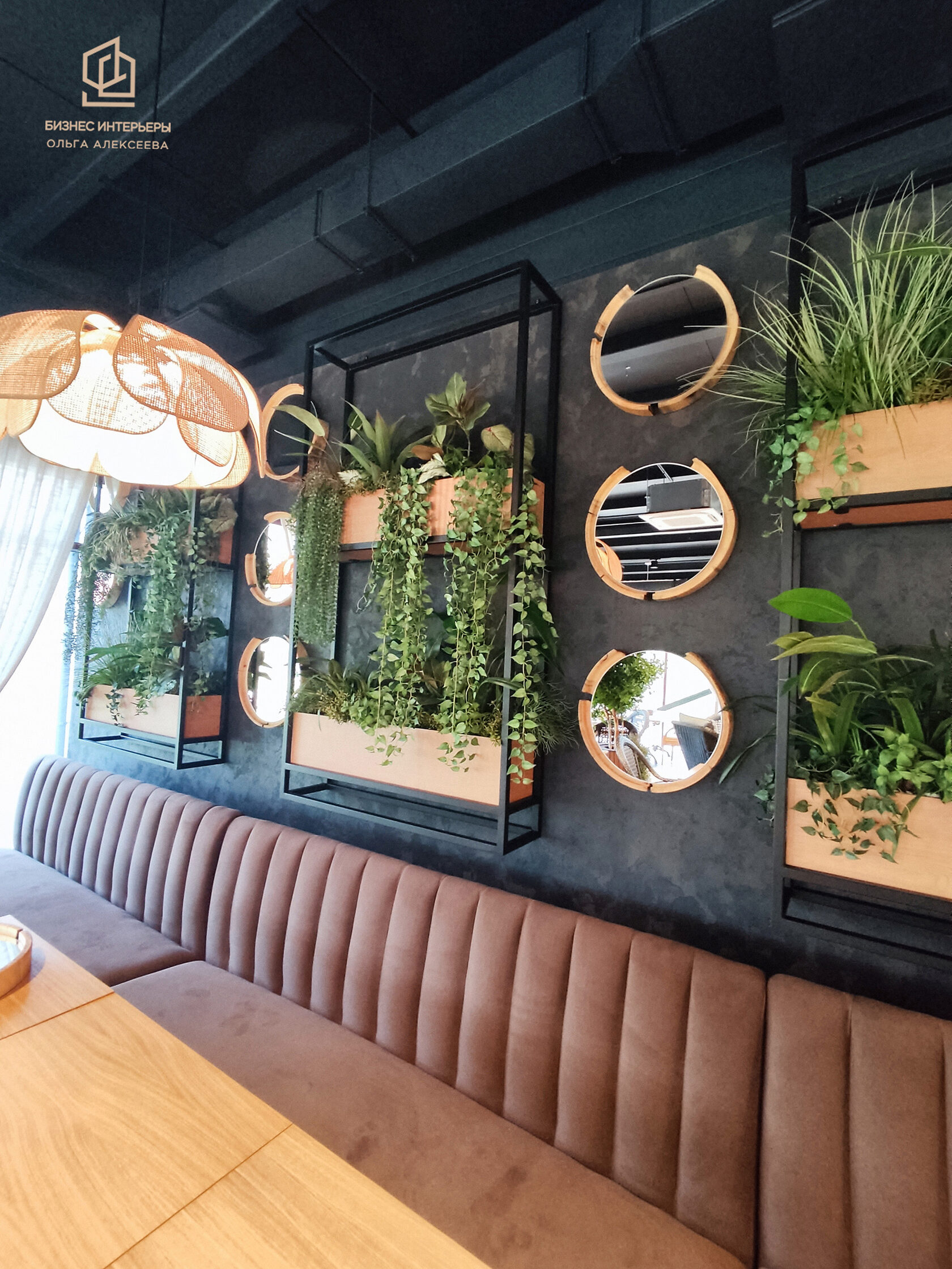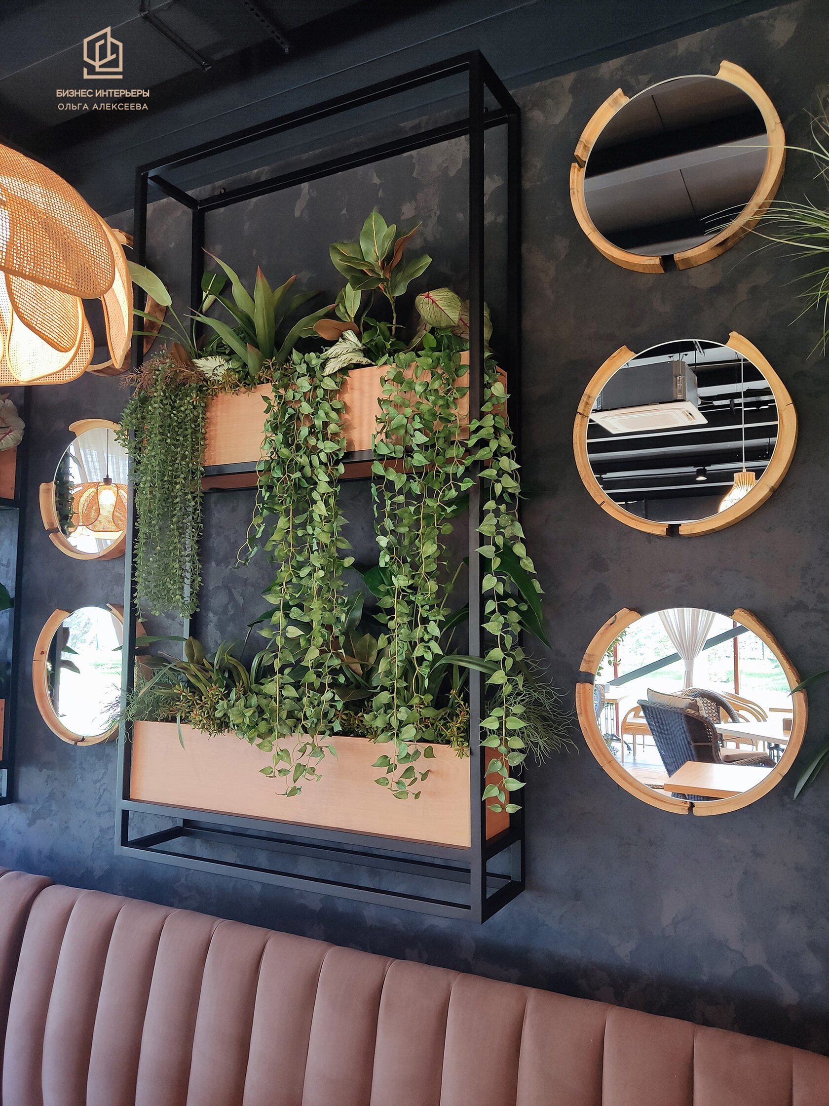 Ключевые элементы: две колонны, соединённые фитостеной, которая делит пространство на зону барной стойки и зону посадки;