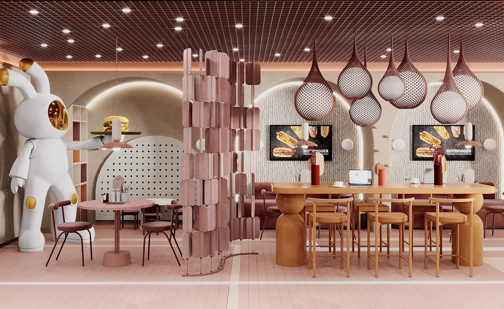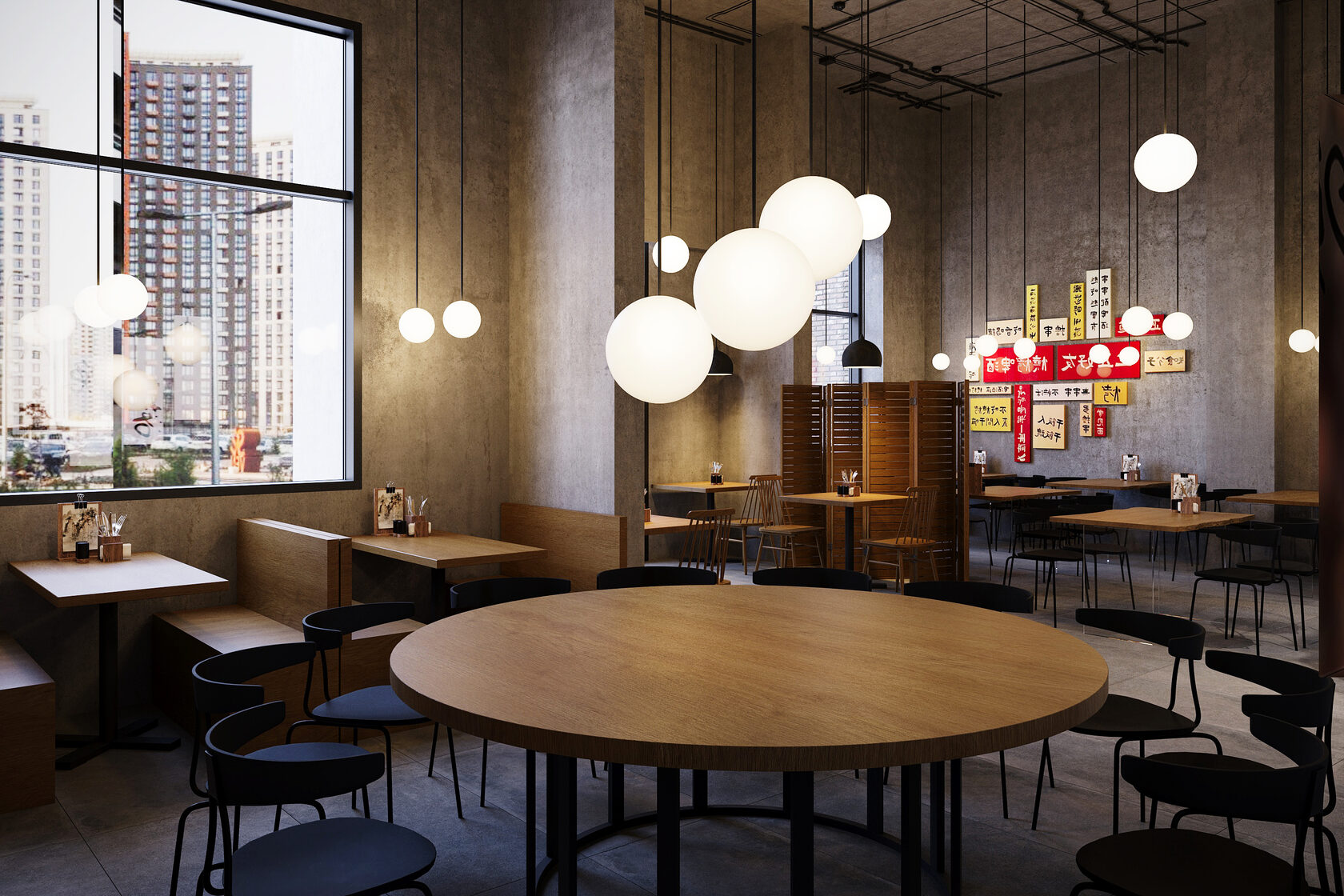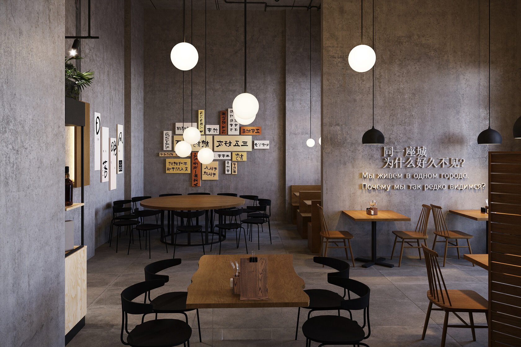 Концепция: Главная задача проекта — отразить фирменный брендбук и объединить эстетику современного азиатского заведения с функциональностью. В интерьере использованы розово-жёлтые акценты, шторы и надписи на корейском языке. Мебель в стиле Сеула создаёт аутентичную атмосферу, а рациональное распределение бюджета позволило сохранить высокое качество и предусмотреть возможность масштабирования для сети франшиз.