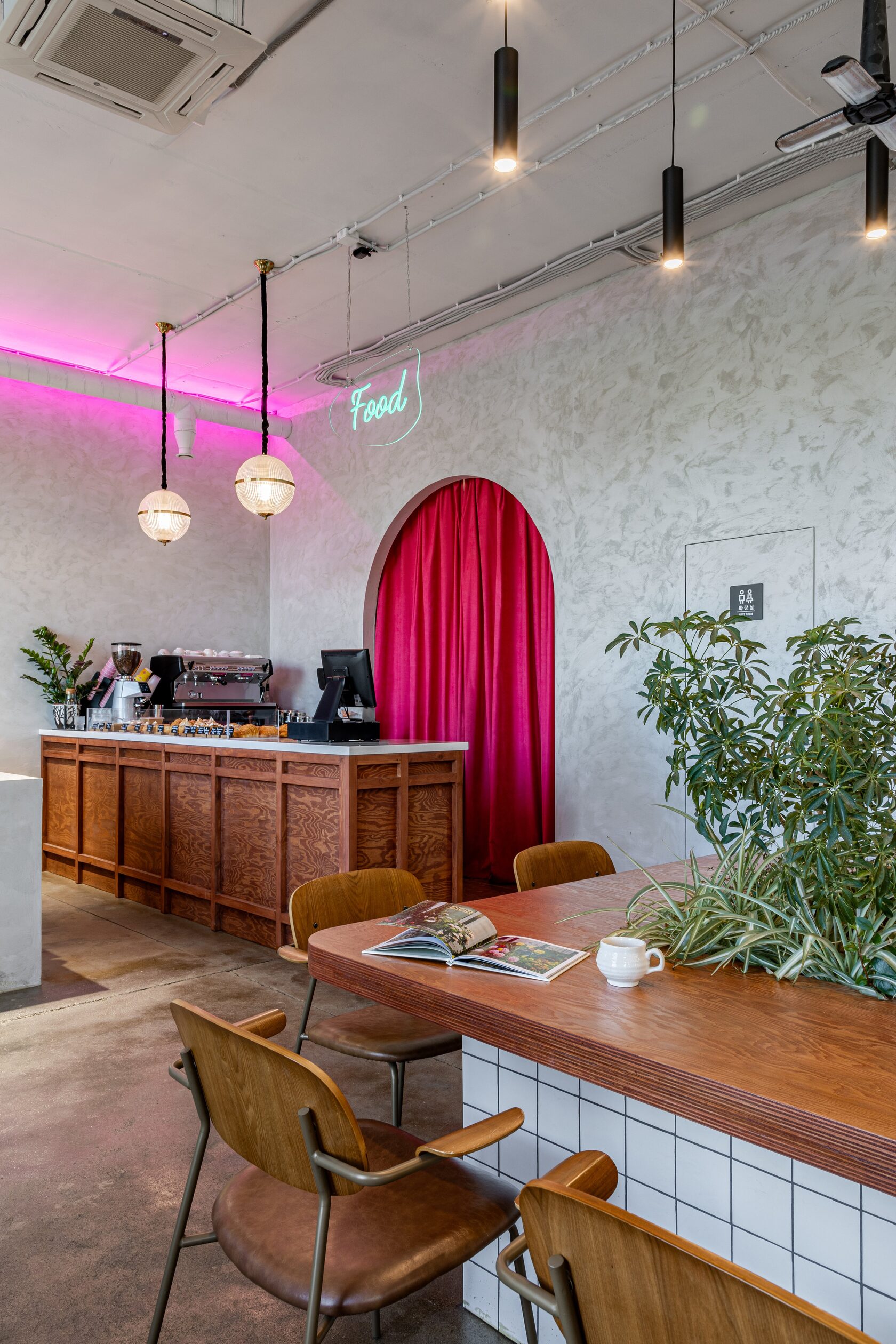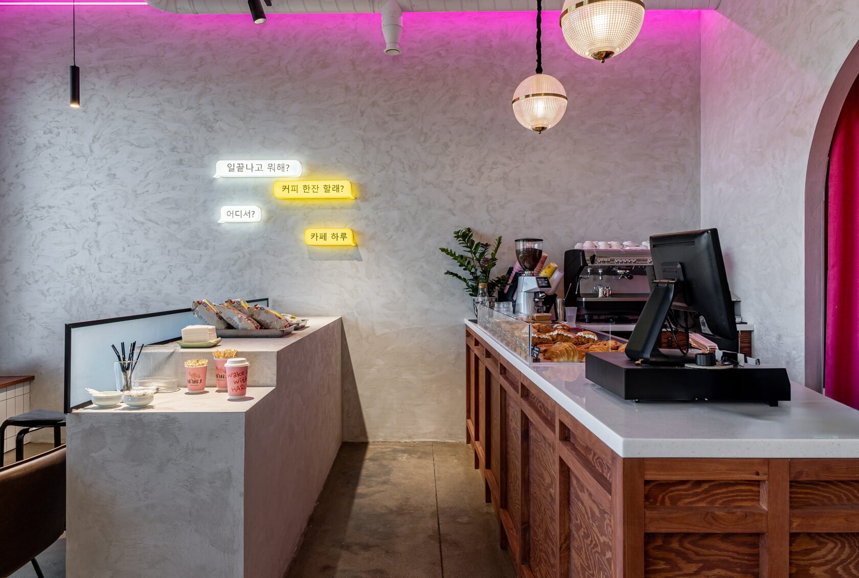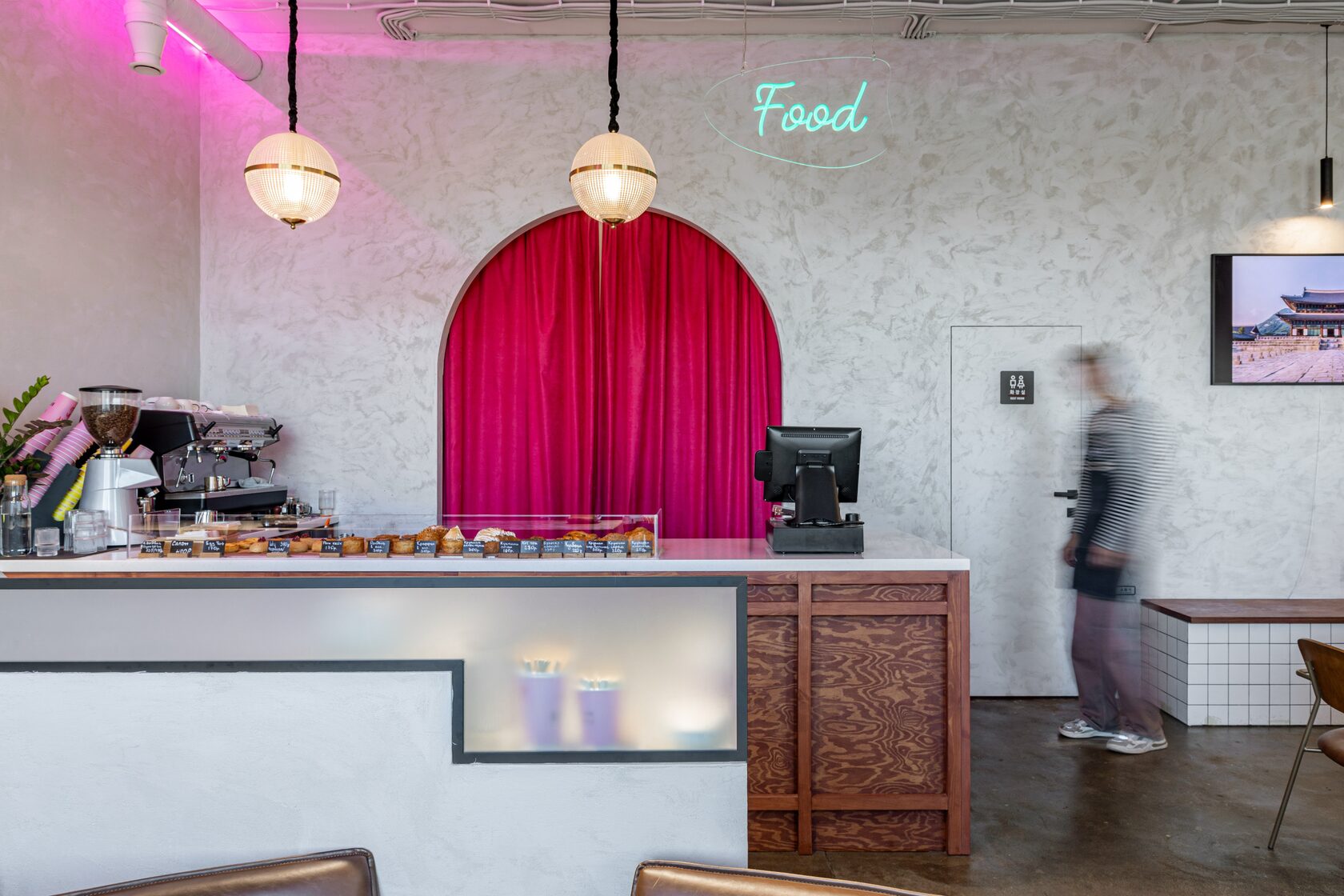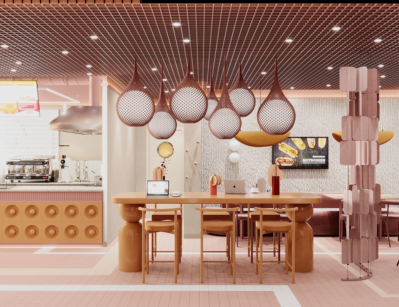 Концепция: Главная задача проекта — отразить фирменный брендбук и объединить эстетику современного азиатского заведения с функциональностью. В интерьере использованы розово-жёлтые акценты, шторы и надписи на корейском языке. Мебель в стиле Сеула создаёт аутентичную атмосферу, а рациональное распределение бюджета позволило сохранить высокое качество и предусмотреть возможность масштабирования для сети франшиз.