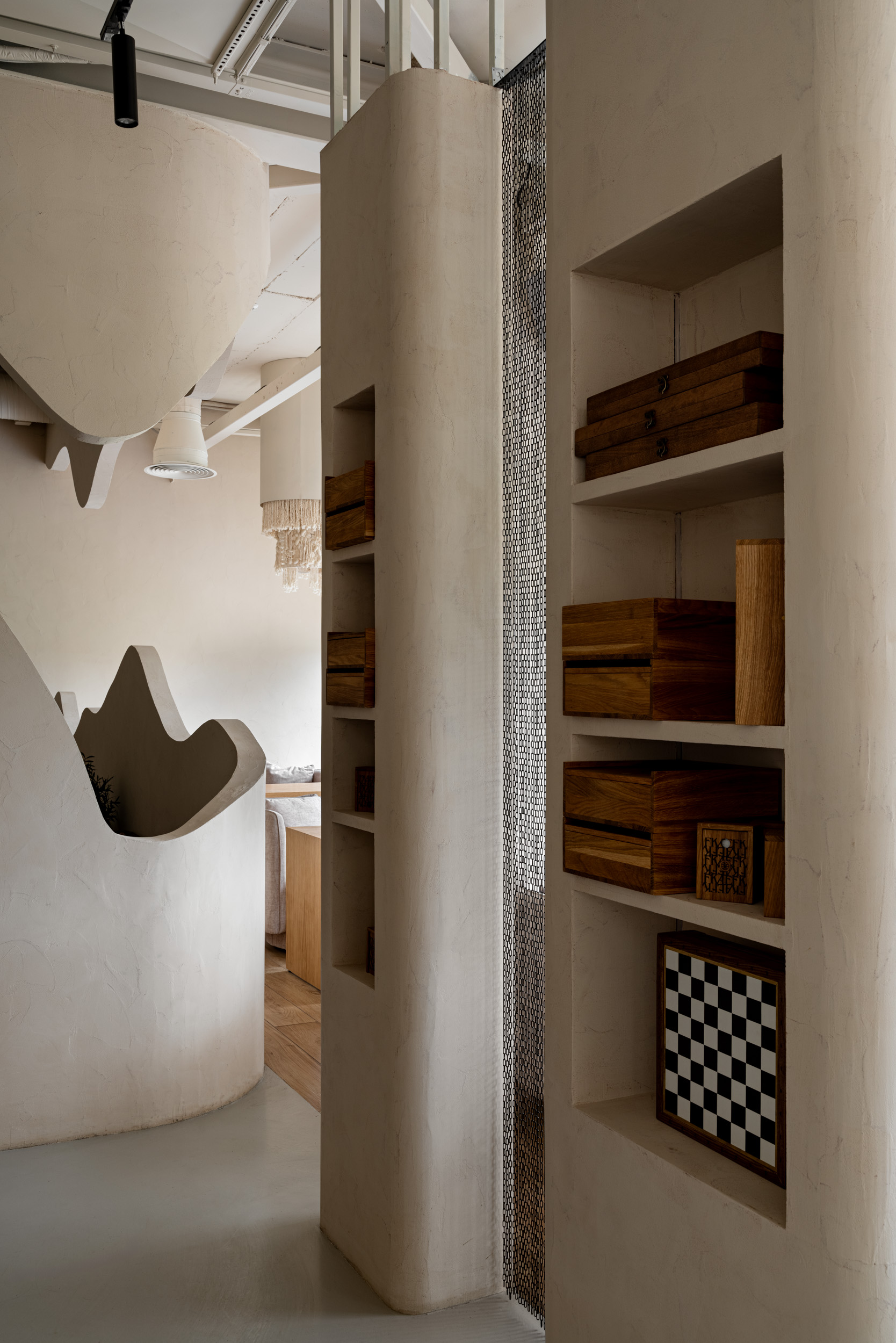Архитектурная специфика атриума, в частности соседство с лифтовой шахтой, определила ключевую объемную композицию кофейни. Пространство выстроено вокруг двух высоких кубов из металло-деревянных конструкций, объединённых монолитным арт-бетонным объемом, в который встроены витрины и рабочая зона.