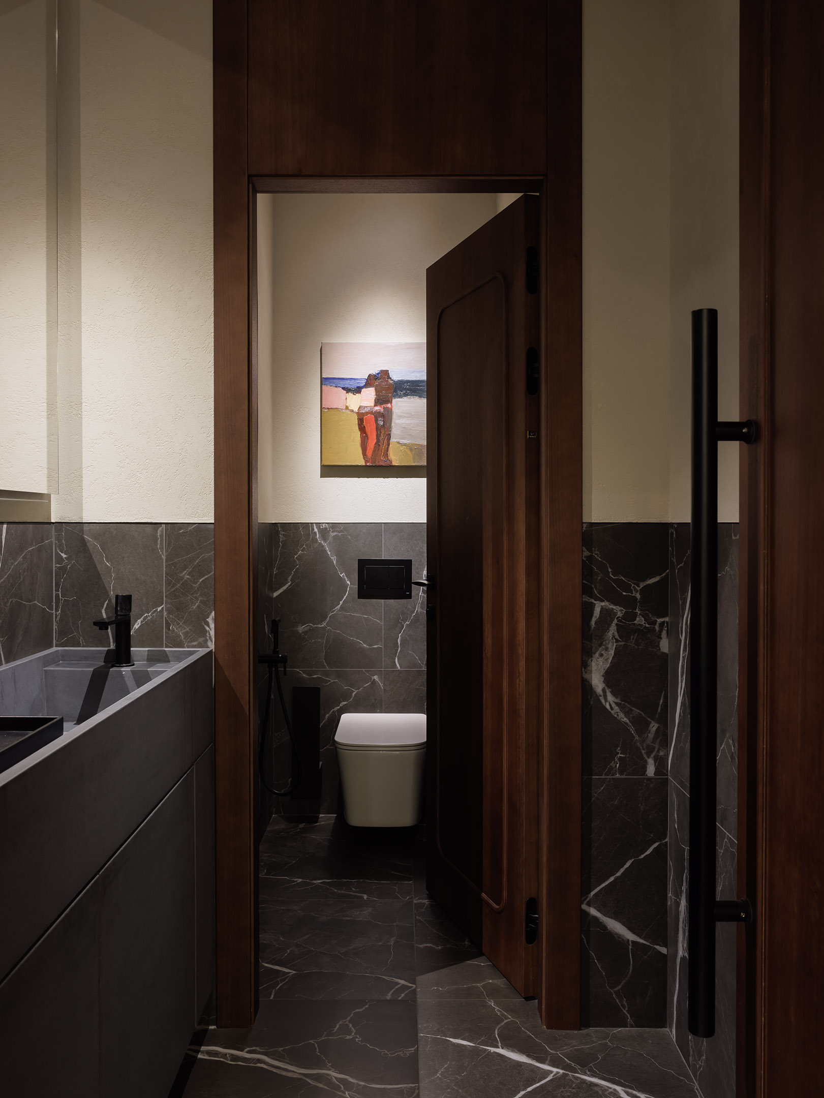 Особое внимание уделено световому сценарию — акцентное освещение помогает выделить ключевые элементы интерьера и создаёт камерную атмосферу в вечернее время. Зелень играет не только декоративную, но и функциональную роль: она служит естественным разграничителем между зонами и усиливает эффект погружения в природную среду.
