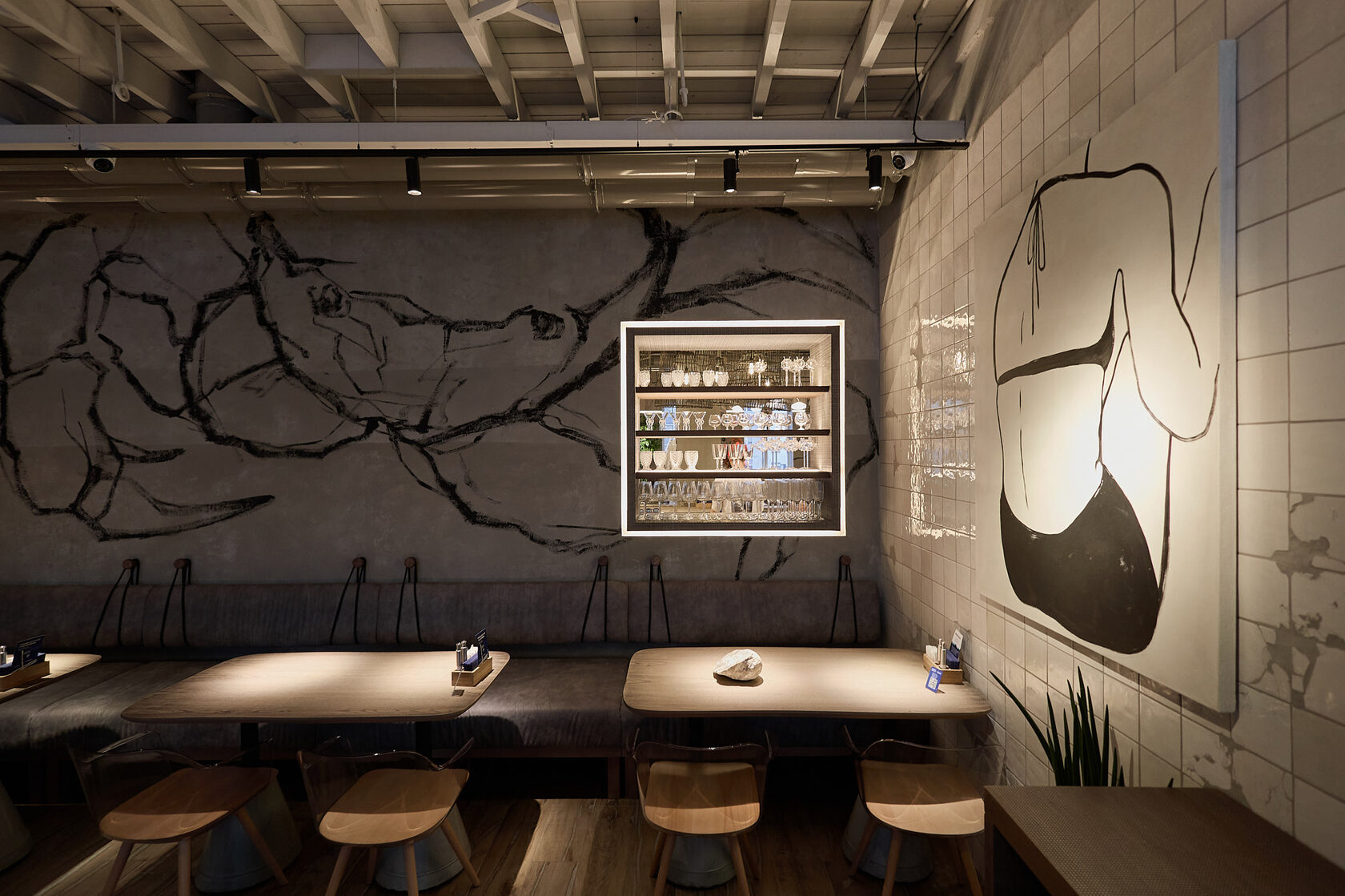 Функциональность Интерьер ресторана построен на использовании натуральных материалов и авторских решений. Центральной точкой композиции стала декоративная скала ручной работы. Мебель, изготовленная на заказ, подчеркивает аутентичность пространства: деревянные изделия, мягкая мебель, каменные столы, обожжённое дерево из Санкт-Петербурга и обои с северными мотивами.