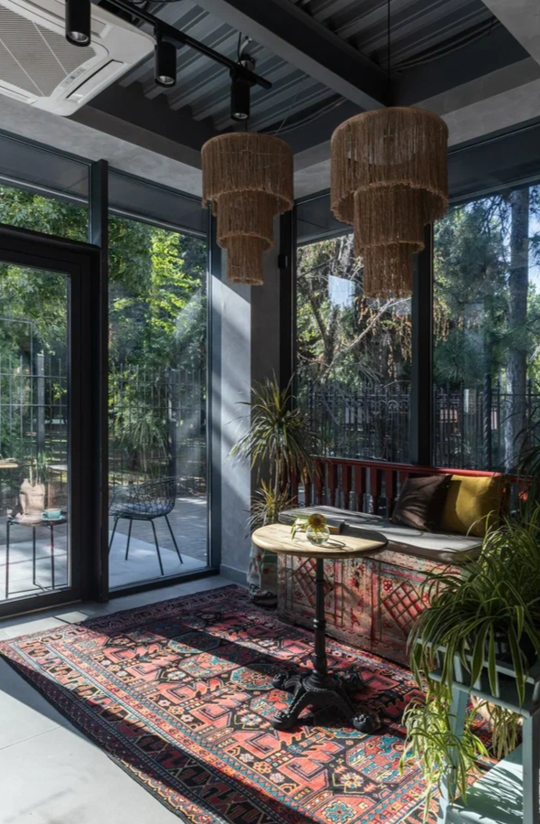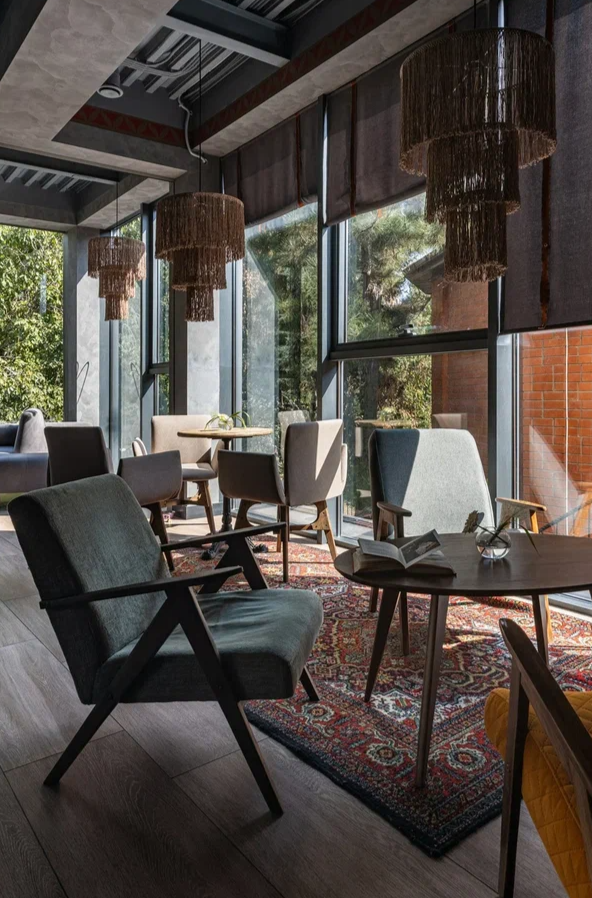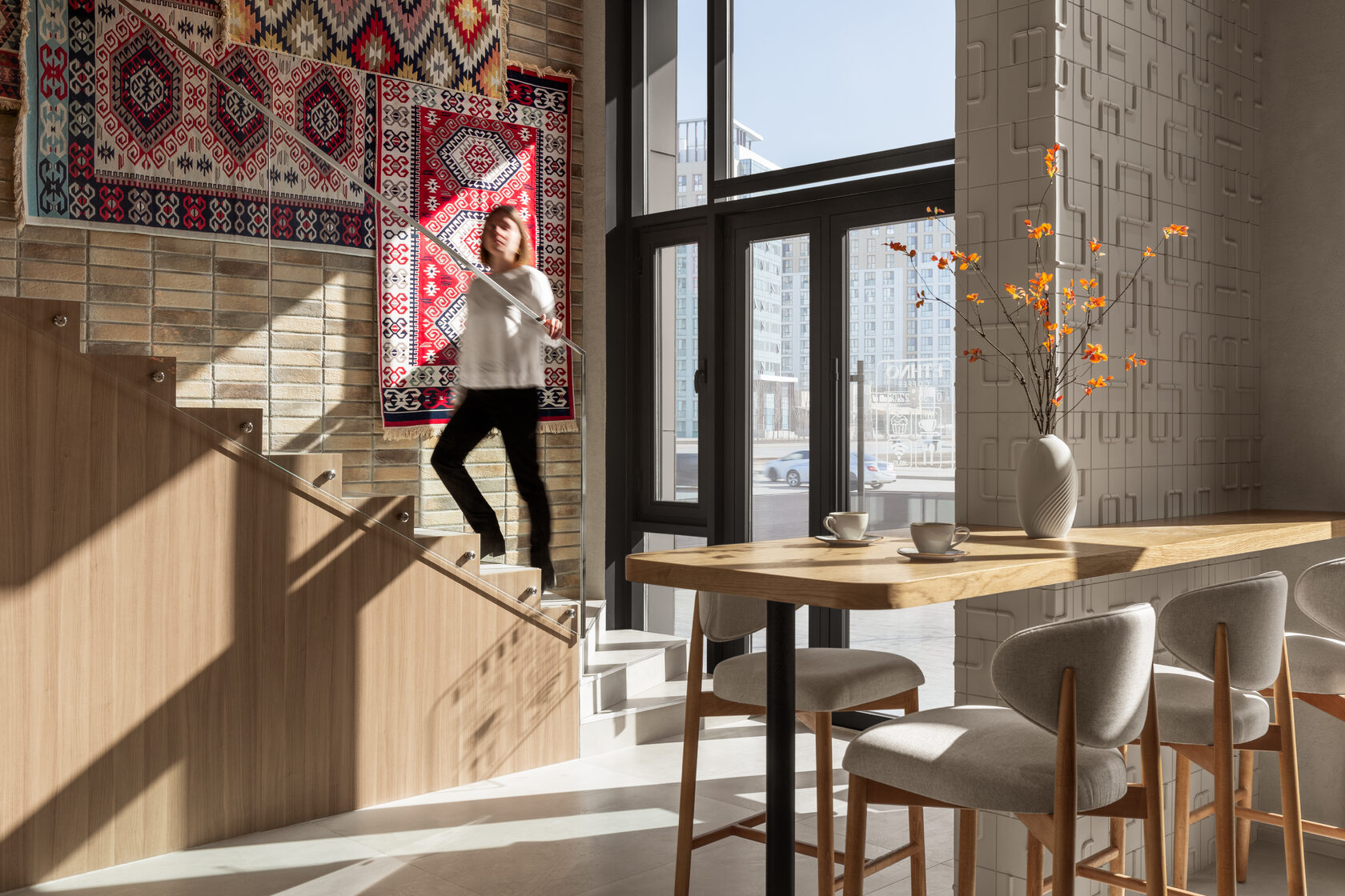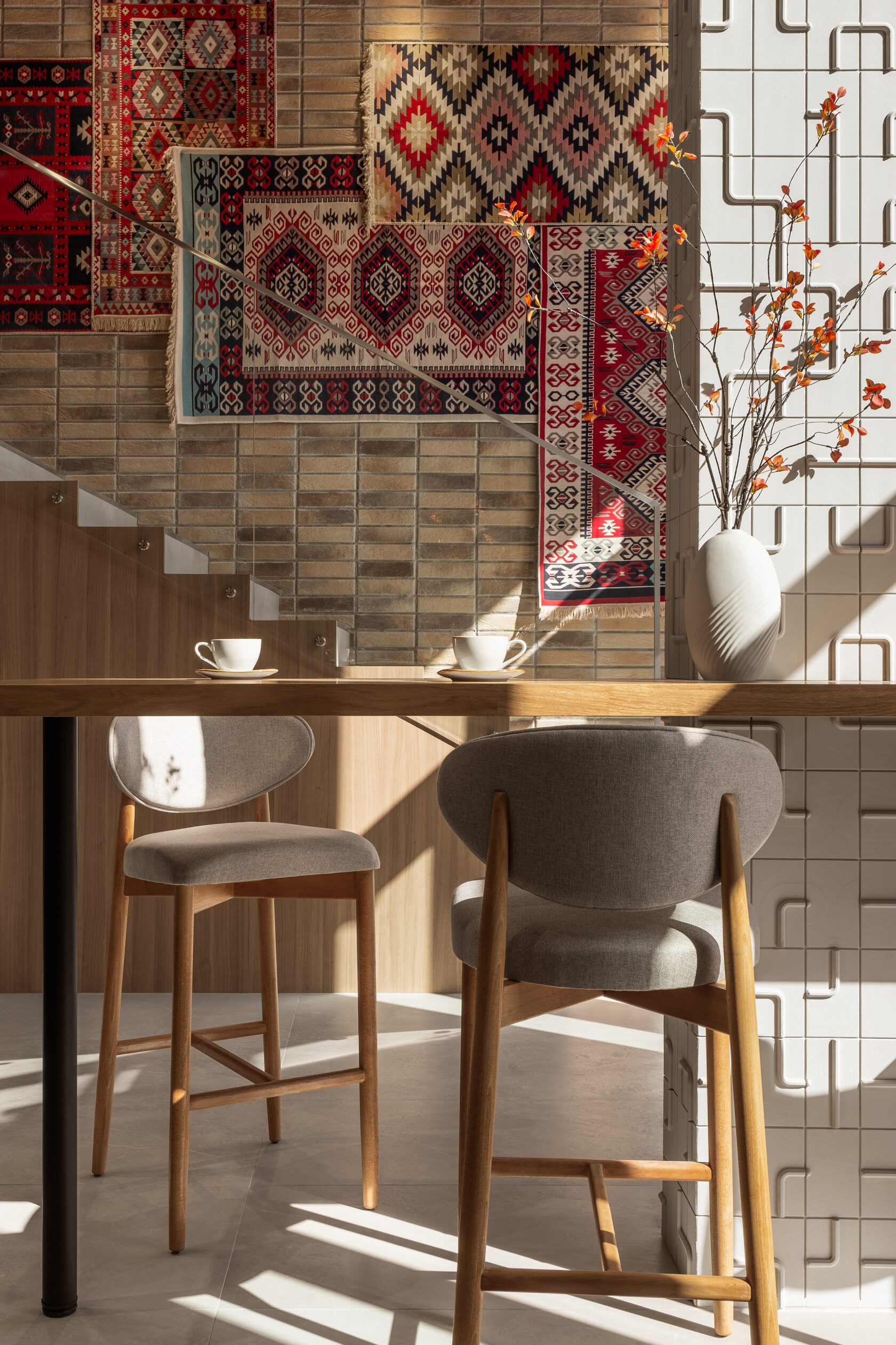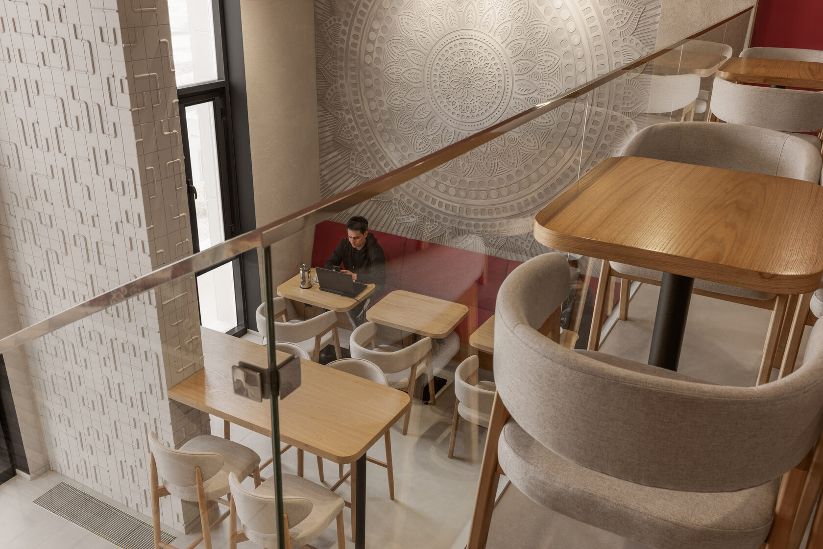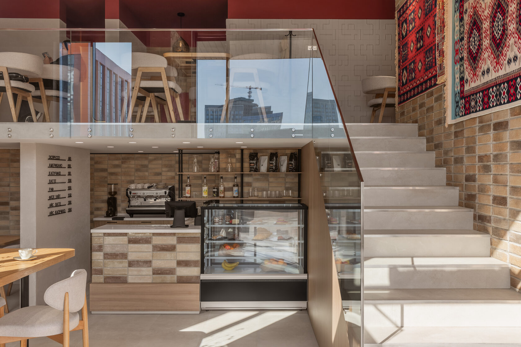 Интерьер кофейни виртуозно балансирует на стыке современного урбанизма и аутентичного этнического стиля. В пространстве органично сочетаются благородные нейтральные материалы — бетон, стекло, керамика — с выразительными акцентами в виде традиционных ковров ручной работы, узорчатой плитки и текстиля с национальными орнаментами. Центром композиции является функциональная барная зона с витриной, оформленная в теплых природных оттенках. Стеклянные ограждения антресоли и лестницы создают эффект невесомости и открытости, обеспечивая максимальное проникновение естественного света.